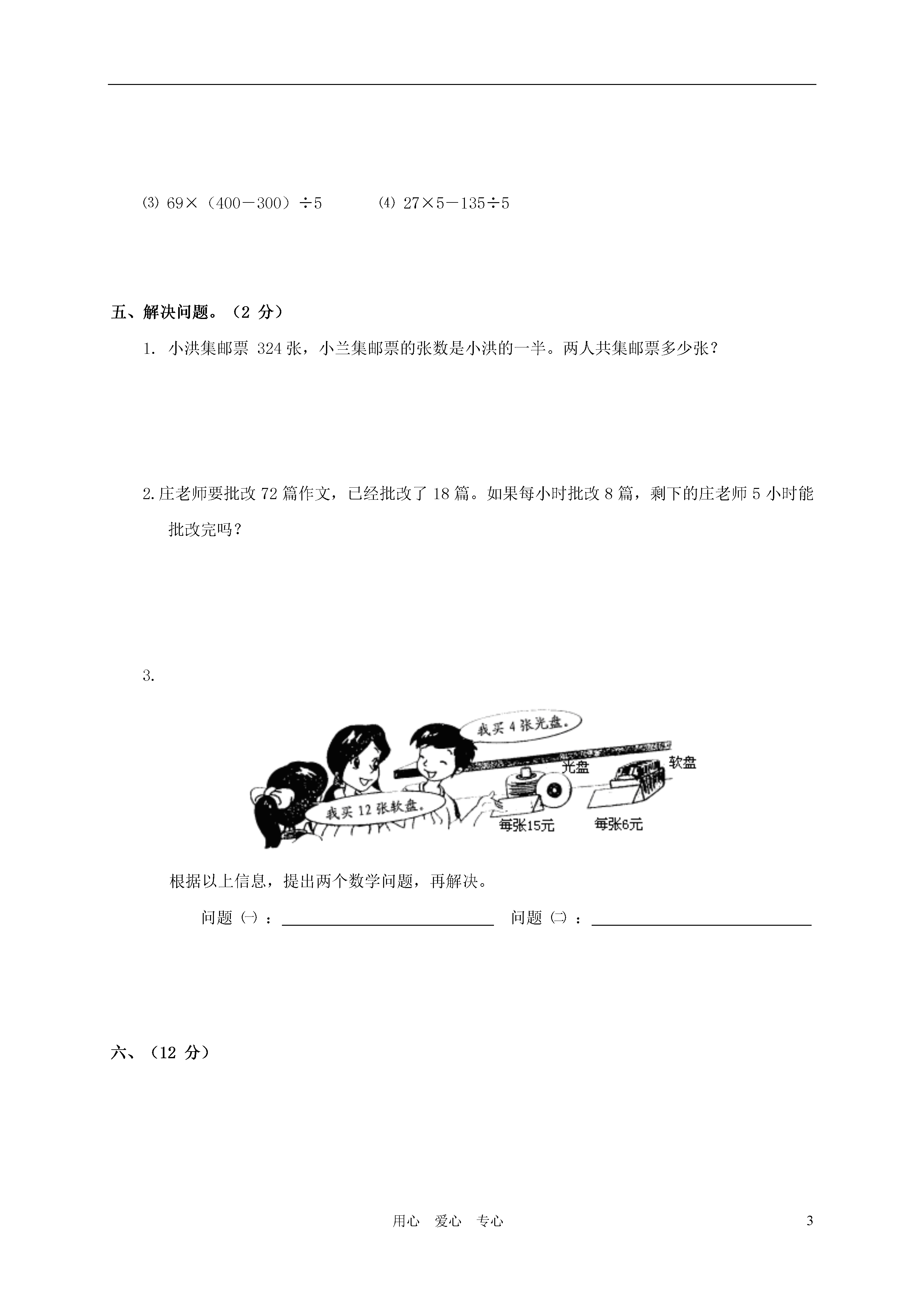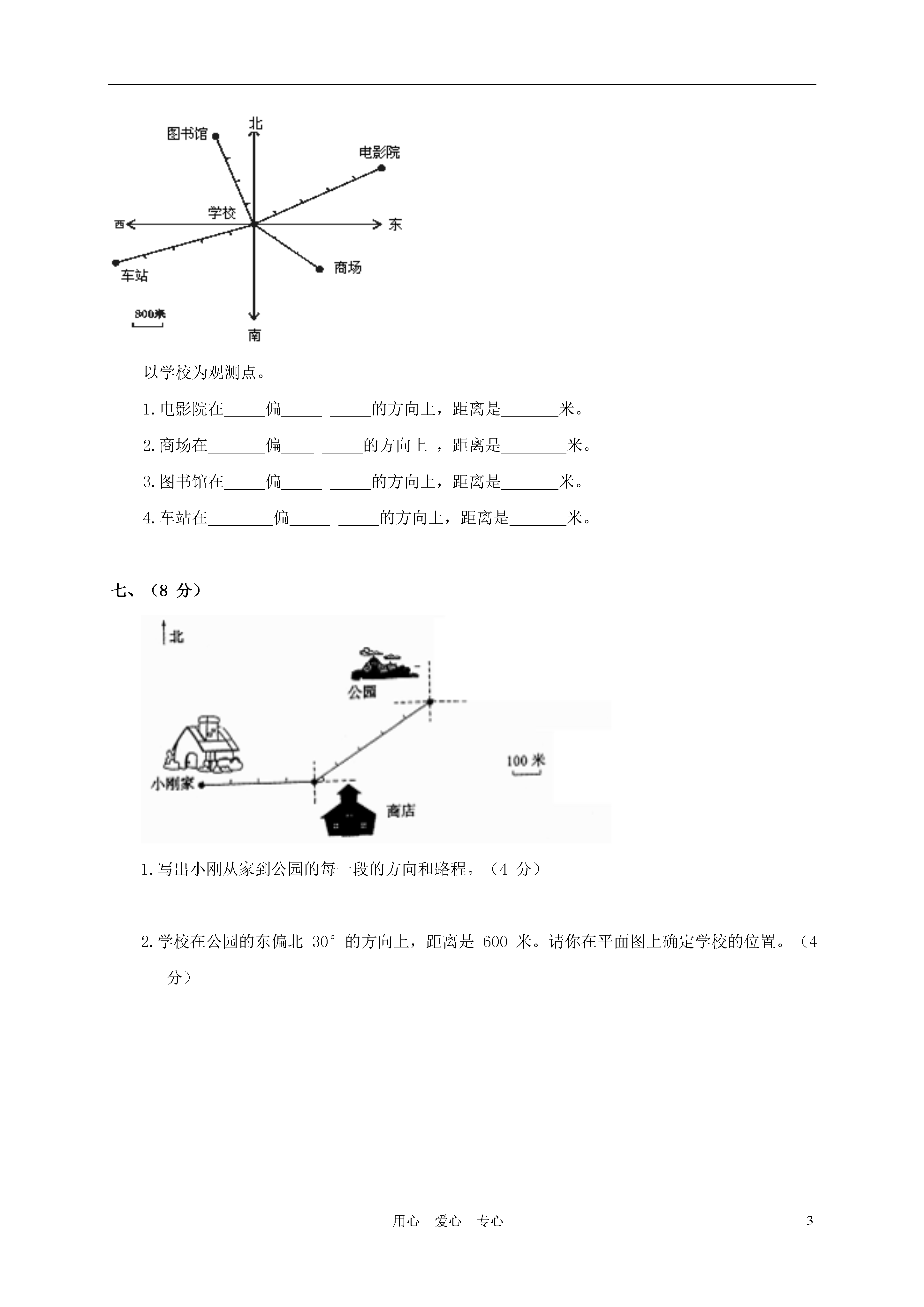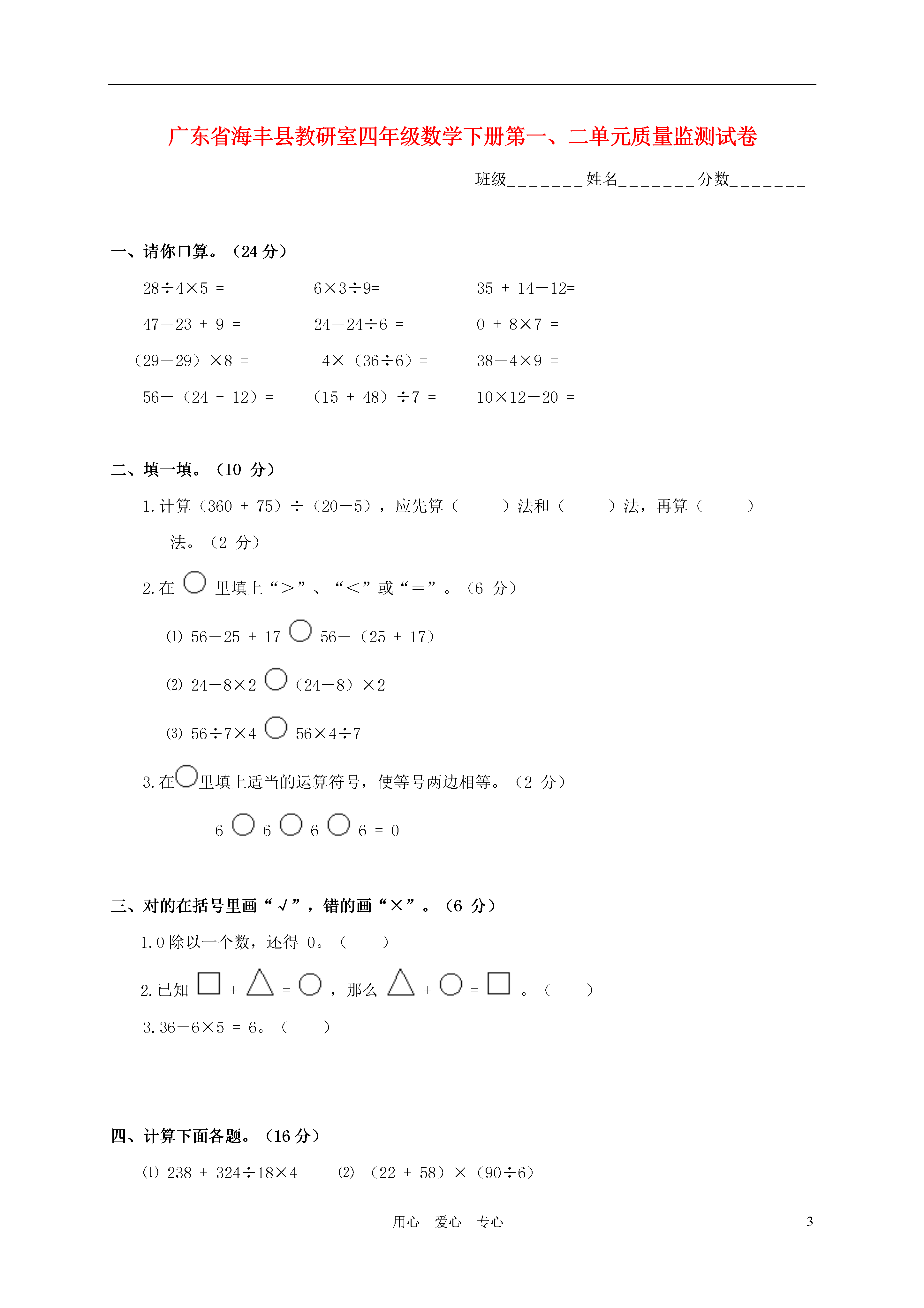 3用心爱心专心广东省海丰县教研室四年级数学下册第一、二单元质量监测试卷班级_______姓名_______分数_______一、请你口算。(24分)28÷4×5=6×3÷9=35+14-12=47-23+9=24-24÷6=0+8×7=(29-29)×8=4×(36÷6)=38-4×9=56-(24+12)=(15+48)÷7=10×12-20=二、填一填。(10分)1.计算(360+75)÷(20-5),应先算()法和()法,再算()法。(2分)2.在里填上“>”、“<”或“=”。(6分)⑴56-25+1756-(25+17)⑵24-8×2(24-8)×2⑶56÷7×456×4÷73.在里填上适当的运算符号,使等号两边相等。(2分)6666=0三、对的在括号里画“√”,错的画“×”。(6分)1.0除以一个数,还得0。()2.已知+=,那么+=。()3.36-6×5=6。()四、计算下面各题。(16分)⑴238+324÷18×4⑵(22+58)×(90÷6)⑶69×(400-300)÷5⑷27×5-135÷5五、解决问题。(2分)1.小洪集邮票324张,小兰集邮票的张数是小洪的一半。两人共集邮票多少张?2.庄老师要批改72篇作文,已经批改了18篇。如果每小时批改8篇,剩下的庄老师5小时能批改完吗?3.根据以上信息,提出两个数学问题,再解决。问题㈠:问题㈡:六、(12分)以学校为观测点。1.电影院在偏的方向上,距离是米。2.商场在偏的方向上,距离是米。3.图书馆在偏的方向上,距离是米。4.车站在偏的方向上,距离是米。七、(8分)1.写出小刚从家到公园的每一段的方向和路程。(4分)2.学校在公园的东偏北30°的方向上,距离是600米。请你在平面图上确定学校的位置。(4分)