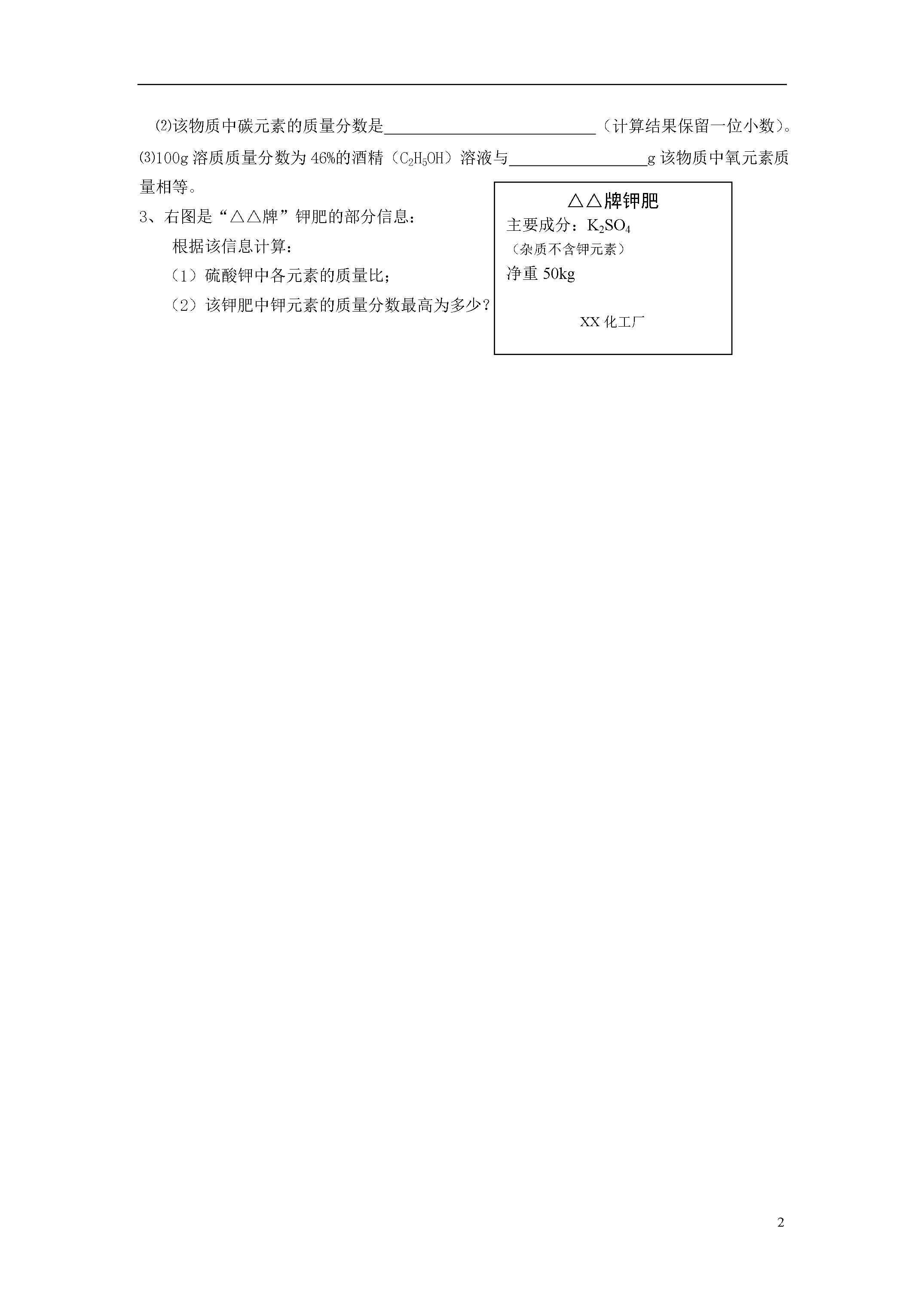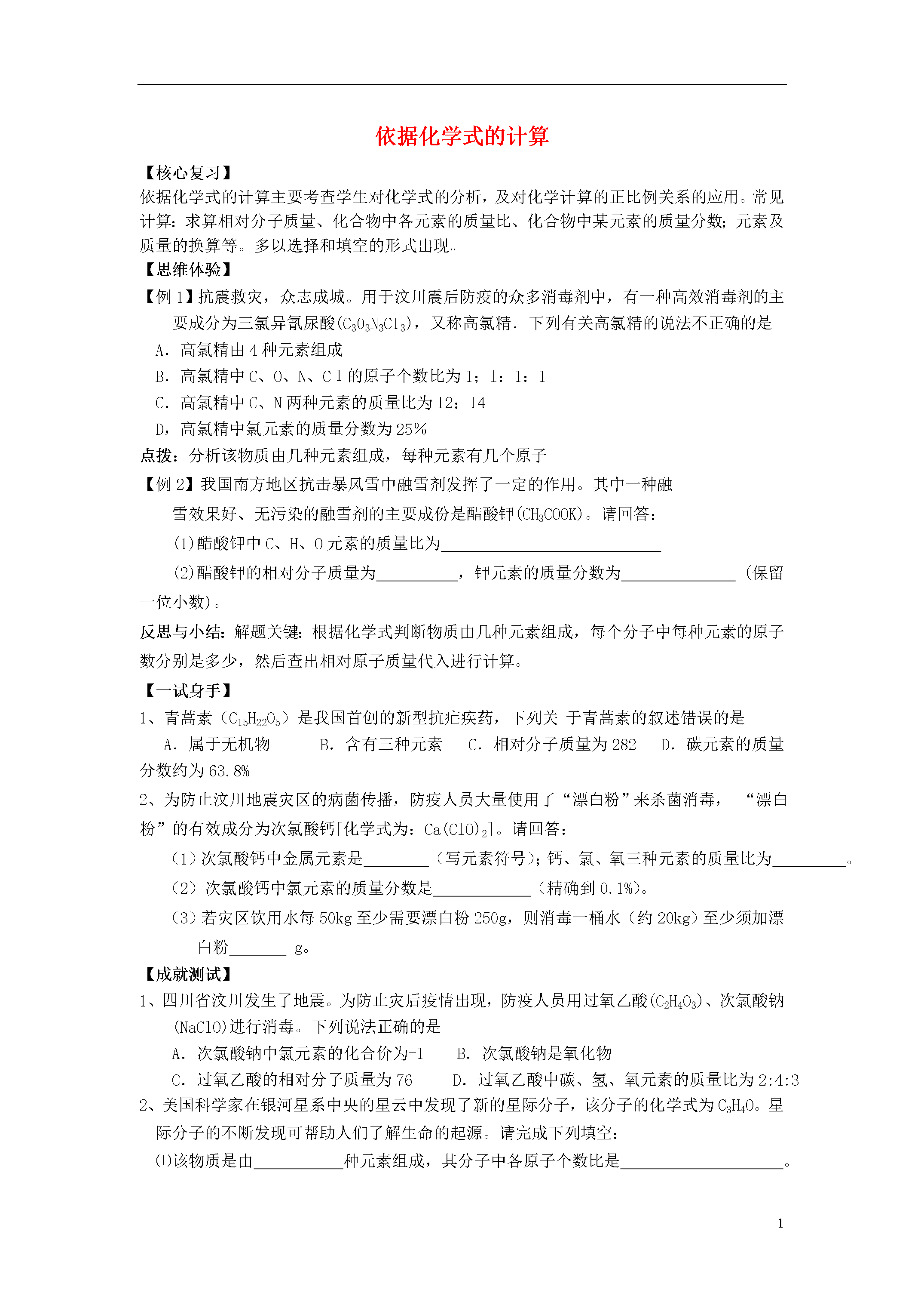 2依据化学式的计算【核心复习】依据化学式的计算主要考查学生对化学式的分析,及对化学计算的正比例关系的应用。常见计算:求算相对分子质量、化合物中各元素的质量比、化合物中某元素的质量分数;元素及质量的换算等。多以选择和填空的形式出现。【思维体验】【例1】抗震救灾,众志成城。用于汶川震后防疫的众多消毒剂中,有一种高效消毒剂的主要成分为三氯异氰尿酸(C303N3C13),又称高氯精.下列有关高氯精的说法不正确的是A.高氯精由4种元素组成B.高氯精中C、O、N、Cl的原子个数比为1;l:1:1C.高氯精中C、N两种元素的质量比为12:14D,高氯精中氯元素的质量分数为25%点拨:分析该物质由几种元素组成,每种元素有几个原子【例2】我国南方地区抗击暴风雪中融雪剂发挥了一定的作用。其中一种融雪效果好、无污染的融雪剂的主要成份是醋酸钾(CH3COOK)。请回答:(1)醋酸钾中C、H、O元素的质量比为(2)醋酸钾的相对分子质量为,钾元素的质量分数为(保留一位小数)。反思与小结:解题关键:根据化学式判断物质由几种元素组成,每个分子中每种元素的原子数分别是多少,然后查出相对原子质量代入进行计算。【一试身手】1、青蒿素(C15H22O5)是我国首创的新型抗疟疾药,下列关于青蒿素的叙述错误的是A.属于无机物B.含有三种元素C.相对分子质量为282D.碳元素的质量分数约为63.8%2、为防止汶川地震灾区的病菌传播,防疫人员大量使用了“漂白粉”来杀菌消毒,“漂白粉”的有效成分为次氯酸钙[化学式为:Ca(ClO)2]。请回答:(1)次氯酸钙中金属元素是(写元素符号);钙、氯、氧三种元素的质量比为。(2)次氯酸钙中氯元素的质量分数是(精确到0.1%)。(3)若灾区饮用水每50kg至少需要漂白粉250g,则消毒一桶水(约20kg)至少须加漂白粉g。【成就测试】1、四川省汶川发生了地震。为防止灾后疫情出现,防疫人员用过氧乙酸(C2H4O3)、次氯酸钠(NaClO)进行消毒。下列说法正确的是A.次氯酸钠中氯元素的化合价为-1B.次氯酸钠是氧化物C.过氧乙酸的相对分子质量为76D.过氧乙酸中碳、氢、氧元素的质量比为2:4:32、美国科学家在银河星系中央的星云中发现了新的星际分子,该分子的化学式为C3H4O。星际分子的不断发现可帮助人们了解生命的起源。请完成下列填空:⑴该物质是由种元素组成,其分子中各原子个数比是。⑵该物质中碳元素的质量分数是(计算结果保留一位小数)。△△牌钾肥主要成分:K2SO4(杂质不含钾元素)净重50kgXX化工厂⑶100g溶质质量分数为46%的酒精(C2H5OH)溶液与g该物质中氧元素质量相等。3、右图是“△△牌”钾肥的部分信息:根据该信息计算:(1)硫酸钾中各元素的质量比;(2)该钾肥中钾元素的质量分数最高为多少?2专题二物质构成的奥秘物质分类【核心复习】分类归纳整理是学习化学的一种重要方法,也是中考考查的重要能力之一。单质纯净物有机化合物化合物酸碱物质无机化合物盐氧化物混合物举例说明以下几个概念并体会它们之间的差异纯净物:。混合物:。单质:。化合物:。有机化合物:。氧化物:。【思维体验】【例1】下列物质中属于纯净物的是()A、空气B、粗盐C、生铁D、纯碱点拨:混合物中有多种成分或杂质,而纯净物则只有单一的成分。反思与小结:一般地,纯净物都能用一个化学式表示,因为纯净物具有固定的组成;而混合物不能用一个化学式表示,因为混合物的组成不是固定的。举一反三:生括中的下列物质属于纯净物的是()【例2】按酸、碱、盐、氧化物的分类,下列各组物质属于同一类别的是A.氯化钠和碳酸钙B.氢氧化钠和硝酸钾C.氧化镁和氯化氢D.氧化钙和氢氧化钙点拨:给物质正确分类,必须抓住概念的特征反思与小结:给物质分类,要正确辨析各个概念之间的关系,如纯净物和单质就是包含关系,单质和化合物就是并列关系。举一反三:家用碱面的主要成分是Na2CO3。其物质类别属于A.酸B.盐C.碱D.氧化物【一试身手】1、下列物质中属于纯净物的是()A、洁净的空气B、冰水混合物C、铝合金D.生理盐水2、下列物质中,属氧化物的是(A)氧气(B)三氧化硫(C)高锰酸钾(D)硝酸3、现有下列物质:①木炭,②甲烷,③酒精,④一氧化碳,⑤硫,其中属于有机化合物的是(A)①④(B)②③(C)④⑤(D)①③4、我国保护臭氧层又有新举措:从2003年6月1日起在全国范围内禁止使用四氯化碳做清洗剂。因为四氯化碳会破坏臭氧层,而大气中的臭氧层可以吸收紫外线,对地球上的生物起保护作用。臭氧层由臭氧(O3)组成,下列说法正确的是()A.臭氧是单质B.臭氧是氧化物C.臭氧是由氧原子构成的D.臭氧是混合物【成就测试】1、下列物质中,属于纯净物的是A食用醋B氧气C含碘盐D可乐饮料2、垃圾是放错了位置的资源,应该分类回收。生活中废