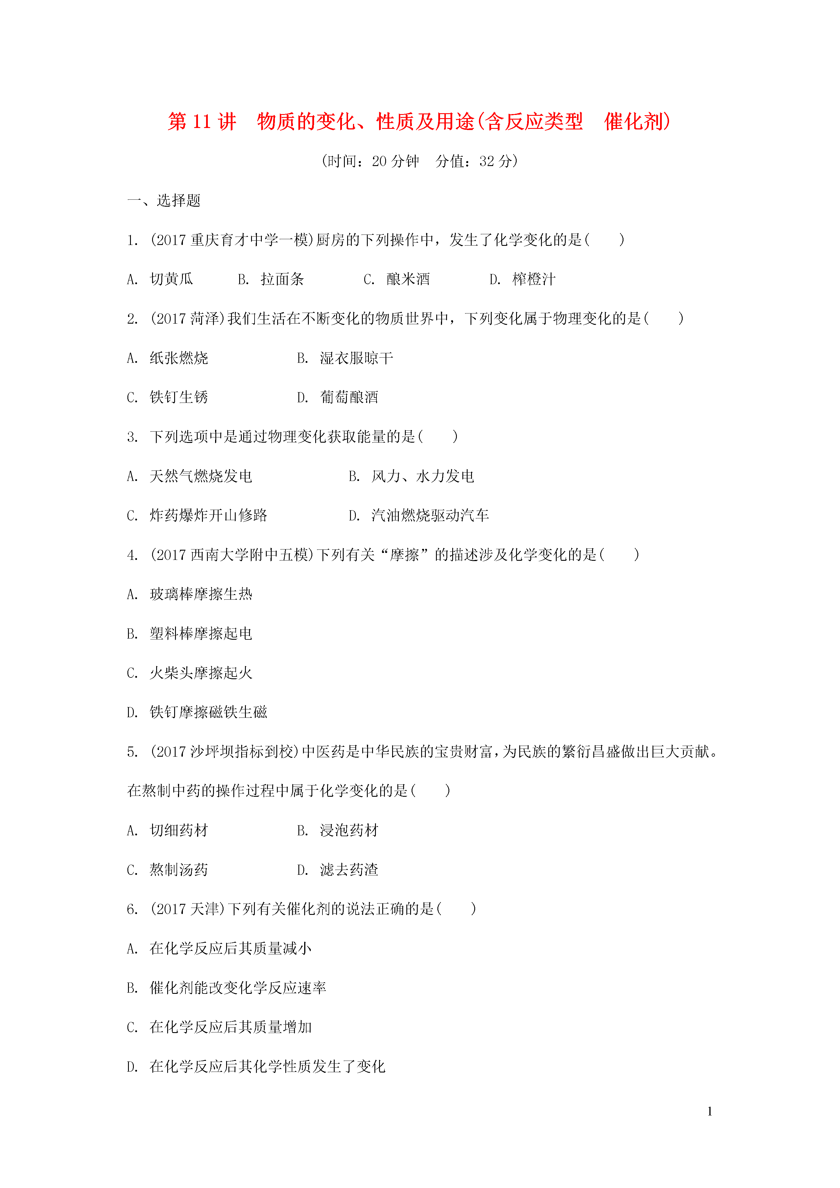 试题-重庆-2019_重庆市2018年中考化学总复习 第一轮 基础知识研究 第二单元 化学基本概念和原理 第11讲 物质的变化、性质及用途练习.doc