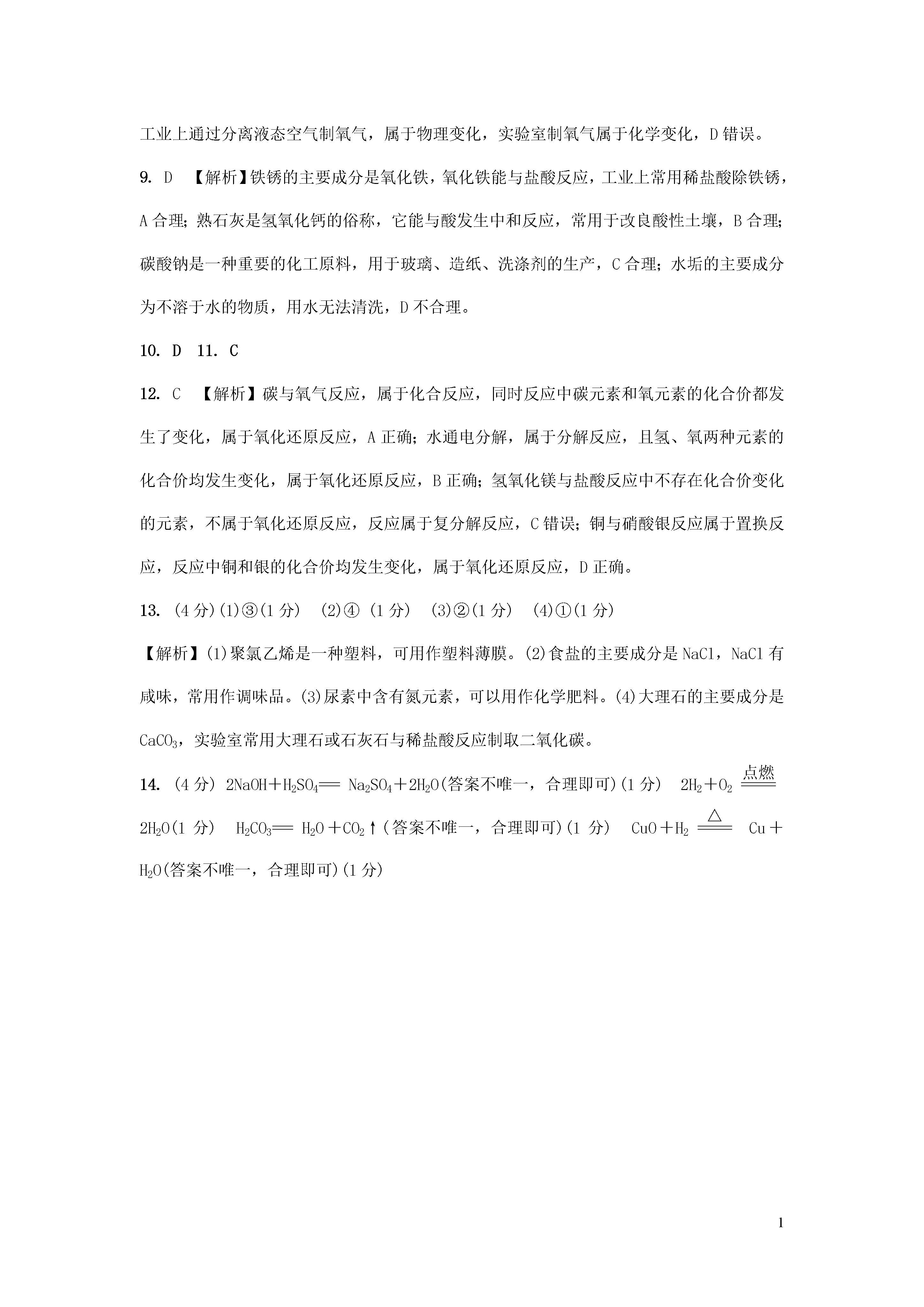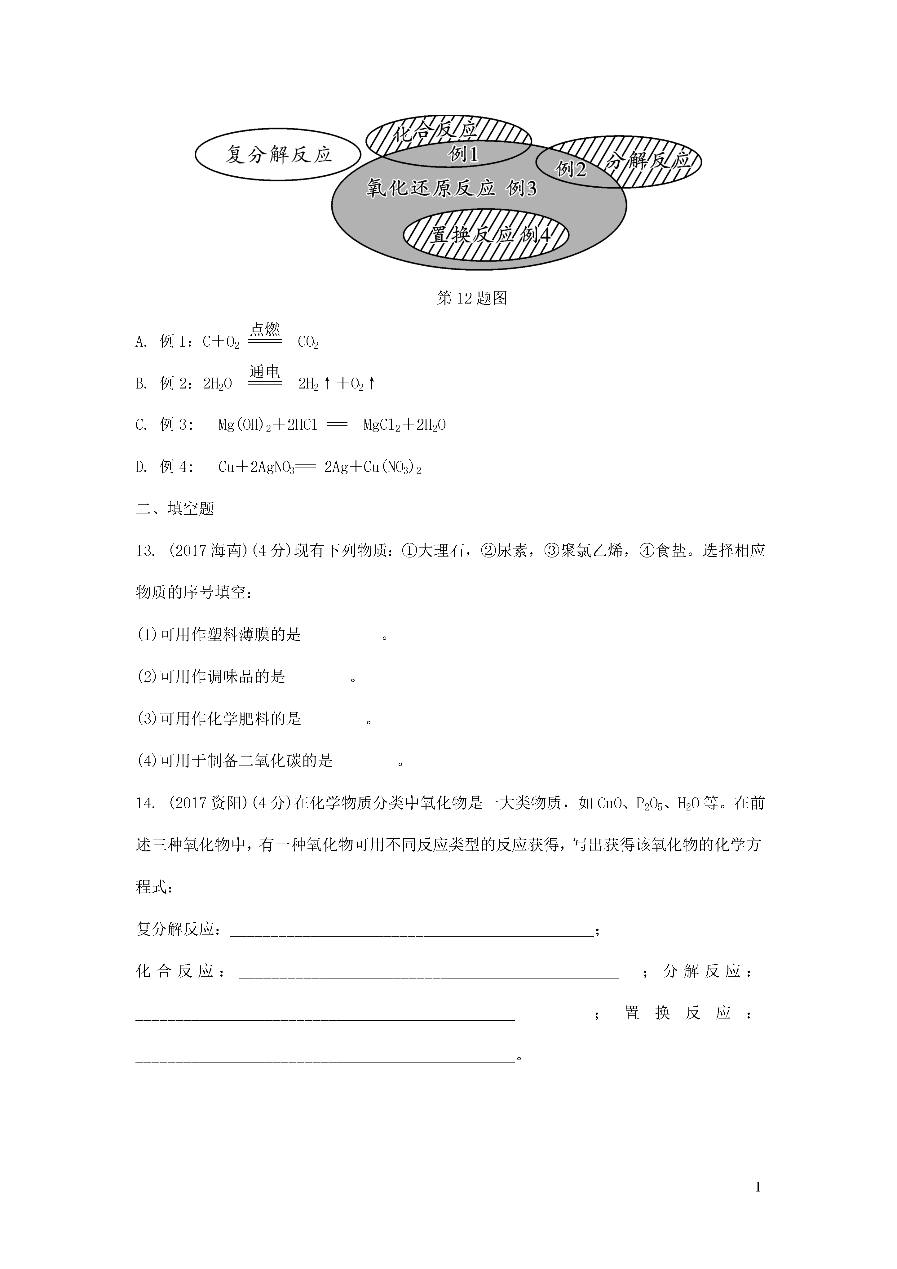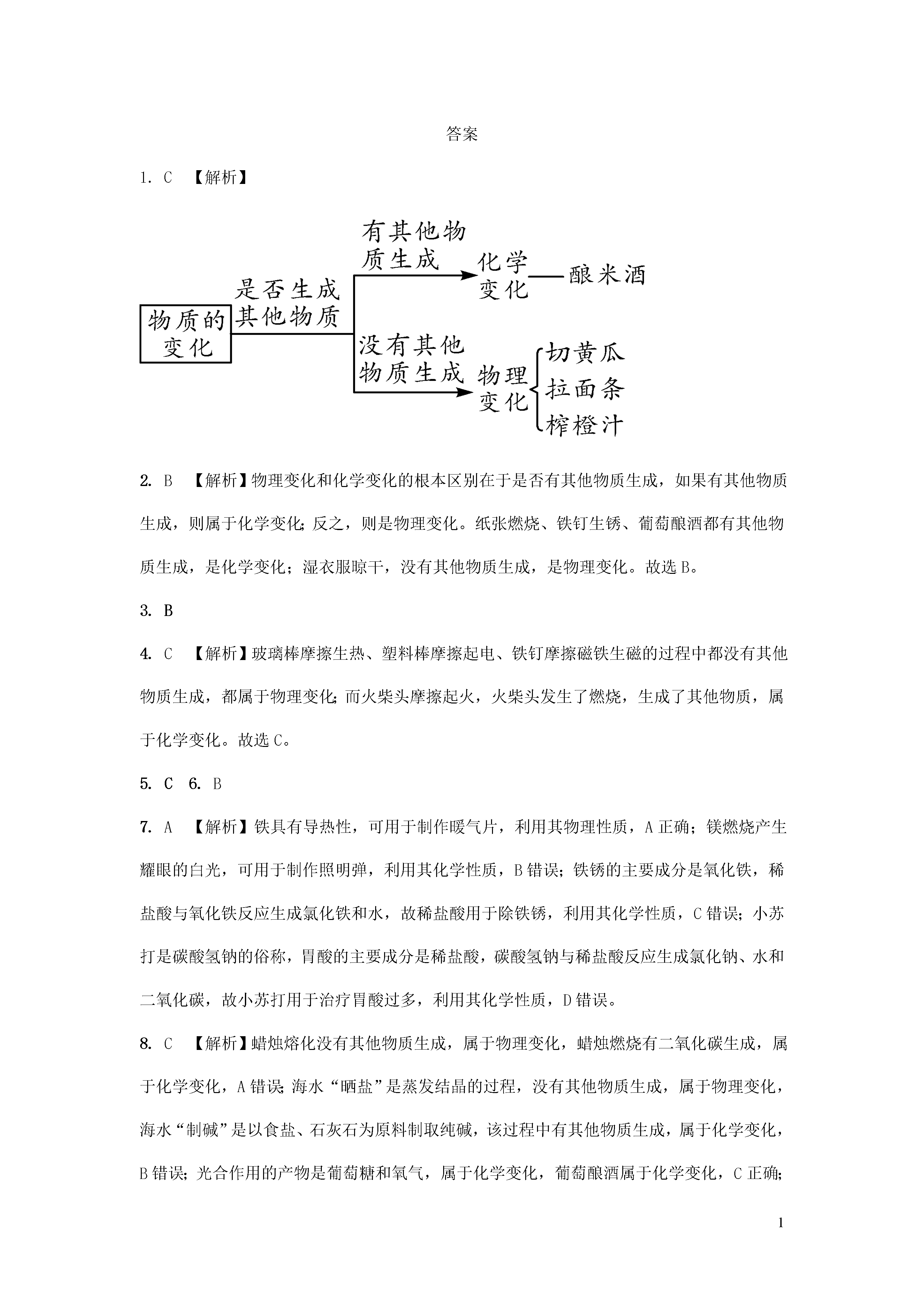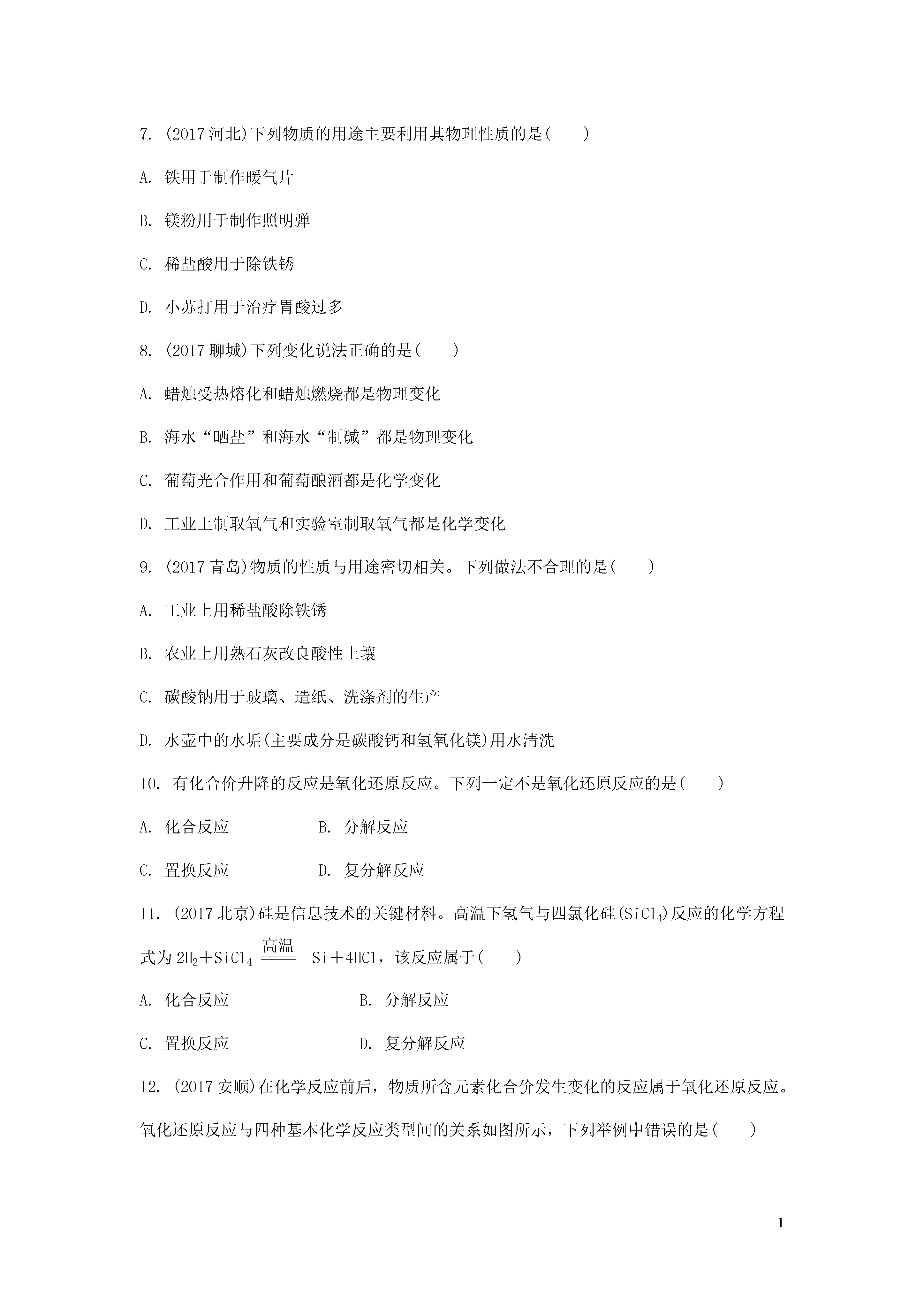 1第11讲物质的变化、性质及用途(含反应类型催化剂)(时间:20分钟分值:32分)一、选择题1.(2017重庆育才中学一模)厨房的下列操作中,发生了化学变化的是()A.切黄瓜B.拉面条C.酿米酒D.榨橙汁2.(2017菏泽)我们生活在不断变化的物质世界中,下列变化属于物理变化的是()A.纸张燃烧B.湿衣服晾干C.铁钉生锈D.葡萄酿酒3.下列选项中是通过物理变化获取能量的是()A.天然气燃烧发电B.风力、水力发电C.炸药爆炸开山修路D.汽油燃烧驱动汽车4.(2017西南大学附中五模)下列有关“摩擦”的描述涉及化学变化的是()A.玻璃棒摩擦生热B.塑料棒摩擦起电C.火柴头摩擦起火D.铁钉摩擦磁铁生磁5.(2017沙坪坝指标到校)中医药是中华民族的宝贵财富,为民族的繁衍昌盛做出巨大贡献。在熬制中药的操作过程中属于化学变化的是()A.切细药材B.浸泡药材C.熬制汤药D.滤去药渣6.(2017天津)下列有关催化剂的说法正确的是()A.在化学反应后其质量减小B.催化剂能改变化学反应速率C.在化学反应后其质量增加D.在化学反应后其化学性质发生了变化7.(2017河北)下列物质的用途主要利用其物理性质的是()A.铁用于制作暖气片B.镁粉用于制作照明弹C.稀盐酸用于除铁锈D.小苏打用于治疗胃酸过多8.(2017聊城)下列变化说法正确的是()A.蜡烛受热熔化和蜡烛燃烧都是物理变化B.海水“晒盐”和海水“制碱”都是物理变化C.葡萄光合作用和葡萄酿酒都是化学变化D.工业上制取氧气和实验室制取氧气都是化学变化9.(2017青岛)物质的性质与用途密切相关。下列做法不合理的是()A.工业上用稀盐酸除铁锈B.农业上用熟石灰改良酸性土壤C.碳酸钠用于玻璃、造纸、洗涤剂的生产D.水壶中的水垢(主要成分是碳酸钙和氢氧化镁)用水清洗10.有化合价升降的反应是氧化还原反应。下列一定不是氧化还原反应的是()A.化合反应B.分解反应C.置换反应D.复分解反应11.(2017北京)硅是信息技术的关键材料。高温下氢气与四氯化硅(SiCl4)反应的化学方程式为2H2+SiCl4eq\o(=====,\s\up7(高温))Si+4HCl,该反应属于()A.化合反应B.分解反应C.置换反应D.复分解反应12.(2017安顺)在化学反应前后,物质所含元素化合价发生变化的反应属于氧化还原反应。氧化还原反应与四种基本化学反应类型间的关系如图所示,下列举例中错误的是()第12题图A.例1:C+O2eq\o(=====,\s\up7(点燃))CO2B.例2:2H2Oeq\o(=====,\s\up7(通电))2H2↑+O2↑C.例3:Mg(OH)2+2HCl===MgCl2+2H2OD.例4:Cu+2AgNO3===2Ag+Cu(NO3)2二、填空题13.(2017海南)(4分)现有下列物质:①大理石,②尿素,③聚氯乙烯,④食盐。选择相应物质的序号填空:(1)可用作塑料薄膜的是__________。(2)可用作调味品的是________。(3)可用作化学肥料的是________。(4)可用于制备二氧化碳的是________。14.(2017资阳)(4分)在化学物质分类中氧化物是一大类物质,如CuO、P2O5、H2O等。在前述三种氧化物中,有一种氧化物可用不同反应类型的反应获得,写出获得该氧化物的化学方程式:复分解反应:______________________________________________;化合反应:________________________________________________;分解反应:________________________________________________;置换反应:________________________________________________。答案1.C【解析】2.B【解析】物理变化和化学变化的根本区别在于是否有其他物质生成,如果有其他物质生成,则属于化学变化;反之,则是物理变化。纸张燃烧、铁钉生锈、葡萄酿酒都有其他物质生成,是化学变化;湿衣服晾干,没有其他物质生成,是物理变化。故选B。3.B4.C【解析】玻璃棒摩擦生热、塑料棒摩擦起电、铁钉摩擦磁铁生磁的过程中都没有其他物质生成,都属于物理变化;而火柴头摩擦起火,火柴头发生了燃烧,生成了其他物质,属于化学变化。故选C。5.C6.B7.A【解析】铁具有导热性,可用于制作暖气片,利用其物理性质,A正确;镁燃烧产生耀眼的白光,可用于制作照明弹,利用其化学性质,B错误;铁锈的主要成分是氧化铁,稀盐酸与氧化