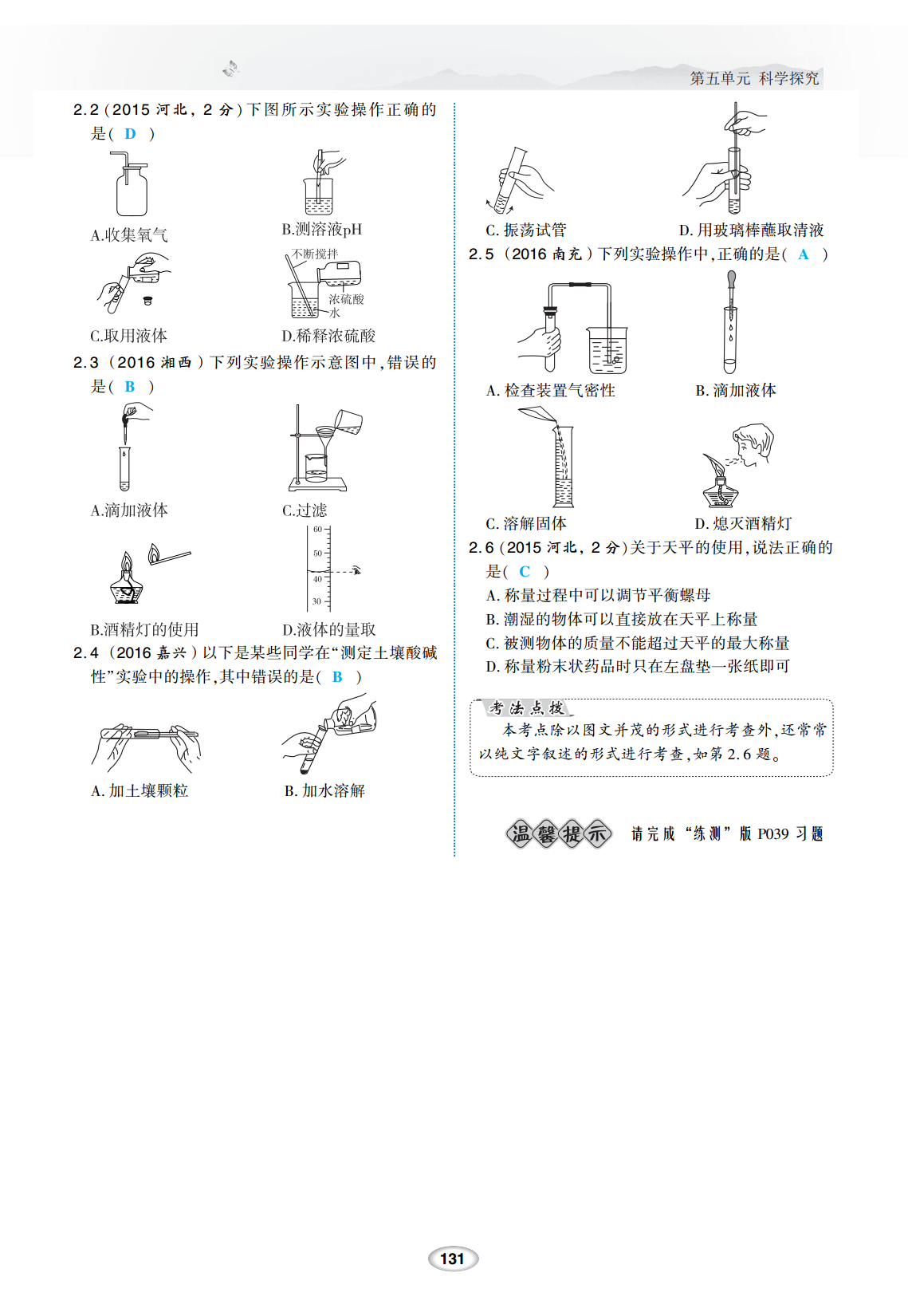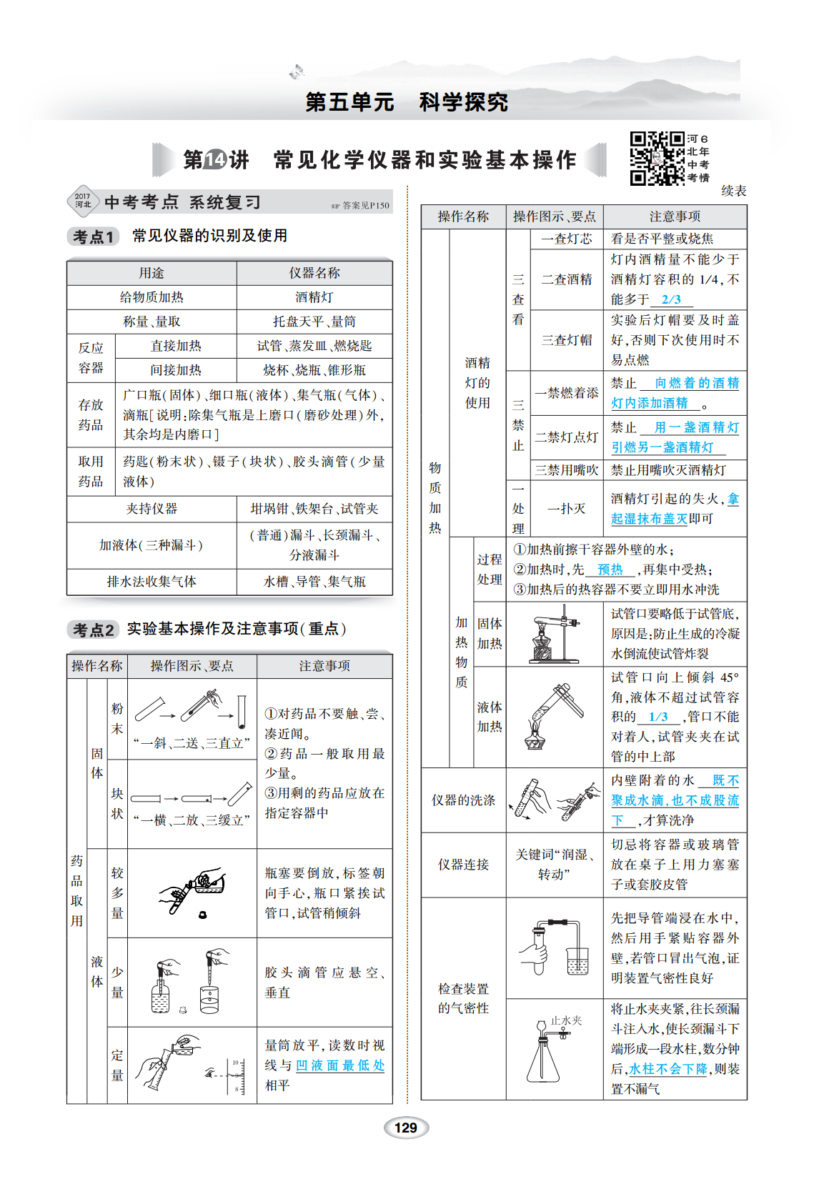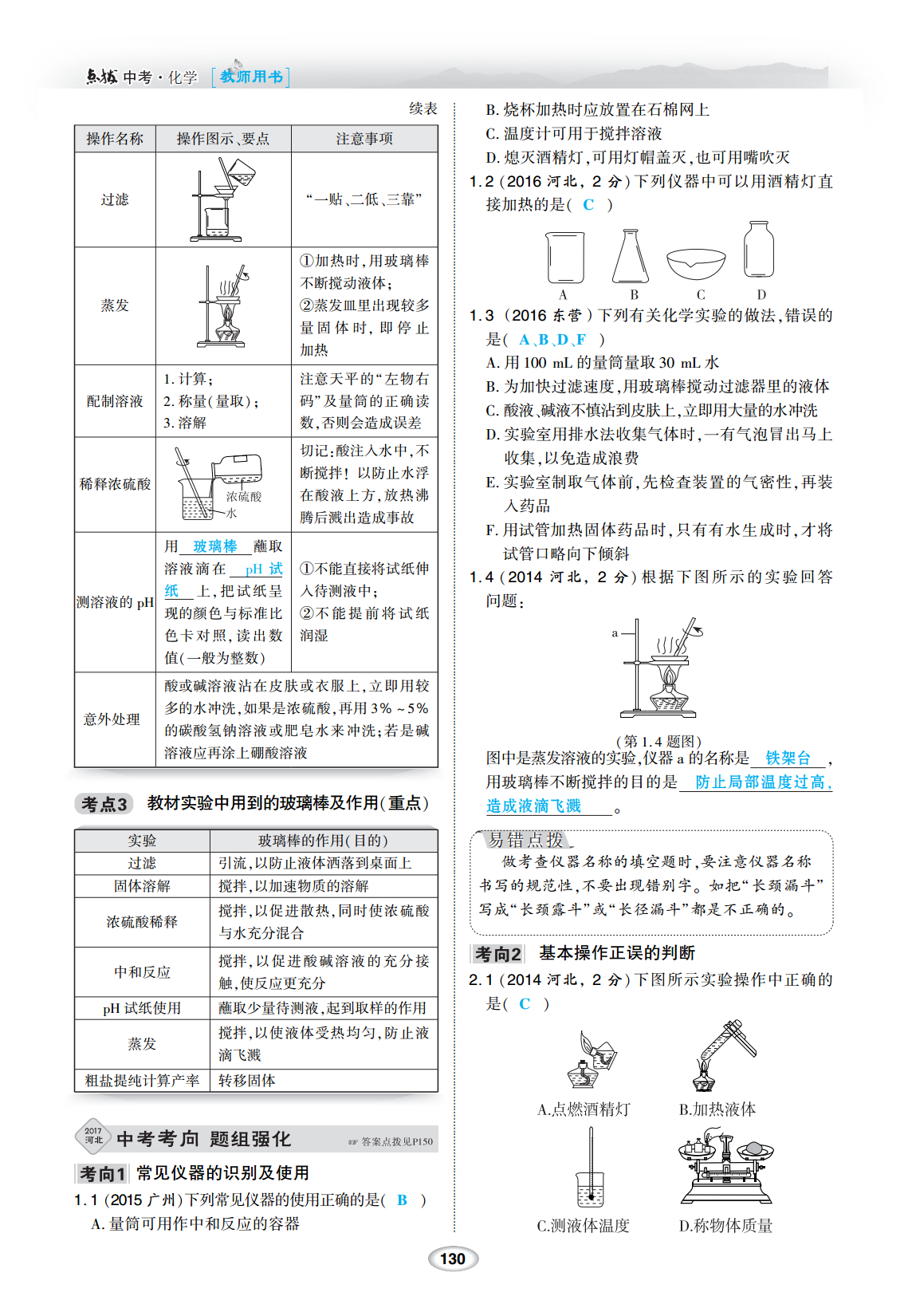 第五单元科学探究续表操作名称操作图示要点注意事项、常见仪器的识别及使用一查灯芯看是否平整或烧焦灯内酒精量不能少于用途仪器名称三二查酒精酒精灯容积的不1/4ꎬ给物质加热酒精灯查能多于23/看实验后灯帽要及时盖称量量取托盘天平量筒、、三查灯帽好否则下次使用时不反应直接加热试管蒸发皿燃烧匙ꎬ、、酒精易点燃容器间接加热烧杯烧瓶锥形瓶、、灯的禁止向燃着的酒精广口瓶固体细口瓶液体集气瓶气体一禁燃着添存放()、()、()、使用三灯内添加酒精滴瓶说明除集气瓶是上磨口磨砂处理外ꎮ药品[:()ꎬ禁禁止用一盏酒精灯其余均是内磨口二禁灯点灯]止引燃另一盏酒精灯取用药匙粉末状镊子块状胶头滴管少量()、()、(物三禁用嘴吹禁止用嘴吹灭酒精灯药品液体)质一酒精灯引起的失火拿夹持仪器坩埚钳铁架台试管夹加处一扑灭ꎬ、、起湿抹布盖灭即可热理普通漏斗长颈漏斗加液体三种漏斗()、、加热前擦干容器外壁的水()分液漏斗过程①ꎻ加热时先预热再集中受热排水法收集气体水槽导管集气瓶处理②ꎬꎬꎻ、、加热后的热容器不要立即用水冲洗③试管口要略低于试管底实验基本操作及注意事项重点加固体ꎬ()原因是防止生成的冷凝热加热:水倒流使试管炸裂物操作名称操作图示要点注意事项、质试管口向上倾斜45°角液体不超过试管容液体ꎬ粉对药品不要触尝积的13管口不能末①、、加热/ꎬ凑近闻对着人试管夹夹在试一斜二送三直立ꎮ“、、”ꎬ固药品一般取用最②管的中上部体少量ꎮ内壁附着的水既不块用剩的药品应放在③仪器的洗涤聚成水滴也不成股流状指定容器中ꎬ一横二放三缓立下才算洗净“、、”ꎬ切忌将容器或玻璃管药关键词润湿仪器连接“、放在桌子上用力塞塞较瓶塞要倒放标签朝转动品ꎬ”子或套胶皮管多向手心瓶口紧挨试取ꎬ量管口试管稍倾斜先把导管端浸在水中用ꎬꎬ然后用手紧贴容器外液壁若管口冒出气泡证少胶头滴管应悬空ꎬꎬ体、明装置气密性良好量垂直检查装置的气密性将止水夹夹紧往长颈漏ꎬ斗注入水使长颈漏斗下ꎬ量筒放平读数时视端形成一段水柱数分钟定ꎬꎬ线与凹液面最低处后水柱不会下降则装量ꎬꎬ相平置不漏气129化学教师用书[]续表烧杯加热时应放置在石棉网上B.操作名称操作图示要点注意事项温度计可用于搅拌溶液、C.熄灭酒精灯可用灯帽盖灭也可用嘴吹灭D.ꎬꎬ122016河北,2分下列仪器中可以用酒精灯直过滤一贴二低三靠.()“、、”接加热的是C()加热时用玻璃棒①ꎬ不断搅动液体ꎻ蒸发蒸发皿里出现较多②13(2016东营)下列有关化学实验的做法错误的量固体时即停止.ꎬꎬ是ABDF加热(、、、)用的量筒量取水计算注意天平的左物右A.100mL30mL1.ꎻ“为加快过滤速度用玻璃棒搅动过滤器里的液体配制溶液称量量取码及量筒的正确读B.ꎬ2.()ꎻ”酸液碱液不慎沾到皮肤上立即用大量的水冲洗溶解数否则会造成误差C.、ꎬ3.ꎬ实验室用排水法收集气体时一有气泡冒出马上切记酸注入水中不D.ꎬ:ꎬ收集以免造成浪费断搅拌以防止水浮ꎬ稀释浓硫酸!实验室制取气体前先检査装置的气密性再装在酸液上方放热沸E.ꎬꎬꎬ入药品腾后溅出造成事故用试管加热固体药品时只有有水生成时才将用玻璃棒蘸取F.ꎬꎬ试管口略向下倾斜溶液滴在试不能直接将试纸伸河北,分pH①1420142根据下图所示的实验回答.()纸上把试纸呈入待测液中测溶液的ꎬꎻ问题pH现的颜色与标准比不能提前将试纸:②色卡对照读出数润湿ꎬ值一般为整数()酸或碱溶液沾在皮肤或衣服上立即用较ꎬ多的水冲洗如果是浓硫酸再用%%意外处理ꎬꎬ3~5的碳酸氢钠溶液或肥皂水来冲洗若是碱ꎻ第题图溶液应再涂上硼酸溶液图中是蒸发溶液的实(验1仪.4器的)名称是铁架台ꎬaꎬ用玻璃棒不断搅拌的目的是防止局部温度过高ꎬ教材实验中用到的玻璃棒及作用重点造成液滴飞溅()ꎮ实验玻璃棒的作用目的易错点拨()做考查仪器名称的填空题时要注意仪器名称过滤引流以防止液体洒落到桌
