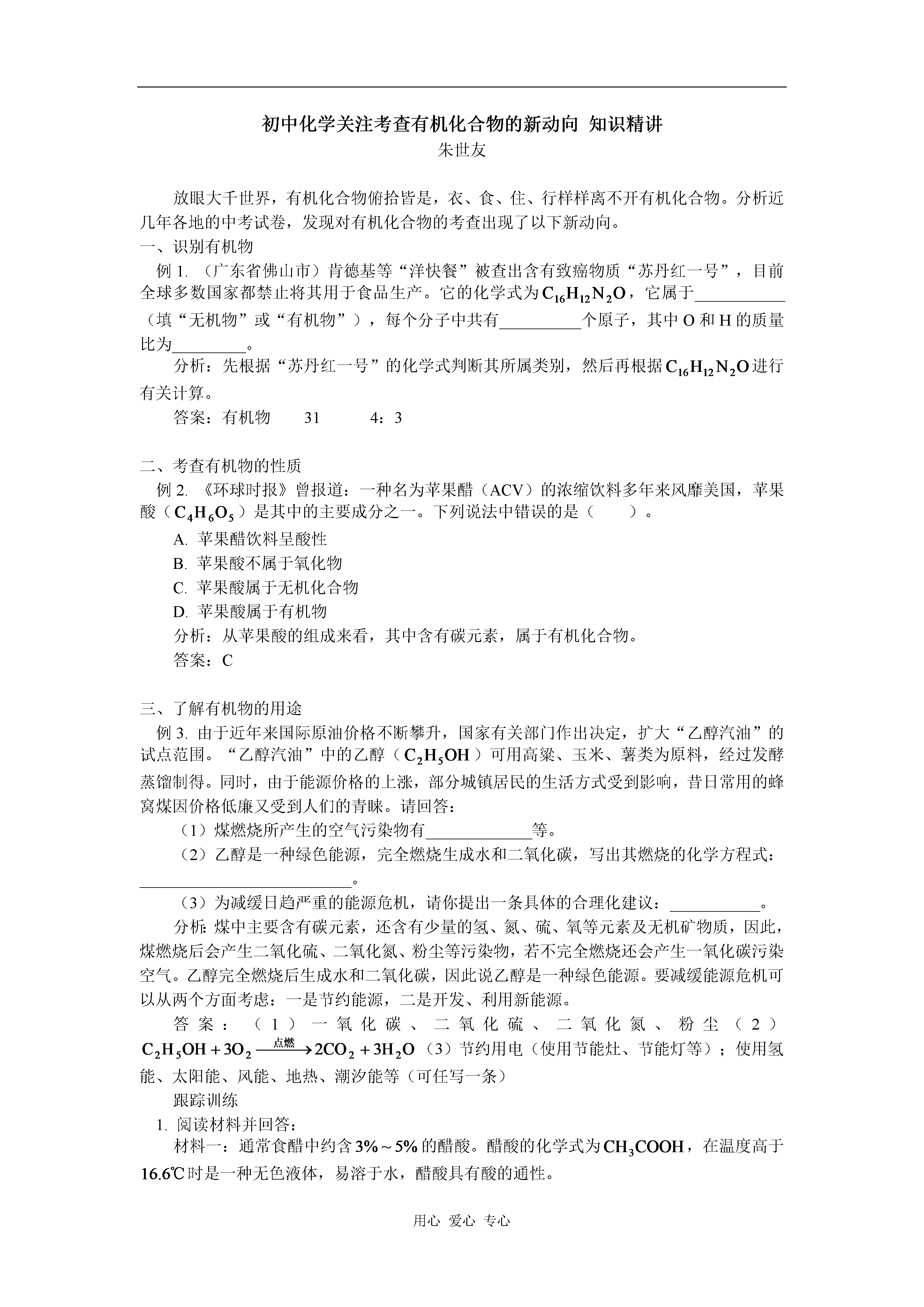 用心爱心专心初中化学关注考查有机化合物的新动向知识精讲朱世友放眼大千世界,有机化合物俯拾皆是,衣、食、住、行样样离不开有机化合物。分析近几年各地的中考试卷,发现对有机化合物的考查出现了以下新动向。一、识别有机物例1.(广东省佛山市)肯德基等“洋快餐”被查出含有致癌物质“苏丹红一号”,目前全球多数国家都禁止将其用于食品生产。它的化学式为,它属于___________(填“无机物”或“有机物”),每个分子中共有__________个原子,其中O和H的质量比为_________。分析:先根据“苏丹红一号”的化学式判断其所属类别,然后再根据进行有关计算。答案:有机物314:3二、考查有机物的性质例2.《环球时报》曾报道:一种名为苹果醋(ACV)的浓缩饮料多年来风靡美国,苹果酸()是其中的主要成分之一。下列说法中错误的是()。A.苹果醋饮料呈酸性B.苹果酸不属于氧化物C.苹果酸属于无机化合物D.苹果酸属于有机物分析:从苹果酸的组成来看,其中含有碳元素,属于有机化合物。答案:C三、了解有机物的用途例3.由于近年来国际原油价格不断攀升,国家有关部门作出决定,扩大“乙醇汽油”的试点范围。“乙醇汽油”中的乙醇()可用高粱、玉米、薯类为原料,经过发酵蒸馏制得。同时,由于能源价格的上涨,部分城镇居民的生活方式受到影响,昔日常用的蜂窝煤因价格低廉又受到人们的青睐。请回答:(1)煤燃烧所产生的空气污染物有_____________等。(2)乙醇是一种绿色能源,完全燃烧生成水和二氧化碳,写出其燃烧的化学方程式:__________________________。(3)为减缓日趋严重的能源危机,请你提出一条具体的合理化建议:___________。分析:煤中主要含有碳元素,还含有少量的氢、氮、硫、氧等元素及无机矿物质,因此,煤燃烧后会产生二氧化硫、二氧化氮、粉尘等污染物,若不完全燃烧还会产生一氧化碳污染空气。乙醇完全燃烧后生成水和二氧化碳,因此说乙醇是一种绿色能源。要减缓能源危机可以从两个方面考虑:一是节约能源,二是开发、利用新能源。答案:(1)一氧化碳、二氧化硫、二氧化氮、粉尘(2)(3)节约用电(使用节能灶、节能灯等);使用氢能、太阳能、风能、地热、潮汐能等(可任写一条)跟踪训练1.阅读材料并回答:材料一:通常食醋中约含的醋酸。醋酸的化学式为,在温度高于时是一种无色液体,易溶于水,醋酸具有酸的通性。材料二:钙是人体中的一种常量元素,人们每日必须摄入一定量的钙。动物的骨头中含有磷酸钙,磷酸钙难溶于水,但能跟酸反应生成可溶性钙盐。(1)在10℃时,醋酸的状态是___________。(2)生活中能否用铝制品来盛放食醋?___________,原因是__________________。(3)人们在熬骨头汤时,常常会加入少量食醋,这样做的理由是_______________。2.海底矿产资源“可燃冰”,其主要成分是水合甲烷晶体(),若水合甲烷晶体中的质量分数为10%,则水合甲烷晶体的化学式为____________。参考答案:1.(1)固态(2)不能因为铝会跟食醋中的醋酸反应(3)使不溶于水的磷酸钙转变为可溶性钙盐,便于人体吸收2.