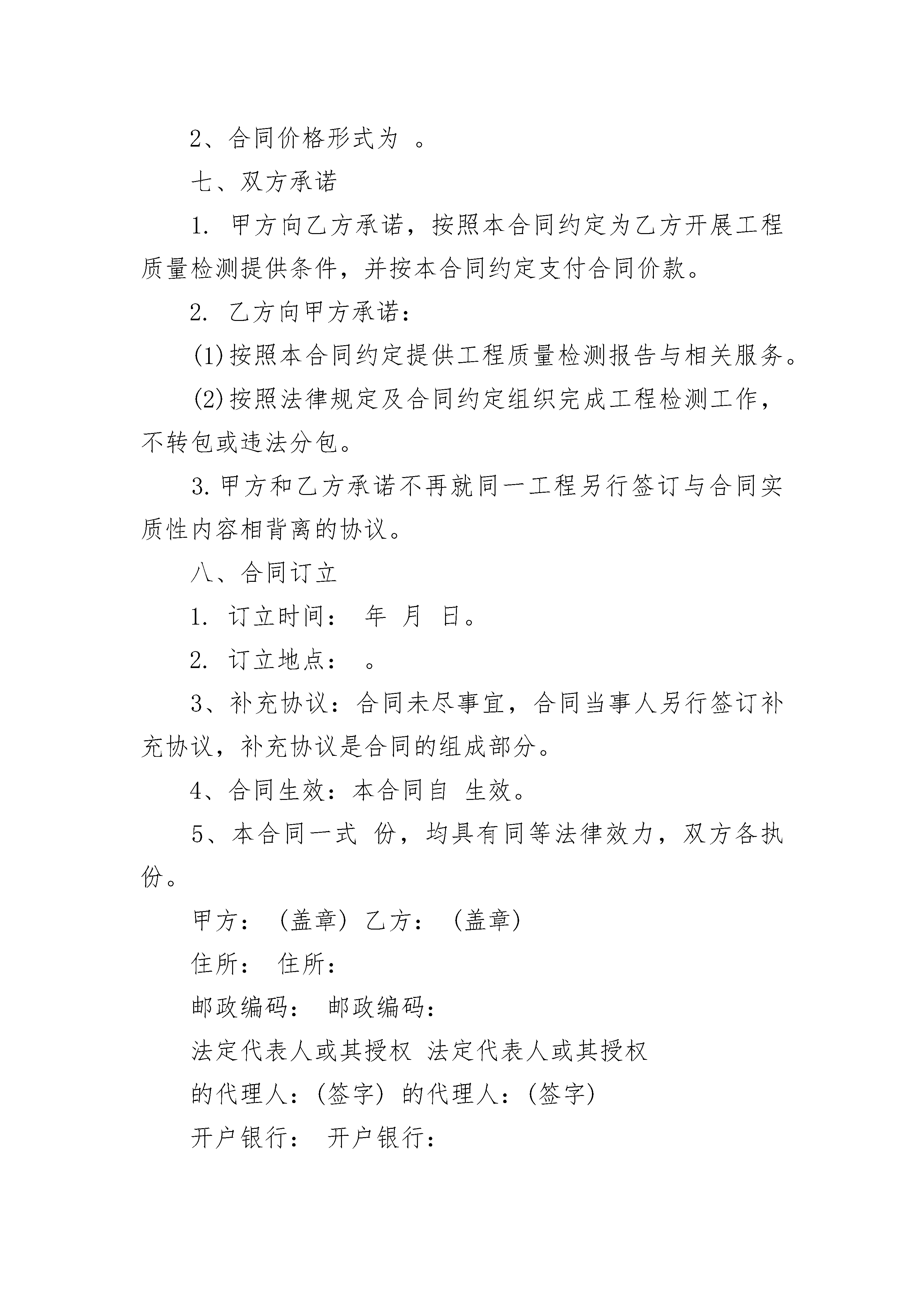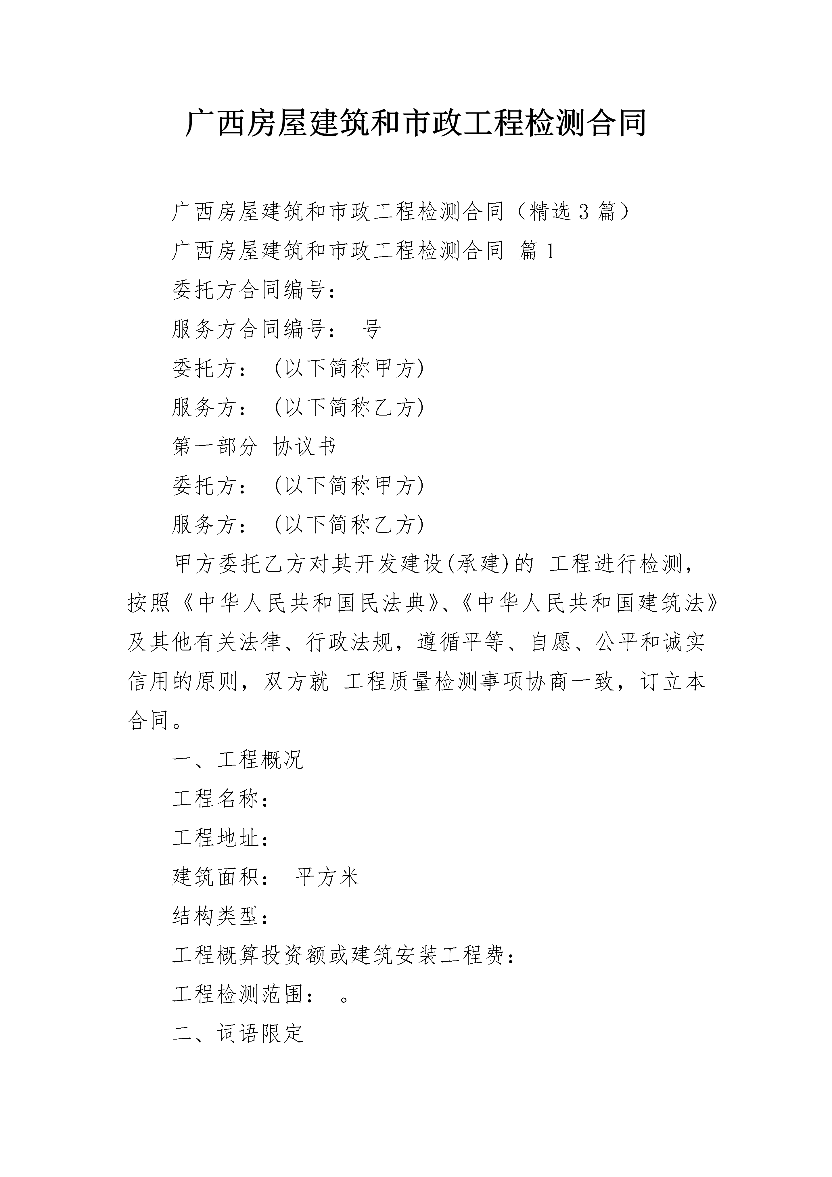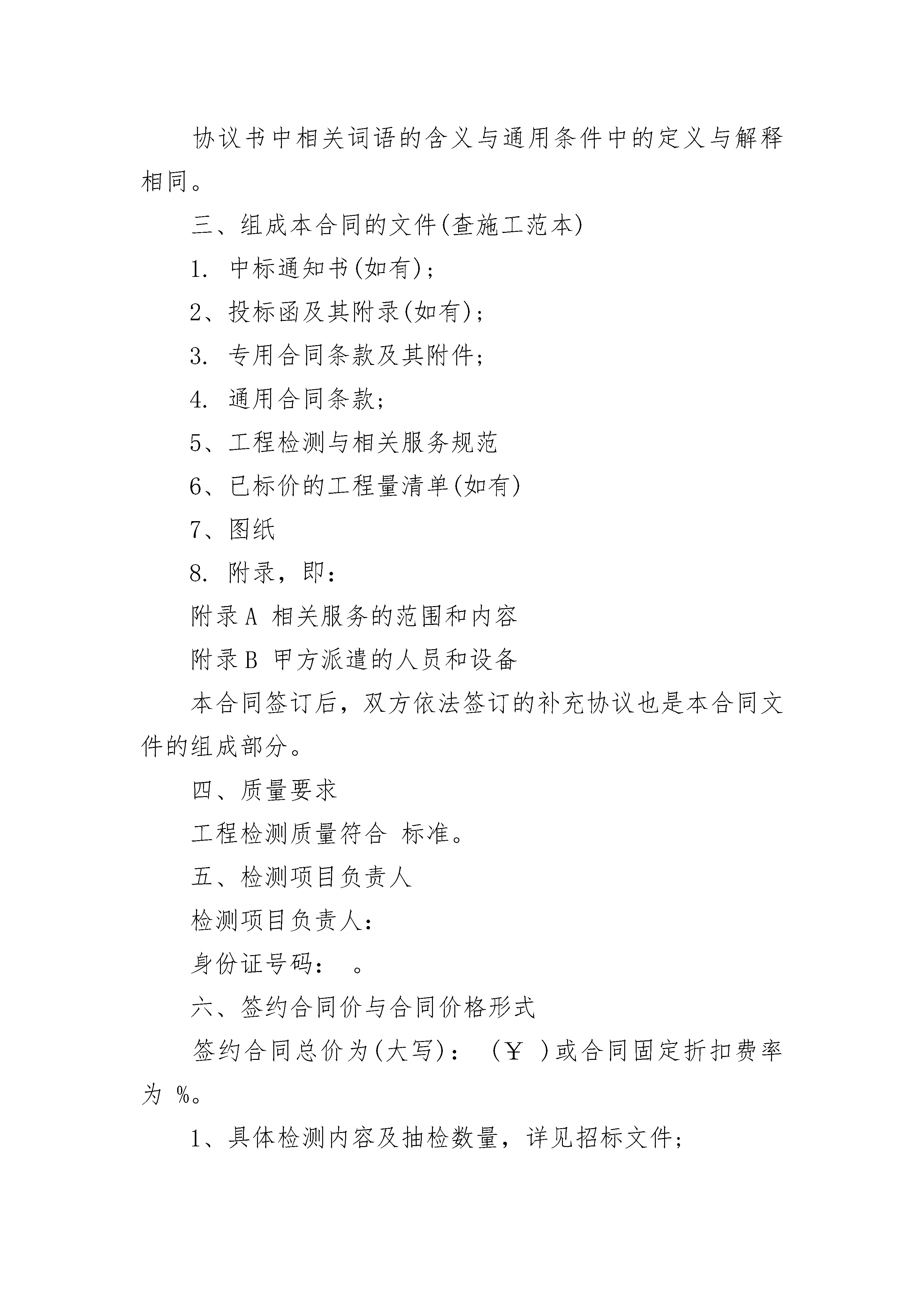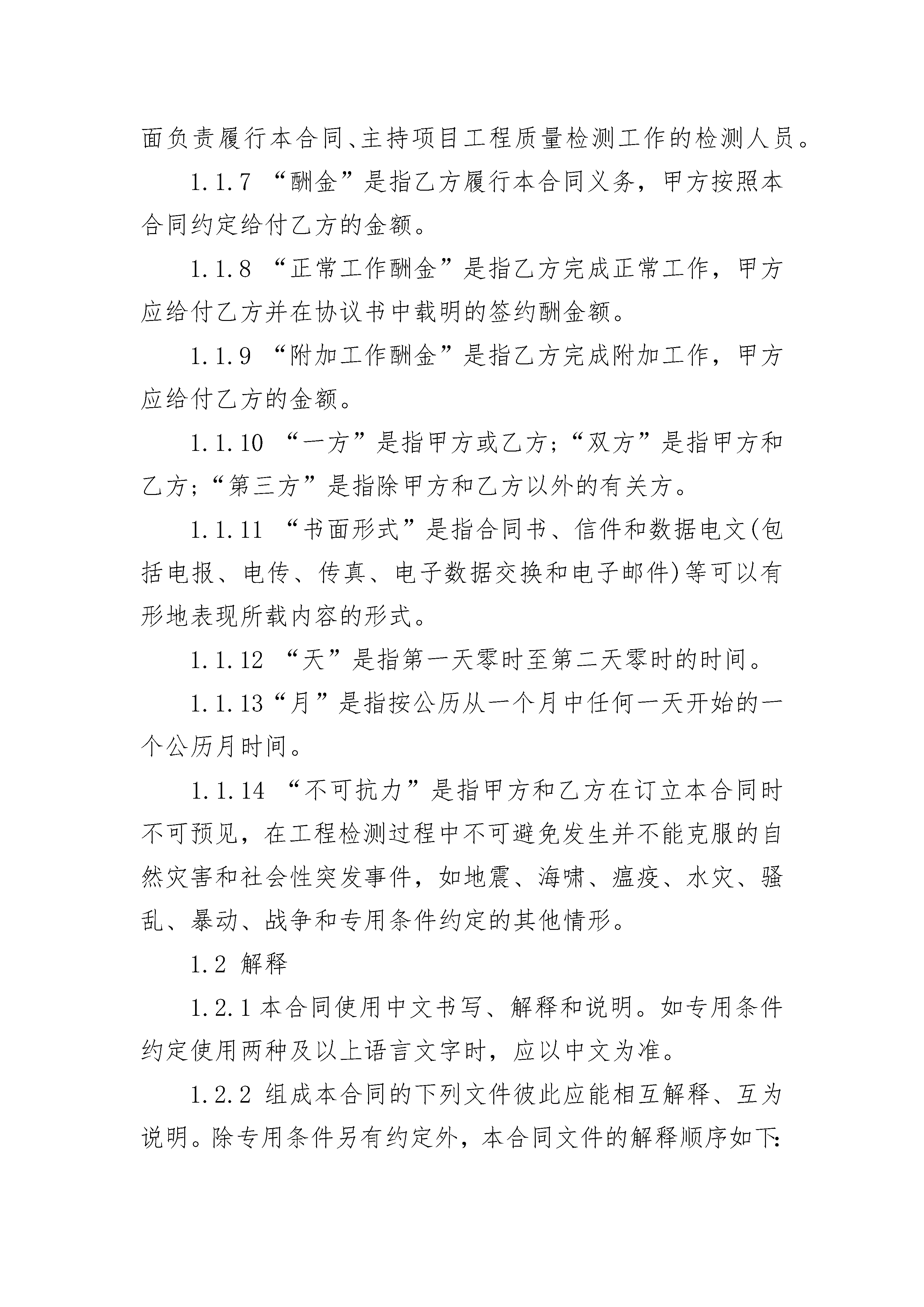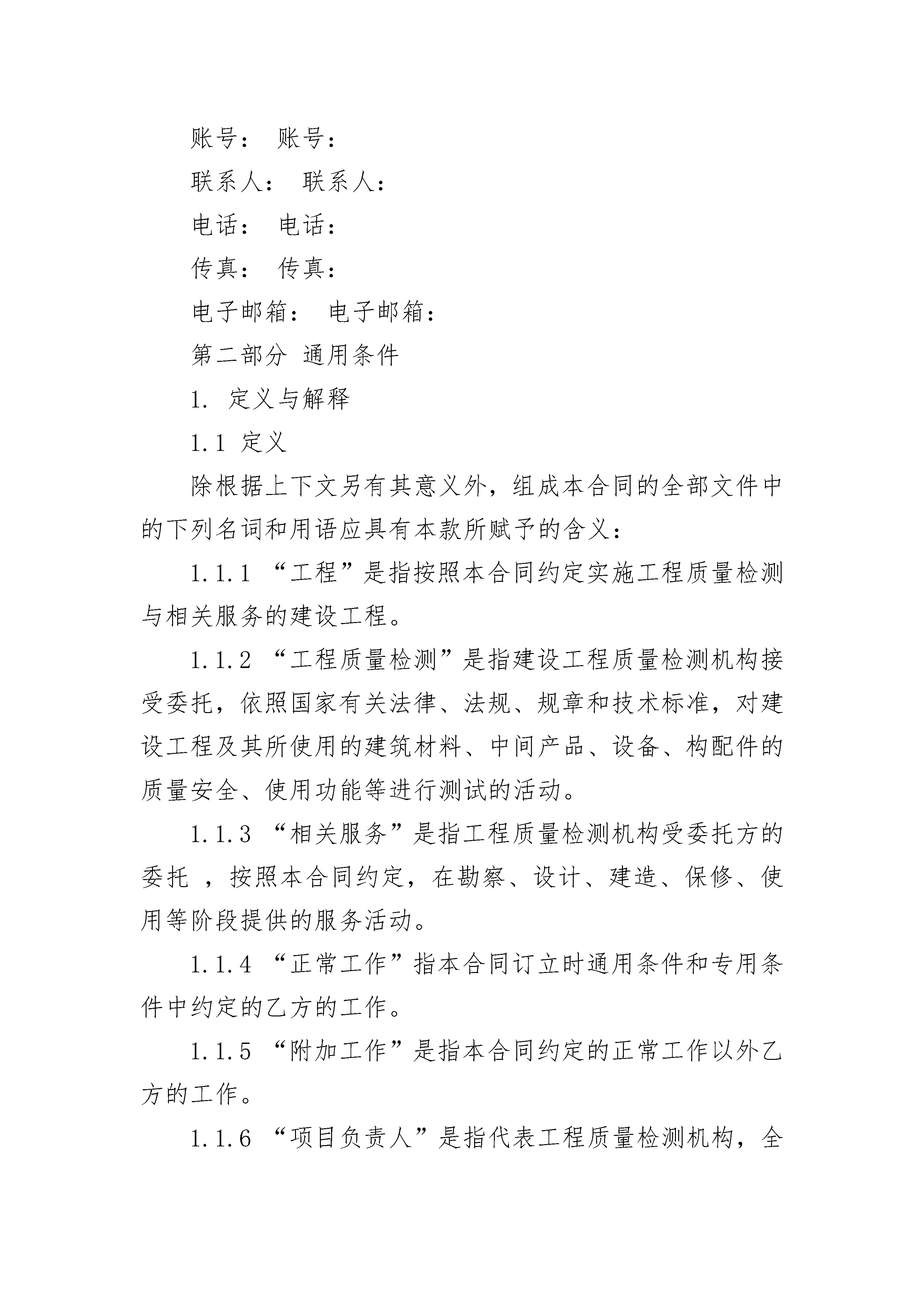 广西房屋建筑和市政工程检测合同广西房屋建筑和市政工程检测合同(精选3篇)广西房屋建筑和市政工程检测合同篇1委托方合同编号:服务方合同编号:号委托方:(以下简称甲方)服务方:(以下简称乙方)第一部分协议书委托方:(以下简称甲方)服务方:(以下简称乙方)甲方委托乙方对其开发建设(承建)的工程进行检测,按照《中华人民共和国民法典》、《中华人民共和国建筑法》及其他有关法律、行政法规,遵循平等、自愿、公平和诚实信用的原则,双方就工程质量检测事项协商一致,订立本合同。一、工程概况工程名称:工程地址:建筑面积:平方米结构类型:工程概算投资额或建筑安装工程费:工程检测范围:。二、词语限定协议书中相关词语的含义与通用条件中的定义与解释相同。三、组成本合同的文件(查施工范本)1.中标通知书(如有);2、投标函及其附录(如有);3.专用合同条款及其附件;4.通用合同条款;5、工程检测与相关服务规范6、已标价的工程量清单(如有)7、图纸8.附录,即:附录A相关服务的范围和内容附录B甲方派遣的人员和设备本合同签订后,双方依法签订的补充协议也是本合同文件的组成部分。四、质量要求工程检测质量符合标准。五、检测项目负责人检测项目负责人:身份证号码:。六、签约合同价与合同价格形式签约合同总价为(大写):(¥)或合同固定折扣费率为%。1、具体检测内容及抽检数量,详见招标文件;2、合同价格形式为。七、双方承诺1.甲方向乙方承诺,按照本合同约定为乙方开展工程质量检测提供条件,并按本合同约定支付合同价款。2.乙方向甲方承诺:(1)按照本合同约定提供工程质量检测报告与相关服务。(2)按照法律规定及合同约定组织完成工程检测工作,不转包或违法分包。3.甲方和乙方承诺不再就同一工程另行签订与合同实质性内容相背离的协议。八、合同订立1.订立时间:年月日。2.订立地点:。3、补充协议:合同未尽事宜,合同当事人另行签订补充协议,补充协议是合同的组成部分。4、合同生效:本合同自生效。5、本合同一式份,均具有同等法律效力,双方各执份。甲方:(盖章)乙方:(盖章)住所:住所:邮政编码:邮政编码:法定代表人或其授权法定代表人或其授权的代理人:(签字)的代理人:(签字)开户银行:开户银行:账号:账号:联系人:联系人:电话:电话:传真:传真:电子邮箱:电子邮箱:第二部分通用条件1.定义与解释1.1定义除根据上下文另有其意义外,组成本合同的全部文件中的下列名词和用语应具有本款所赋予的含义:1.1.1“工程”是指按照本合同约定实施工程质量检测与相关服务的建设工程。1.1.2“工程质量检测”是指建设工程质量检测机构接受委托,依照国家有关法律、法规、规章和技术标准,对建设工程及其所使用的建筑材料、中间产品、设备、构配件的质量安全、使用功能等进行测试的活动。1.1.3“相关服务”是指工程质量检测机构受委托方的委托,按照本合同约定,在勘察、设计、建造、保修、使用等阶段提供的服务活动。1.1.4“正常工作”指本合同订立时通用条件和专用条件中约定的乙方的工作。1.1.5“附加工作”是指本合同约定的正常工作以外乙方的工作。1.1.6“项目负责人”是指代表工程质量检测机构,全面负责履行本合同、主持项目工程质量检测工作的检测人员。1.1.7“酬金”是指乙方履行本合同义务,甲方按照本合同约定给付乙方的金额。1.1.8“正常工作酬金”是指乙方完成正常工作,甲方应给付乙方并在协议书中载明的签约酬金额。1.1.9“附加工作酬金”是指乙方完成附加工作,甲方应给付乙方的金额。1.1.10“一方”是指甲方或乙方;“双方”是指甲方和乙方;“第三方”是指除甲方和乙方以外的有关方。1.1.11“书面形式”是指合同书、信件和数据电文(包括电报、电传、传真、电子数据交换和电子邮件)等可以有形地表现所载内容的形式。1.1.12“天”是指第一天零时至第二天零时的时间。1.1.13“月”是指按公历从一个月中任何一天开始的一个公历月时间。1.1.14“不可抗力”是指甲方和乙方在订立本合同时不可预见,在工程检测过程中不可避免发生并不能克服的自然灾害和社会性突发事件,如地震、海啸、瘟疫、水灾、骚乱、暴动、战争和专用条件约定的其他情形。1.2解释1.2.1本合同使用中文书写、解释和说明。如专用条件约定使用两种及以上语言文字时,应以中文为准。1.2.2组成本合同的下列文件彼此应能相互解释、互为说明。除专用条件另有约定外,本合同文件的解释顺序如下:(1)协议书;(2)中标通知书;(3)专用条件及附录A、附录B;(4)通用条件;(5)投标文件。双方签订的补充协议与其他文件发生矛盾或歧义时,属于同一类内容的文件,应以最新签署的为准。2.乙方义务2.1乙方的工作范围和内容2.1.1乙方工作范围和内容在专用条件中约定。2.1.2相关服务的范围和内容在附录A中约