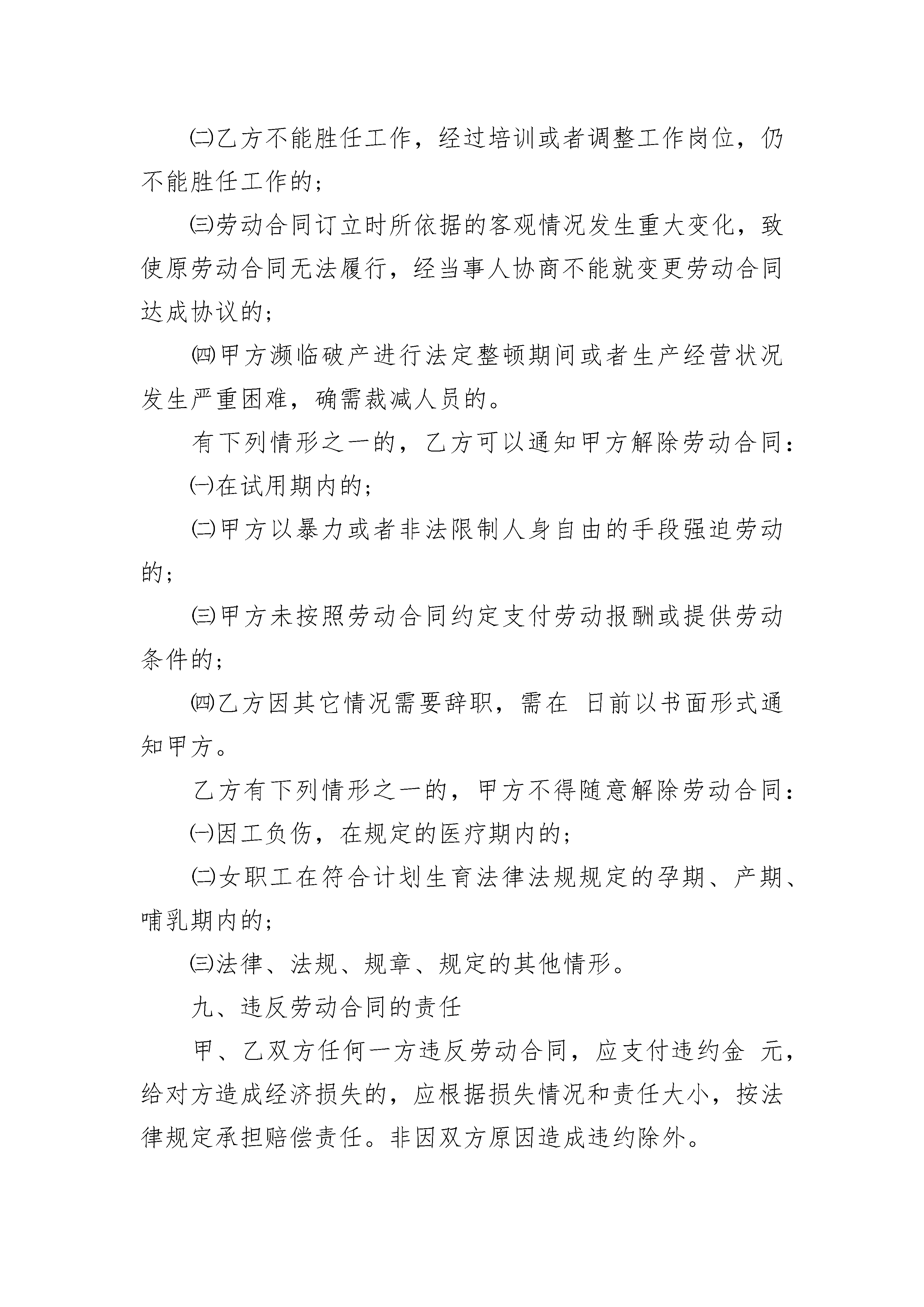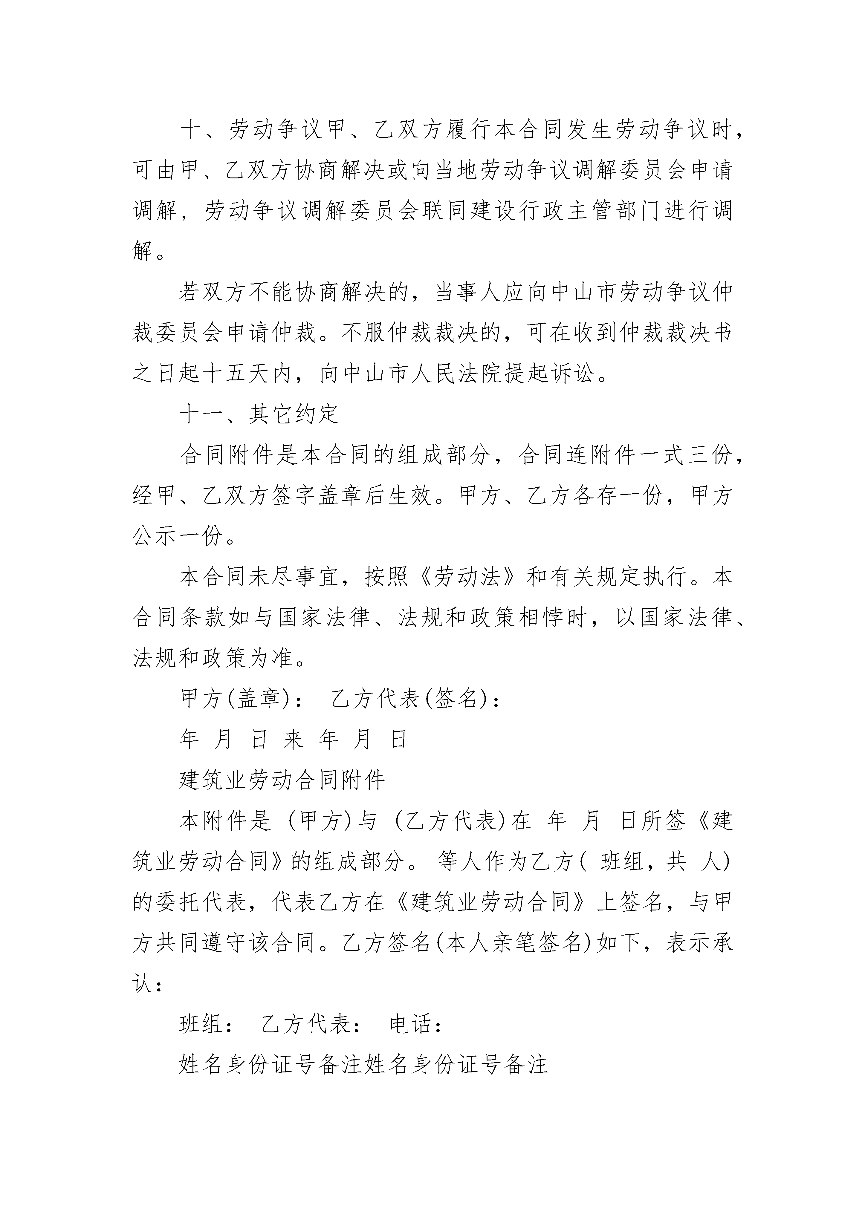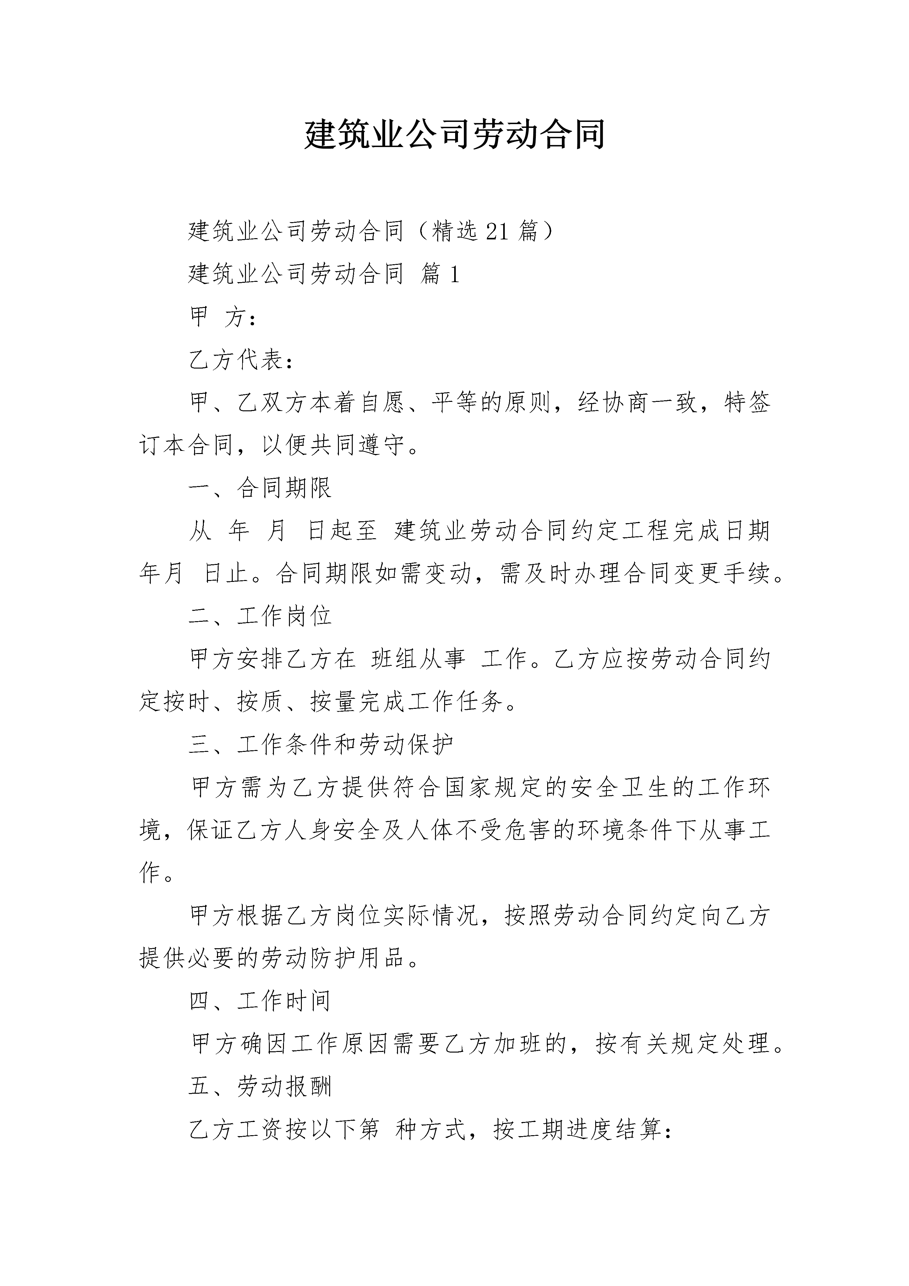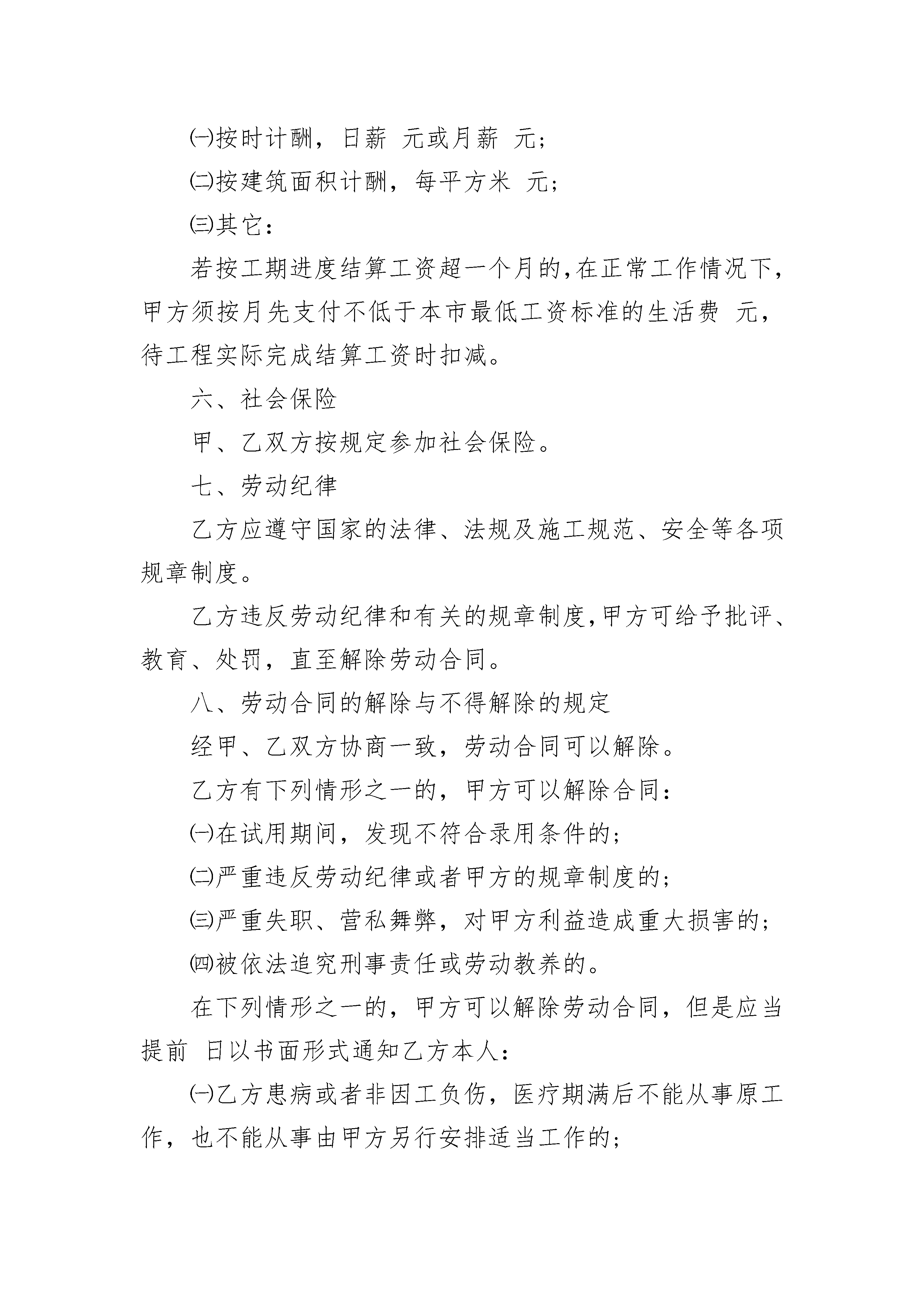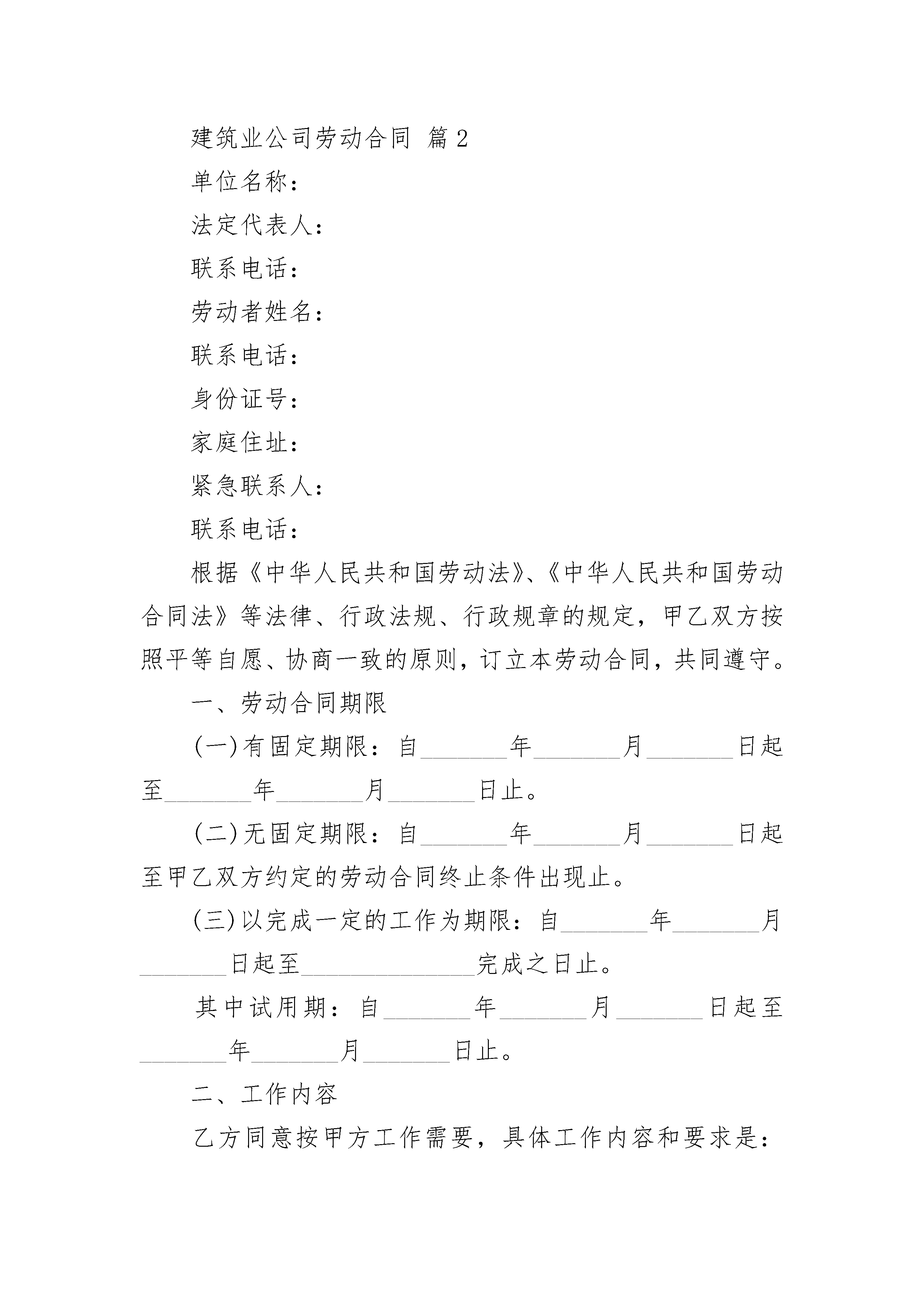 建筑业公司劳动合同建筑业公司劳动合同(精选21篇)建筑业公司劳动合同篇1甲方:乙方代表:甲、乙双方本着自愿、平等的原则,经协商一致,特签订本合同,以便共同遵守。一、合同期限从年月日起至建筑业劳动合同约定工程完成日期年月日止。合同期限如需变动,需及时办理合同变更手续。二、工作岗位甲方安排乙方在班组从事工作。乙方应按劳动合同约定按时、按质、按量完成工作任务。三、工作条件和劳动保护甲方需为乙方提供符合国家规定的安全卫生的工作环境,保证乙方人身安全及人体不受危害的环境条件下从事工作。甲方根据乙方岗位实际情况,按照劳动合同约定向乙方提供必要的劳动防护用品。四、工作时间甲方确因工作原因需要乙方加班的,按有关规定处理。五、劳动报酬乙方工资按以下第种方式,按工期进度结算:㈠按时计酬,日薪元或月薪元;㈡按建筑面积计酬,每平方米元;㈢其它:若按工期进度结算工资超一个月的,在正常工作情况下,甲方须按月先支付不低于本市最低工资标准的生活费元,待工程实际完成结算工资时扣减。六、社会保险甲、乙双方按规定参加社会保险。七、劳动纪律乙方应遵守国家的法律、法规及施工规范、安全等各项规章制度。乙方违反劳动纪律和有关的规章制度,甲方可给予批评、教育、处罚,直至解除劳动合同。八、劳动合同的解除与不得解除的规定经甲、乙双方协商一致,劳动合同可以解除。乙方有下列情形之一的,甲方可以解除合同:㈠在试用期间,发现不符合录用条件的;㈡严重违反劳动纪律或者甲方的规章制度的;㈢严重失职、营私舞弊,对甲方利益造成重大损害的;㈣被依法追究刑事责任或劳动教养的。在下列情形之一的,甲方可以解除劳动合同,但是应当提前日以书面形式通知乙方本人:㈠乙方患病或者非因工负伤,医疗期满后不能从事原工作,也不能从事由甲方另行安排适当工作的;㈡乙方不能胜任工作,经过培训或者调整工作岗位,仍不能胜任工作的;㈢劳动合同订立时所依据的客观情况发生重大变化,致使原劳动合同无法履行,经当事人协商不能就变更劳动合同达成协议的;㈣甲方濒临破产进行法定整顿期间或者生产经营状况发生严重困难,确需裁减人员的。有下列情形之一的,乙方可以通知甲方解除劳动合同:㈠在试用期内的;㈡甲方以暴力或者非法限制人身自由的手段强迫劳动的;㈢甲方未按照劳动合同约定支付劳动报酬或提供劳动条件的;㈣乙方因其它情况需要辞职,需在日前以书面形式通知甲方。乙方有下列情形之一的,甲方不得随意解除劳动合同:㈠因工负伤,在规定的医疗期内的;㈡女职工在符合计划生育法律法规规定的孕期、产期、哺乳期内的;㈢法律、法规、规章、规定的其他情形。九、违反劳动合同的责任甲、乙双方任何一方违反劳动合同,应支付违约金元,给对方造成经济损失的,应根据损失情况和责任大小,按法律规定承担赔偿责任。非因双方原因造成违约除外。十、劳动争议甲、乙双方履行本合同发生劳动争议时,可由甲、乙双方协商解决或向当地劳动争议调解委员会申请调解,劳动争议调解委员会联同建设行政主管部门进行调解。若双方不能协商解决的,当事人应向中山市劳动争议仲裁委员会申请仲裁。不服仲裁裁决的,可在收到仲裁裁决书之日起十五天内,向中山市人民法院提起诉讼。十一、其它约定合同附件是本合同的组成部分,合同连附件一式三份,经甲、乙双方签字盖章后生效。甲方、乙方各存一份,甲方公示一份。本合同未尽事宜,按照《劳动法》和有关规定执行。本合同条款如与国家法律、法规和政策相悖时,以国家法律、法规和政策为准。甲方(盖章):乙方代表(签名):年月日来年月日建筑业劳动合同附件本附件是(甲方)与(乙方代表)在年月日所签《建筑业劳动合同》的组成部分。等人作为乙方(班组,共人)的委托代表,代表乙方在《建筑业劳动合同》上签名,与甲方共同遵守该合同。乙方签名(本人亲笔签名)如下,表示承认:班组:乙方代表:电话:姓名身份证号备注姓名身份证号备注建筑业公司劳动合同篇2单位名称:法定代表人:联系电话:劳动者姓名:联系电话:身份证号:家庭住址:紧急联系人:联系电话:根据《中华人民共和国劳动法》、《中华人民共和国劳动合同法》等法律、行政法规、行政规章的规定,甲乙双方按照平等自愿、协商一致的原则,订立本劳动合同,共同遵守。一、劳动合同期限(一)有固定期限:自_______年_______月_______日起至_______年_______月_______日止。(二)无固定期限:自_______年_______月_______日起至甲乙双方约定的劳动合同终止条件出现止。(三)以完成一定的工作为期限:自_______年_______月_______日起至______________完成之日止。其中试用期:自_______年_______月_______日起至_______年_______月_______日止。二、工作内容乙方同意按甲方工作需要,具体工作内容和要求是:_