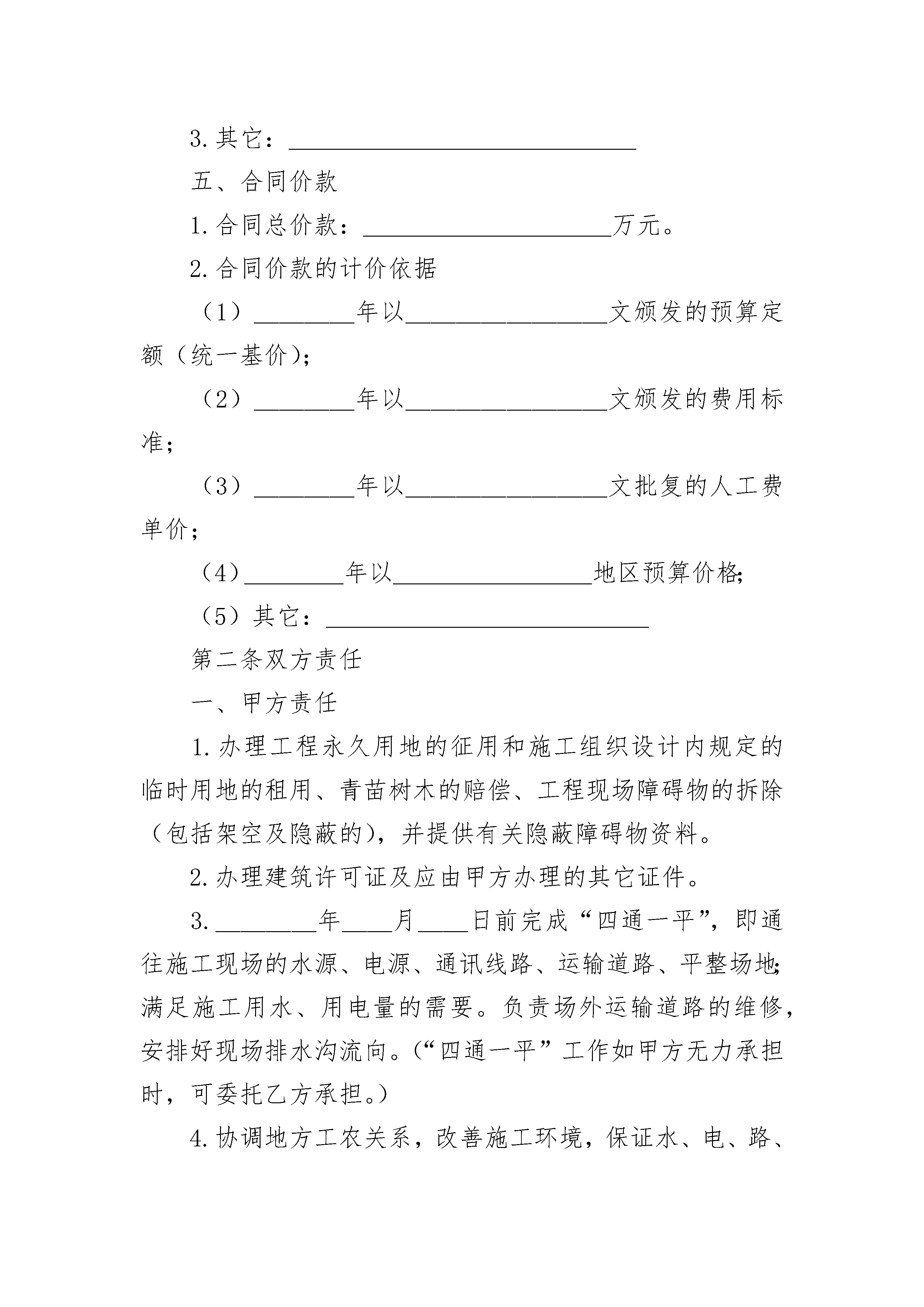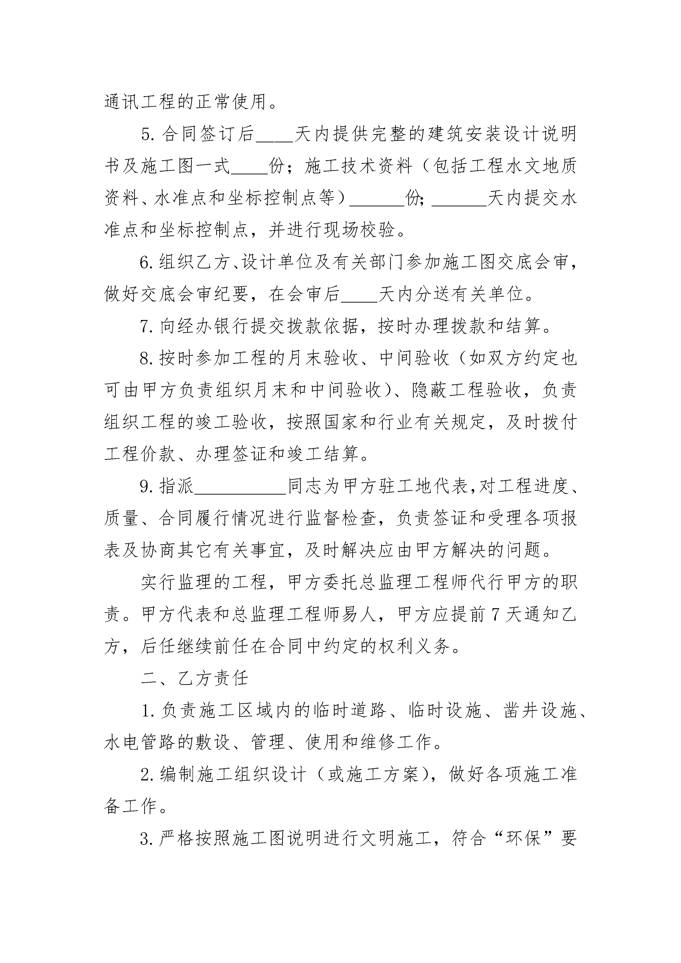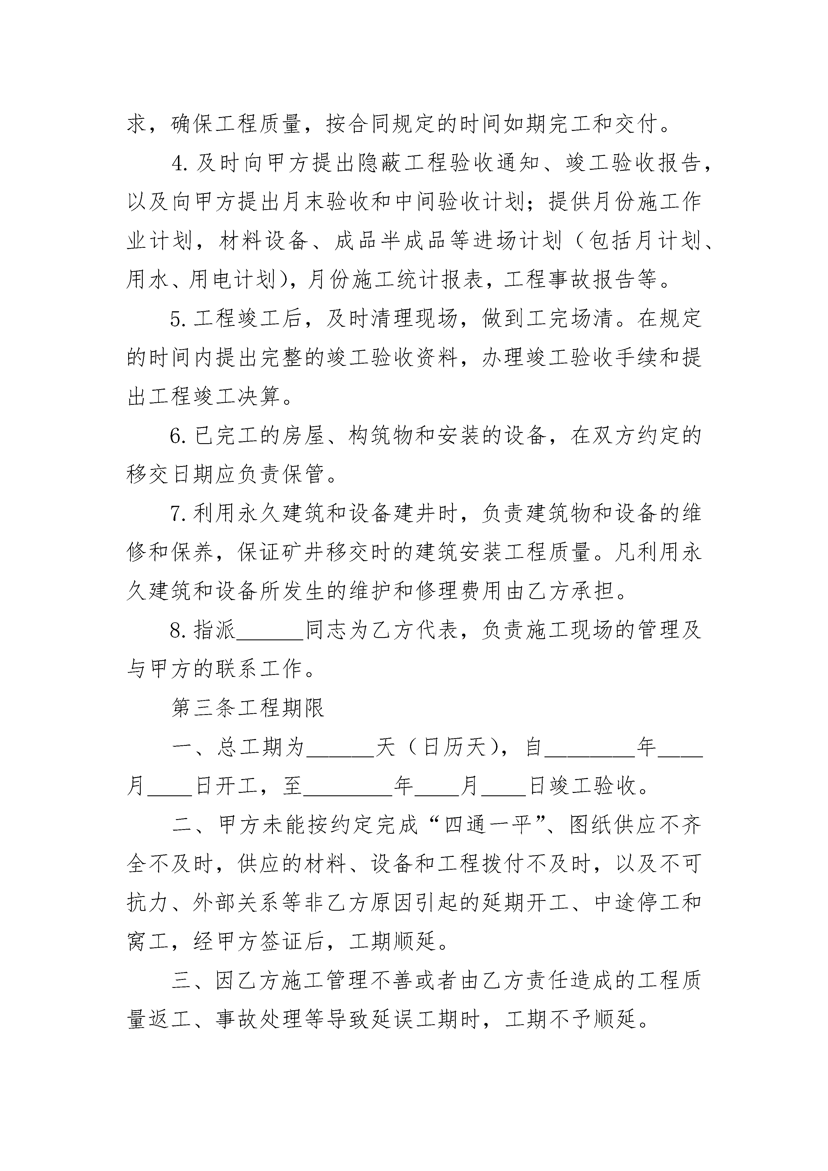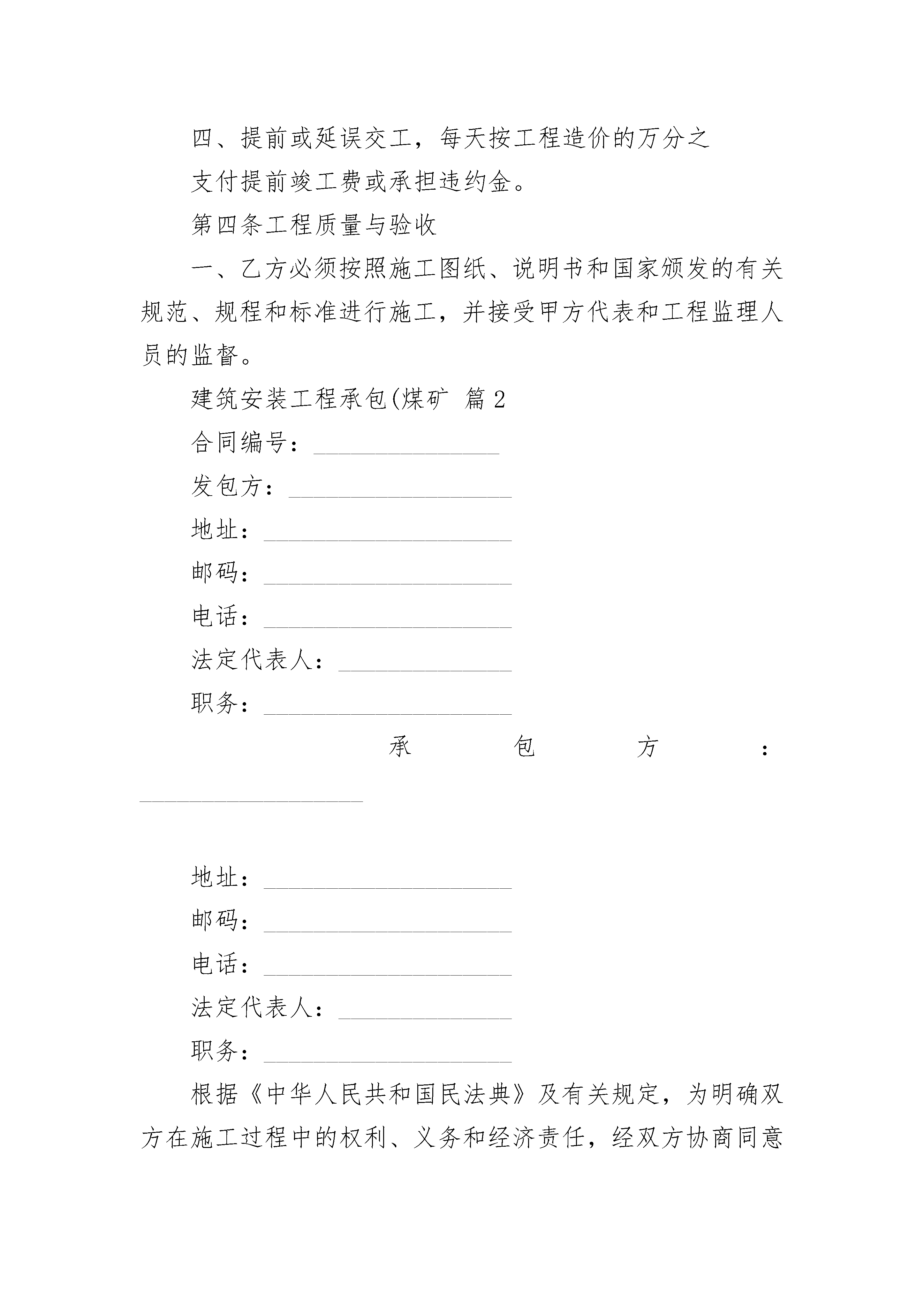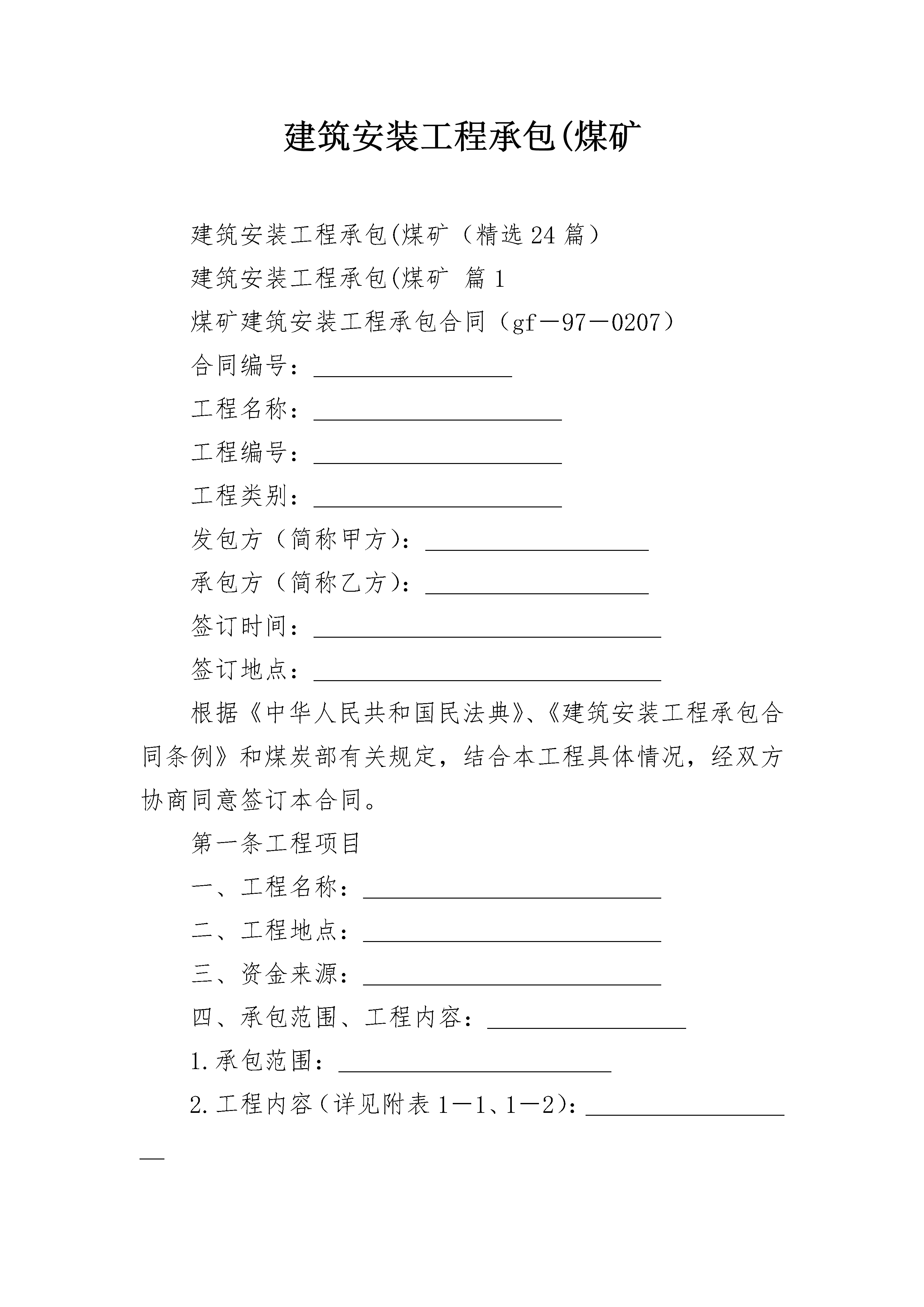 建筑安装工程承包(煤矿建筑安装工程承包(煤矿(精选24篇)建筑安装工程承包(煤矿篇1煤矿建筑安装工程承包合同(gf-97-0207)合同编号:________工程名称:__________工程编号:__________工程类别:__________发包方(简称甲方):_________承包方(简称乙方):_________签订时间:______________签订地点:______________根据《中华人民共和国民法典》、《建筑安装工程承包合同条例》和煤炭部有关规定,结合本工程具体情况,经双方协商同意签订本合同。第一条工程项目一、工程名称:____________二、工程地点:____________三、资金来源:____________四、承包范围、工程内容:________1.承包范围:___________2.工程内容(详见附表1-1、1-2):_________3.其它:______________五、合同价款1.合同总价款:__________万元。2.合同价款的计价依据(1)____年以________文颁发的预算定额(统一基价);(2)____年以________文颁发的费用标准;(3)____年以________文批复的人工费单价;(4)____年以________地区预算价格;(5)其它:_____________第二条双方责任一、甲方责任1.办理工程永久用地的征用和施工组织设计内规定的临时用地的租用、青苗树木的赔偿、工程现场障碍物的拆除(包括架空及隐蔽的),并提供有关隐蔽障碍物资料。2.办理建筑许可证及应由甲方办理的其它证件。3.____年__月__日前完成“四通一平”,即通往施工现场的水源、电源、通讯线路、运输道路、平整场地;满足施工用水、用电量的需要。负责场外运输道路的维修,安排好现场排水沟流向。(“四通一平”工作如甲方无力承担时,可委托乙方承担。)4.协调地方工农关系,改善施工环境,保证水、电、路、通讯工程的正常使用。5.合同签订后__天内提供完整的建筑安装设计说明书及施工图一式__份;施工技术资料(包括工程水文地质资料、水准点和坐标控制点等)___份;___天内提交水准点和坐标控制点,并进行现场校验。6.组织乙方、设计单位及有关部门参加施工图交底会审,做好交底会审纪要,在会审后__天内分送有关单位。7.向经办银行提交拨款依据,按时办理拨款和结算。8.按时参加工程的月末验收、中间验收(如双方约定也可由甲方负责组织月末和中间验收)、隐蔽工程验收,负责组织工程的竣工验收,按照国家和行业有关规定,及时拨付工程价款、办理签证和竣工结算。9.指派_____同志为甲方驻工地代表,对工程进度、质量、合同履行情况进行监督检查,负责签证和受理各项报表及协商其它有关事宜,及时解决应由甲方解决的问题。实行监理的工程,甲方委托总监理工程师代行甲方的职责。甲方代表和总监理工程师易人,甲方应提前7天通知乙方,后任继续前任在合同中约定的权利义务。二、乙方责任1.负责施工区域内的临时道路、临时设施、凿井设施、水电管路的敷设、管理、使用和维修工作。2.编制施工组织设计(或施工方案),做好各项施工准备工作。3.严格按照施工图说明进行文明施工,符合“环保”要求,确保工程质量,按合同规定的时间如期完工和交付。4.及时向甲方提出隐蔽工程验收通知、竣工验收报告,以及向甲方提出月末验收和中间验收计划;提供月份施工作业计划,材料设备、成品半成品等进场计划(包括月计划、用水、用电计划),月份施工统计报表,工程事故报告等。5.工程竣工后,及时清理现场,做到工完场清。在规定的时间内提出完整的竣工验收资料,办理竣工验收手续和提出工程竣工决算。6.已完工的房屋、构筑物和安装的设备,在双方约定的移交日期应负责保管。7.利用永久建筑和设备建井时,负责建筑物和设备的维修和保养,保证矿井移交时的建筑安装工程质量。凡利用永久建筑和设备所发生的维护和修理费用由乙方承担。8.指派___同志为乙方代表,负责施工现场的管理及与甲方的联系工作。第三条工程期限一、总工期为___天(日历天),自____年__月__日开工,至____年__月__日竣工验收。二、甲方未能按约定完成“四通一平”、图纸供应不齐全不及时,供应的材料、设备和工程拨付不及时,以及不可抗力、外部关系等非乙方原因引起的延期开工、中途停工和窝工,经甲方签证后,工期顺延。三、因乙方施工管理不善或者由乙方责任造成的工程质量返工、事故处理等导致延误工期时,工期不予顺延。四、提前或延误交工,每天按工程造价的万分之支付提前竣工费或承担违约金。第四条工程质量与验收一、乙方必须按照施工图纸、说明书和国家颁发的有关规范、规