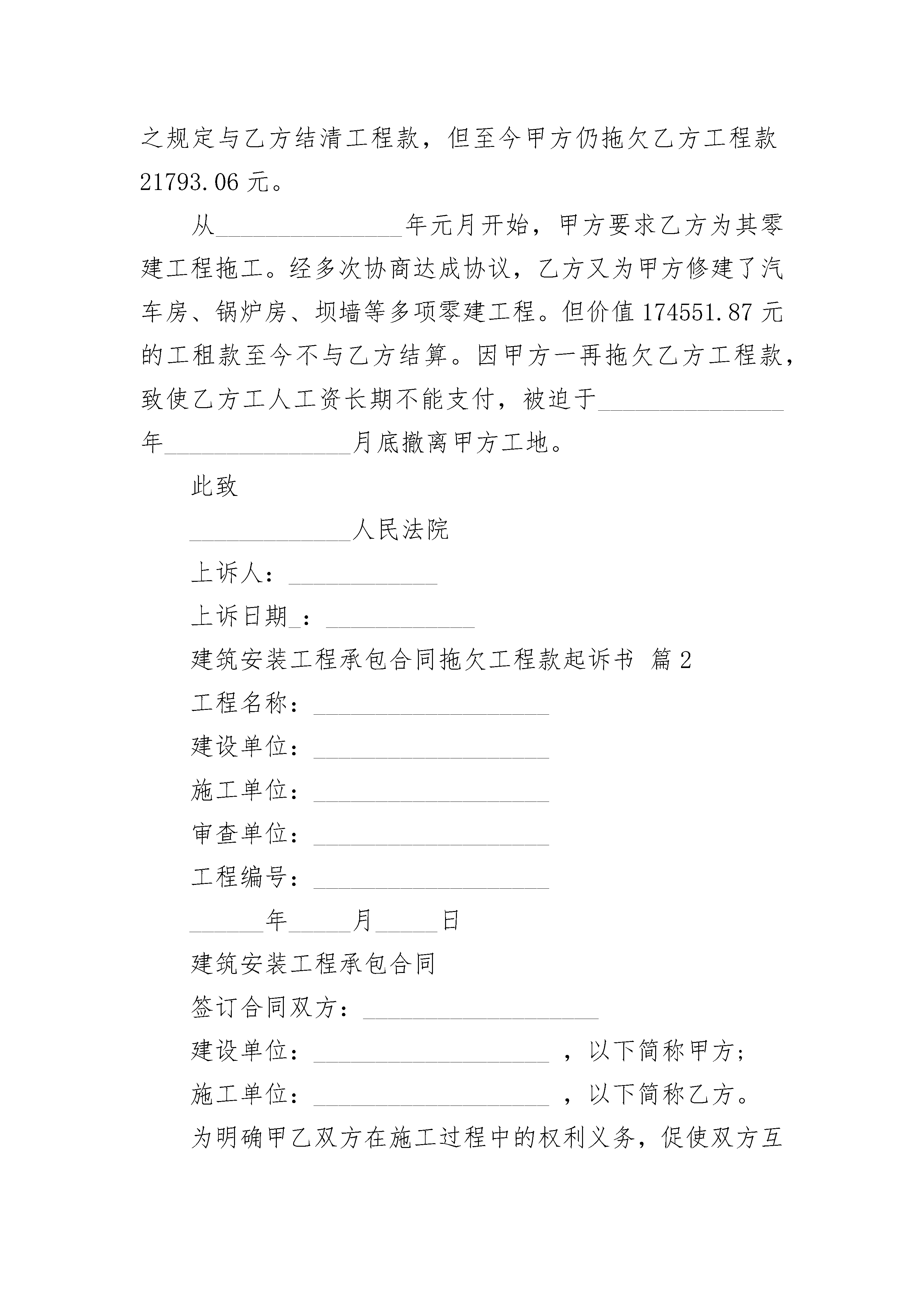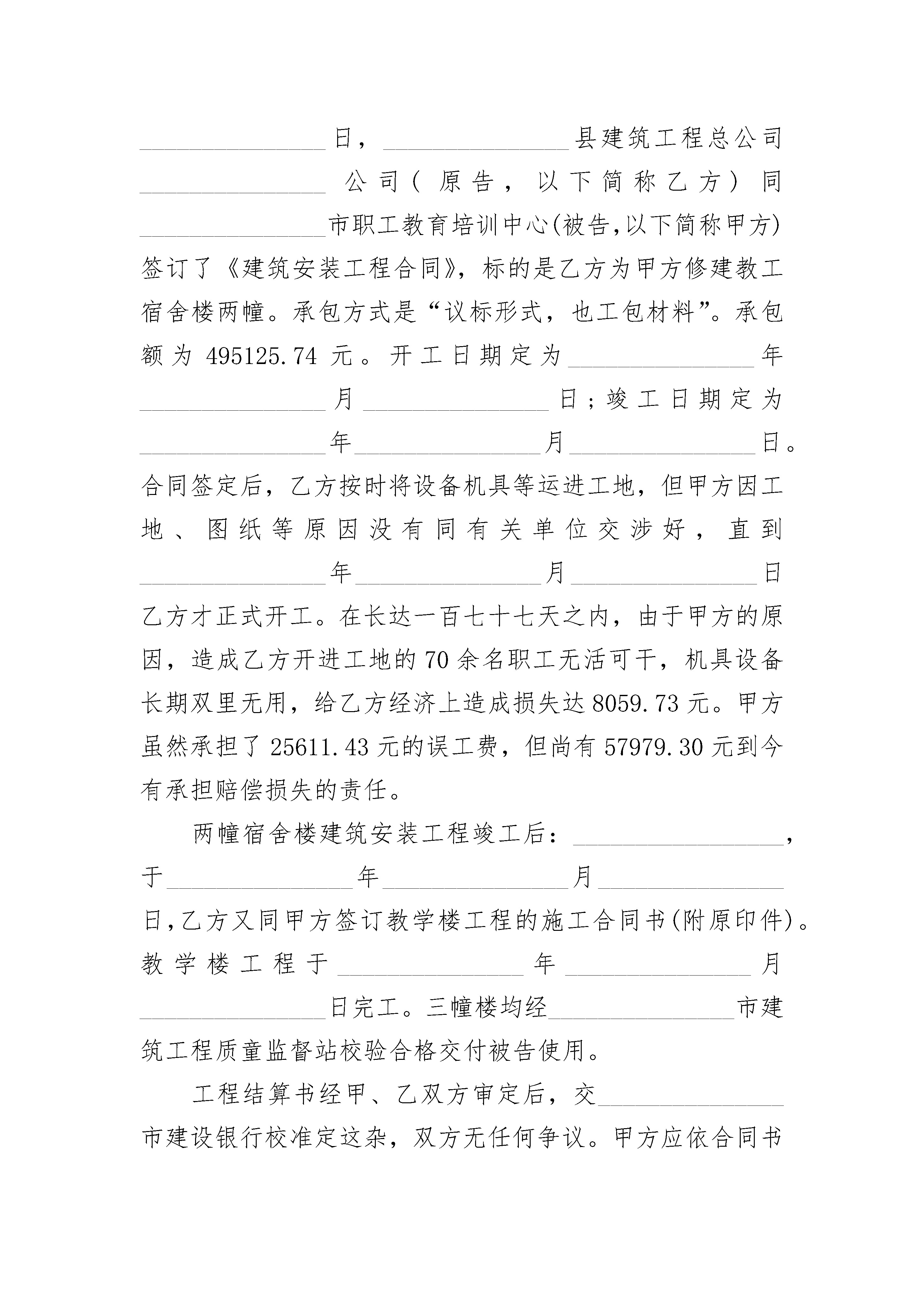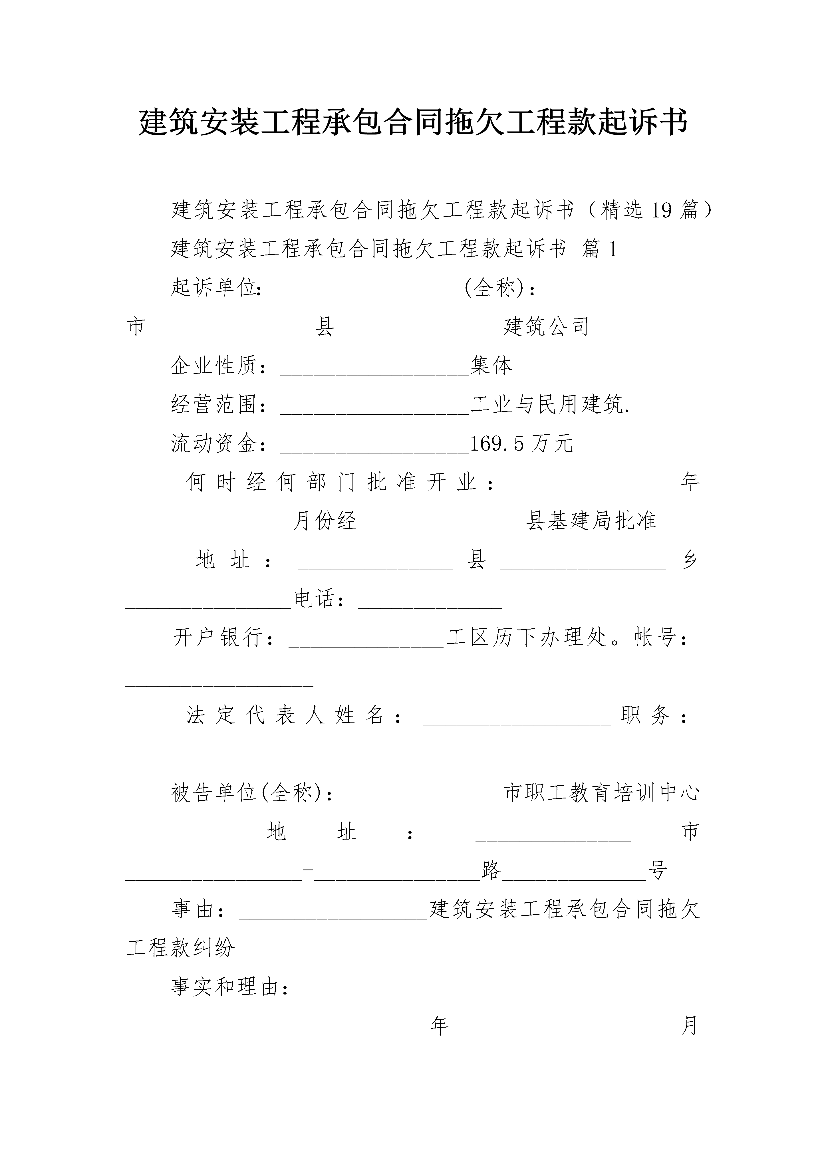 建筑安装工程承包合同拖欠工程款起诉书建筑安装工程承包合同拖欠工程款起诉书(精选19篇)建筑安装工程承包合同拖欠工程款起诉书篇1起诉单位:_________________(全称):______________市_______________县_______________建筑公司企业性质:_________________集体经营范围:_________________工业与民用建筑.流动资金:_________________169.5万元何时经何部门批准开业:______________年_______________月份经_______________县基建局批准地址:______________县_______________乡_______________电话:_____________开户银行:______________工区历下办理处。帐号:_________________法定代表人姓名:_________________职务:_________________被告单位(全称):______________市职工教育培训中心地址:______________市________________-_______________路_____________号事由:_________________建筑安装工程承包合同拖欠工程款纠纷事实和理由:________________________________年_______________月_______________日,_______________县建筑工程总公司_______________公司(原告,以下简称乙方)同_______________市职工教育培训中心(被告,以下简称甲方)签订了《建筑安装工程合同》,标的是乙方为甲方修建教工宿舍楼两幢。承包方式是“议标形式,也工包材料”。承包额为495125.74元。开工日期定为_______________年_______________月_______________日;竣工日期定为_______________年_______________月_______________日。合同签定后,乙方按时将设备机具等运进工地,但甲方因工地、图纸等原因没有同有关单位交涉好,直到_______________年_______________月_______________日乙方才正式开工。在长达一百七十七天之内,由于甲方的原因,造成乙方开进工地的70余名职工无活可干,机具设备长期双里无用,给乙方经济上造成损失达8059.73元。甲方虽然承担了25611.43元的误工费,但尚有57979.30元到今有承担赔偿损失的责任。两幢宿舍楼建筑安装工程竣工后:_________________,于_______________年_______________月_______________日,乙方又同甲方签订教学楼工程的施工合同书(附原印件)。教学楼工程于_______________年_______________月_______________日完工。三幢楼均经_______________市建筑工程质童监督站校验合格交付被告使用。工程结算书经甲、乙双方审定后,交_______________市建设银行校准定这杂,双方无任何争议。甲方应依合同书之规定与乙方结清工程款,但至今甲方仍拖欠乙方工程款21793.06元。从_______________年元月开始,甲方要求乙方为其零建工程拖工。经多次协商达成协议,乙方又为甲方修建了汽车房、锅炉房、坝墙等多项零建工程。但价值174551.87元的工租款至今不与乙方结算。因甲方一再拖欠乙方工程款,致使乙方工人工资长期不能支付,被迫于_______________年_______________月底撤离甲方工地。此致_____________人民法院上诉人:____________上诉日期_:____________建筑安装工程承包合同拖欠工程款起诉书篇2工程名称:___________________建设单位:___________________施工单位:___________________审查单位:___________________工程编号:_________________________年_____月_____日建筑安装工程承包合同签订合同双方:___________________建设单位:___________________,以下简称甲方;施工单位:___________________,以下简称乙方。为明确甲乙双方在施工过程中的权利义务,促使双方互相创造条件,搞好配合协作,多快好省地完成国家的基本建设任务,经甲乙双方充分协商,特签订本合同,以便共同遵守第一条:___