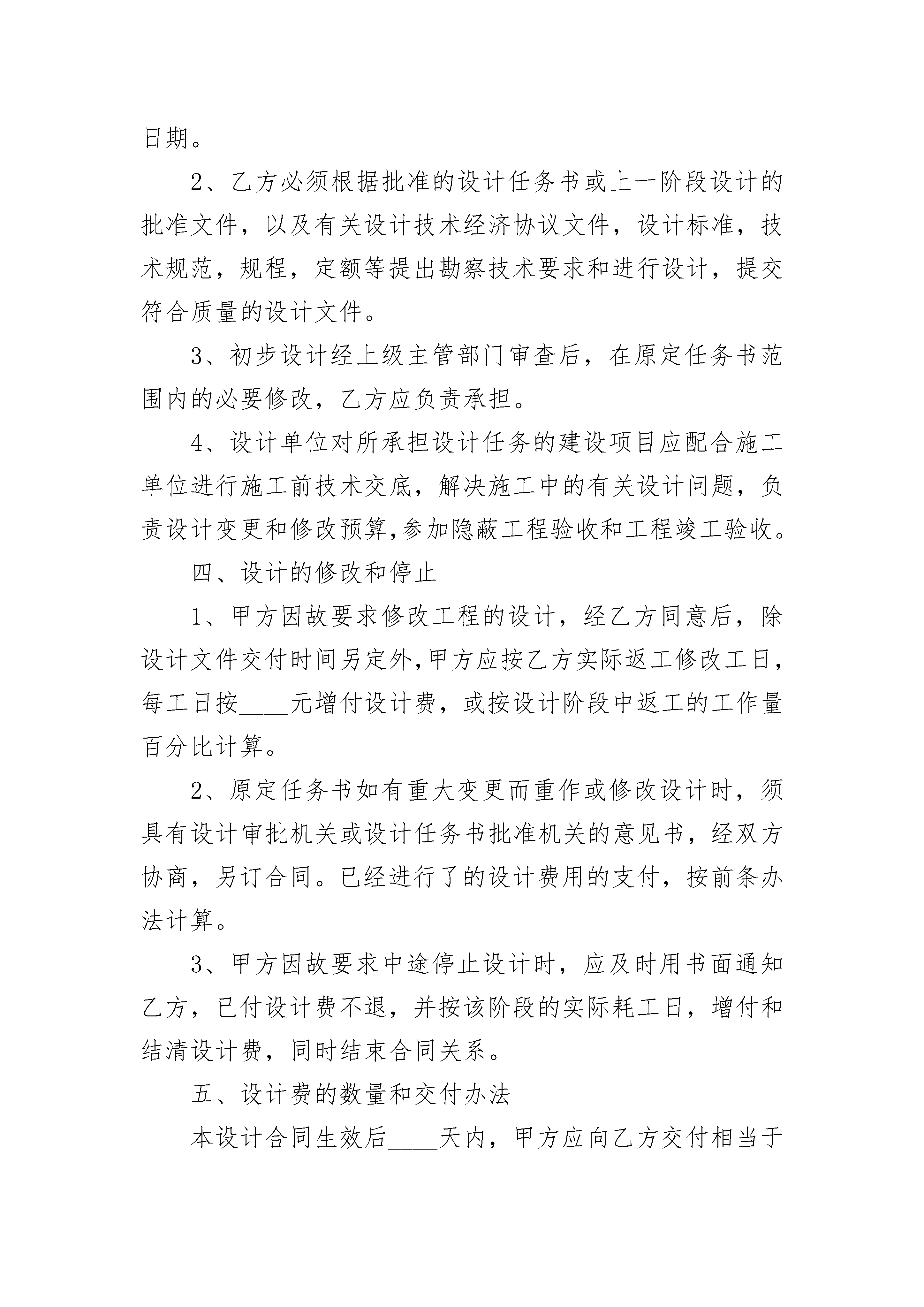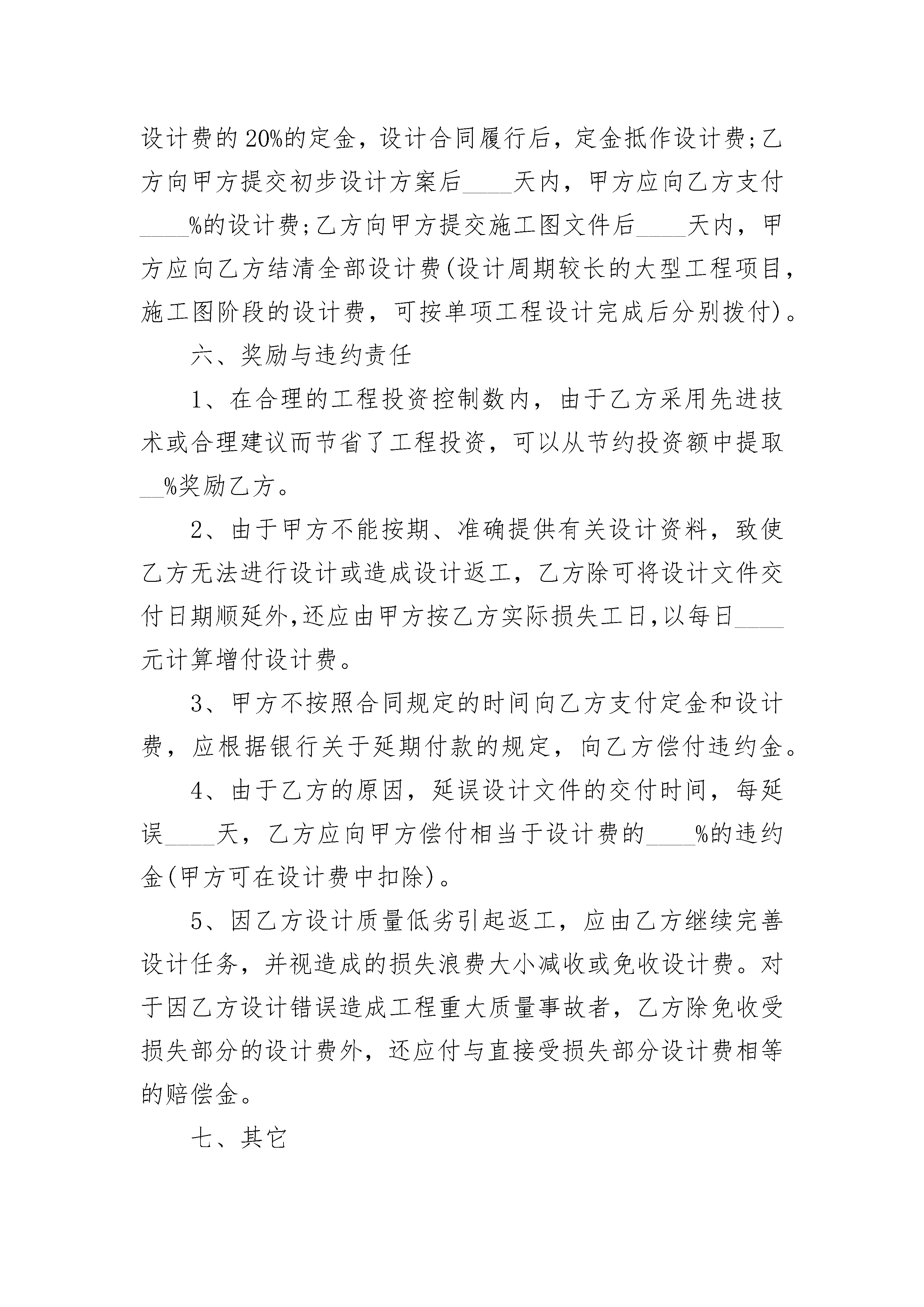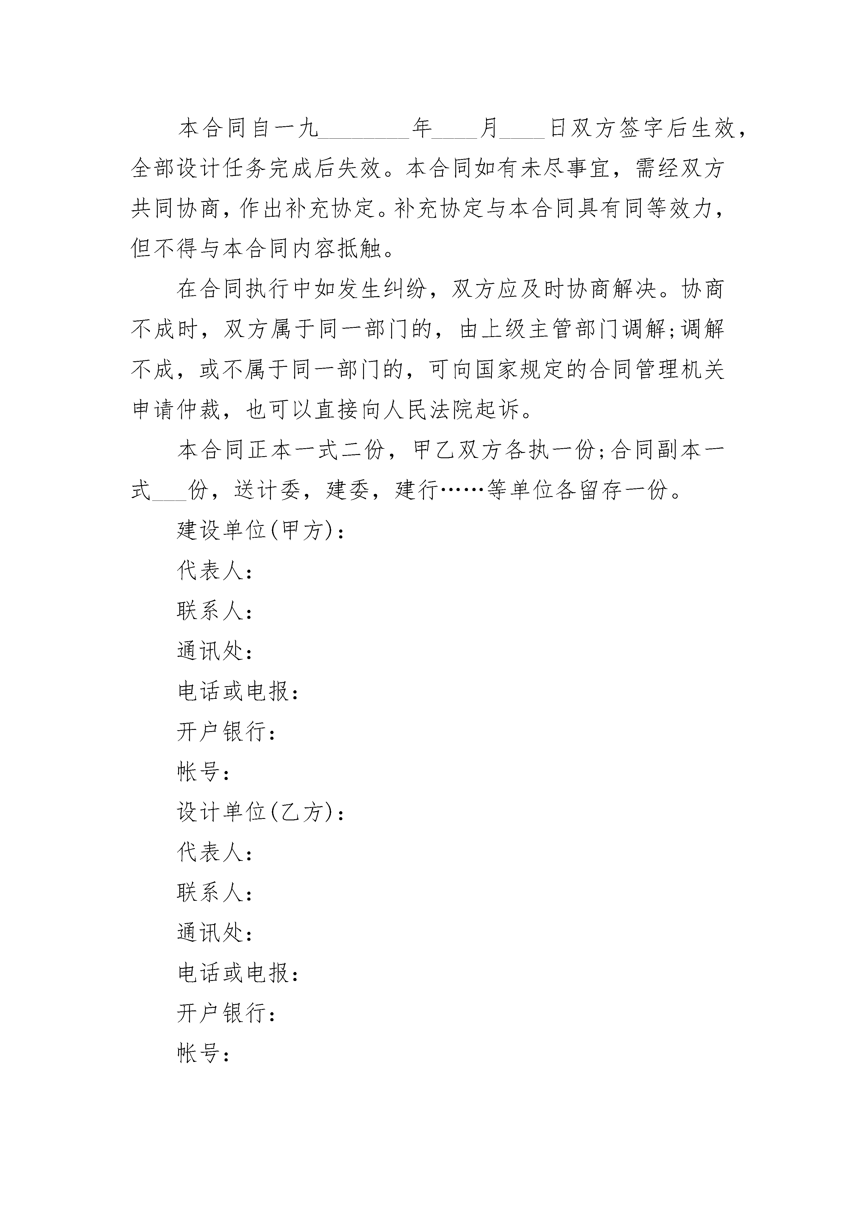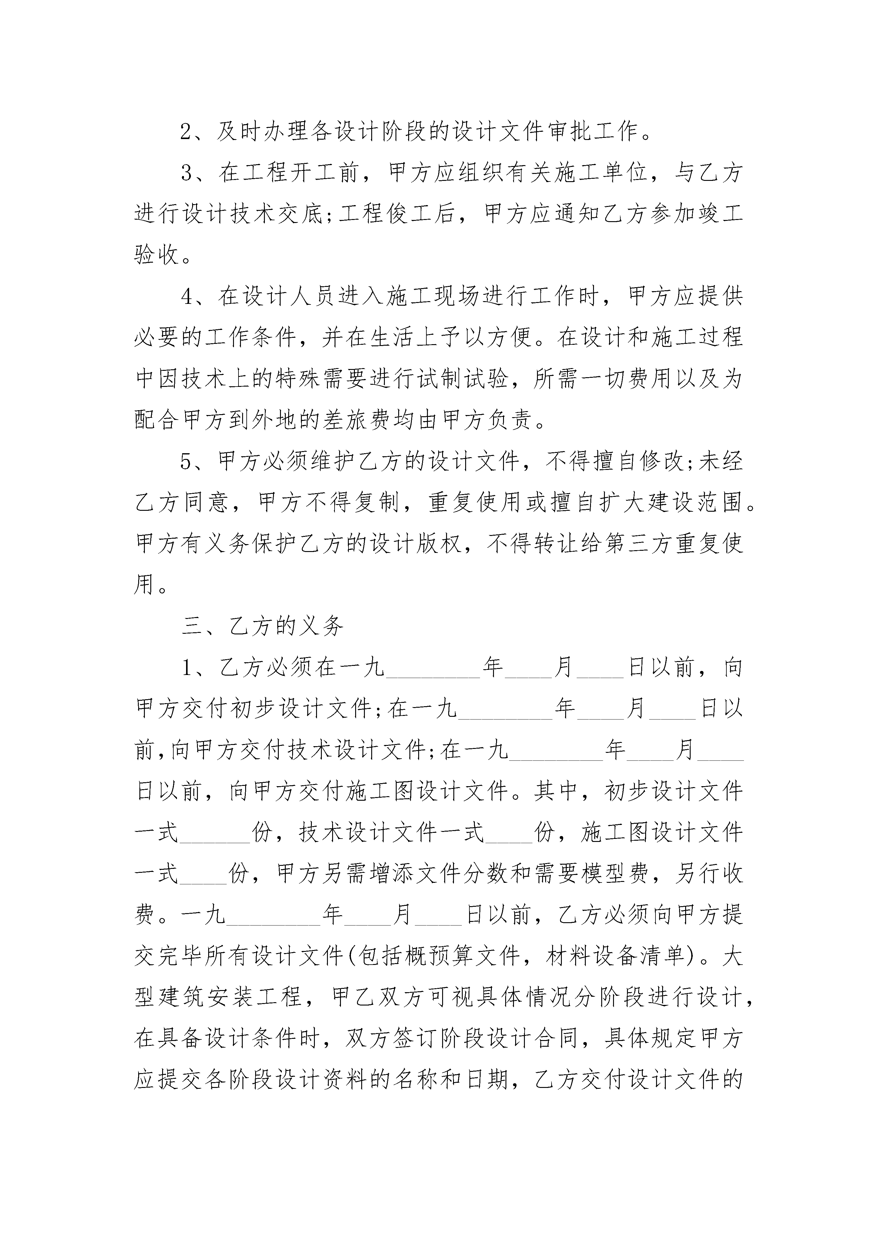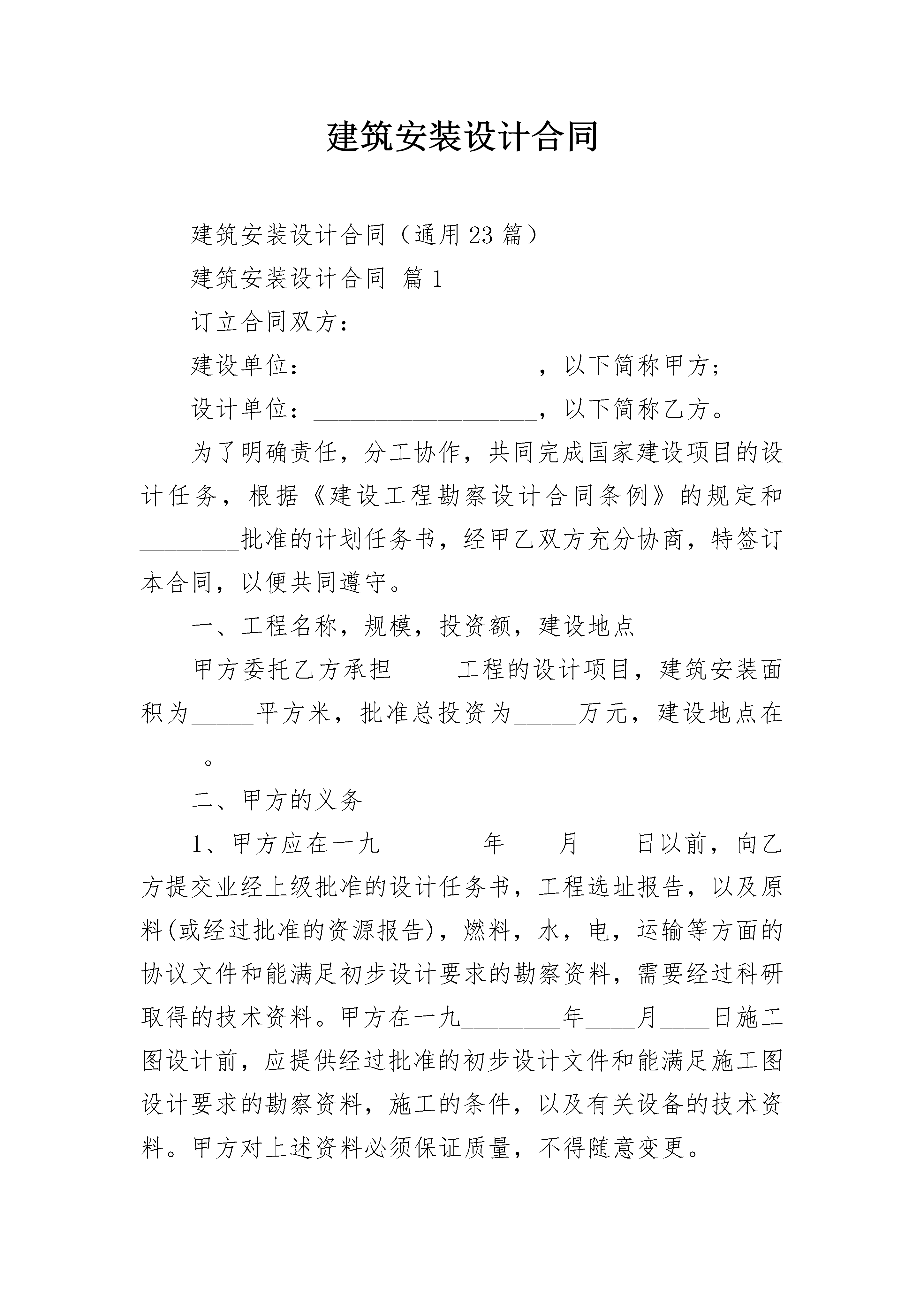 建筑安装设计合同建筑安装设计合同(通用23篇)建筑安装设计合同篇1订立合同双方:建设单位:__________________,以下简称甲方;设计单位:__________________,以下简称乙方。为了明确责任,分工协作,共同完成国家建设项目的设计任务,根据《建设工程勘察设计合同条例》的规定和________批准的计划任务书,经甲乙双方充分协商,特签订本合同,以便共同遵守。一、工程名称,规模,投资额,建设地点甲方委托乙方承担_____工程的设计项目,建筑安装面积为_____平方米,批准总投资为_____万元,建设地点在_____。二、甲方的义务1、甲方应在一九________年____月____日以前,向乙方提交业经上级批准的设计任务书,工程选址报告,以及原料(或经过批准的资源报告),燃料,水,电,运输等方面的协议文件和能满足初步设计要求的勘察资料,需要经过科研取得的技术资料。甲方在一九________年____月____日施工图设计前,应提供经过批准的初步设计文件和能满足施工图设计要求的勘察资料,施工的条件,以及有关设备的技术资料。甲方对上述资料必须保证质量,不得随意变更。2、及时办理各设计阶段的设计文件审批工作。3、在工程开工前,甲方应组织有关施工单位,与乙方进行设计技术交底;工程俊工后,甲方应通知乙方参加竣工验收。4、在设计人员进入施工现场进行工作时,甲方应提供必要的工作条件,并在生活上予以方便。在设计和施工过程中因技术上的特殊需要进行试制试验,所需一切费用以及为配合甲方到外地的差旅费均由甲方负责。5、甲方必须维护乙方的设计文件,不得擅自修改;未经乙方同意,甲方不得复制,重复使用或擅自扩大建设范围。甲方有义务保护乙方的设计版权,不得转让给第三方重复使用。三、乙方的义务1、乙方必须在一九________年____月____日以前,向甲方交付初步设计文件;在一九________年____月____日以前,向甲方交付技术设计文件;在一九________年____月____日以前,向甲方交付施工图设计文件。其中,初步设计文件一式______份,技术设计文件一式____份,施工图设计文件一式____份,甲方另需增添文件分数和需要模型费,另行收费。一九________年____月____日以前,乙方必须向甲方提交完毕所有设计文件(包括概预算文件,材料设备清单)。大型建筑安装工程,甲乙双方可视具体情况分阶段进行设计,在具备设计条件时,双方签订阶段设计合同,具体规定甲方应提交各阶段设计资料的名称和日期,乙方交付设计文件的日期。2、乙方必须根据批准的设计任务书或上一阶段设计的批准文件,以及有关设计技术经济协议文件,设计标准,技术规范,规程,定额等提出勘察技术要求和进行设计,提交符合质量的设计文件。3、初步设计经上级主管部门审查后,在原定任务书范围内的必要修改,乙方应负责承担。4、设计单位对所承担设计任务的建设项目应配合施工单位进行施工前技术交底,解决施工中的有关设计问题,负责设计变更和修改预算,参加隐蔽工程验收和工程竣工验收。四、设计的修改和停止1、甲方因故要求修改工程的设计,经乙方同意后,除设计文件交付时间另定外,甲方应按乙方实际返工修改工日,每工日按____元增付设计费,或按设计阶段中返工的工作量百分比计算。2、原定任务书如有重大变更而重作或修改设计时,须具有设计审批机关或设计任务书批准机关的意见书,经双方协商,另订合同。已经进行了的设计费用的支付,按前条办法计算。3、甲方因故要求中途停止设计时,应及时用书面通知乙方,已付设计费不退,并按该阶段的实际耗工日,增付和结清设计费,同时结束合同关系。五、设计费的数量和交付办法本设计合同生效后____天内,甲方应向乙方交付相当于设计费的20%的定金,设计合同履行后,定金抵作设计费;乙方向甲方提交初步设计方案后____天内,甲方应向乙方支付____%的设计费;乙方向甲方提交施工图文件后____天内,甲方应向乙方结清全部设计费(设计周期较长的大型工程项目,施工图阶段的设计费,可按单项工程设计完成后分别拨付)。六、奖励与违约责任1、在合理的工程投资控制数内,由于乙方采用先进技术或合理建议而节省了工程投资,可以从节约投资额中提取__%奖励乙方。2、由于甲方不能按期、准确提供有关设计资料,致使乙方无法进行设计或造成设计返工,乙方除可将设计文件交付日期顺延外,还应由甲方按乙方实际损失工日,以每日____元计算增付设计费。3、甲方不按照合同规定的时间向乙方支付定金和设计费,应根据银行关于延期付款的规定,向乙方偿付违约金。4、由于乙方的原因,延误设计文件的交付时间,每延误____天,乙方应向甲方偿付相当于设计费的____%的违约金(甲方可在设计费中扣除)。5、因乙方设计质量低劣引起返工,应由乙方继续