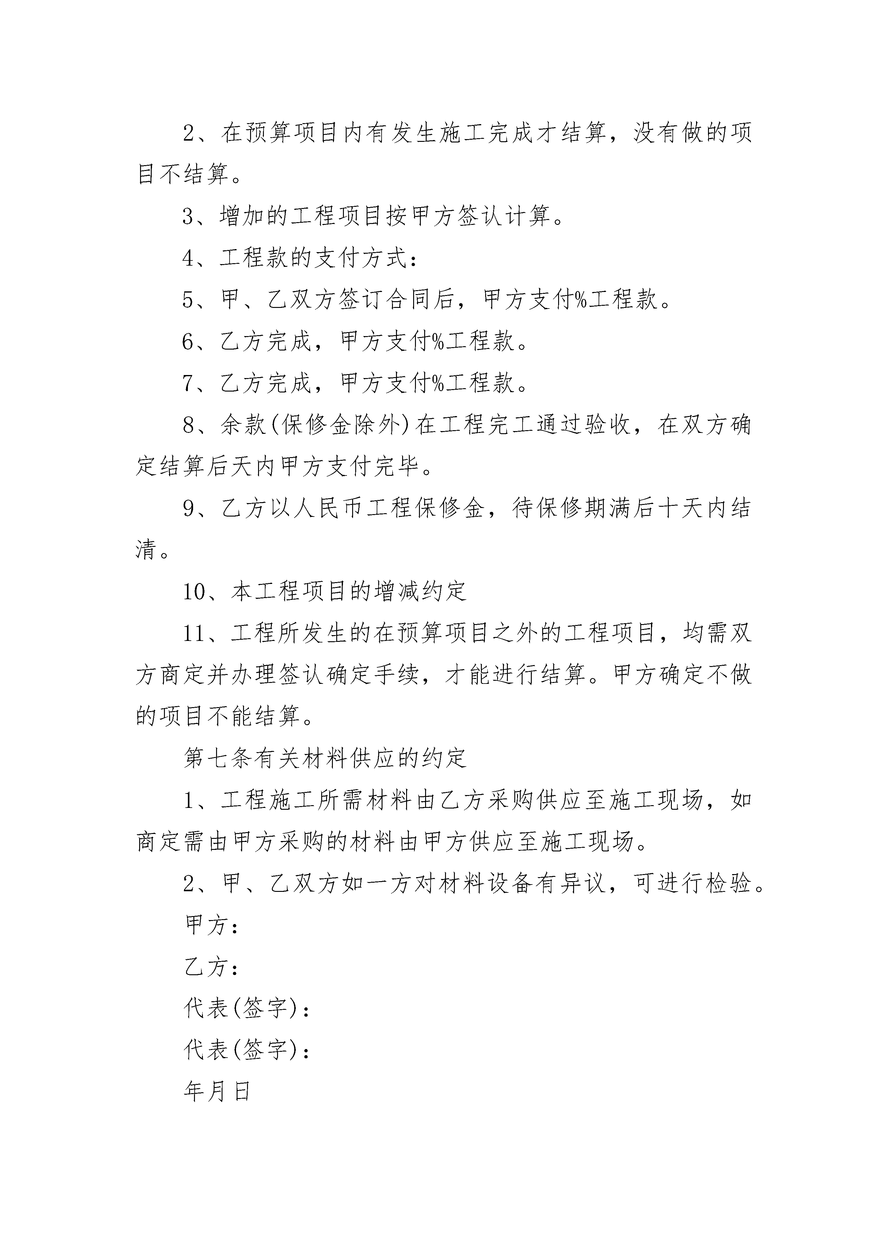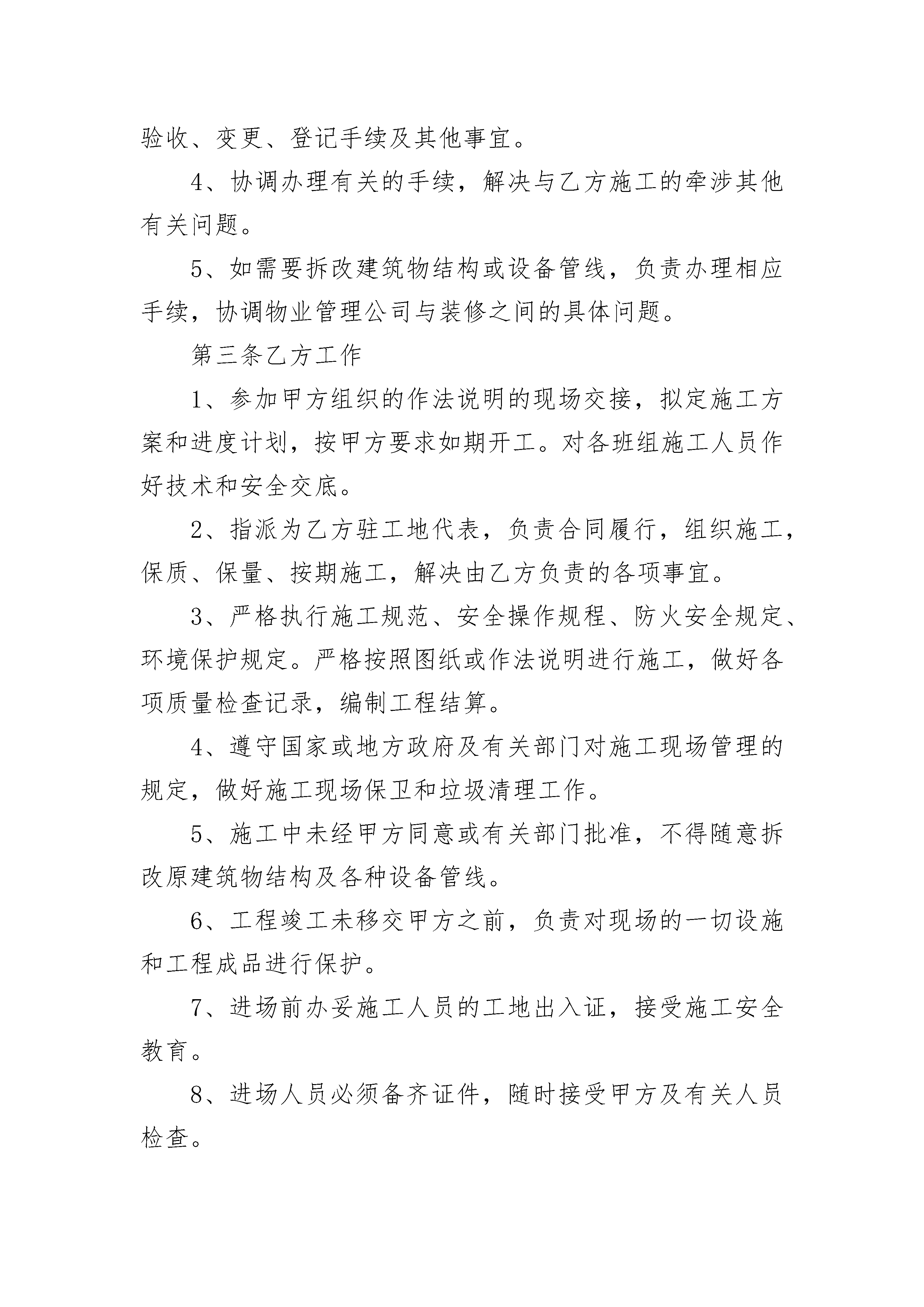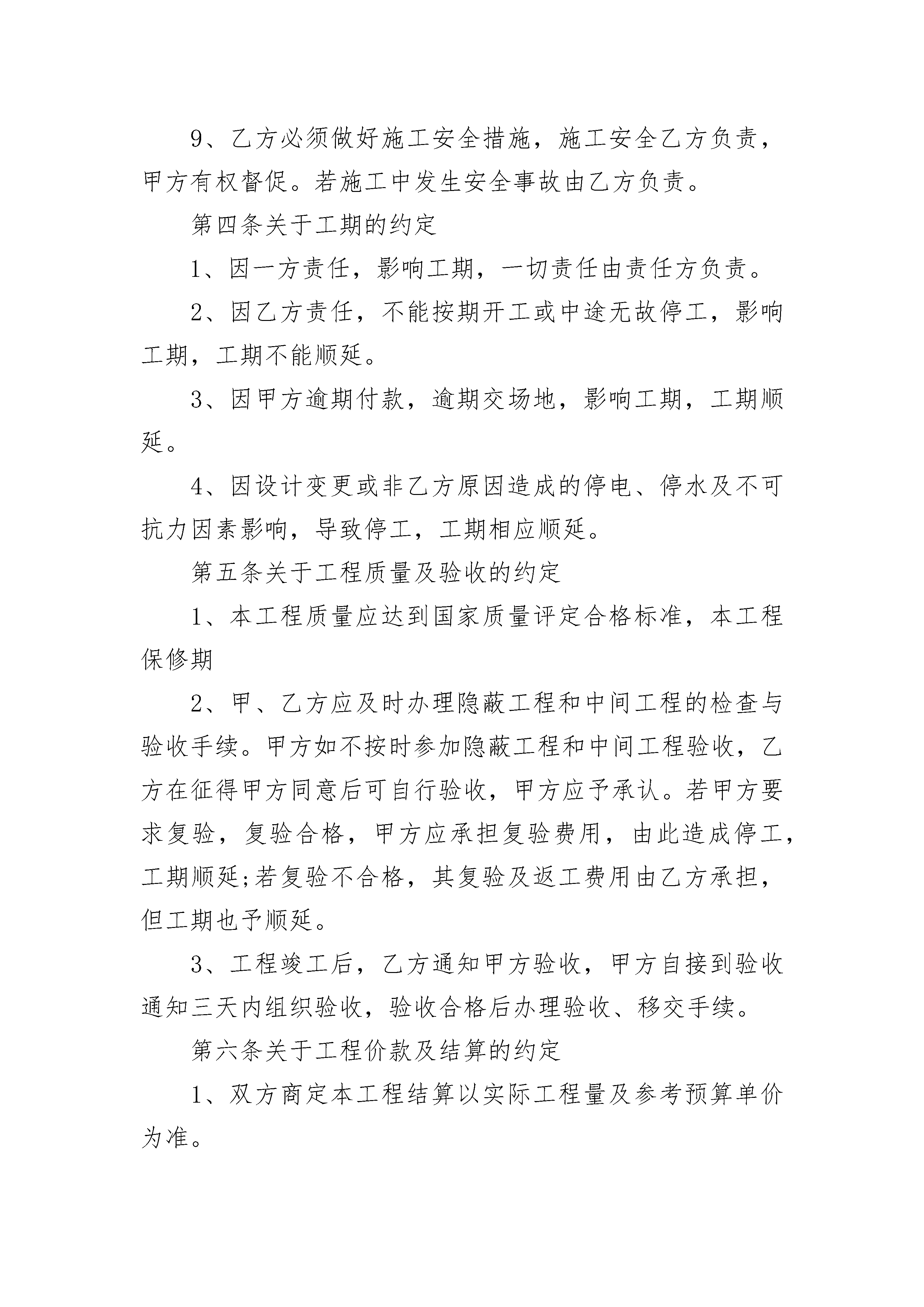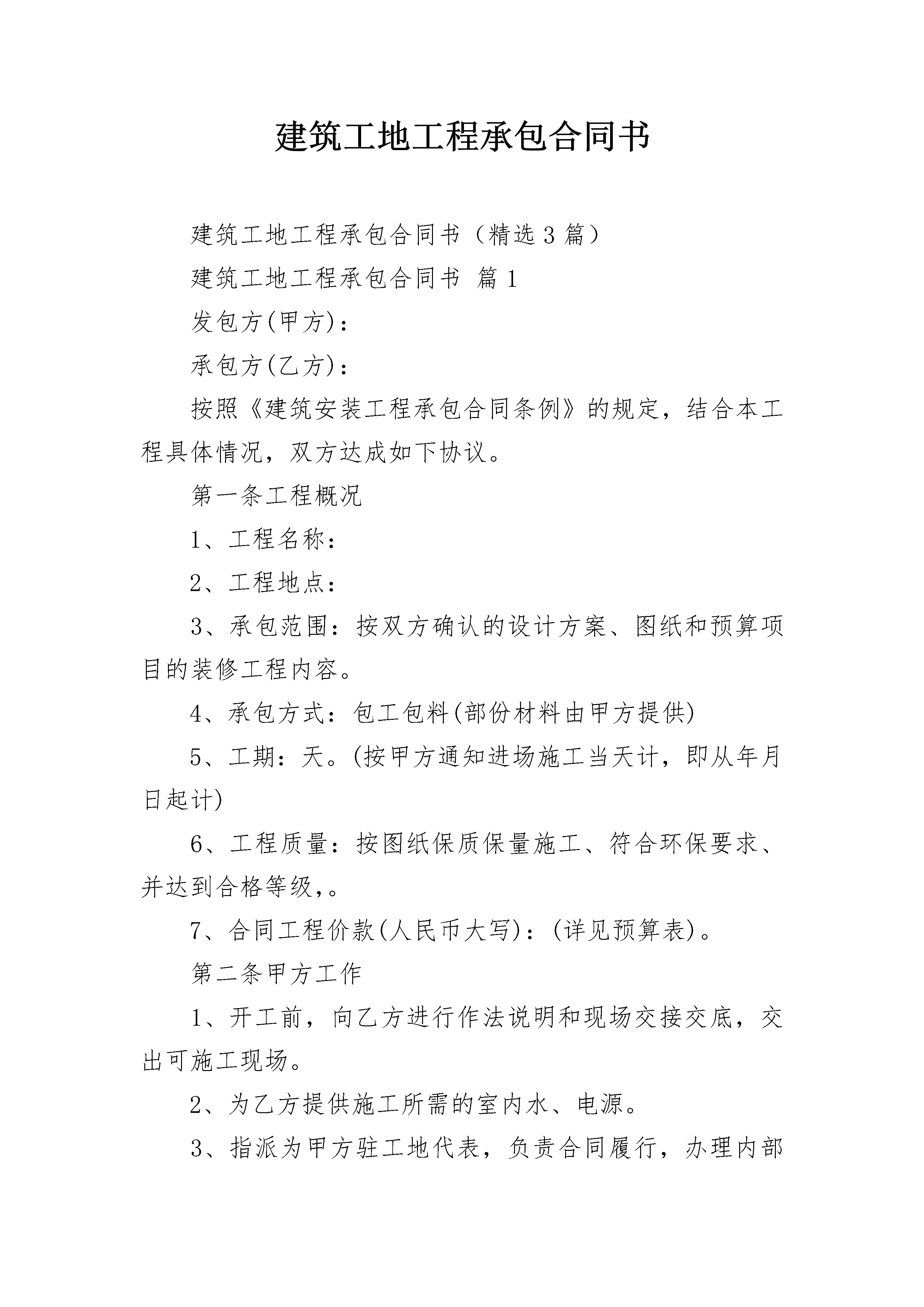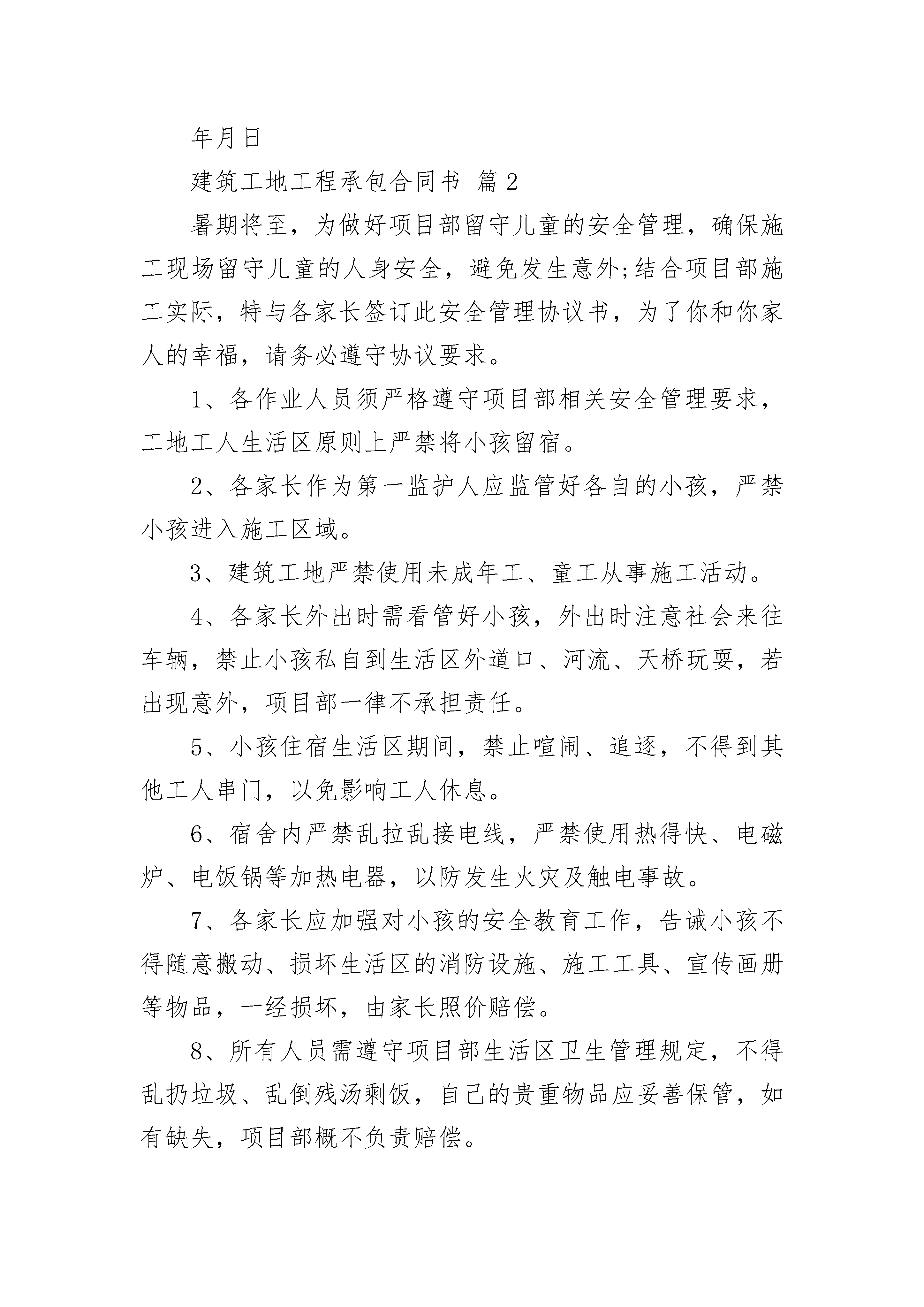 建筑工地工程承包合同书建筑工地工程承包合同书(精选3篇)建筑工地工程承包合同书篇1发包方(甲方):承包方(乙方):按照《建筑安装工程承包合同条例》的规定,结合本工程具体情况,双方达成如下协议。第一条工程概况1、工程名称:2、工程地点:3、承包范围:按双方确认的设计方案、图纸和预算项目的装修工程内容。4、承包方式:包工包料(部份材料由甲方提供)5、工期:天。(按甲方通知进场施工当天计,即从年月日起计)6、工程质量:按图纸保质保量施工、符合环保要求、并达到合格等级,。7、合同工程价款(人民币大写):(详见预算表)。第二条甲方工作1、开工前,向乙方进行作法说明和现场交接交底,交出可施工现场。2、为乙方提供施工所需的室内水、电源。3、指派为甲方驻工地代表,负责合同履行,办理内部验收、变更、登记手续及其他事宜。4、协调办理有关的手续,解决与乙方施工的牵涉其他有关问题。5、如需要拆改建筑物结构或设备管线,负责办理相应手续,协调物业管理公司与装修之间的具体问题。第三条乙方工作1、参加甲方组织的作法说明的现场交接,拟定施工方案和进度计划,按甲方要求如期开工。对各班组施工人员作好技术和安全交底。2、指派为乙方驻工地代表,负责合同履行,组织施工,保质、保量、按期施工,解决由乙方负责的各项事宜。3、严格执行施工规范、安全操作规程、防火安全规定、环境保护规定。严格按照图纸或作法说明进行施工,做好各项质量检查记录,编制工程结算。4、遵守国家或地方政府及有关部门对施工现场管理的规定,做好施工现场保卫和垃圾清理工作。5、施工中未经甲方同意或有关部门批准,不得随意拆改原建筑物结构及各种设备管线。6、工程竣工未移交甲方之前,负责对现场的一切设施和工程成品进行保护。7、进场前办妥施工人员的工地出入证,接受施工安全教育。8、进场人员必须备齐证件,随时接受甲方及有关人员检查。9、乙方必须做好施工安全措施,施工安全乙方负责,甲方有权督促。若施工中发生安全事故由乙方负责。第四条关于工期的约定1、因一方责任,影响工期,一切责任由责任方负责。2、因乙方责任,不能按期开工或中途无故停工,影响工期,工期不能顺延。3、因甲方逾期付款,逾期交场地,影响工期,工期顺延。4、因设计变更或非乙方原因造成的停电、停水及不可抗力因素影响,导致停工,工期相应顺延。第五条关于工程质量及验收的约定1、本工程质量应达到国家质量评定合格标准,本工程保修期2、甲、乙方应及时办理隐蔽工程和中间工程的检查与验收手续。甲方如不按时参加隐蔽工程和中间工程验收,乙方在征得甲方同意后可自行验收,甲方应予承认。若甲方要求复验,复验合格,甲方应承担复验费用,由此造成停工,工期顺延;若复验不合格,其复验及返工费用由乙方承担,但工期也予顺延。3、工程竣工后,乙方通知甲方验收,甲方自接到验收通知三天内组织验收,验收合格后办理验收、移交手续。第六条关于工程价款及结算的约定1、双方商定本工程结算以实际工程量及参考预算单价为准。2、在预算项目内有发生施工完成才结算,没有做的项目不结算。3、增加的工程项目按甲方签认计算。4、工程款的支付方式:5、甲、乙双方签订合同后,甲方支付%工程款。6、乙方完成,甲方支付%工程款。7、乙方完成,甲方支付%工程款。8、余款(保修金除外)在工程完工通过验收,在双方确定结算后天内甲方支付完毕。9、乙方以人民币工程保修金,待保修期满后十天内结清。10、本工程项目的增减约定11、工程所发生的在预算项目之外的工程项目,均需双方商定并办理签认确定手续,才能进行结算。甲方确定不做的项目不能结算。第七条有关材料供应的约定1、工程施工所需材料由乙方采购供应至施工现场,如商定需由甲方采购的材料由甲方供应至施工现场。2、甲、乙双方如一方对材料设备有异议,可进行检验。甲方:乙方:代表(签字):代表(签字):年月日年月日建筑工地工程承包合同书篇2暑期将至,为做好项目部留守儿童的安全管理,确保施工现场留守儿童的人身安全,避免发生意外;结合项目部施工实际,特与各家长签订此安全管理协议书,为了你和你家人的幸福,请务必遵守协议要求。1、各作业人员须严格遵守项目部相关安全管理要求,工地工人生活区原则上严禁将小孩留宿。2、各家长作为第一监护人应监管好各自的小孩,严禁小孩进入施工区域。3、建筑工地严禁使用未成年工、童工从事施工活动。4、各家长外出时需看管好小孩,外出时注意社会来往车辆,禁止小孩私自到生活区外道口、河流、天桥玩耍,若出现意外,项目部一律不承担责任。5、小孩住宿生活区期间,禁止喧闹、追逐,不得到其他工人串门,以免影响工人休息。6、宿舍内严禁乱拉乱接电线,严禁使用热得快、电磁炉、电饭锅等加热电器,以防发生火灾及触电事故。7、各家长应加强对小孩的安全教育工作,告诫小孩不得随意搬动、损坏生活区的消防设施、施工工具、宣传画册等物品