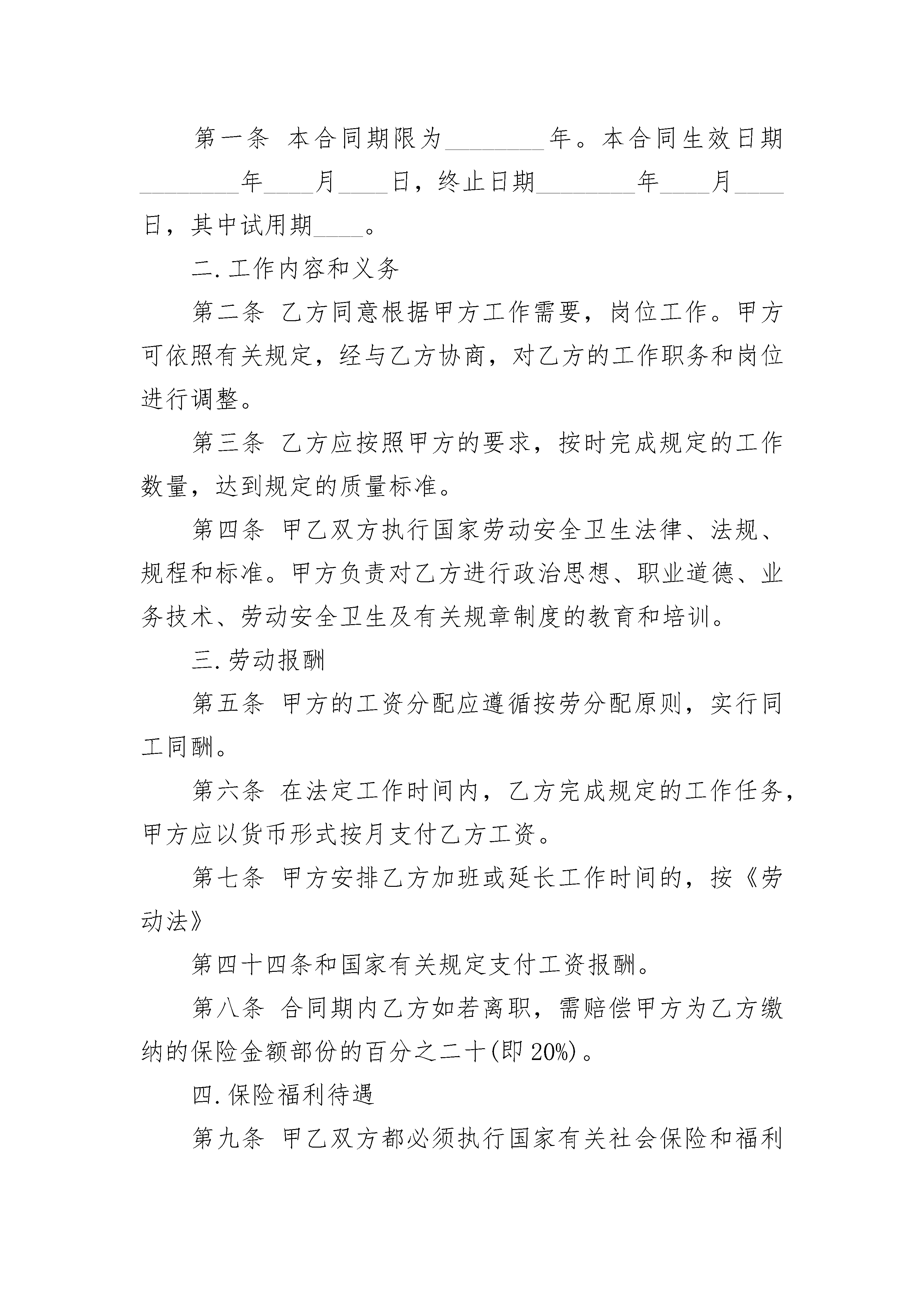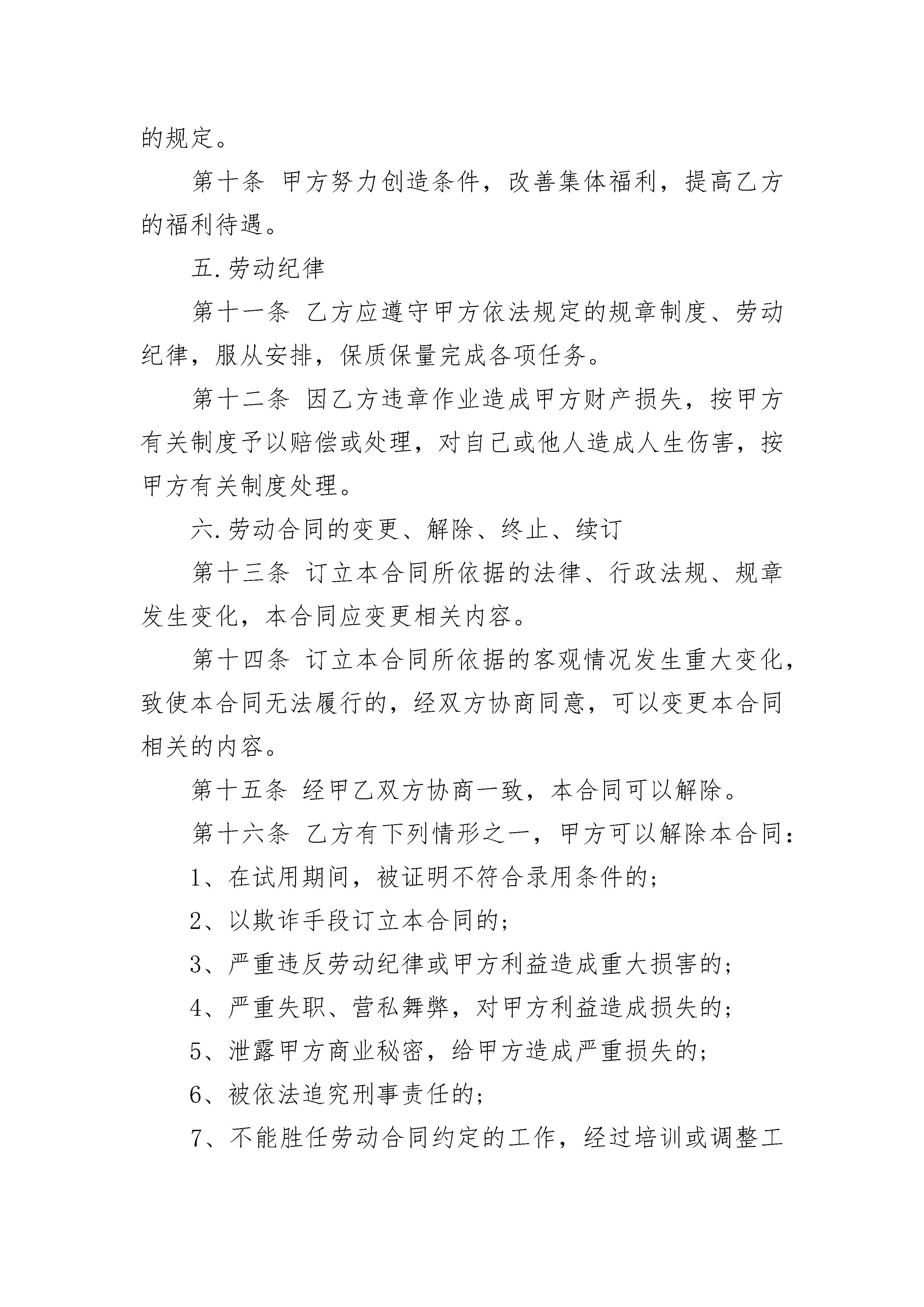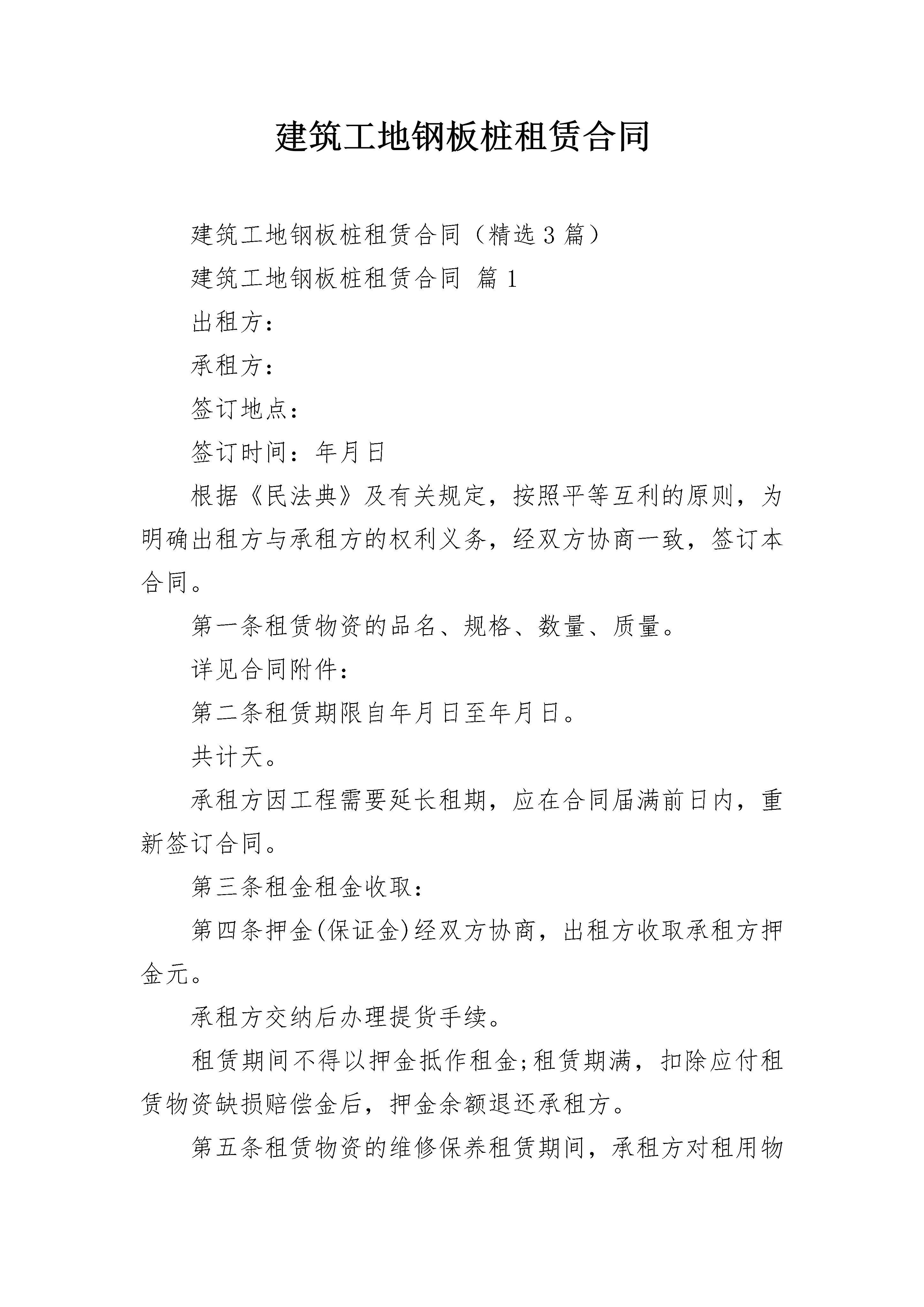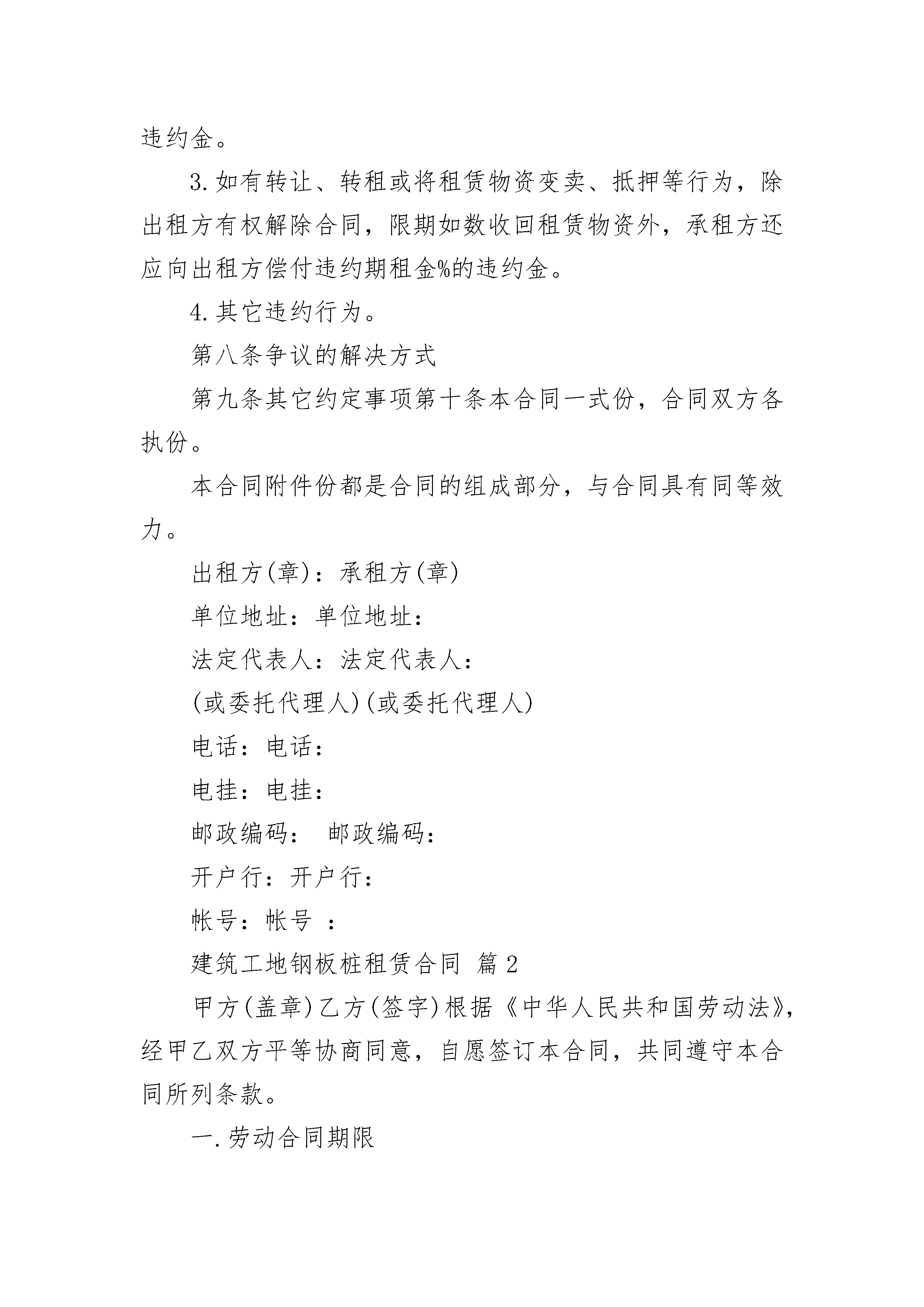 建筑工地钢板桩租赁合同建筑工地钢板桩租赁合同(精选3篇)建筑工地钢板桩租赁合同篇1出租方:承租方:签订地点:签订时间:年月日根据《民法典》及有关规定,按照平等互利的原则,为明确出租方与承租方的权利义务,经双方协商一致,签订本合同。第一条租赁物资的品名、规格、数量、质量。详见合同附件:第二条租赁期限自年月日至年月日。共计天。承租方因工程需要延长租期,应在合同届满前日内,重新签订合同。第三条租金租金收取:第四条押金(保证金)经双方协商,出租方收取承租方押金元。承租方交纳后办理提货手续。租赁期间不得以押金抵作租金;租赁期满,扣除应付租赁物资缺损赔偿金后,押金余额退还承租方。第五条租赁物资的维修保养租赁期间,承租方对租用物资要妥善保管,并负担维修保养费用。租赁物资退还时,双方检查验收,如有损坏、缺少、保养不善等,要按双方协商议定的《租赁物资缺损赔偿及维修收费办法》,由承租方向出租方偿付赔偿金、维修及保养费。第六条出租方变更一、在租赁期间,出租方如将租赁物资所有权转移给第三方,应正式通知承租方,租赁物资新的所有权方即成为本合同的当然出租方。二、在租赁期间,承租方不得将租赁物资转让、转租给第三方使用,也不得变卖或作抵押品。第七条违约责任一、出租方违约责任:1.未按时间提供租赁物资,应向承租方偿付违约期租金%的违约金。2.未按质量提供租赁物资,应向承租方偿付违约期租金%的违约金。3.未按数量提供租赁物资,致使承租方不能如期正常使用的,除按规定如数补齐外,还应偿付违约期租金%的违约金。4.其它违约行为。二、承租方违约责任:1.不按时交纳租金,应向出租方偿付违约期租金%的违约金。2.逾期不还租赁物资,应向出租方偿付违约期租金%的违约金。3.如有转让、转租或将租赁物资变卖、抵押等行为,除出租方有权解除合同,限期如数收回租赁物资外,承租方还应向出租方偿付违约期租金%的违约金。4.其它违约行为。第八条争议的解决方式第九条其它约定事项第十条本合同一式份,合同双方各执份。本合同附件份都是合同的组成部分,与合同具有同等效力。出租方(章):承租方(章)单位地址:单位地址:法定代表人:法定代表人:(或委托代理人)(或委托代理人)电话:电话:电挂:电挂:邮政编码:邮政编码:开户行:开户行:帐号:帐号:建筑工地钢板桩租赁合同篇2甲方(盖章)乙方(签字)根据《中华人民共和国劳动法》,经甲乙双方平等协商同意,自愿签订本合同,共同遵守本合同所列条款。一.劳动合同期限第一条本合同期限为________年。本合同生效日期________年____月____日,终止日期________年____月____日,其中试用期____。二.工作内容和义务第二条乙方同意根据甲方工作需要,岗位工作。甲方可依照有关规定,经与乙方协商,对乙方的工作职务和岗位进行调整。第三条乙方应按照甲方的要求,按时完成规定的工作数量,达到规定的质量标准。第四条甲乙双方执行国家劳动安全卫生法律、法规、规程和标准。甲方负责对乙方进行政治思想、职业道德、业务技术、劳动安全卫生及有关规章制度的教育和培训。三.劳动报酬第五条甲方的工资分配应遵循按劳分配原则,实行同工同酬。第六条在法定工作时间内,乙方完成规定的工作任务,甲方应以货币形式按月支付乙方工资。第七条甲方安排乙方加班或延长工作时间的,按《劳动法》第四十四条和国家有关规定支付工资报酬。第八条合同期内乙方如若离职,需赔偿甲方为乙方缴纳的保险金额部份的百分之二十(即20%)。四.保险福利待遇第九条甲乙双方都必须执行国家有关社会保险和福利的规定。第十条甲方努力创造条件,改善集体福利,提高乙方的福利待遇。五.劳动纪律第十一条乙方应遵守甲方依法规定的规章制度、劳动纪律,服从安排,保质保量完成各项任务。第十二条因乙方违章作业造成甲方财产损失,按甲方有关制度予以赔偿或处理,对自己或他人造成人生伤害,按甲方有关制度处理。六.劳动合同的变更、解除、终止、续订第十三条订立本合同所依据的法律、行政法规、规章发生变化,本合同应变更相关内容。第十四条订立本合同所依据的客观情况发生重大变化,致使本合同无法履行的,经双方协商同意,可以变更本合同相关的内容。第十五条经甲乙双方协商一致,本合同可以解除。第十六条乙方有下列情形之一,甲方可以解除本合同:1、在试用期间,被证明不符合录用条件的;2、以欺诈手段订立本合同的;3、严重违反劳动纪律或甲方利益造成重大损害的;4、严重失职、营私舞弊,对甲方利益造成损失的;5、泄露甲方商业秘密,给甲方造成严重损失的;6、被依法追究刑事责任的;7、不能胜任劳动合同约定的工作,经过培训或调整工作岗位仍不能胜任工作的;8、乙方患病或非因工负伤、医疗期满后,不能从事原工作也不能从事甲方另行安排的工作的;9、劳动合同订立时依据的客观情况发生重大变化,致使劳动合同无法履