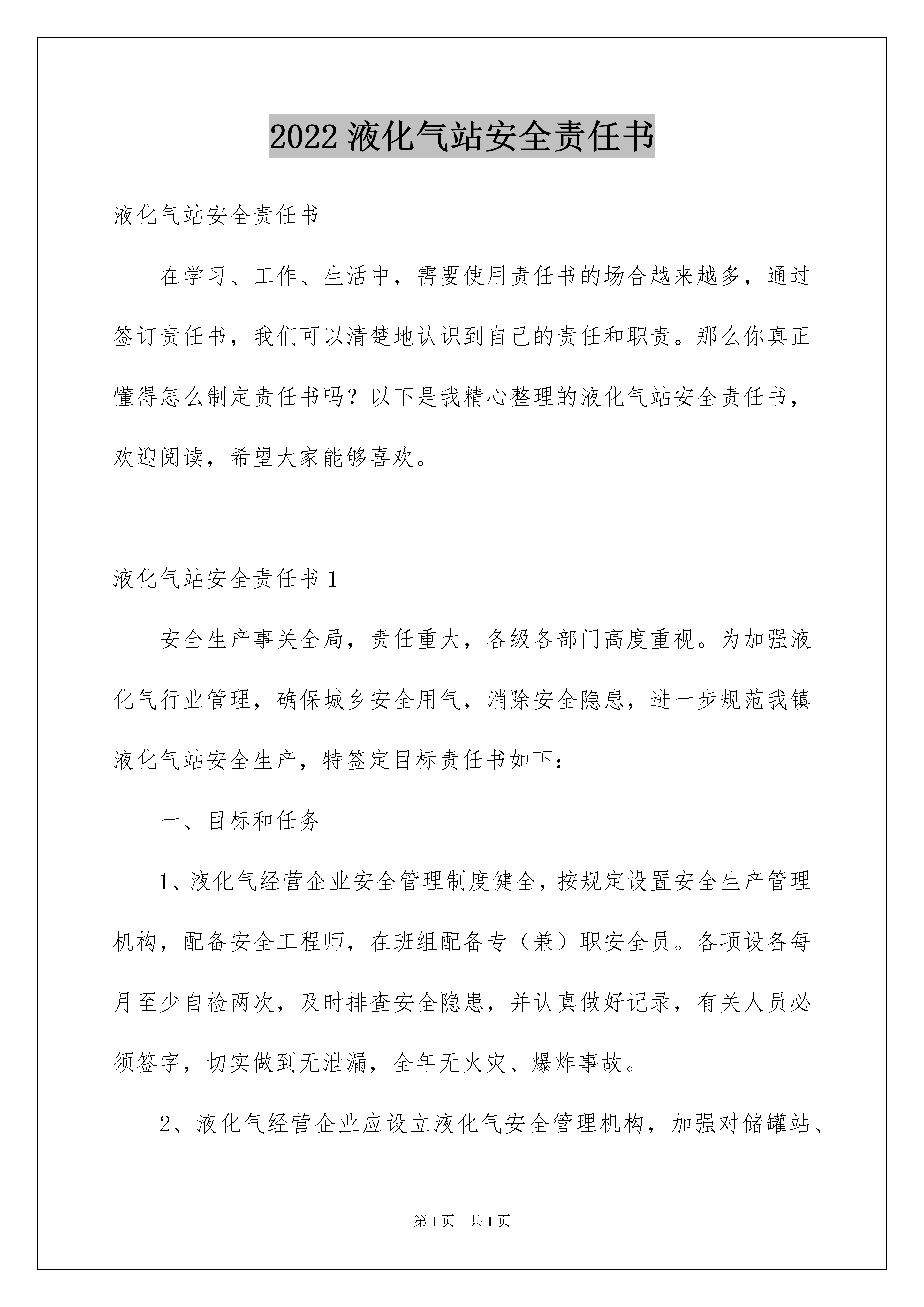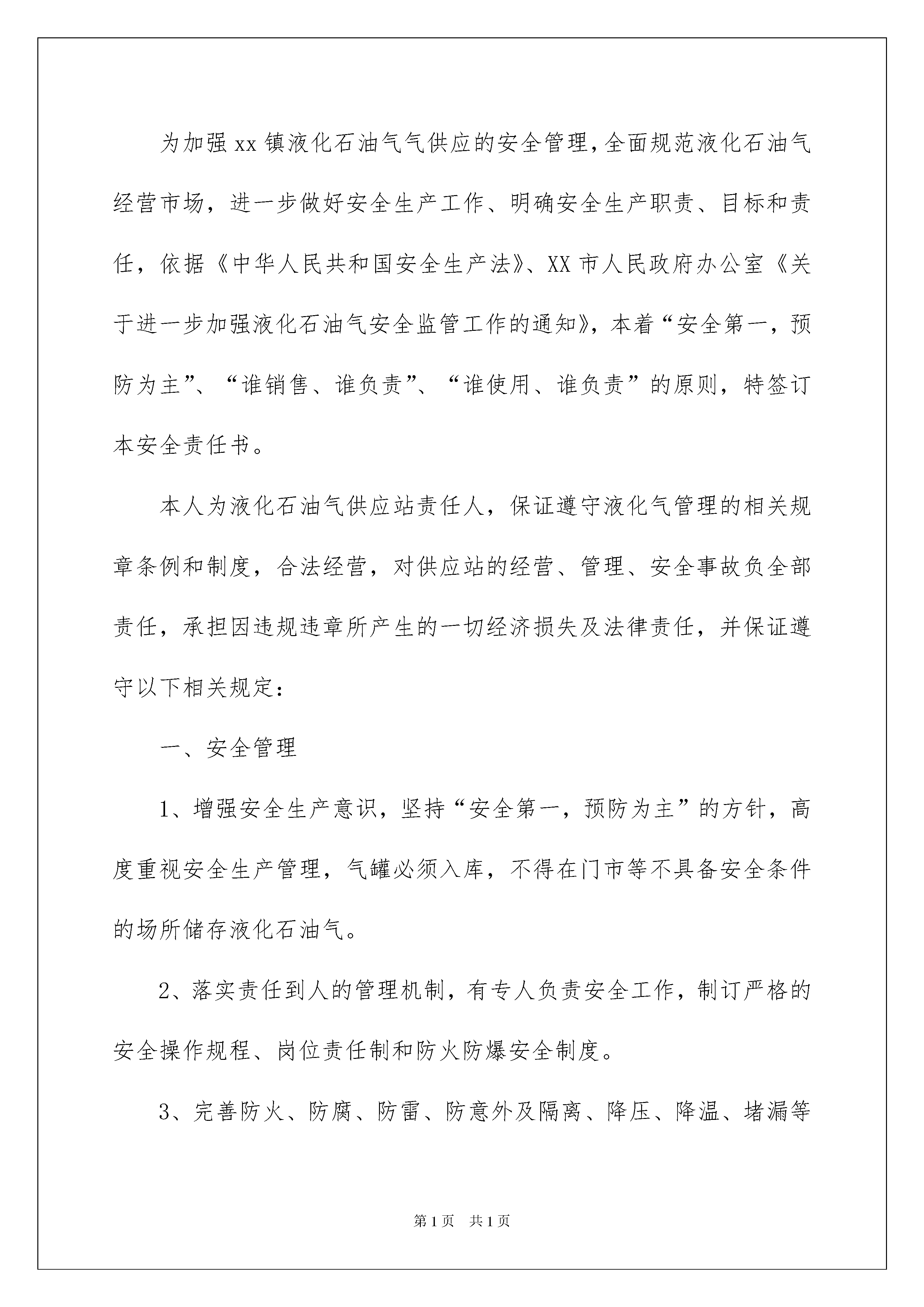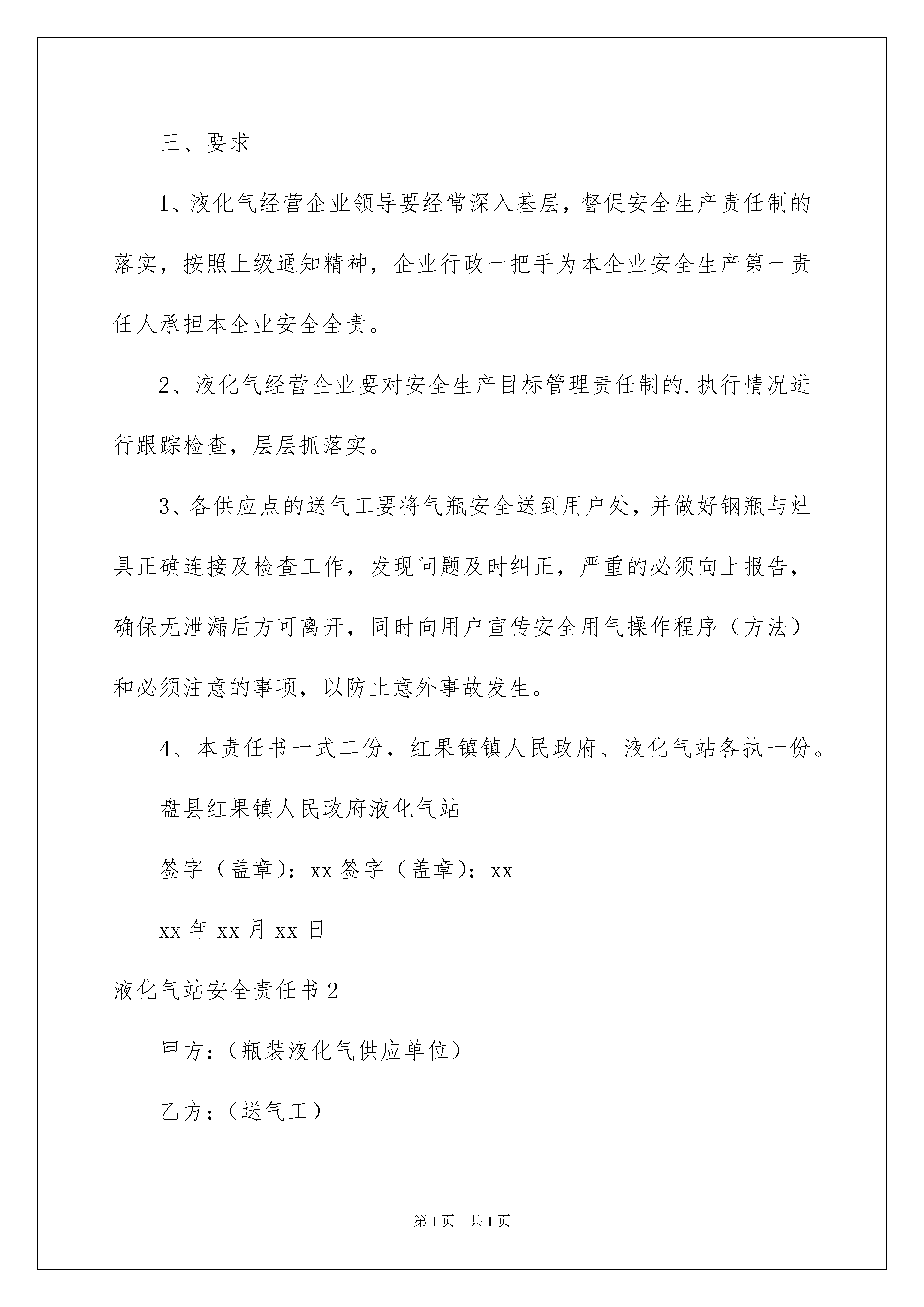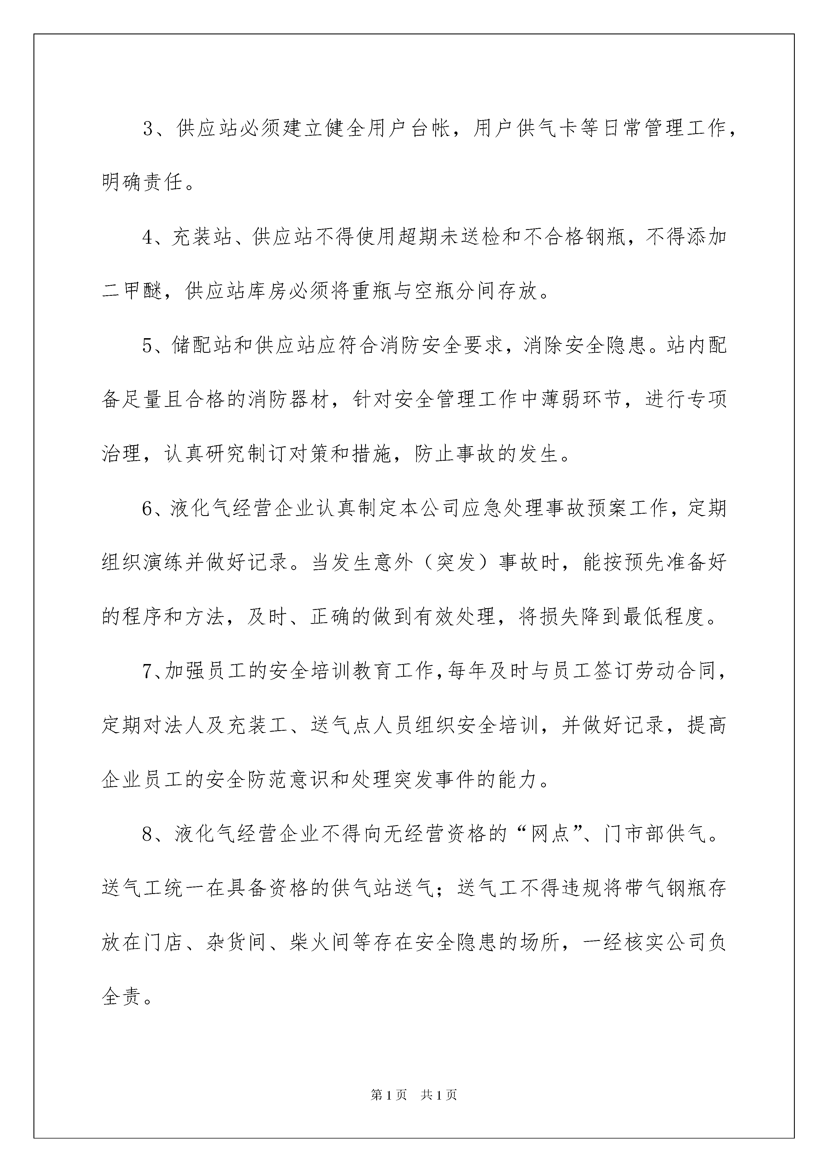 2022液化气站安全责任书液化气站安全责任书在学习、工作、生活中,需要使用责任书的场合越来越多,通过签订责任书,我们可以清楚地认识到自己的责任和职责。那么你真正懂得怎么制定责任书吗?以下是我精心整理的液化气站安全责任书,欢迎阅读,希望大家能够喜欢。液化气站安全责任书1安全生产事关全局,责任重大,各级各部门高度重视。为加强液化气行业管理,确保城乡安全用气,消除安全隐患,进一步规范我镇液化气站安全生产,特签定目标责任书如下:一、目标和任务1、液化气经营企业安全管理制度健全,按规定设置安全生产管理机构,配备安全工程师,在班组配备专(兼)职安全员。各项设备每月至少自检两次,及时排查安全隐患,并认真做好记录,有关人员必须签字,切实做到无泄漏,全年无火灾、爆炸事故。2、液化气经营企业应设立液化气安全管理机构,加强对储罐站、充装站、供应站和运输车辆的安全管理,切实履行安全监管职责,并与相关部门和人员签订安全协议,建立健全安全生产责任制。3、液化气经营企业必须全部达到资质标准要求,凭资质证书和相关证照开展经营,杜绝液化气临时充装、简易充装和无证经营;液化气经营企业人员必须持证上岗,专职安全管理人员具有省局颁发的岗位证书,持证上岗,其他各岗位按规定要求全部持证上岗。二、主要措施1、广泛宣传、提高认识。要进一步加强安全方面的宣传教育工作,提高认识,加强安全工作的领导,把安全工作摆上头等位置,及时进行布置,认真组织检查落实,牢固树立安全第一的思想,切实抓好安全生产管理工作。2、明确职责,抓好安全生产责任制层层落实工作。各液化气经营企业要建立健全安全生产责任制,确保安全生产档案内容齐全,加强对充装站、经营站点的动态管理和监督检查,各项设施、设备由专人负责,定期送检,确保各项设施、设备运转正常;超期未检,相关人员予以严厉处分,发生意外公司负全责;公司与班组层层签订责任状,切实把安全生产目标管理责任制落到实处。3、供应站必须建立健全用户台帐,用户供气卡等日常管理工作,明确责任。4、充装站、供应站不得使用超期未送检和不合格钢瓶,不得添加二甲醚,供应站库房必须将重瓶与空瓶分间存放。5、储配站和供应站应符合消防安全要求,消除安全隐患。站内配备足量且合格的消防器材,针对安全管理工作中薄弱环节,进行专项治理,认真研究制订对策和措施,防止事故的发生。6、液化气经营企业认真制定本公司应急处理事故预案工作,定期组织演练并做好记录。当发生意外(突发)事故时,能按预先准备好的程序和方法,及时、正确的做到有效处理,将损失降到最低程度。7、加强员工的安全培训教育工作,每年及时与员工签订劳动合同,定期对法人及充装工、送气点人员组织安全培训,并做好记录,提高企业员工的安全防范意识和处理突发事件的能力。8、液化气经营企业不得向无经营资格的“网点”、门市部供气。送气工统一在具备资格的供气站送气;送气工不得违规将带气钢瓶存放在门店、杂货间、柴火间等存在安全隐患的场所,一经核实公司负全责。三、要求1、液化气经营企业领导要经常深入基层,督促安全生产责任制的落实,按照上级通知精神,企业行政一把手为本企业安全生产第一责任人承担本企业安全全责。2、液化气经营企业要对安全生产目标管理责任制的.执行情况进行跟踪检查,层层抓落实。3、各供应点的送气工要将气瓶安全送到用户处,并做好钢瓶与灶具正确连接及检查工作,发现问题及时纠正,严重的必须向上报告,确保无泄漏后方可离开,同时向用户宣传安全用气操作程序(方法)和必须注意的事项,以防止意外事故发生。4、本责任书一式二份,红果镇镇人民政府、液化气站各执一份。盘县红果镇人民政府液化气站签字(盖章):xx签字(盖章):xxxx年xx月xx日液化气站安全责任书2甲方:(瓶装液化气供应单位)乙方:(送气工)为加强xx镇液化石油气气供应的安全管理,全面规范液化石油气经营市场,进一步做好安全生产工作、明确安全生产职责、目标和责任,依据《中华人民共和国安全生产法》、XX市人民政府办公室《关于进一步加强液化石油气安全监管工作的通知》,本着“安全第一,预防为主”、“谁销售、谁负责”、“谁使用、谁负责”的原则,特签订本安全责任书。本人为液化石油气供应站责任人,保证遵守液化气管理的相关规章条例和制度,合法经营,对供应站的经营、管理、安全事故负全部责任,承担因违规违章所产生的一切经济损失及法律责任,并保证遵守以下相关规定:一、安全管理1、增强安全生产意识,坚持“安全第一,预防为主”的方针,高度重视安全生产管理,气罐必须入库,不得在门市等不具备安全条件的场所储存液化石油气。2、落实责任到人的管理机制,有专人负责安全工作,制订严格的安