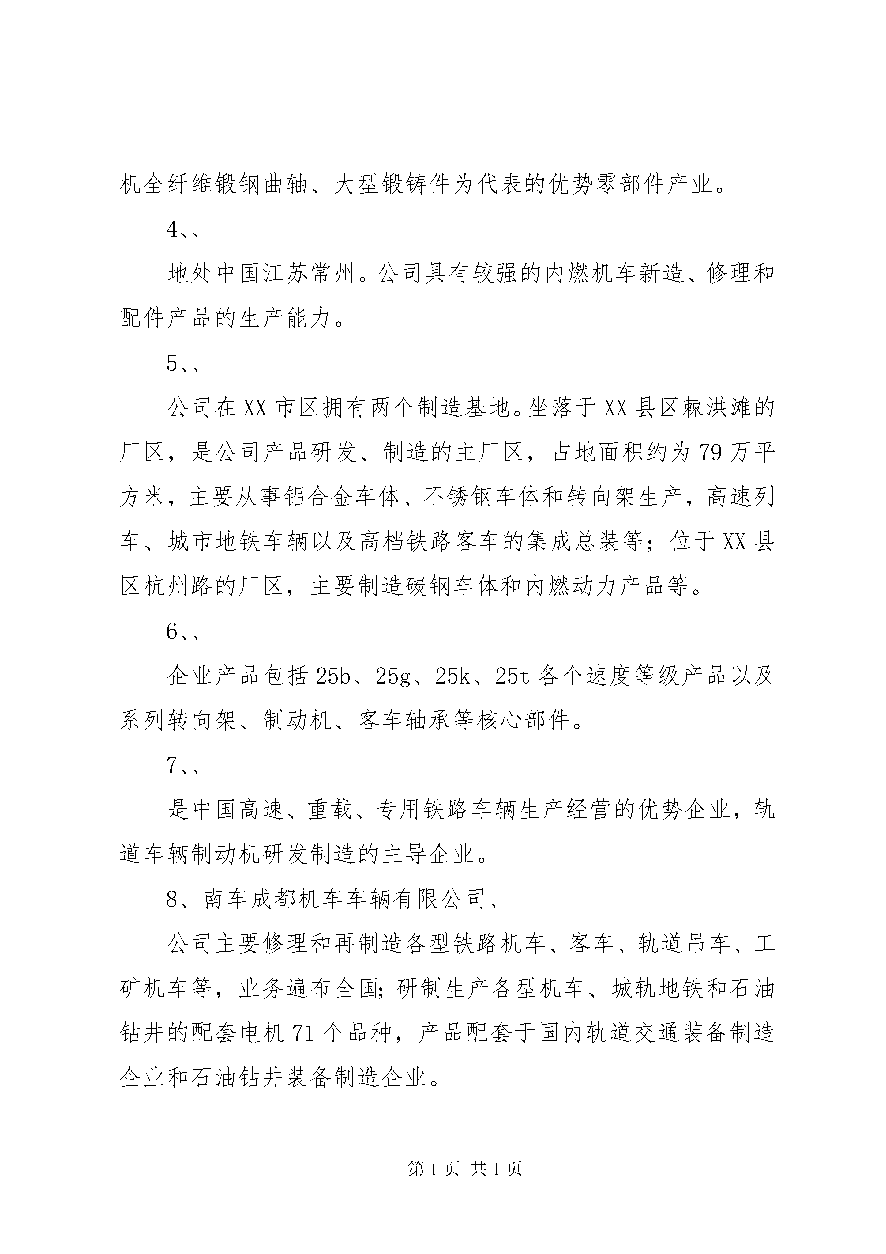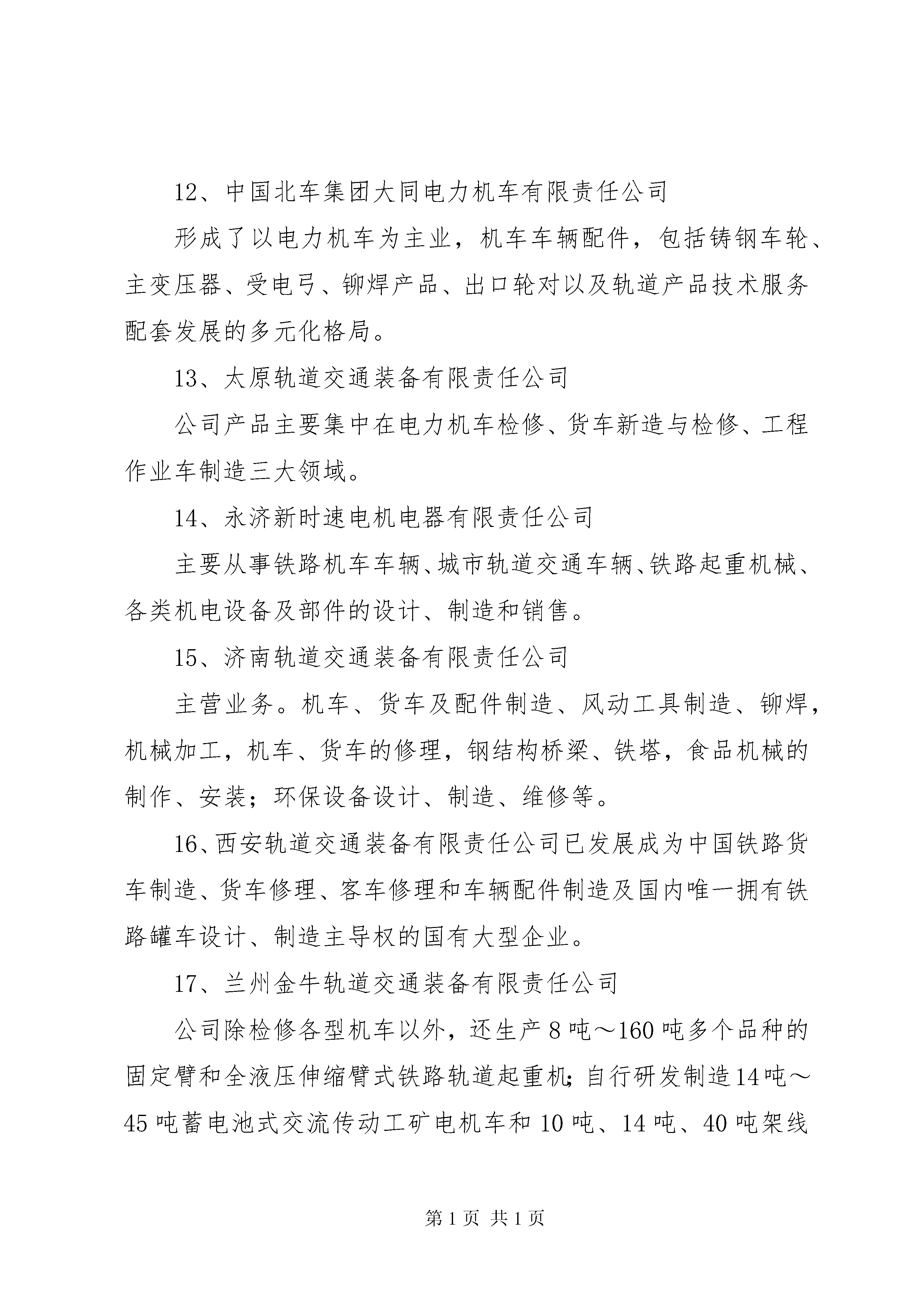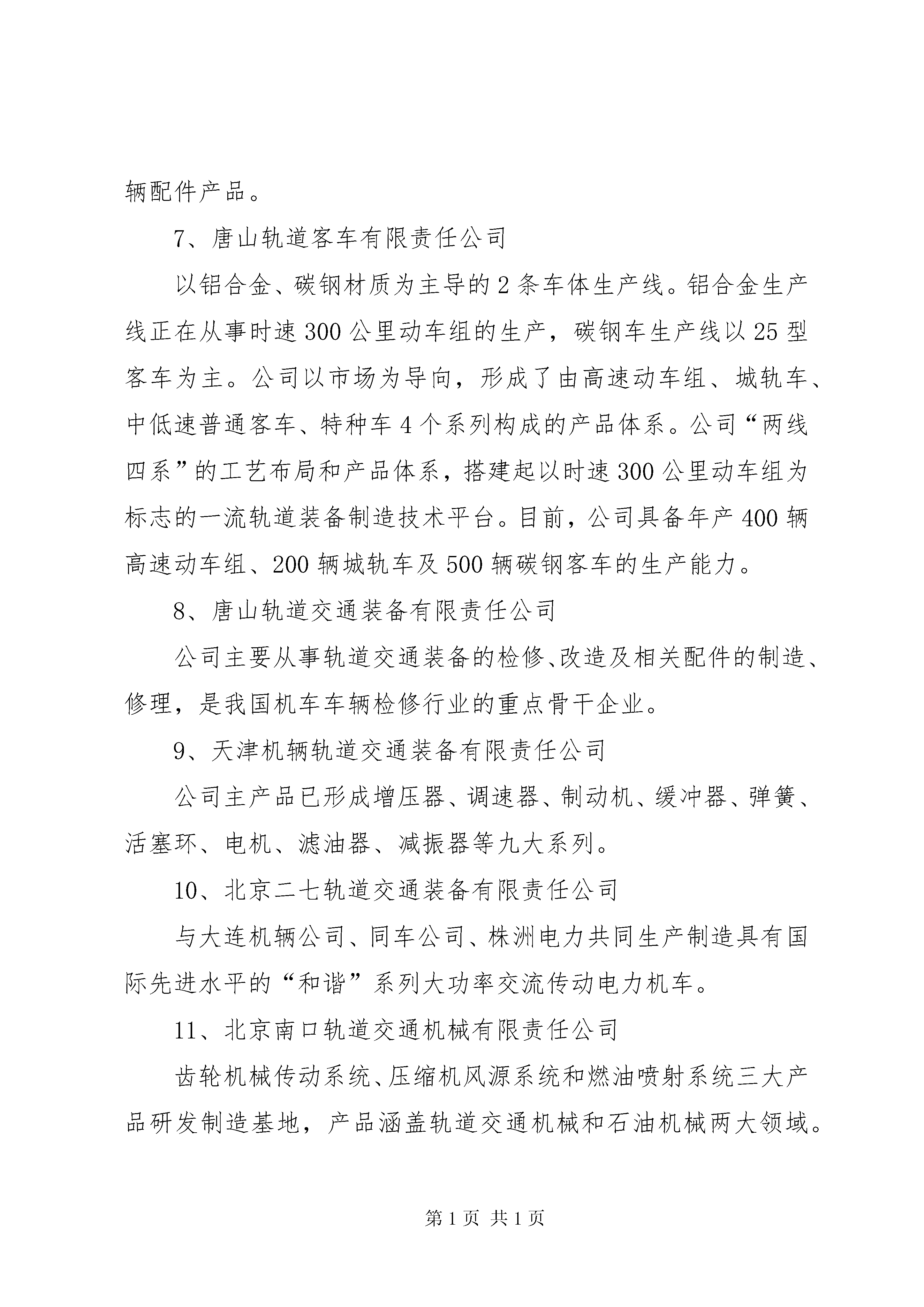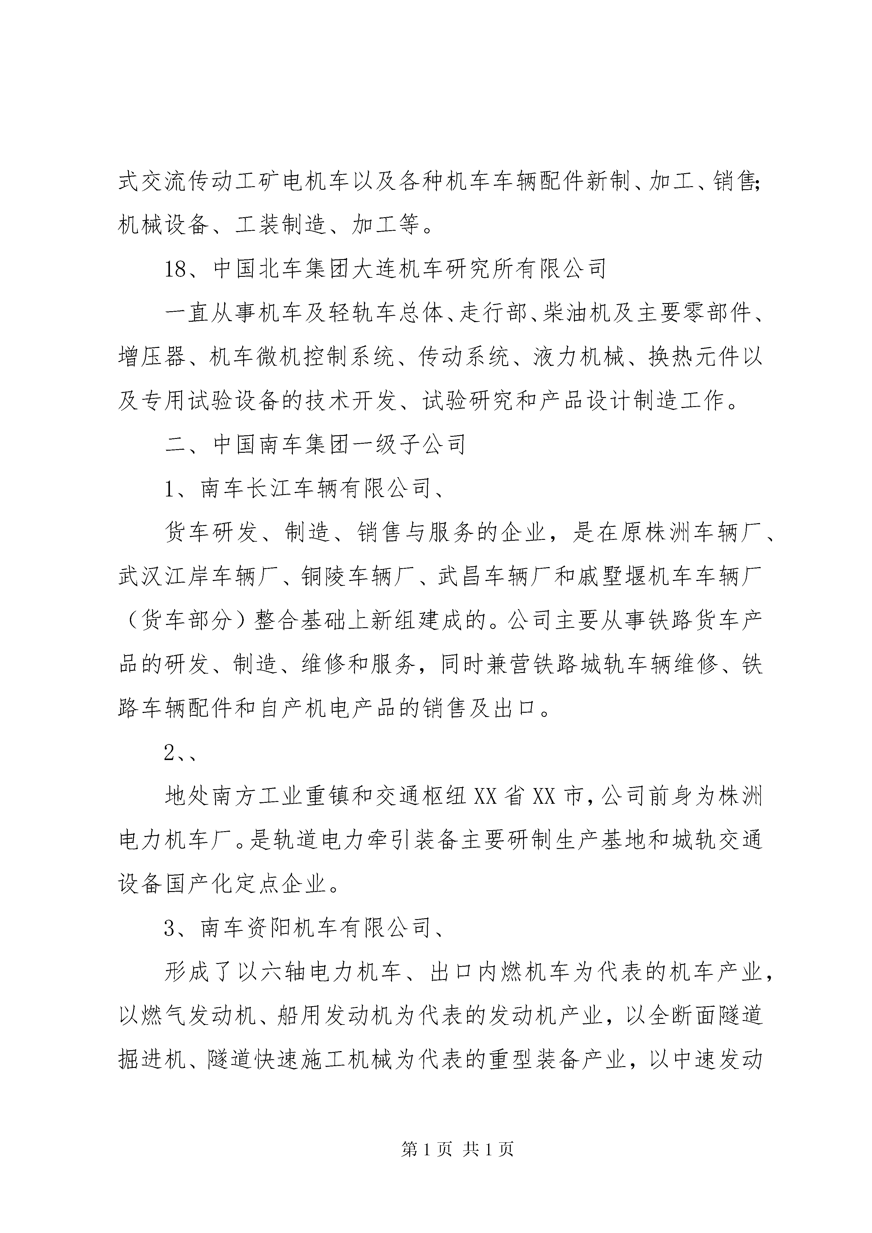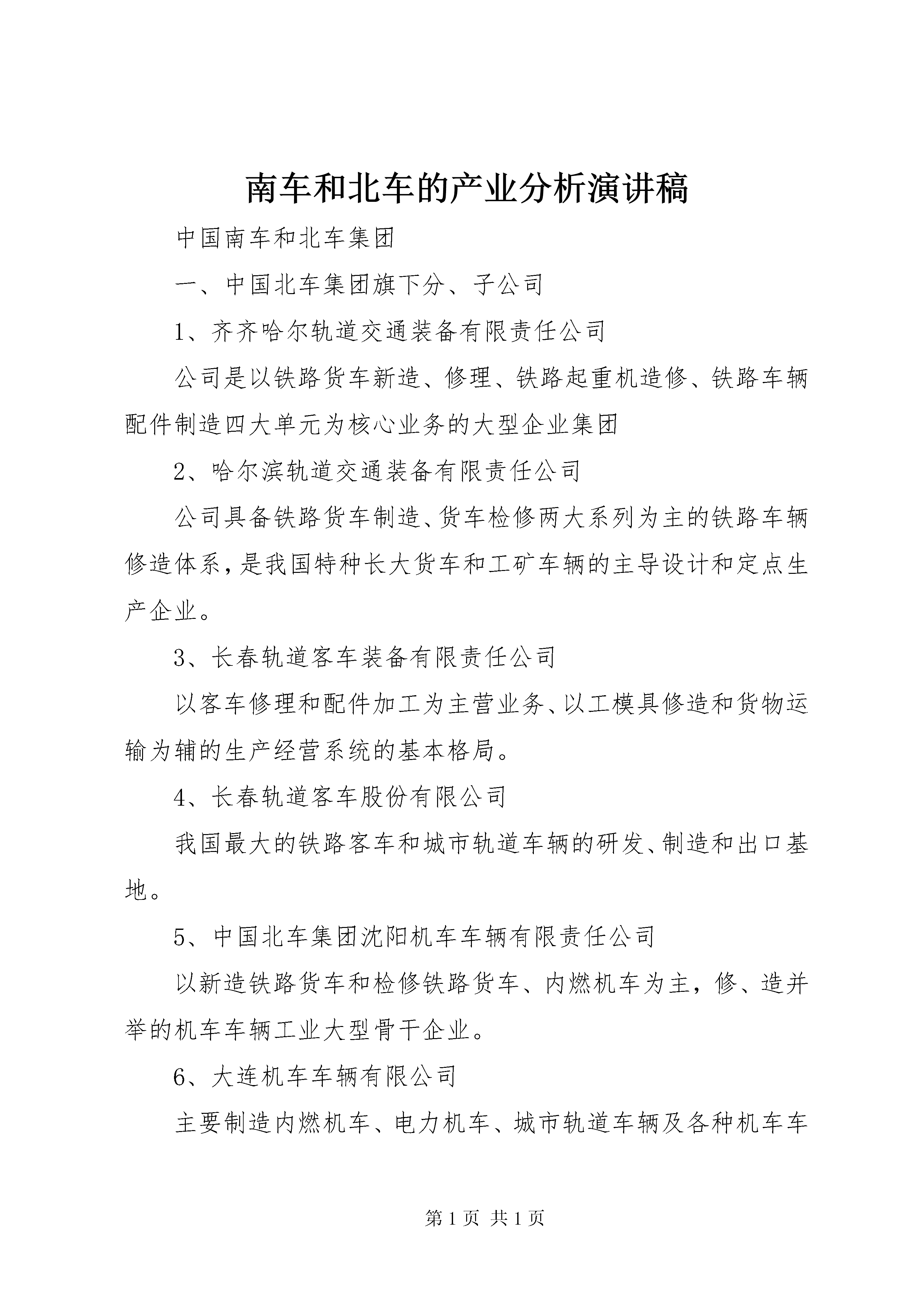 南车和北车的产业分析演讲稿中国南车和北车集团一、中国北车集团旗下分、子公司1、齐齐哈尔轨道交通装备有限责任公司公司是以铁路货车新造、修理、铁路起重机造修、铁路车辆配件制造四大单元为核心业务的大型企业集团2、哈尔滨轨道交通装备有限责任公司公司具备铁路货车制造、货车检修两大系列为主的铁路车辆修造体系,是我国特种长大货车和工矿车辆的主导设计和定点生产企业。3、长春轨道客车装备有限责任公司以客车修理和配件加工为主营业务、以工模具修造和货物运输为辅的生产经营系统的基本格局。4、长春轨道客车股份有限公司我国最大的铁路客车和城市轨道车辆的研发、制造和出口基地。5、中国北车集团沈阳机车车辆有限责任公司以新造铁路货车和检修铁路货车、内燃机车为主,修、造并举的机车车辆工业大型骨干企业。6、大连机车车辆有限公司主要制造内燃机车、电力机车、城市轨道车辆及各种机车车辆配件产品。7、唐山轨道客车有限责任公司以铝合金、碳钢材质为主导的2条车体生产线。铝合金生产线正在从事时速300公里动车组的生产,碳钢车生产线以25型客车为主。公司以市场为导向,形成了由高速动车组、城轨车、中低速普通客车、特种车4个系列构成的产品体系。公司“两线四系”的工艺布局和产品体系,搭建起以时速300公里动车组为标志的一流轨道装备制造技术平台。目前,公司具备年产400辆高速动车组、200辆城轨车及500辆碳钢客车的生产能力。8、唐山轨道交通装备有限责任公司公司主要从事轨道交通装备的检修、改造及相关配件的制造、修理,是我国机车车辆检修行业的重点骨干企业。9、天津机辆轨道交通装备有限责任公司公司主产品已形成增压器、调速器、制动机、缓冲器、弹簧、活塞环、电机、滤油器、减振器等九大系列。10、北京二七轨道交通装备有限责任公司与大连机辆公司、同车公司、株洲电力共同生产制造具有国际先进水平的“和谐”系列大功率交流传动电力机车。11、北京南口轨道交通机械有限责任公司齿轮机械传动系统、压缩机风源系统和燃油喷射系统三大产品研发制造基地,产品涵盖轨道交通机械和石油机械两大领域。12、中国北车集团大同电力机车有限责任公司形成了以电力机车为主业,机车车辆配件,包括铸钢车轮、主变压器、受电弓、铆焊产品、出口轮对以及轨道产品技术服务配套发展的多元化格局。13、太原轨道交通装备有限责任公司公司产品主要集中在电力机车检修、货车新造与检修、工程作业车制造三大领域。14、永济新时速电机电器有限责任公司主要从事铁路机车车辆、城市轨道交通车辆、铁路起重机械、各类机电设备及部件的设计、制造和销售。15、济南轨道交通装备有限责任公司主营业务。机车、货车及配件制造、风动工具制造、铆焊,机械加工,机车、货车的修理,钢结构桥梁、铁塔,食品机械的制作、安装;环保设备设计、制造、维修等。16、西安轨道交通装备有限责任公司已发展成为中国铁路货车制造、货车修理、客车修理和车辆配件制造及国内唯一拥有铁路罐车设计、制造主导权的国有大型企业。17、兰州金牛轨道交通装备有限责任公司公司除检修各型机车以外,还生产8吨~160吨多个品种的固定臂和全液压伸缩臂式铁路轨道起重机;自行研发制造14吨~45吨蓄电池式交流传动工矿电机车和10吨、14吨、40吨架线式交流传动工矿电机车以及各种机车车辆配件新制、加工、销售;机械设备、工装制造、加工等。18、中国北车集团大连机车研究所有限公司一直从事机车及轻轨车总体、走行部、柴油机及主要零部件、增压器、机车微机控制系统、传动系统、液力机械、换热元件以及专用试验设备的技术开发、试验研究和产品设计制造工作。二、中国南车集团一级子公司1、南车长江车辆有限公司、货车研发、制造、销售与服务的企业,是在原株洲车辆厂、武汉江岸车辆厂、铜陵车辆厂、武昌车辆厂和戚墅堰机车车辆厂(货车部分)整合基础上新组建成的。公司主要从事铁路货车产品的研发、制造、维修和服务,同时兼营铁路城轨车辆维修、铁路车辆配件和自产机电产品的销售及出口。2、、地处南方工业重镇和交通枢纽XX省XX市,公司前身为株洲电力机车厂。是轨道电力牵引装备主要研制生产基地和城轨交通设备国产化定点企业。3、南车资阳机车有限公司、形成了以六轴电力机车、出口内燃机车为代表的机车产业,以燃气发动机、船用发动机为代表的发动机产业,以全断面隧道掘进机、隧道快速施工机械为代表的重型装备产业,以中速发动机全纤维锻钢曲轴、大型锻铸件为代表的优势零部件产业。4、、地处中国江苏常州。公司具有较强的内燃机车新造、修理和配件产品的生产能力。5、、公司在XX市区拥有两个制造基地。坐落于XX县区棘洪滩的厂区,是公司产品研发、制造的主厂区,占地面积约为79万平方米,主要从事铝合金车体、不锈钢车体和转向架生产,高速列车、城市地铁车辆以及高档铁路客车的集成总装等;位于XX县区杭州路的厂区,