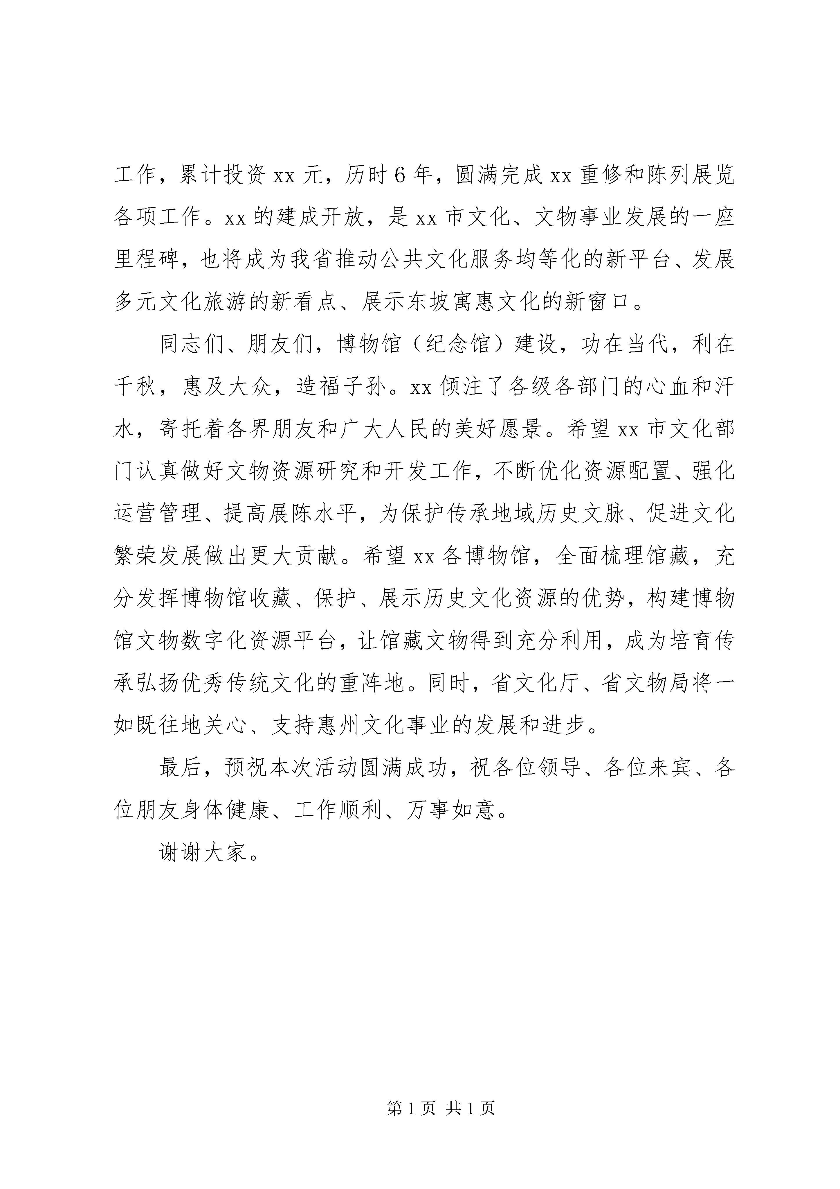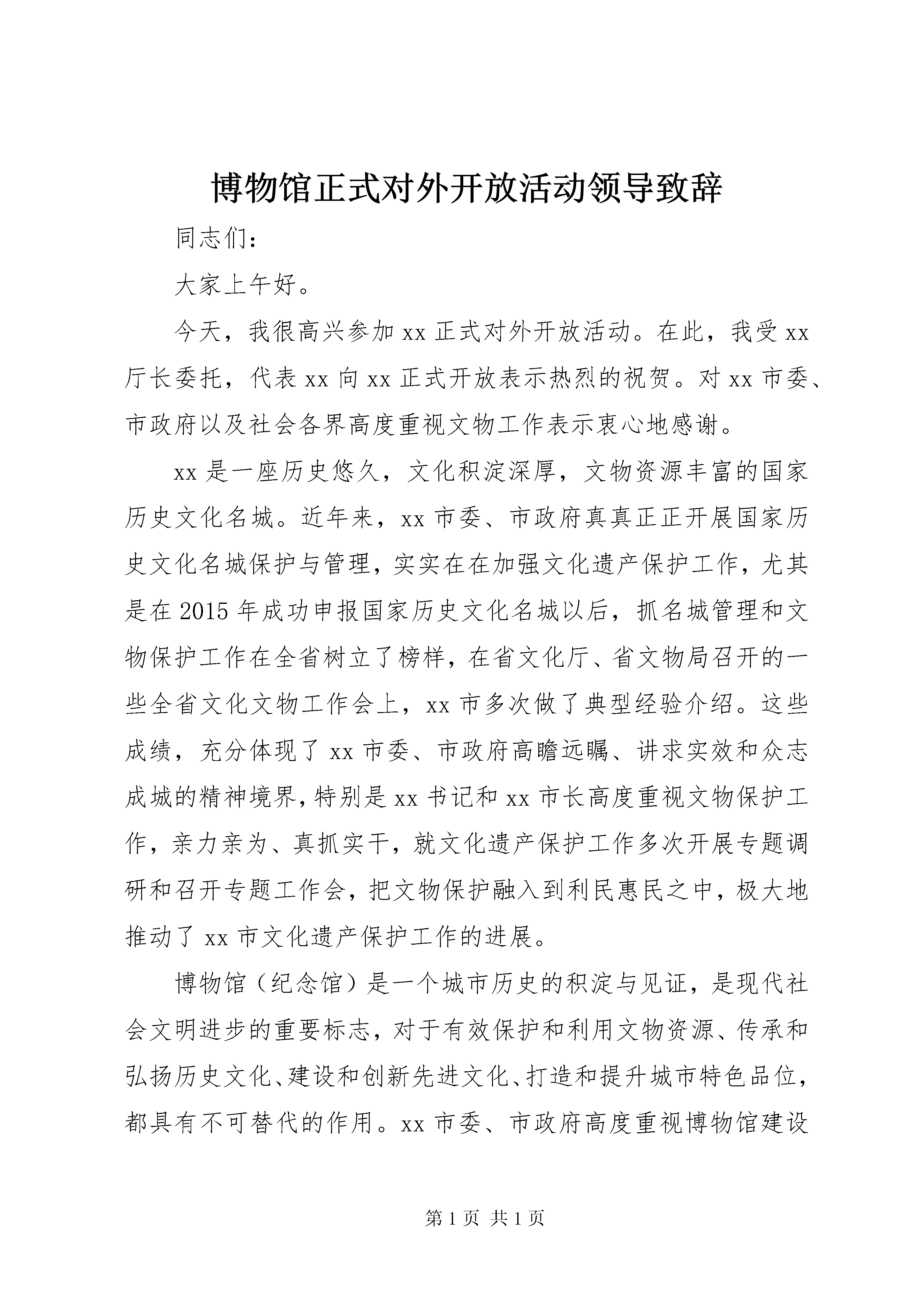 博物馆正式对外开放活动领导致辞同志们:大家上午好。今天,我很高兴参加xx正式对外开放活动。在此,我受xx厅长委托,代表xx向xx正式开放表示热烈的祝贺。对xx市委、市政府以及社会各界高度重视文物工作表示衷心地感谢。xx是一座历史悠久,文化积淀深厚,文物资源丰富的国家历史文化名城。近年来,xx市委、市政府真真正正开展国家历史文化名城保护与管理,实实在在加强文化遗产保护工作,尤其是在2015年成功申报国家历史文化名城以后,抓名城管理和文物保护工作在全省树立了榜样,在省文化厅、省文物局召开的一些全省文化文物工作会上,xx市多次做了典型经验介绍。这些成绩,充分体现了xx市委、市政府高瞻远瞩、讲求实效和众志成城的精神境界,特别是xx书记和xx市长高度重视文物保护工作,亲力亲为、真抓实干,就文化遗产保护工作多次开展专题调研和召开专题工作会,把文物保护融入到利民惠民之中,极大地推动了xx市文化遗产保护工作的进展。博物馆(纪念馆)是一个城市历史的积淀与见证,是现代社会文明进步的重要标志,对于有效保护和利用文物资源、传承和弘扬历史文化、建设和创新先进文化、打造和提升城市特色品位,都具有不可替代的作用。xx市委、市政府高度重视博物馆建设工作,累计投资xx元,历时6年,圆满完成xx重修和陈列展览各项工作。xx的建成开放,是xx市文化、文物事业发展的一座里程碑,也将成为我省推动公共文化服务均等化的新平台、发展多元文化旅游的新看点、展示东坡寓惠文化的新窗口。同志们、朋友们,博物馆(纪念馆)建设,功在当代,利在千秋,惠及大众,造福子孙。xx倾注了各级各部门的心血和汗水,寄托着各界朋友和广大人民的美好愿景。希望xx市文化部门认真做好文物资源研究和开发工作,不断优化资源配置、强化运营管理、提高展陈水平,为保护传承地域历史文脉、促进文化繁荣发展做出更大贡献。希望xx各博物馆,全面梳理馆藏,充分发挥博物馆收藏、保护、展示历史文化资源的优势,构建博物馆文物数字化资源平台,让馆藏文物得到充分利用,成为培育传承弘扬优秀传统文化的重阵地。同时,省文化厅、省文物局将一如既往地关心、支持惠州文化事业的发展和进步。最后,预祝本次活动圆满成功,祝各位领导、各位来宾、各位朋友身体健康、工作顺利、万事如意。谢谢大家。