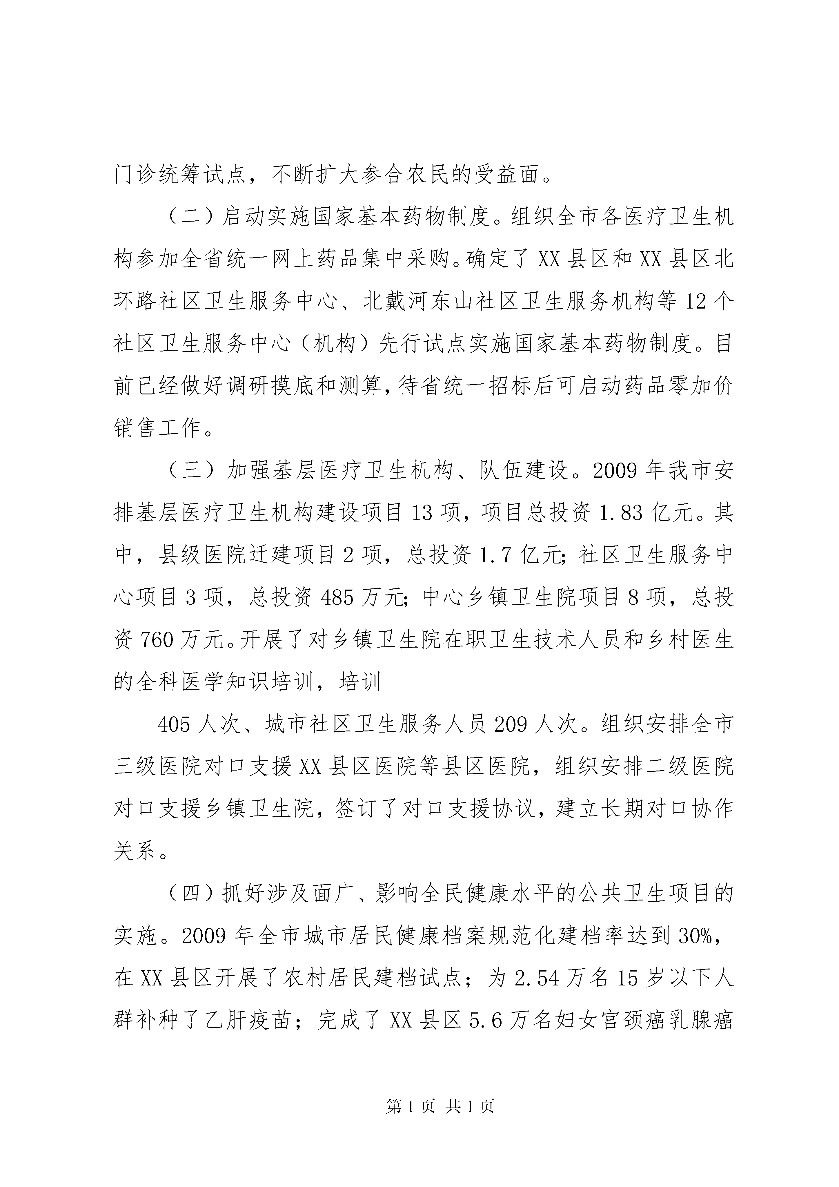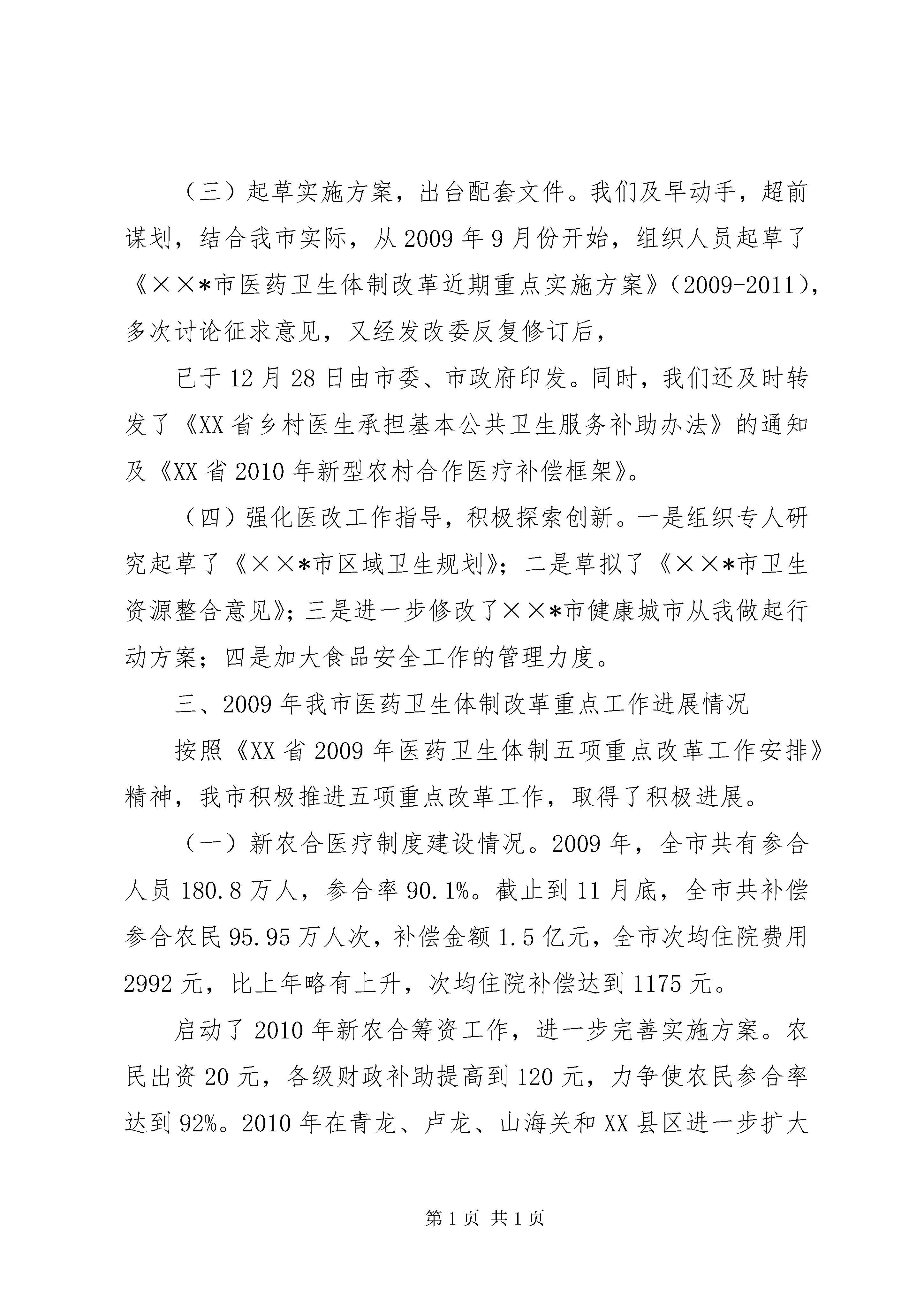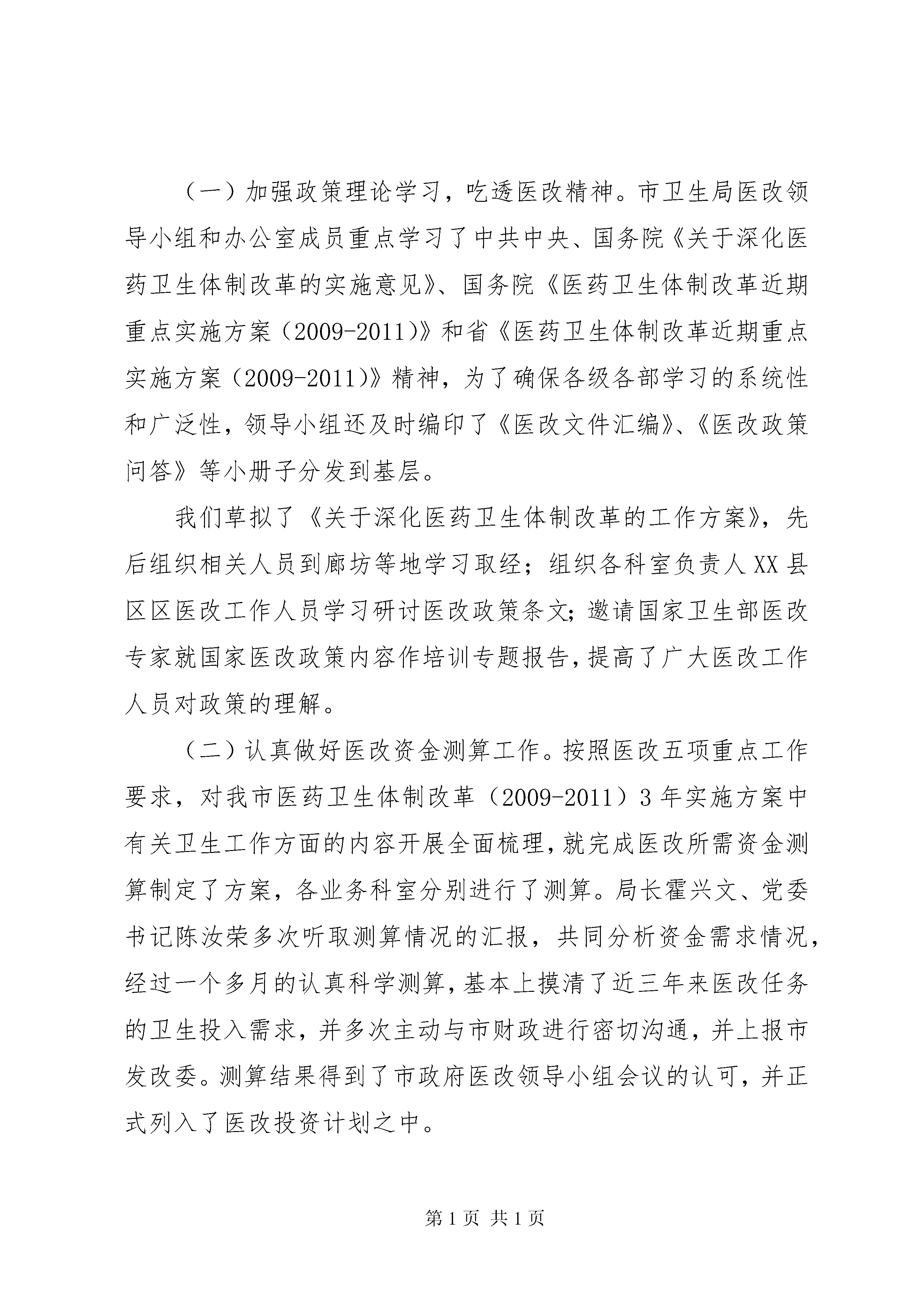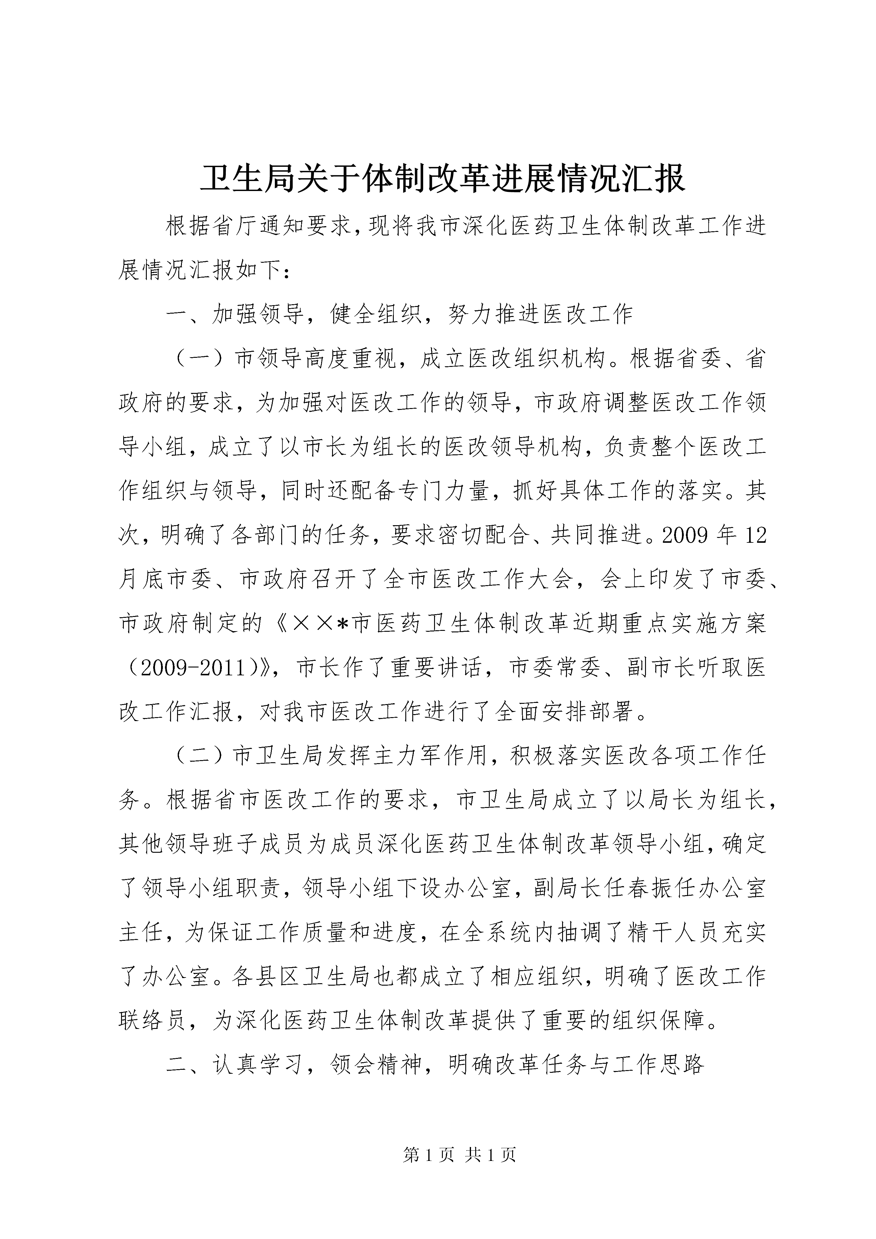 卫生局关于体制改革进展情况汇报根据省厅通知要求,现将我市深化医药卫生体制改革工作进展情况汇报如下:一、加强领导,健全组织,努力推进医改工作(一)市领导高度重视,成立医改组织机构。根据省委、省政府的要求,为加强对医改工作的领导,市政府调整医改工作领导小组,成立了以市长为组长的医改领导机构,负责整个医改工作组织与领导,同时还配备专门力量,抓好具体工作的落实。其次,明确了各部门的任务,要求密切配合、共同推进。2009年12月底市委、市政府召开了全市医改工作大会,会上印发了市委、市政府制定的《××*市医药卫生体制改革近期重点实施方案(2009-2011)》,市长作了重要讲话,市委常委、副市长听取医改工作汇报,对我市医改工作进行了全面安排部署。(二)市卫生局发挥主力军作用,积极落实医改各项工作任务。根据省市医改工作的要求,市卫生局成立了以局长为组长,其他领导班子成员为成员深化医药卫生体制改革领导小组,确定了领导小组职责,领导小组下设办公室,副局长任春振任办公室主任,为保证工作质量和进度,在全系统内抽调了精干人员充实了办公室。各县区卫生局也都成立了相应组织,明确了医改工作联络员,为深化医药卫生体制改革提供了重要的组织保障。二、认真学习,领会精神,明确改革任务与工作思路(一)加强政策理论学习,吃透医改精神。市卫生局医改领导小组和办公室成员重点学习了中共中央、国务院《关于深化医药卫生体制改革的实施意见》、国务院《医药卫生体制改革近期重点实施方案(2009-2011)》和省《医药卫生体制改革近期重点实施方案(2009-2011)》精神,为了确保各级各部学习的系统性和广泛性,领导小组还及时编印了《医改文件汇编》、《医改政策问答》等小册子分发到基层。我们草拟了《关于深化医药卫生体制改革的工作方案》,先后组织相关人员到廊坊等地学习取经;组织各科室负责人XX县区区医改工作人员学习研讨医改政策条文;邀请国家卫生部医改专家就国家医改政策内容作培训专题报告,提高了广大医改工作人员对政策的理解。(二)认真做好医改资金测算工作。按照医改五项重点工作要求,对我市医药卫生体制改革(2009-2011)3年实施方案中有关卫生工作方面的内容开展全面梳理,就完成医改所需资金测算制定了方案,各业务科室分别进行了测算。局长霍兴文、党委书记陈汝荣多次听取测算情况的汇报,共同分析资金需求情况,经过一个多月的认真科学测算,基本上摸清了近三年来医改任务的卫生投入需求,并多次主动与市财政进行密切沟通,并上报市发改委。测算结果得到了市政府医改领导小组会议的认可,并正式列入了医改投资计划之中。(三)起草实施方案,出台配套文件。我们及早动手,超前谋划,结合我市实际,从2009年9月份开始,组织人员起草了《××*市医药卫生体制改革近期重点实施方案》(2009-2011),多次讨论征求意见,又经发改委反复修订后,已于12月28日由市委、市政府印发。同时,我们还及时转发了《XX省乡村医生承担基本公共卫生服务补助办法》的通知及《XX省2010年新型农村合作医疗补偿框架》。(四)强化医改工作指导,积极探索创新。一是组织专人研究起草了《××*市区域卫生规划》;二是草拟了《××*市卫生资源整合意见》;三是进一步修改了××*市健康城市从我做起行动方案;四是加大食品安全工作的管理力度。三、2009年我市医药卫生体制改革重点工作进展情况按照《XX省2009年医药卫生体制五项重点改革工作安排》精神,我市积极推进五项重点改革工作,取得了积极进展。(一)新农合医疗制度建设情况。2009年,全市共有参合人员180.8万人,参合率90.1%。截止到11月底,全市共补偿参合农民95.95万人次,补偿金额1.5亿元,全市次均住院费用2992元,比上年略有上升,次均住院补偿达到1175元。启动了2010年新农合筹资工作,进一步完善实施方案。农民出资20元,各级财政补助提高到120元,力争使农民参合率达到92%。2010年在青龙、卢龙、山海关和XX县区进一步扩大门诊统筹试点,不断扩大参合农民的受益面。(二)启动实施国家基本药物制度。组织全市各医疗卫生机构参加全省统一网上药品集中采购。确定了XX县区和XX县区北环路社区卫生服务中心、北戴河东山社区卫生服务机构等12个社区卫生服务中心(机构)先行试点实施国家基本药物制度。目前已经做好调研摸底和测算,待省统一招标后可启动药品零加价销售工作。(三)加强基层医疗卫生机构、队伍建设。2009年我市安排基层医疗卫生机构建设项目13项,项目总投资1.83亿元。其中,县级医院迁建项目2项,总投资1.7亿元;社区卫生服务中心项目3项,总投资485万元;中心乡镇卫生院项目8项,总投资760万元。开展了对乡镇卫生院在职卫生技术人员和乡村医生的全科医学知识培训,培训405人次、城