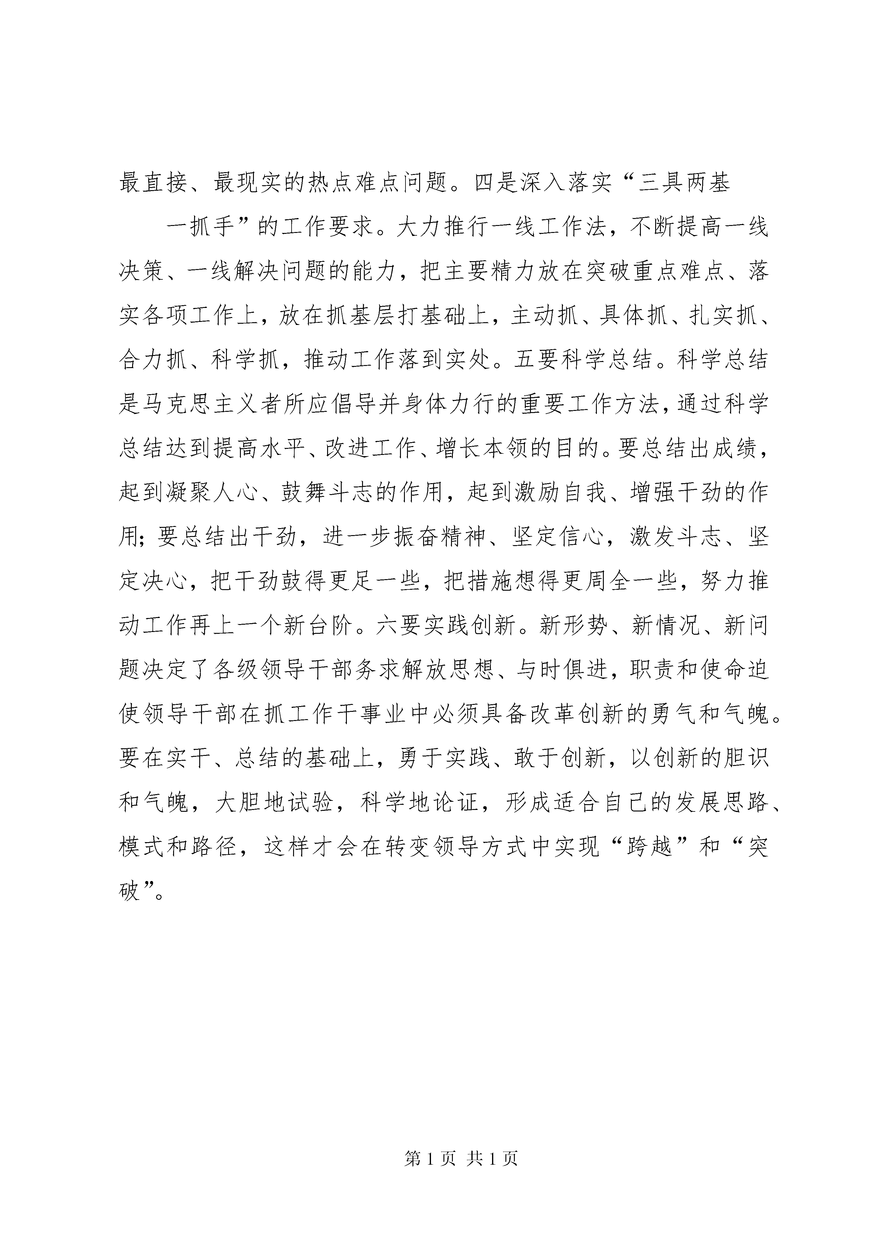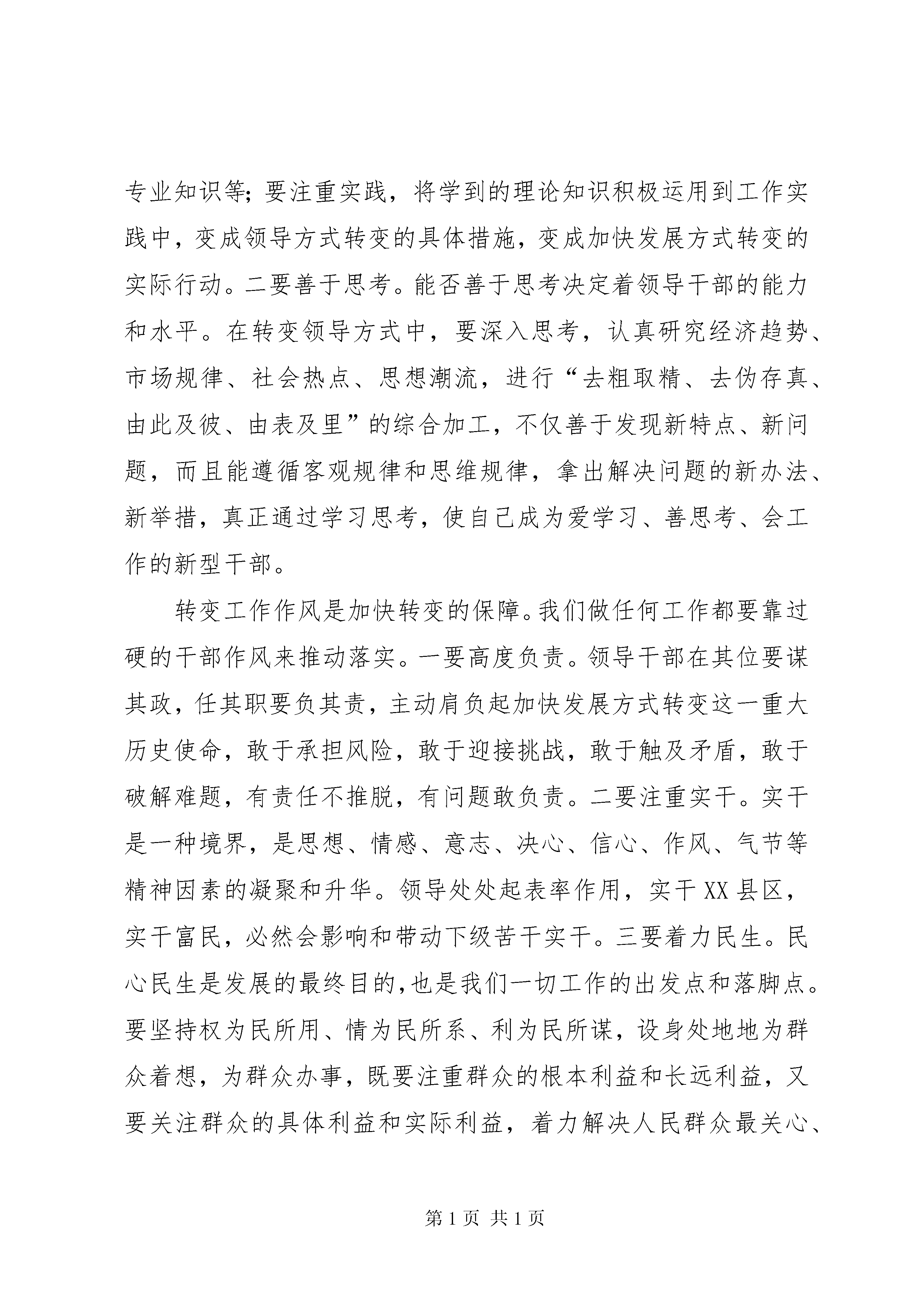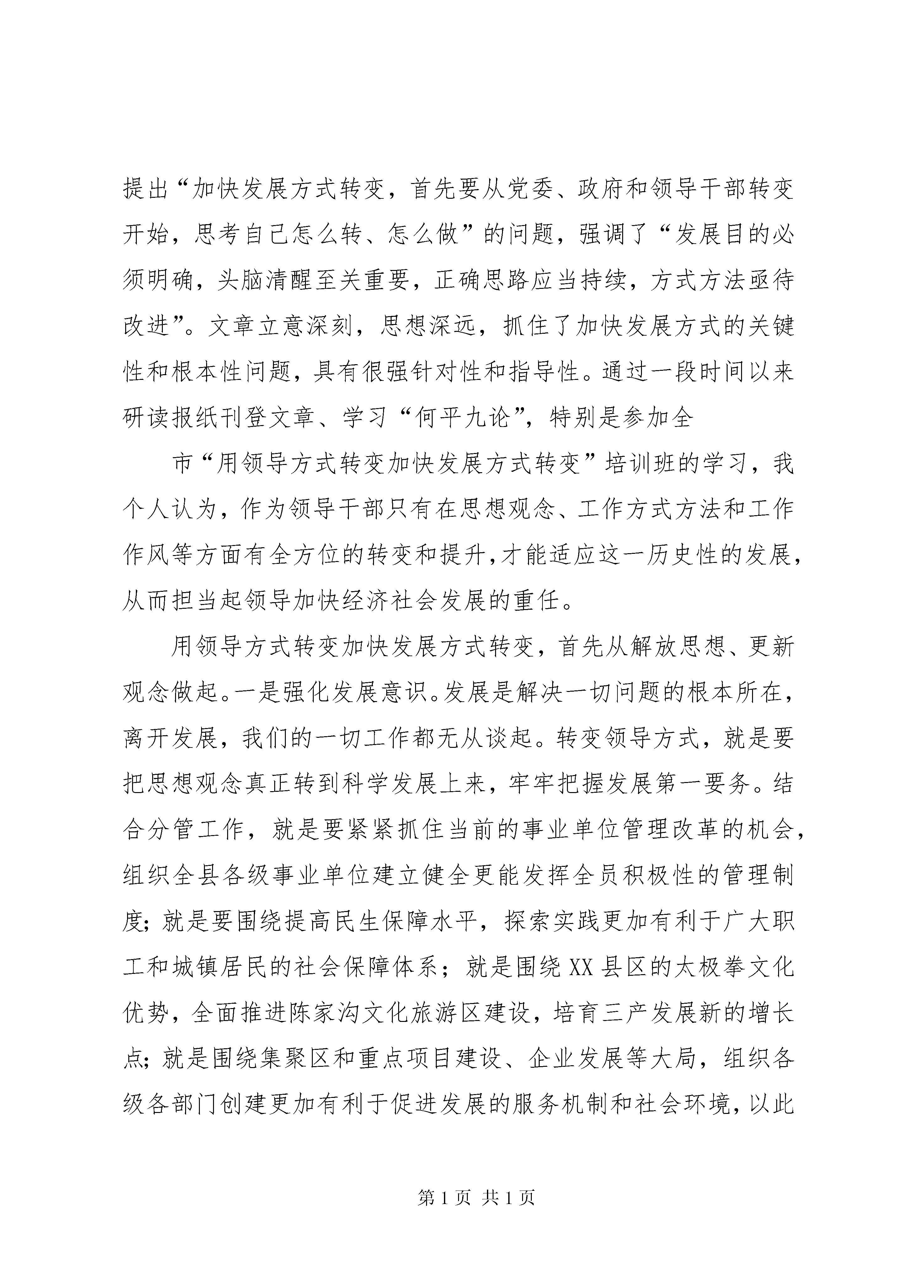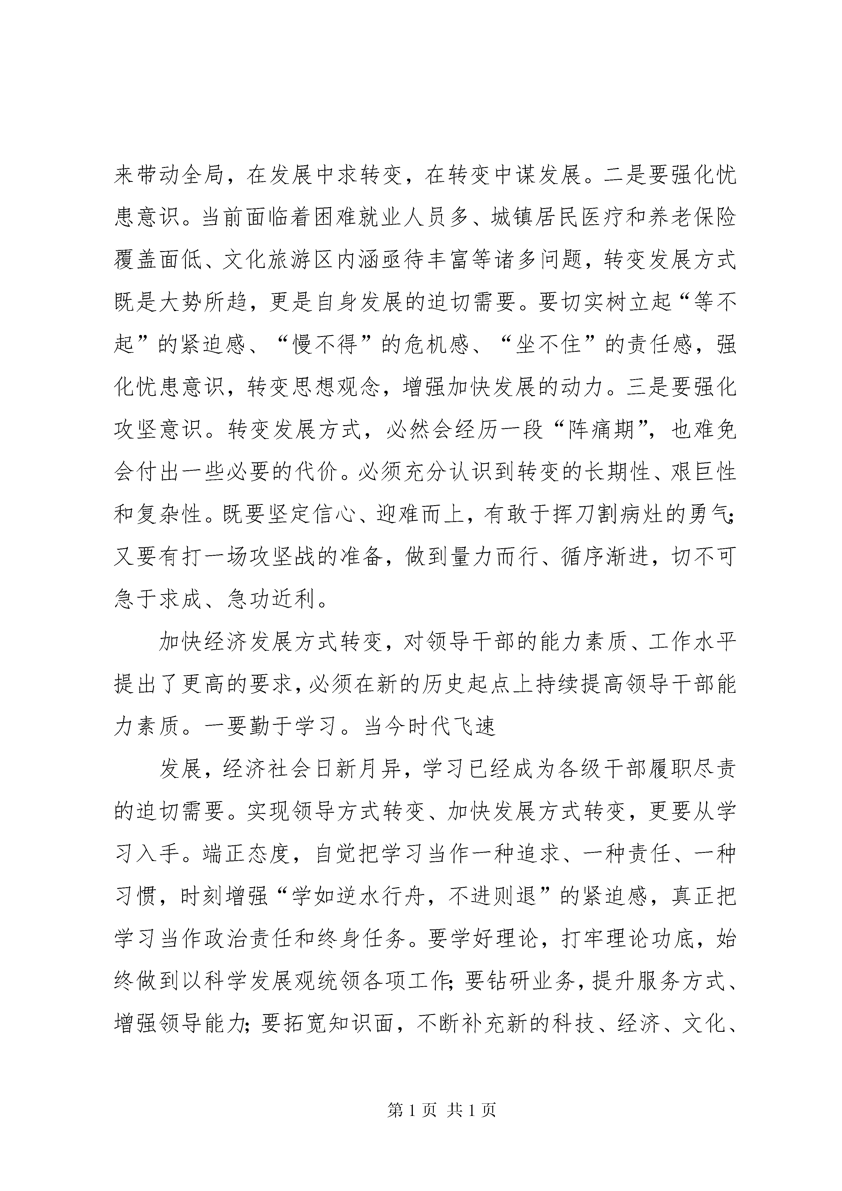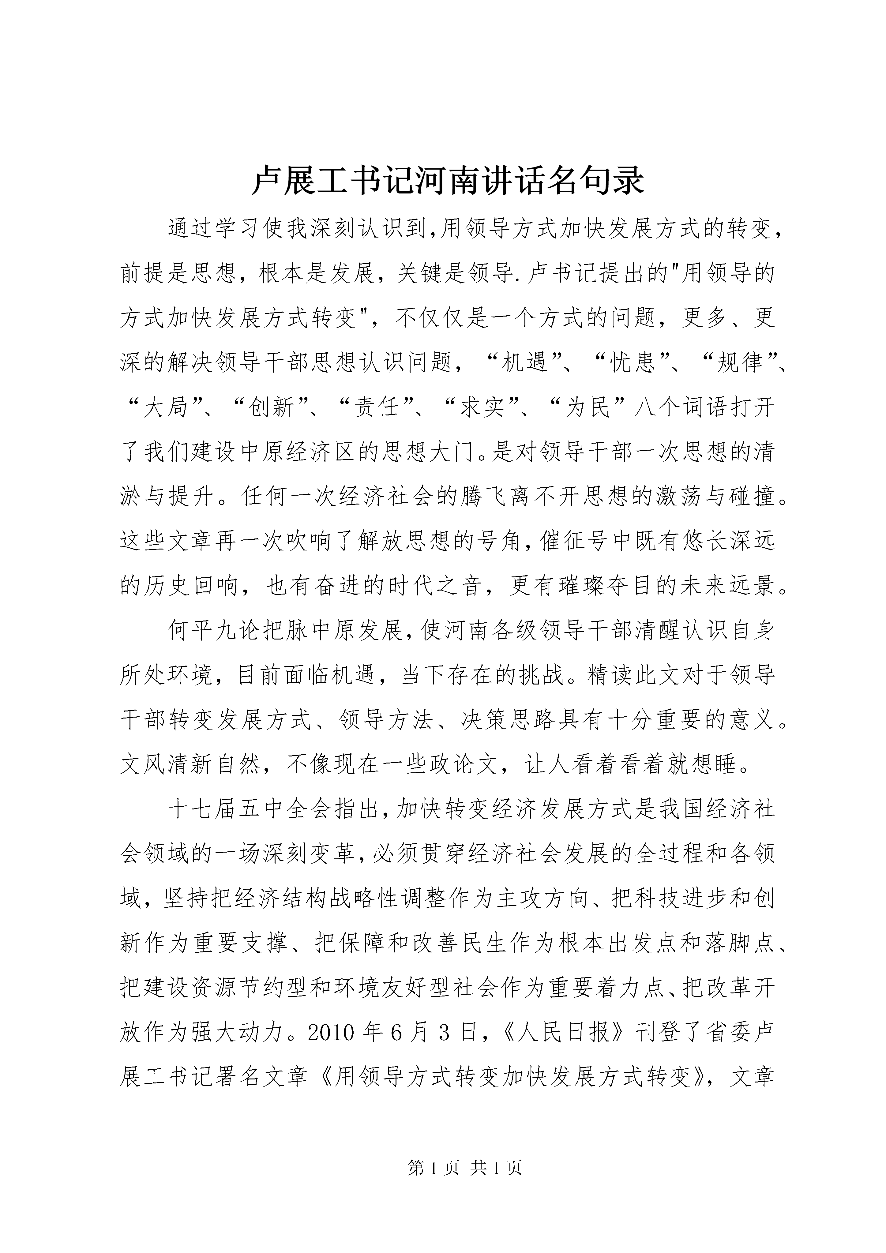 卢展工书记河南讲话名句录通过学习使我深刻认识到,用领导方式加快发展方式的转变,前提是思想,根本是发展,关键是领导.卢书记提出的"用领导的方式加快发展方式转变",不仅仅是一个方式的问题,更多、更深的解决领导干部思想认识问题,“机遇”、“忧患”、“规律”、“大局”、“创新”、“责任”、“求实”、“为民”八个词语打开了我们建设中原经济区的思想大门。是对领导干部一次思想的清淤与提升。任何一次经济社会的腾飞离不开思想的激荡与碰撞。这些文章再一次吹响了解放思想的号角,催征号中既有悠长深远的历史回响,也有奋进的时代之音,更有璀璨夺目的未来远景。何平九论把脉中原发展,使河南各级领导干部清醒认识自身所处环境,目前面临机遇,当下存在的挑战。精读此文对于领导干部转变发展方式、领导方法、决策思路具有十分重要的意义。文风清新自然,不像现在一些政论文,让人看着看着就想睡。十七届五中全会指出,加快转变经济发展方式是我国经济社会领域的一场深刻变革,必须贯穿经济社会发展的全过程和各领域,坚持把经济结构战略性调整作为主攻方向、把科技进步和创新作为重要支撑、把保障和改善民生作为根本出发点和落脚点、把建设资源节约型和环境友好型社会作为重要着力点、把改革开放作为强大动力。2010年6月3日,《人民日报》刊登了省委卢展工书记署名文章《用领导方式转变加快发展方式转变》,文章提出“加快发展方式转变,首先要从党委、政府和领导干部转变开始,思考自己怎么转、怎么做”的问题,强调了“发展目的必须明确,头脑清醒至关重要,正确思路应当持续,方式方法亟待改进”。文章立意深刻,思想深远,抓住了加快发展方式的关键性和根本性问题,具有很强针对性和指导性。通过一段时间以来研读报纸刊登文章、学习“何平九论”,特别是参加全市“用领导方式转变加快发展方式转变”培训班的学习,我个人认为,作为领导干部只有在思想观念、工作方式方法和工作作风等方面有全方位的转变和提升,才能适应这一历史性的发展,从而担当起领导加快经济社会发展的重任。用领导方式转变加快发展方式转变,首先从解放思想、更新观念做起。一是强化发展意识。发展是解决一切问题的根本所在,离开发展,我们的一切工作都无从谈起。转变领导方式,就是要把思想观念真正转到科学发展上来,牢牢把握发展第一要务。结合分管工作,就是要紧紧抓住当前的事业单位管理改革的机会,组织全县各级事业单位建立健全更能发挥全员积极性的管理制度;就是要围绕提高民生保障水平,探索实践更加有利于广大职工和城镇居民的社会保障体系;就是围绕XX县区的太极拳文化优势,全面推进陈家沟文化旅游区建设,培育三产发展新的增长点;就是围绕集聚区和重点项目建设、企业发展等大局,组织各级各部门创建更加有利于促进发展的服务机制和社会环境,以此来带动全局,在发展中求转变,在转变中谋发展。二是要强化忧患意识。当前面临着困难就业人员多、城镇居民医疗和养老保险覆盖面低、文化旅游区内涵亟待丰富等诸多问题,转变发展方式既是大势所趋,更是自身发展的迫切需要。要切实树立起“等不起”的紧迫感、“慢不得”的危机感、“坐不住”的责任感,强化忧患意识,转变思想观念,增强加快发展的动力。三是要强化攻坚意识。转变发展方式,必然会经历一段“阵痛期”,也难免会付出一些必要的代价。必须充分认识到转变的长期性、艰巨性和复杂性。既要坚定信心、迎难而上,有敢于挥刀割病灶的勇气;又要有打一场攻坚战的准备,做到量力而行、循序渐进,切不可急于求成、急功近利。加快经济发展方式转变,对领导干部的能力素质、工作水平提出了更高的要求,必须在新的历史起点上持续提高领导干部能力素质。一要勤于学习。当今时代飞速发展,经济社会日新月异,学习已经成为各级干部履职尽责的迫切需要。实现领导方式转变、加快发展方式转变,更要从学习入手。端正态度,自觉把学习当作一种追求、一种责任、一种习惯,时刻增强“学如逆水行舟,不进则退”的紧迫感,真正把学习当作政治责任和终身任务。要学好理论,打牢理论功底,始终做到以科学发展观统领各项工作;要钻研业务,提升服务方式、增强领导能力;要拓宽知识面,不断补充新的科技、经济、文化、专业知识等;要注重实践,将学到的理论知识积极运用到工作实践中,变成领导方式转变的具体措施,变成加快发展方式转变的实际行动。二要善于思考。能否善于思考决定着领导干部的能力和水平。在转变领导方式中,要深入思考,认真研究经济趋势、市场规律、社会热点、思想潮流,进行“去粗取精、去伪存真、由此及彼、由表及里”的综合加工,不仅善于发现新特点、新问题,而且能遵循客观规律和思维规律,拿出解决问题的新办法、新举措,真正通过学习思考,使自己成为爱学习、善思考、会工作的新型干部。转变工作作风是加快转变的保障。我们做任何工作都要靠过硬的干部作风来推动落实。一要高度负责。领导干部在其位要