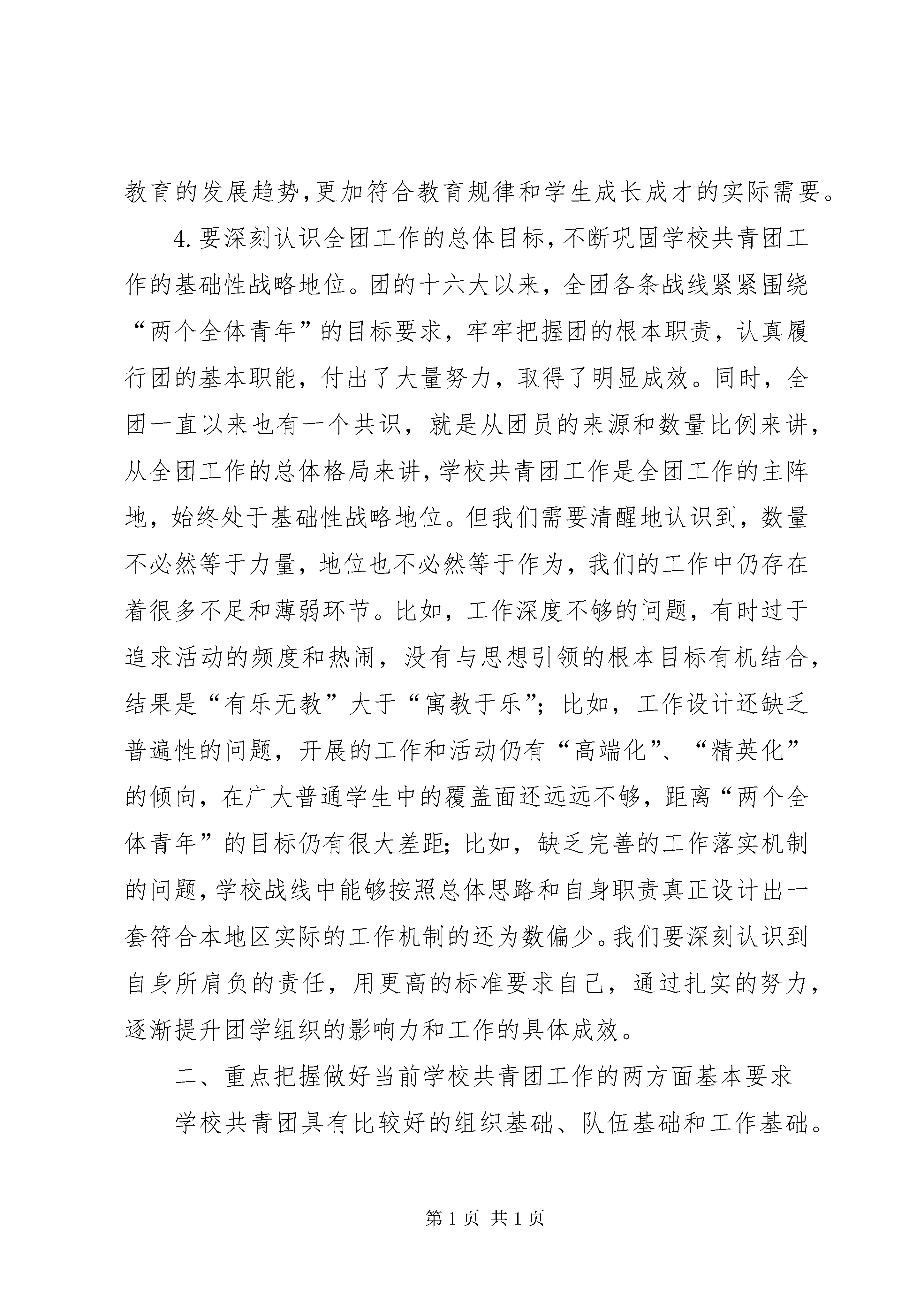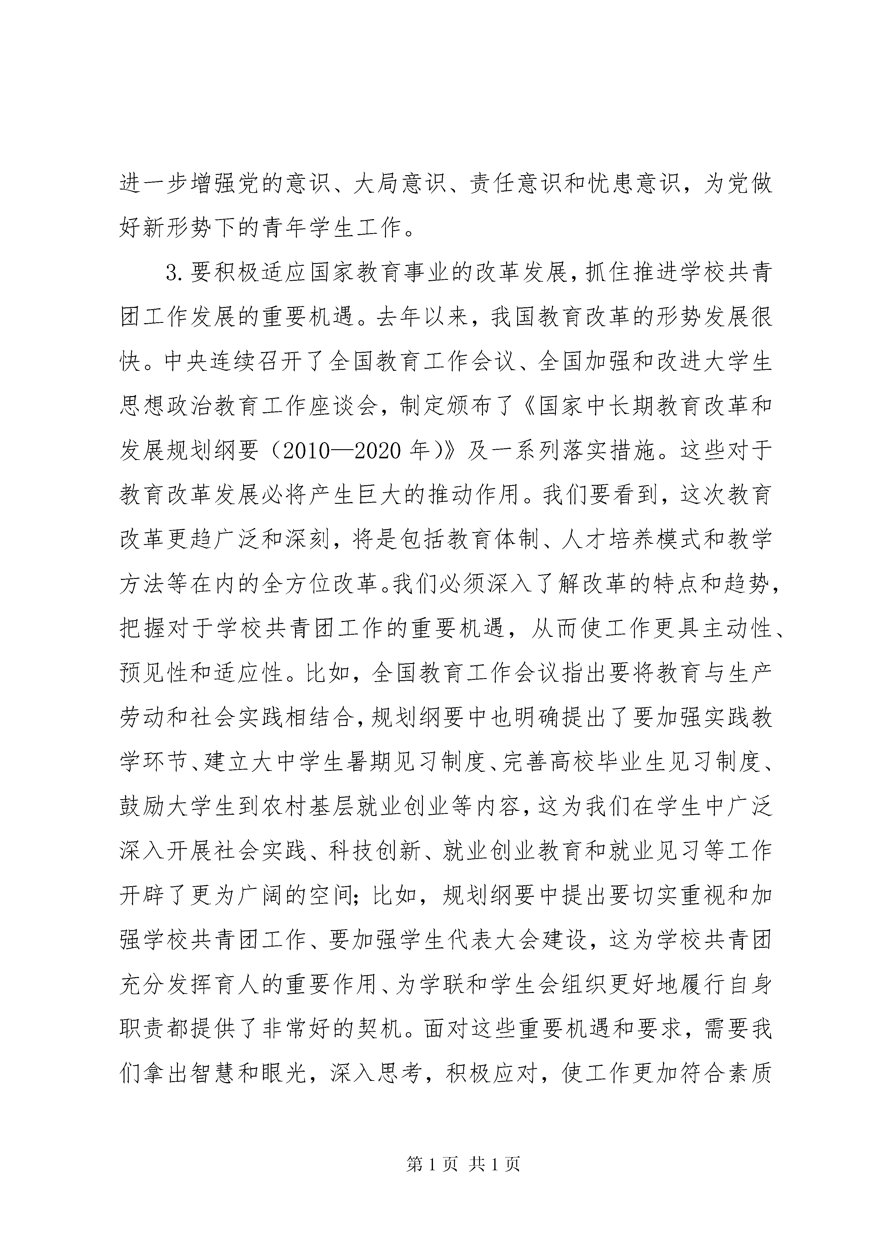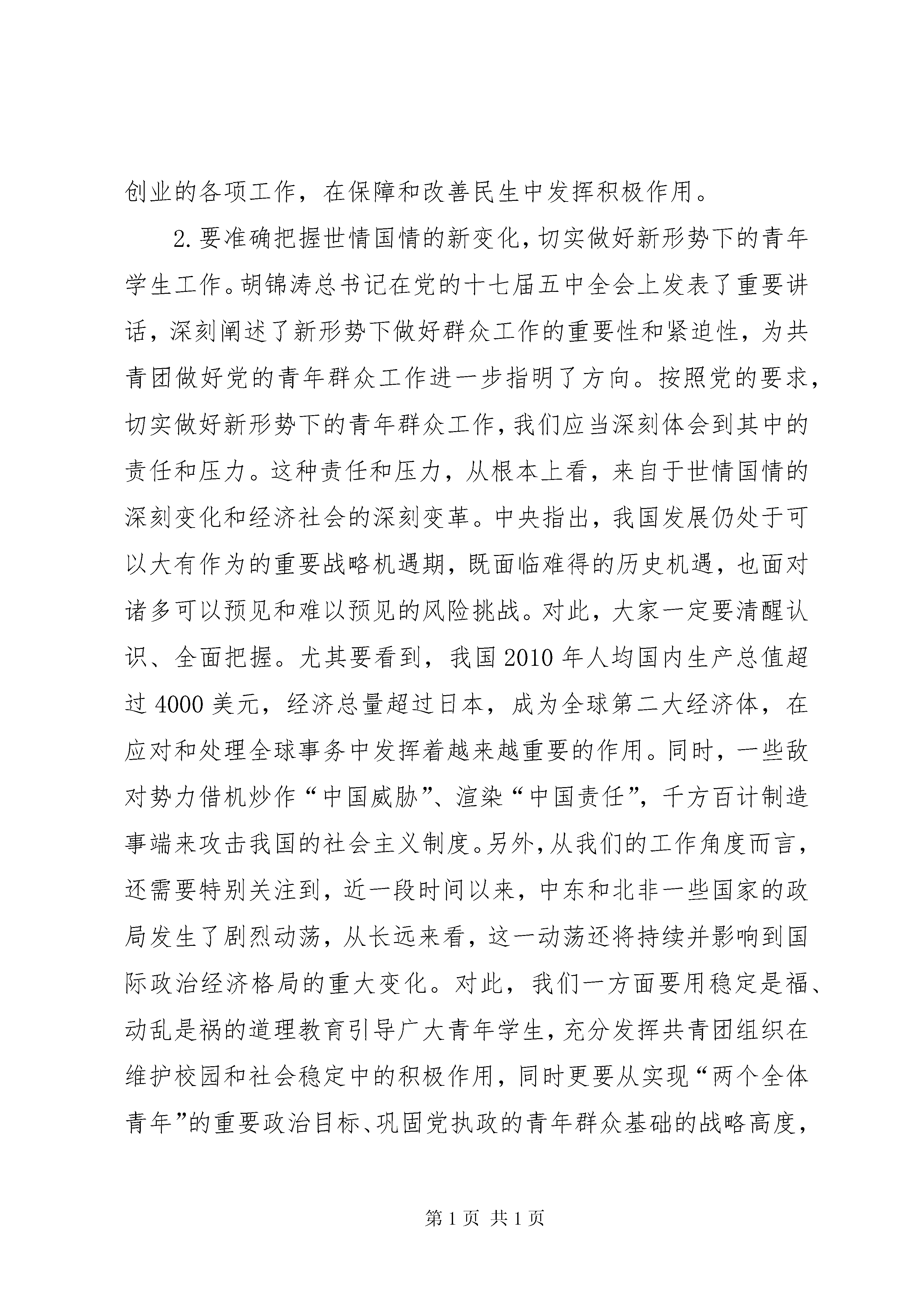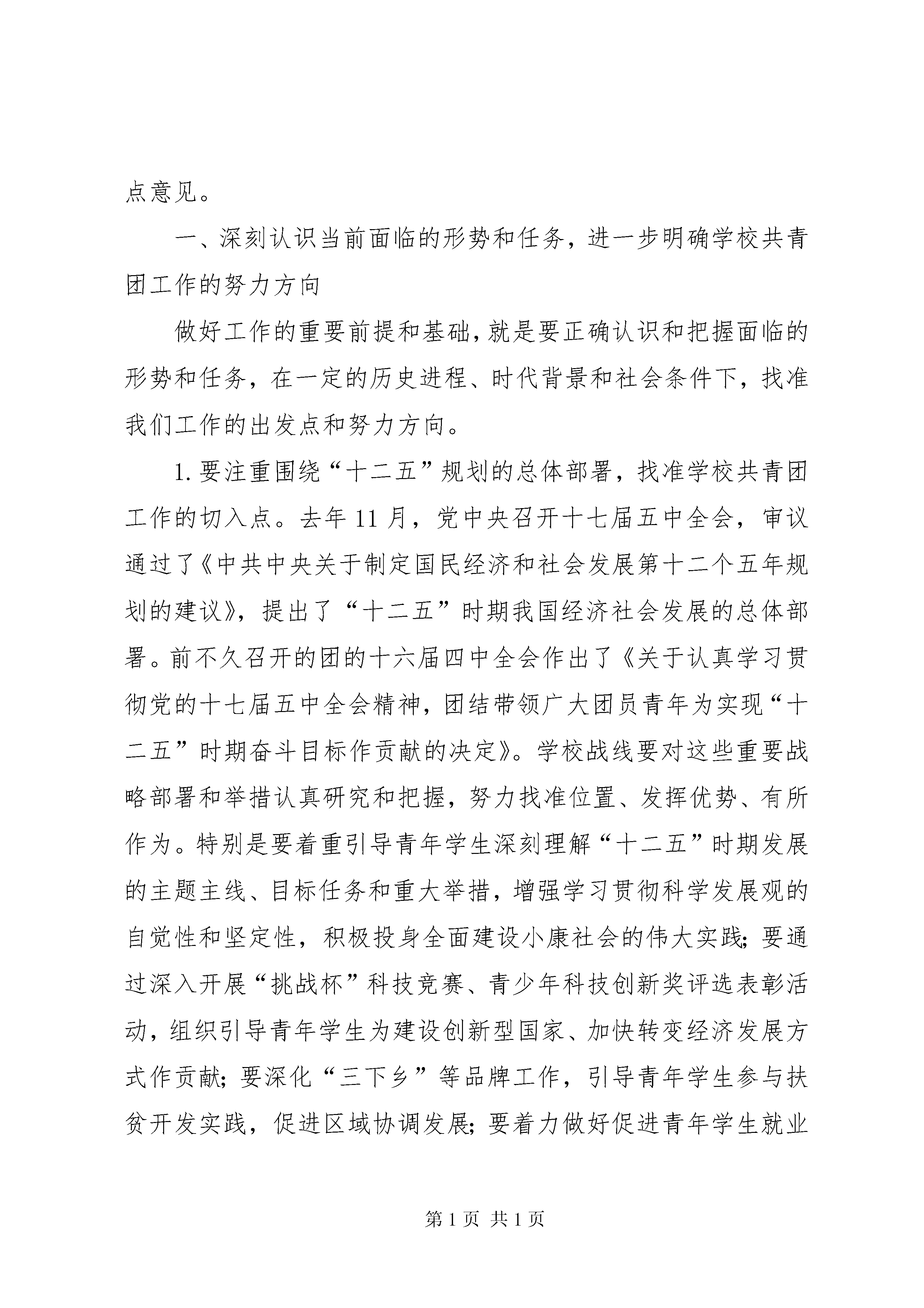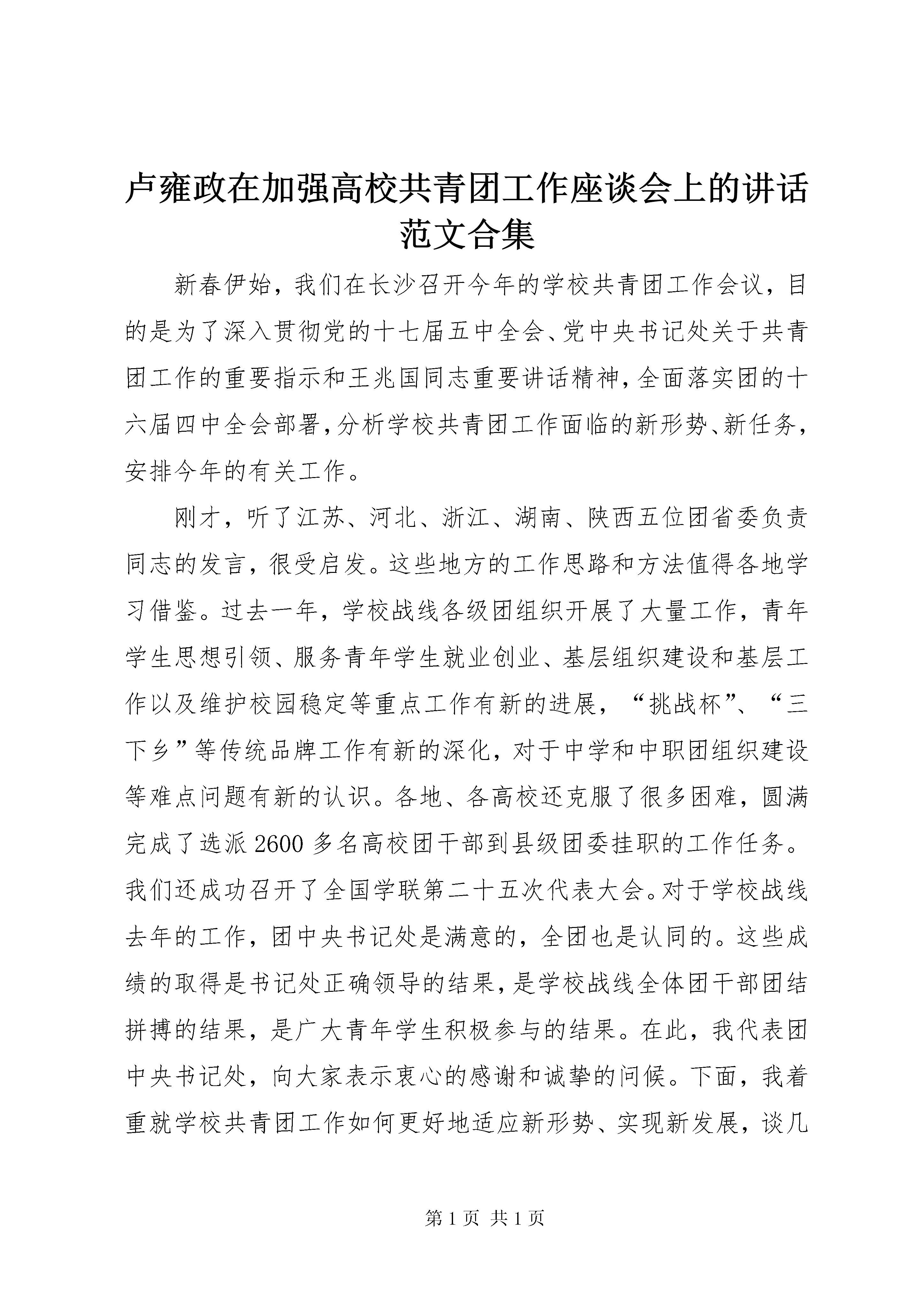 卢雍政在加强高校共青团工作座谈会上的讲话范文合集新春伊始,我们在长沙召开今年的学校共青团工作会议,目的是为了深入贯彻党的十七届五中全会、党中央书记处关于共青团工作的重要指示和王兆国同志重要讲话精神,全面落实团的十六届四中全会部署,分析学校共青团工作面临的新形势、新任务,安排今年的有关工作。刚才,听了江苏、河北、浙江、湖南、陕西五位团省委负责同志的发言,很受启发。这些地方的工作思路和方法值得各地学习借鉴。过去一年,学校战线各级团组织开展了大量工作,青年学生思想引领、服务青年学生就业创业、基层组织建设和基层工作以及维护校园稳定等重点工作有新的进展,“挑战杯”、“三下乡”等传统品牌工作有新的深化,对于中学和中职团组织建设等难点问题有新的认识。各地、各高校还克服了很多困难,圆满完成了选派2600多名高校团干部到县级团委挂职的工作任务。我们还成功召开了全国学联第二十五次代表大会。对于学校战线去年的工作,团中央书记处是满意的,全团也是认同的。这些成绩的取得是书记处正确领导的结果,是学校战线全体团干部团结拼搏的结果,是广大青年学生积极参与的结果。在此,我代表团中央书记处,向大家表示衷心的感谢和诚挚的问候。下面,我着重就学校共青团工作如何更好地适应新形势、实现新发展,谈几点意见。一、深刻认识当前面临的形势和任务,进一步明确学校共青团工作的努力方向做好工作的重要前提和基础,就是要正确认识和把握面临的形势和任务,在一定的历史进程、时代背景和社会条件下,找准我们工作的出发点和努力方向。1.要注重围绕“十二五”规划的总体部署,找准学校共青团工作的切入点。去年11月,党中央召开十七届五中全会,审议通过了《中共中央关于制定国民经济和社会发展第十二个五年规划的建议》,提出了“十二五”时期我国经济社会发展的总体部署。前不久召开的团的十六届四中全会作出了《关于认真学习贯彻党的十七届五中全会精神,团结带领广大团员青年为实现“十二五”时期奋斗目标作贡献的决定》。学校战线要对这些重要战略部署和举措认真研究和把握,努力找准位置、发挥优势、有所作为。特别是要着重引导青年学生深刻理解“十二五”时期发展的主题主线、目标任务和重大举措,增强学习贯彻科学发展观的自觉性和坚定性,积极投身全面建设小康社会的伟大实践;要通过深入开展“挑战杯”科技竞赛、青少年科技创新奖评选表彰活动,组织引导青年学生为建设创新型国家、加快转变经济发展方式作贡献;要深化“三下乡”等品牌工作,引导青年学生参与扶贫开发实践,促进区域协调发展;要着力做好促进青年学生就业创业的各项工作,在保障和改善民生中发挥积极作用。2.要准确把握世情国情的新变化,切实做好新形势下的青年学生工作。胡锦涛总书记在党的十七届五中全会上发表了重要讲话,深刻阐述了新形势下做好群众工作的重要性和紧迫性,为共青团做好党的青年群众工作进一步指明了方向。按照党的要求,切实做好新形势下的青年群众工作,我们应当深刻体会到其中的责任和压力。这种责任和压力,从根本上看,来自于世情国情的深刻变化和经济社会的深刻变革。中央指出,我国发展仍处于可以大有作为的重要战略机遇期,既面临难得的历史机遇,也面对诸多可以预见和难以预见的风险挑战。对此,大家一定要清醒认识、全面把握。尤其要看到,我国2010年人均国内生产总值超过4000美元,经济总量超过日本,成为全球第二大经济体,在应对和处理全球事务中发挥着越来越重要的作用。同时,一些敌对势力借机炒作“中国威胁”、渲染“中国责任”,千方百计制造事端来攻击我国的社会主义制度。另外,从我们的工作角度而言,还需要特别关注到,近一段时间以来,中东和北非一些国家的政局发生了剧烈动荡,从长远来看,这一动荡还将持续并影响到国际政治经济格局的重大变化。对此,我们一方面要用稳定是福、动乱是祸的道理教育引导广大青年学生,充分发挥共青团组织在维护校园和社会稳定中的积极作用,同时更要从实现“两个全体青年”的重要政治目标、巩固党执政的青年群众基础的战略高度,进一步增强党的意识、大局意识、责任意识和忧患意识,为党做好新形势下的青年学生工作。3.要积极适应国家教育事业的改革发展,抓住推进学校共青团工作发展的重要机遇。去年以来,我国教育改革的形势发展很快。中央连续召开了全国教育工作会议、全国加强和改进大学生思想政治教育工作座谈会,制定颁布了《国家中长期教育改革和发展规划纲要(2010—2020年)》及一系列落实措施。这些对于教育改革发展必将产生巨大的推动作用。我们要看到,这次教育改革更趋广泛和深刻,将是包括教育体制、人才培养模式和教学方法等在内的全方位改革。我们必须深入了解改革的特点和趋势,把握对于学校共青团工作的重要机遇,从而使工作更具主动性、预见性和适应性。比如,全国教育工作会议指出要将教育与生产劳动和社会实践相结合,规划