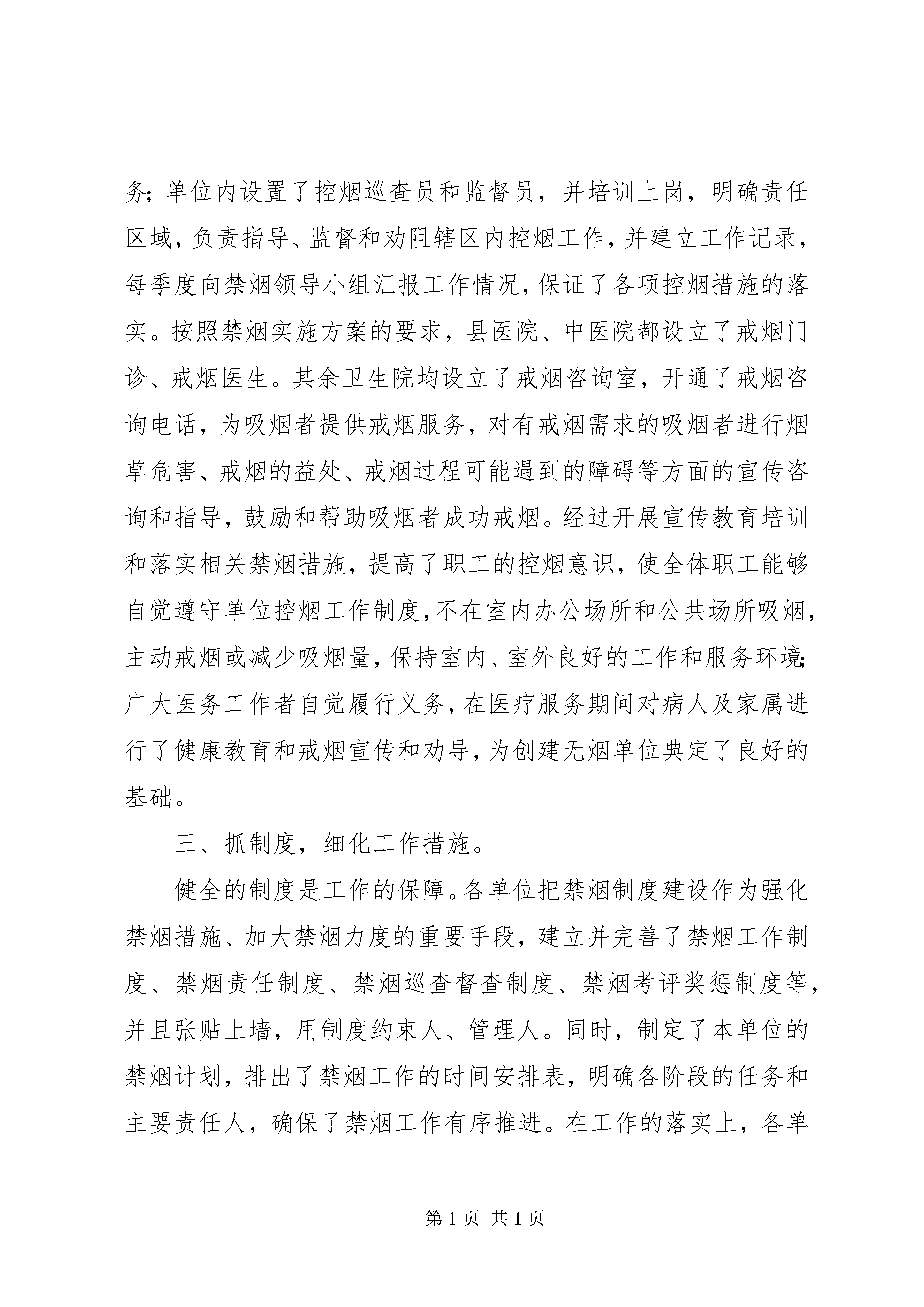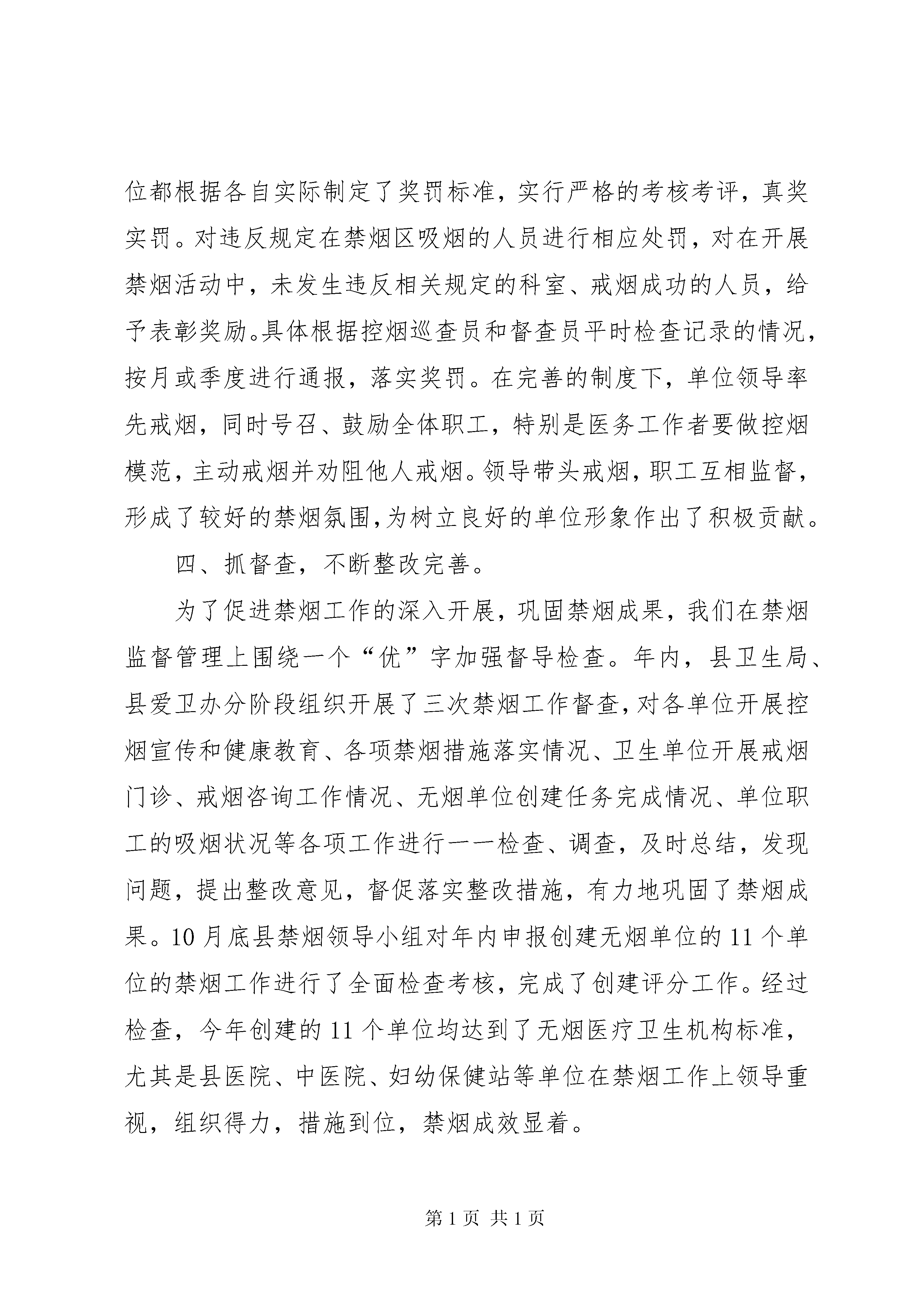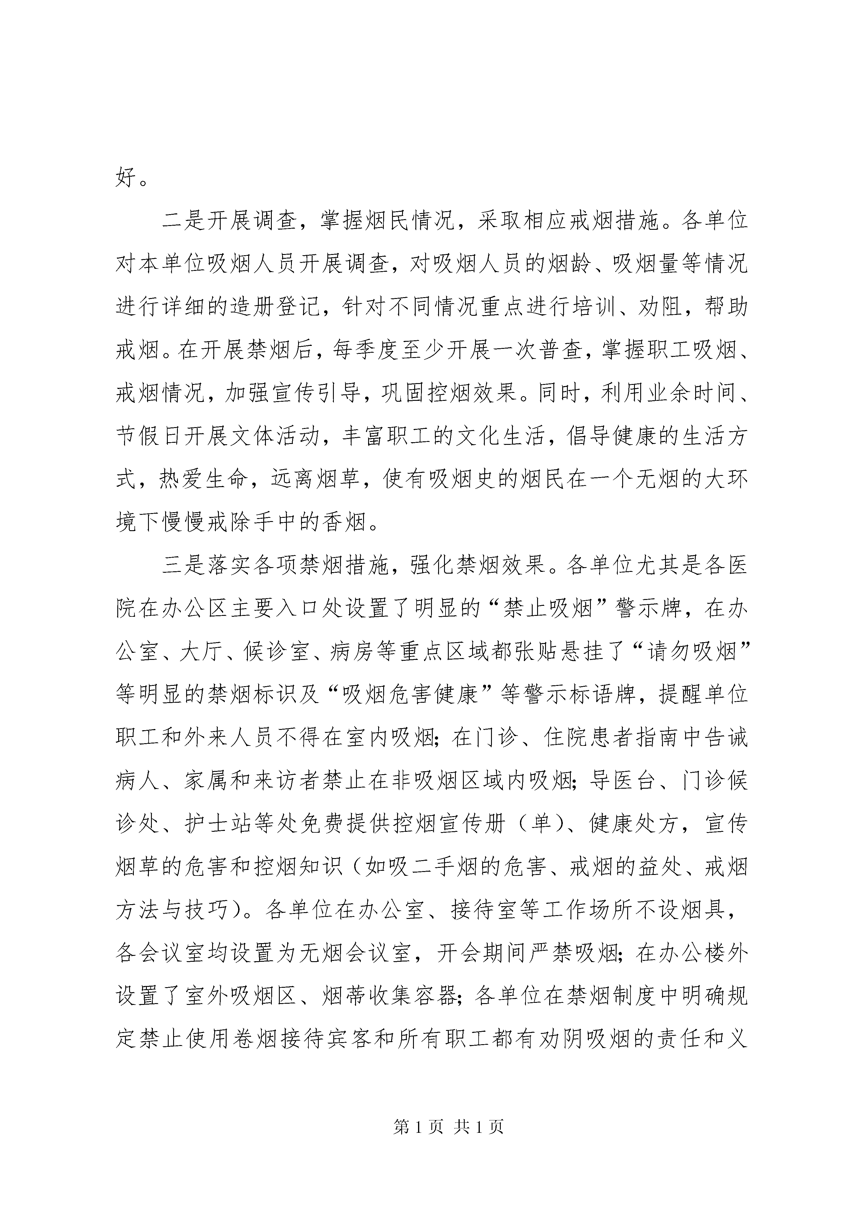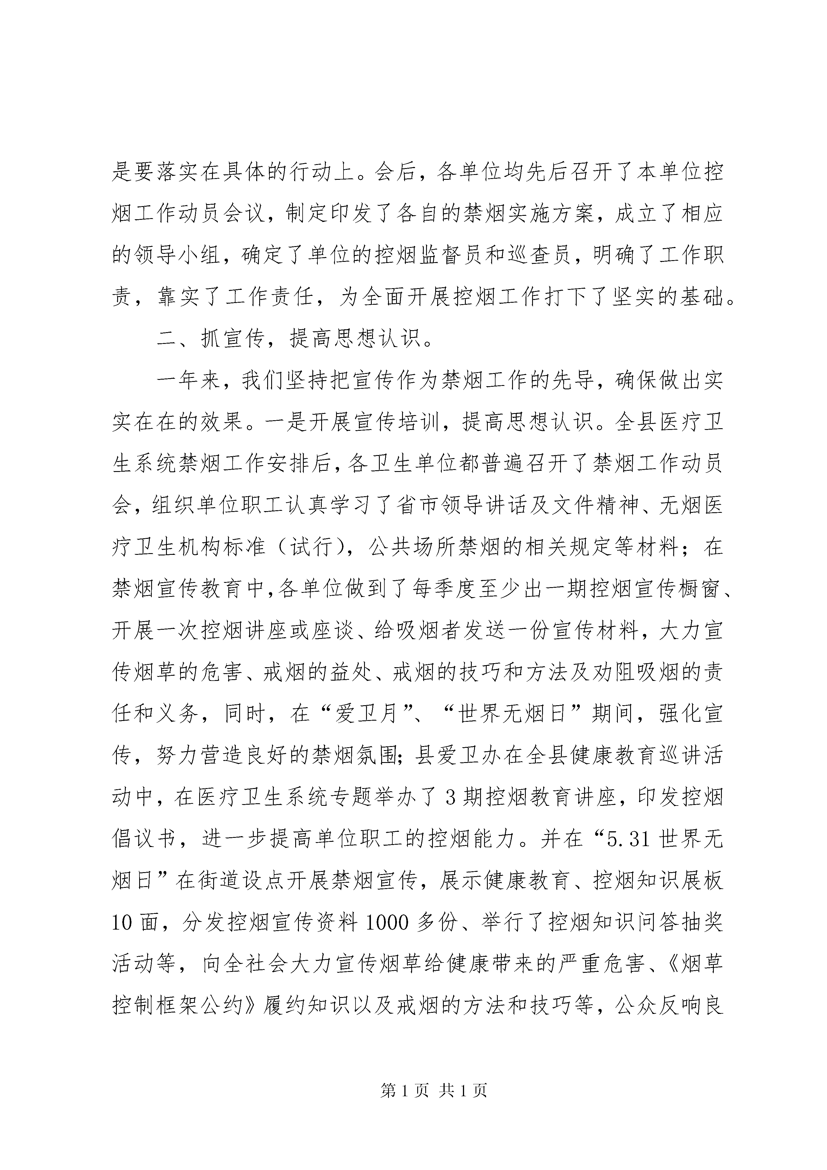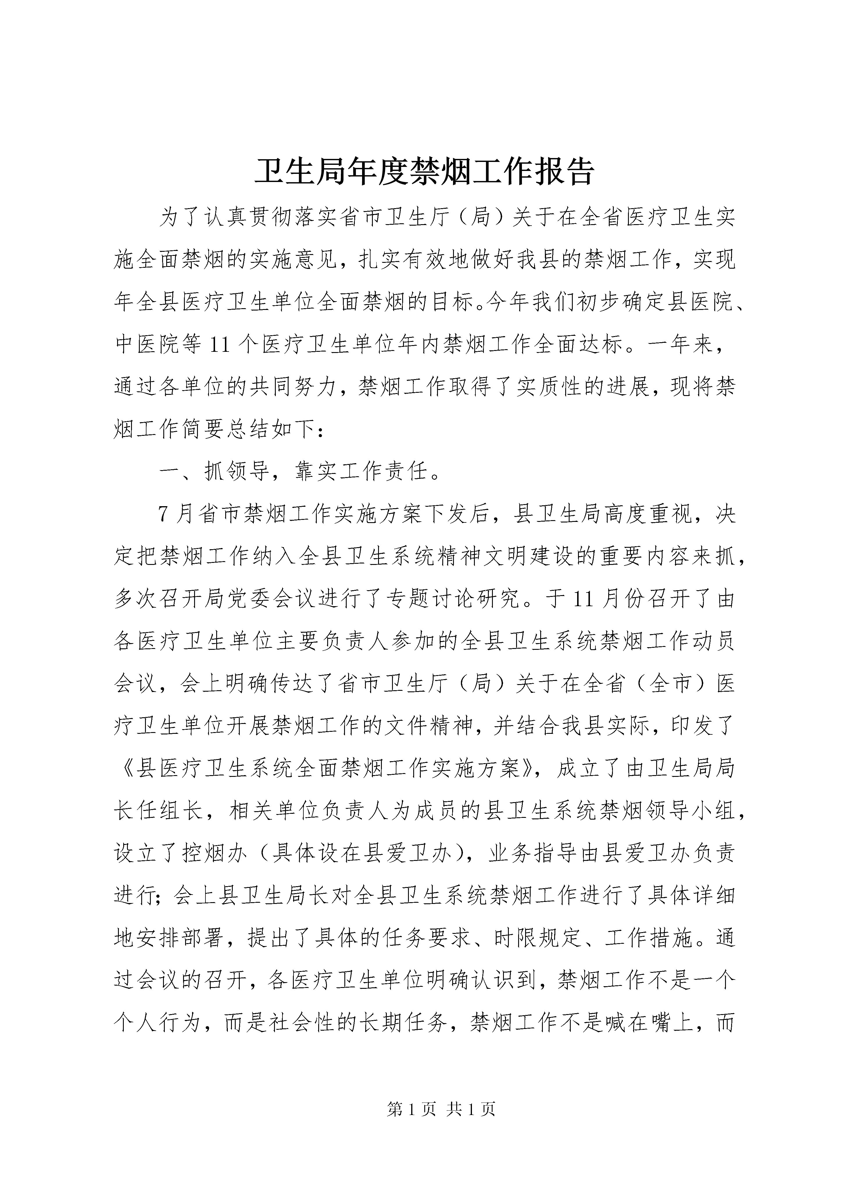 卫生局年度禁烟工作报告为了认真贯彻落实省市卫生厅(局)关于在全省医疗卫生实施全面禁烟的实施意见,扎实有效地做好我县的禁烟工作,实现年全县医疗卫生单位全面禁烟的目标。今年我们初步确定县医院、中医院等11个医疗卫生单位年内禁烟工作全面达标。一年来,通过各单位的共同努力,禁烟工作取得了实质性的进展,现将禁烟工作简要总结如下:一、抓领导,靠实工作责任。7月省市禁烟工作实施方案下发后,县卫生局高度重视,决定把禁烟工作纳入全县卫生系统精神文明建设的重要内容来抓,多次召开局党委会议进行了专题讨论研究。于11月份召开了由各医疗卫生单位主要负责人参加的全县卫生系统禁烟工作动员会议,会上明确传达了省市卫生厅(局)关于在全省(全市)医疗卫生单位开展禁烟工作的文件精神,并结合我县实际,印发了《县医疗卫生系统全面禁烟工作实施方案》,成立了由卫生局局长任组长,相关单位负责人为成员的县卫生系统禁烟领导小组,设立了控烟办(具体设在县爱卫办),业务指导由县爱卫办负责进行;会上县卫生局长对全县卫生系统禁烟工作进行了具体详细地安排部署,提出了具体的任务要求、时限规定、工作措施。通过会议的召开,各医疗卫生单位明确认识到,禁烟工作不是一个个人行为,而是社会性的长期任务,禁烟工作不是喊在嘴上,而是要落实在具体的行动上。会后,各单位均先后召开了本单位控烟工作动员会议,制定印发了各自的禁烟实施方案,成立了相应的领导小组,确定了单位的控烟监督员和巡查员,明确了工作职责,靠实了工作责任,为全面开展控烟工作打下了坚实的基础。二、抓宣传,提高思想认识。一年来,我们坚持把宣传作为禁烟工作的先导,确保做出实实在在的效果。一是开展宣传培训,提高思想认识。全县医疗卫生系统禁烟工作安排后,各卫生单位都普遍召开了禁烟工作动员会,组织单位职工认真学习了省市领导讲话及文件精神、无烟医疗卫生机构标准(试行),公共场所禁烟的相关规定等材料;在禁烟宣传教育中,各单位做到了每季度至少出一期控烟宣传橱窗、开展一次控烟讲座或座谈、给吸烟者发送一份宣传材料,大力宣传烟草的危害、戒烟的益处、戒烟的技巧和方法及劝阻吸烟的责任和义务,同时,在“爱卫月”、“世界无烟日”期间,强化宣传,努力营造良好的禁烟氛围;县爱卫办在全县健康教育巡讲活动中,在医疗卫生系统专题举办了3期控烟教育讲座,印发控烟倡议书,进一步提高单位职工的控烟能力。并在“5.31世界无烟日”在街道设点开展禁烟宣传,展示健康教育、控烟知识展板10面,分发控烟宣传资料1000多份、举行了控烟知识问答抽奖活动等,向全社会大力宣传烟草给健康带来的严重危害、《烟草控制框架公约》履约知识以及戒烟的方法和技巧等,公众反响良好。二是开展调查,掌握烟民情况,采取相应戒烟措施。各单位对本单位吸烟人员开展调查,对吸烟人员的烟龄、吸烟量等情况进行详细的造册登记,针对不同情况重点进行培训、劝阻,帮助戒烟。在开展禁烟后,每季度至少开展一次普查,掌握职工吸烟、戒烟情况,加强宣传引导,巩固控烟效果。同时,利用业余时间、节假日开展文体活动,丰富职工的文化生活,倡导健康的生活方式,热爱生命,远离烟草,使有吸烟史的烟民在一个无烟的大环境下慢慢戒除手中的香烟。三是落实各项禁烟措施,强化禁烟效果。各单位尤其是各医院在办公区主要入口处设置了明显的“禁止吸烟”警示牌,在办公室、大厅、候诊室、病房等重点区域都张贴悬挂了“请勿吸烟”等明显的禁烟标识及“吸烟危害健康”等警示标语牌,提醒单位职工和外来人员不得在室内吸烟;在门诊、住院患者指南中告诫病人、家属和来访者禁止在非吸烟区域内吸烟;导医台、门诊候诊处、护士站等处免费提供控烟宣传册(单)、健康处方,宣传烟草的危害和控烟知识(如吸二手烟的危害、戒烟的益处、戒烟方法与技巧)。各单位在办公室、接待室等工作场所不设烟具,各会议室均设置为无烟会议室,开会期间严禁吸烟;在办公楼外设置了室外吸烟区、烟蒂收集容器;各单位在禁烟制度中明确规定禁止使用卷烟接待宾客和所有职工都有劝阴吸烟的责任和义务;单位内设置了控烟巡查员和监督员,并培训上岗,明确责任区域,负责指导、监督和劝阻辖区内控烟工作,并建立工作记录,每季度向禁烟领导小组汇报工作情况,保证了各项控烟措施的落实。按照禁烟实施方案的要求,县医院、中医院都设立了戒烟门诊、戒烟医生。其余卫生院均设立了戒烟咨询室,开通了戒烟咨询电话,为吸烟者提供戒烟服务,对有戒烟需求的吸烟者进行烟草危害、戒烟的益处、戒烟过程可能遇到的障碍等方面的宣传咨询和指导,鼓励和帮助吸烟者成功戒烟。经过开展宣传教育培训和落实相关禁烟措施,提高了职工的控烟意识,使全体职工能够自觉遵守单位控烟工作制度,不在室内办公场所和公共场所吸烟,主动戒烟或减少吸烟量,保持室内、室外良好的工作和服务环境;广大医务工作者自觉履行义务,在医疗服务期间对病