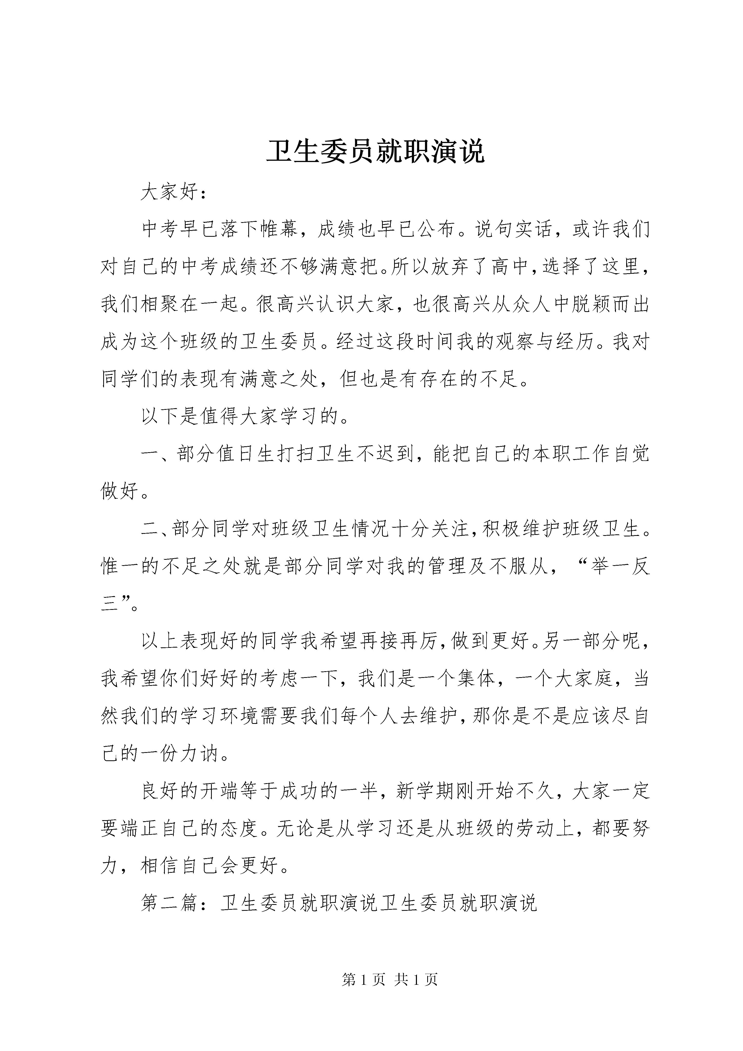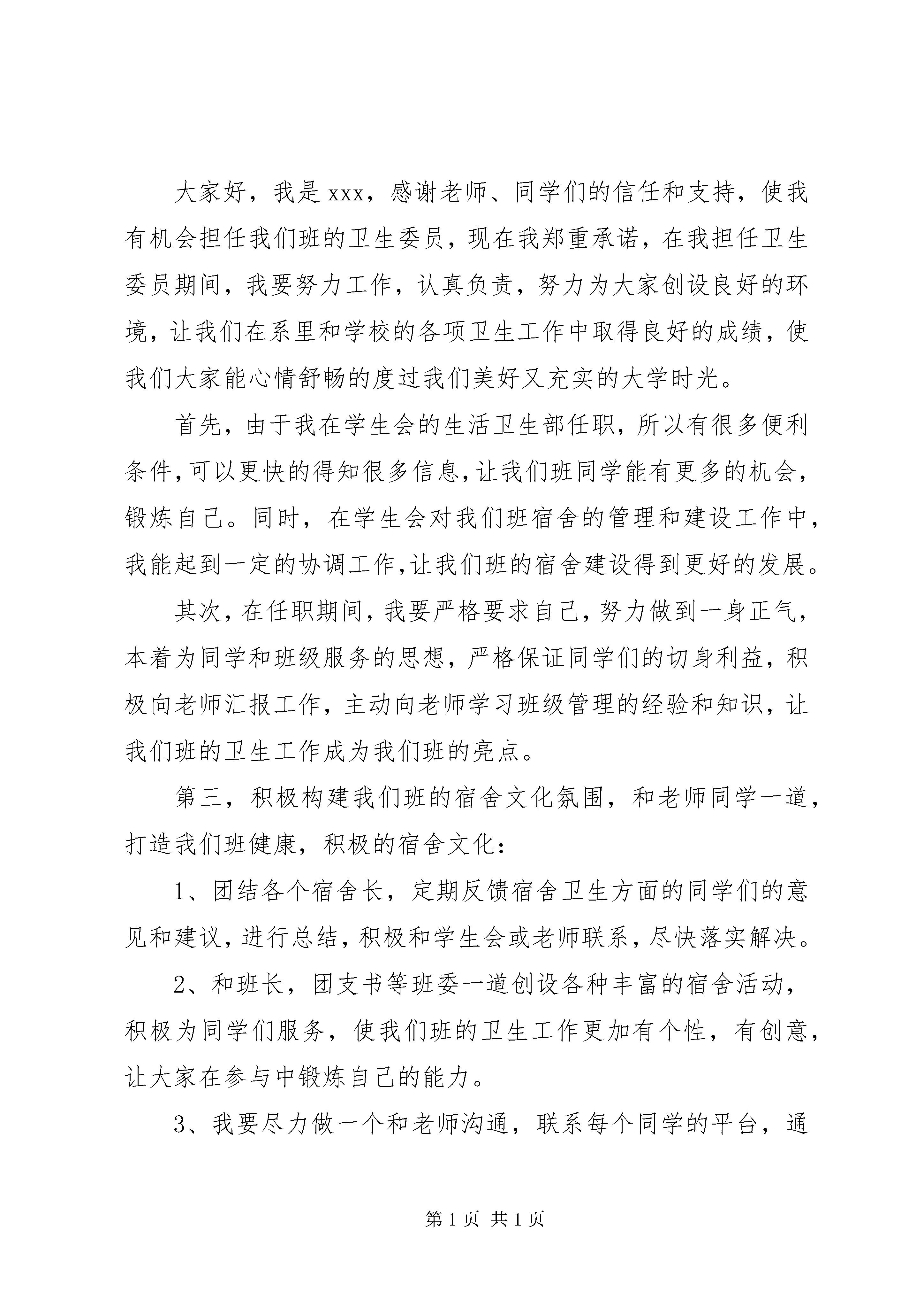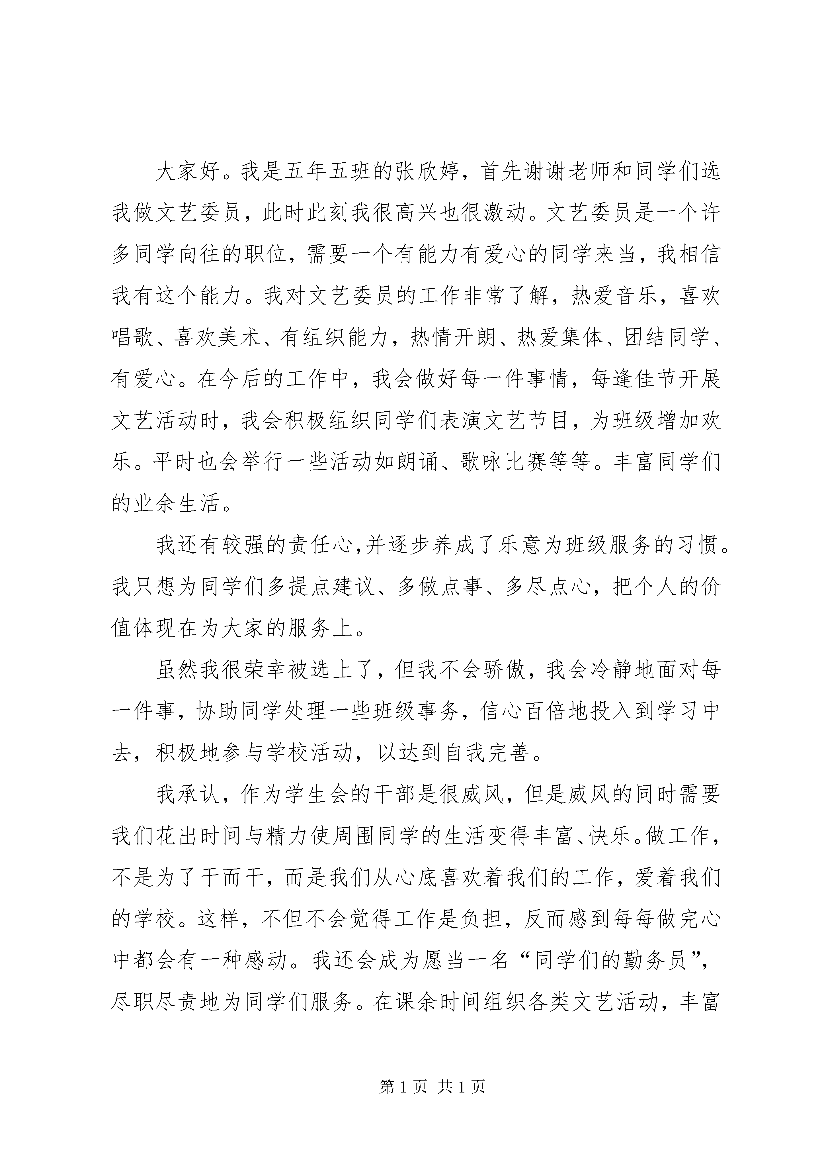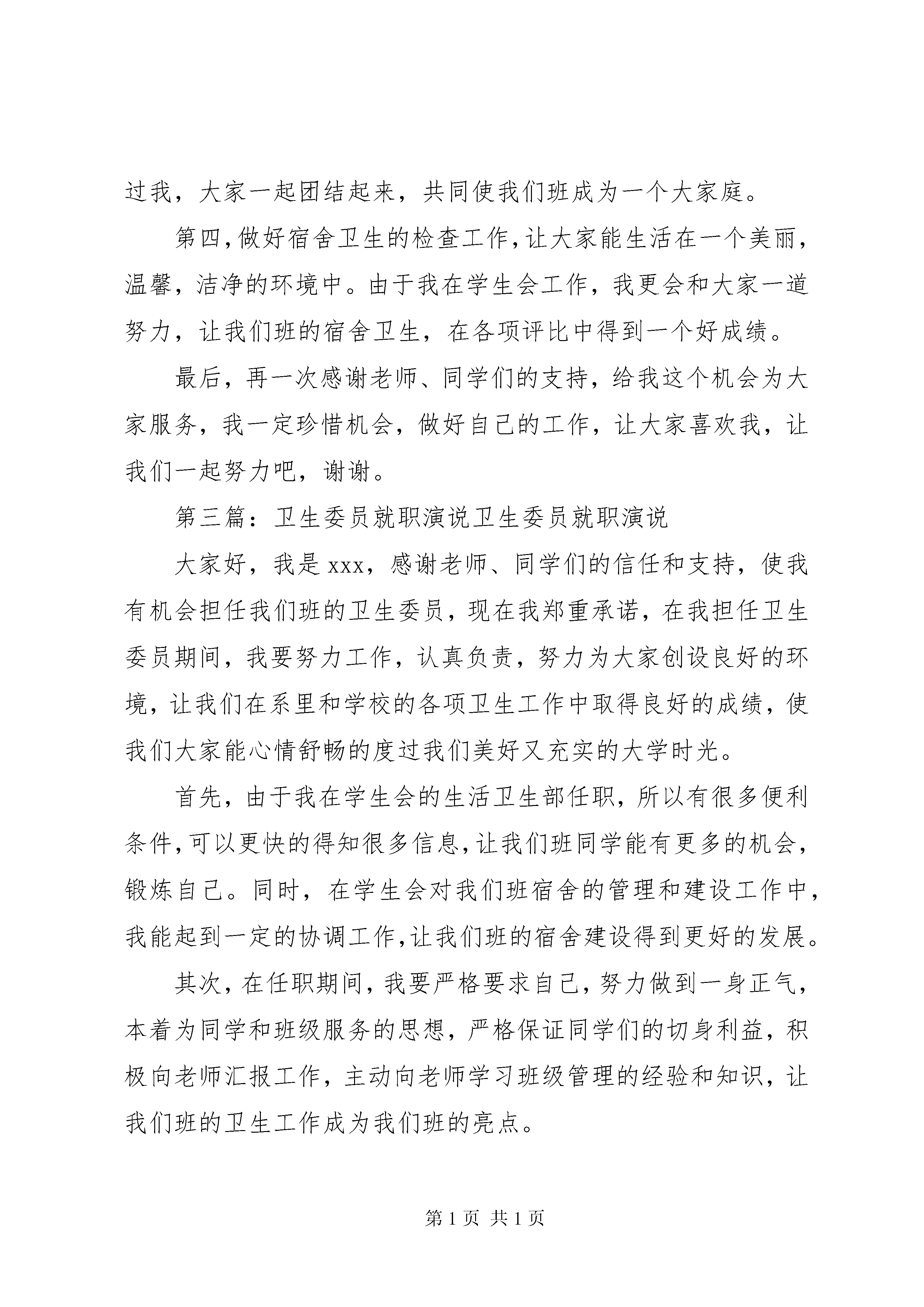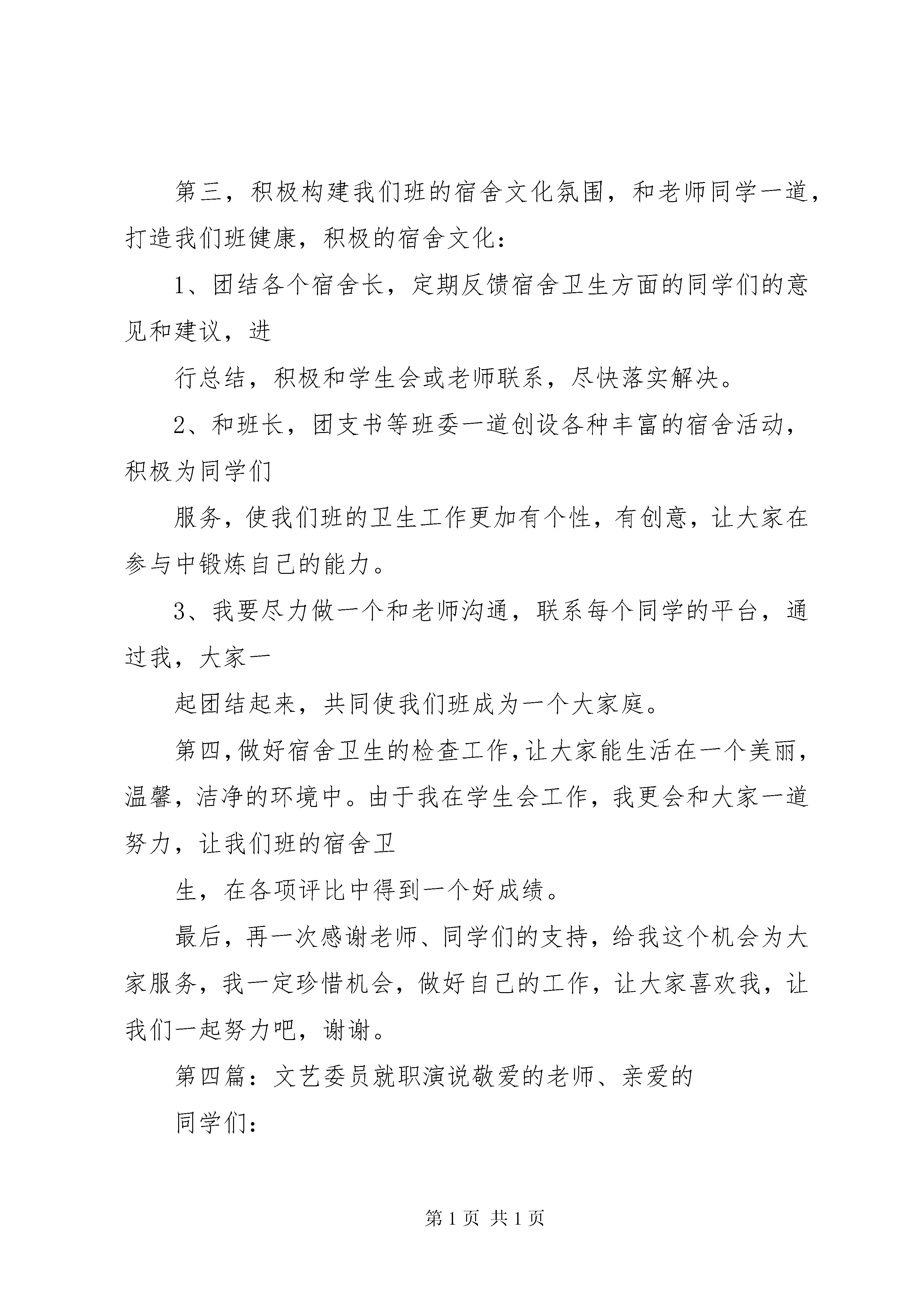 卫生委员就职演说大家好:中考早已落下帷幕,成绩也早已公布。说句实话,或许我们对自己的中考成绩还不够满意把。所以放弃了高中,选择了这里,我们相聚在一起。很高兴认识大家,也很高兴从众人中脱颖而出成为这个班级的卫生委员。经过这段时间我的观察与经历。我对同学们的表现有满意之处,但也是有存在的不足。以下是值得大家学习的。一、部分值日生打扫卫生不迟到,能把自己的本职工作自觉做好。二、部分同学对班级卫生情况十分关注,积极维护班级卫生。惟一的不足之处就是部分同学对我的管理及不服从,“举一反三”。以上表现好的同学我希望再接再厉,做到更好。另一部分呢,我希望你们好好的考虑一下,我们是一个集体,一个大家庭,当然我们的学习环境需要我们每个人去维护,那你是不是应该尽自己的一份力讷。良好的开端等于成功的一半,新学期刚开始不久,大家一定要端正自己的态度。无论是从学习还是从班级的劳动上,都要努力,相信自己会更好。第二篇:卫生委员就职演说卫生委员就职演说大家好,我是xxx,感谢老师、同学们的信任和支持,使我有机会担任我们班的卫生委员,现在我郑重承诺,在我担任卫生委员期间,我要努力工作,认真负责,努力为大家创设良好的环境,让我们在系里和学校的各项卫生工作中取得良好的成绩,使我们大家能心情舒畅的度过我们美好又充实的大学时光。首先,由于我在学生会的生活卫生部任职,所以有很多便利条件,可以更快的得知很多信息,让我们班同学能有更多的机会,锻炼自己。同时,在学生会对我们班宿舍的管理和建设工作中,我能起到一定的协调工作,让我们班的宿舍建设得到更好的发展。其次,在任职期间,我要严格要求自己,努力做到一身正气,本着为同学和班级服务的思想,严格保证同学们的切身利益,积极向老师汇报工作,主动向老师学习班级管理的经验和知识,让我们班的卫生工作成为我们班的亮点。第三,积极构建我们班的宿舍文化氛围,和老师同学一道,打造我们班健康,积极的宿舍文化:1、团结各个宿舍长,定期反馈宿舍卫生方面的同学们的意见和建议,进行总结,积极和学生会或老师联系,尽快落实解决。2、和班长,团支书等班委一道创设各种丰富的宿舍活动,积极为同学们服务,使我们班的卫生工作更加有个性,有创意,让大家在参与中锻炼自己的能力。3、我要尽力做一个和老师沟通,联系每个同学的平台,通过我,大家一起团结起来,共同使我们班成为一个大家庭。第四,做好宿舍卫生的检查工作,让大家能生活在一个美丽,温馨,洁净的环境中。由于我在学生会工作,我更会和大家一道努力,让我们班的宿舍卫生,在各项评比中得到一个好成绩。最后,再一次感谢老师、同学们的支持,给我这个机会为大家服务,我一定珍惜机会,做好自己的工作,让大家喜欢我,让我们一起努力吧,谢谢。第三篇:卫生委员就职演说卫生委员就职演说大家好,我是xxx,感谢老师、同学们的信任和支持,使我有机会担任我们班的卫生委员,现在我郑重承诺,在我担任卫生委员期间,我要努力工作,认真负责,努力为大家创设良好的环境,让我们在系里和学校的各项卫生工作中取得良好的成绩,使我们大家能心情舒畅的度过我们美好又充实的大学时光。首先,由于我在学生会的生活卫生部任职,所以有很多便利条件,可以更快的得知很多信息,让我们班同学能有更多的机会,锻炼自己。同时,在学生会对我们班宿舍的管理和建设工作中,我能起到一定的协调工作,让我们班的宿舍建设得到更好的发展。其次,在任职期间,我要严格要求自己,努力做到一身正气,本着为同学和班级服务的思想,严格保证同学们的切身利益,积极向老师汇报工作,主动向老师学习班级管理的经验和知识,让我们班的卫生工作成为我们班的亮点。第三,积极构建我们班的宿舍文化氛围,和老师同学一道,打造我们班健康,积极的宿舍文化:1、团结各个宿舍长,定期反馈宿舍卫生方面的同学们的意见和建议,进行总结,积极和学生会或老师联系,尽快落实解决。2、和班长,团支书等班委一道创设各种丰富的宿舍活动,积极为同学们服务,使我们班的卫生工作更加有个性,有创意,让大家在参与中锻炼自己的能力。3、我要尽力做一个和老师沟通,联系每个同学的平台,通过我,大家一起团结起来,共同使我们班成为一个大家庭。第四,做好宿舍卫生的检查工作,让大家能生活在一个美丽,温馨,洁净的环境中。由于我在学生会工作,我更会和大家一道努力,让我们班的宿舍卫生,在各项评比中得到一个好成绩。最后,再一次感谢老师、同学们的支持,给我这个机会为大家服务,我一定珍惜机会,做好自己的工作,让大家喜欢我,让我们一起努力吧,谢谢。第四篇:文艺委员就职演说敬爱的老师、亲爱的同学们:大家好。我是五年五班的张欣婷,首先谢谢老师和同学们选我做文艺委员,此时此刻我很高兴也很激动。文艺委员是一个许多同学向往的职位,需要一个有能力有爱心的同学来当,我相信我有这个能力。我对文艺委员的工作非常