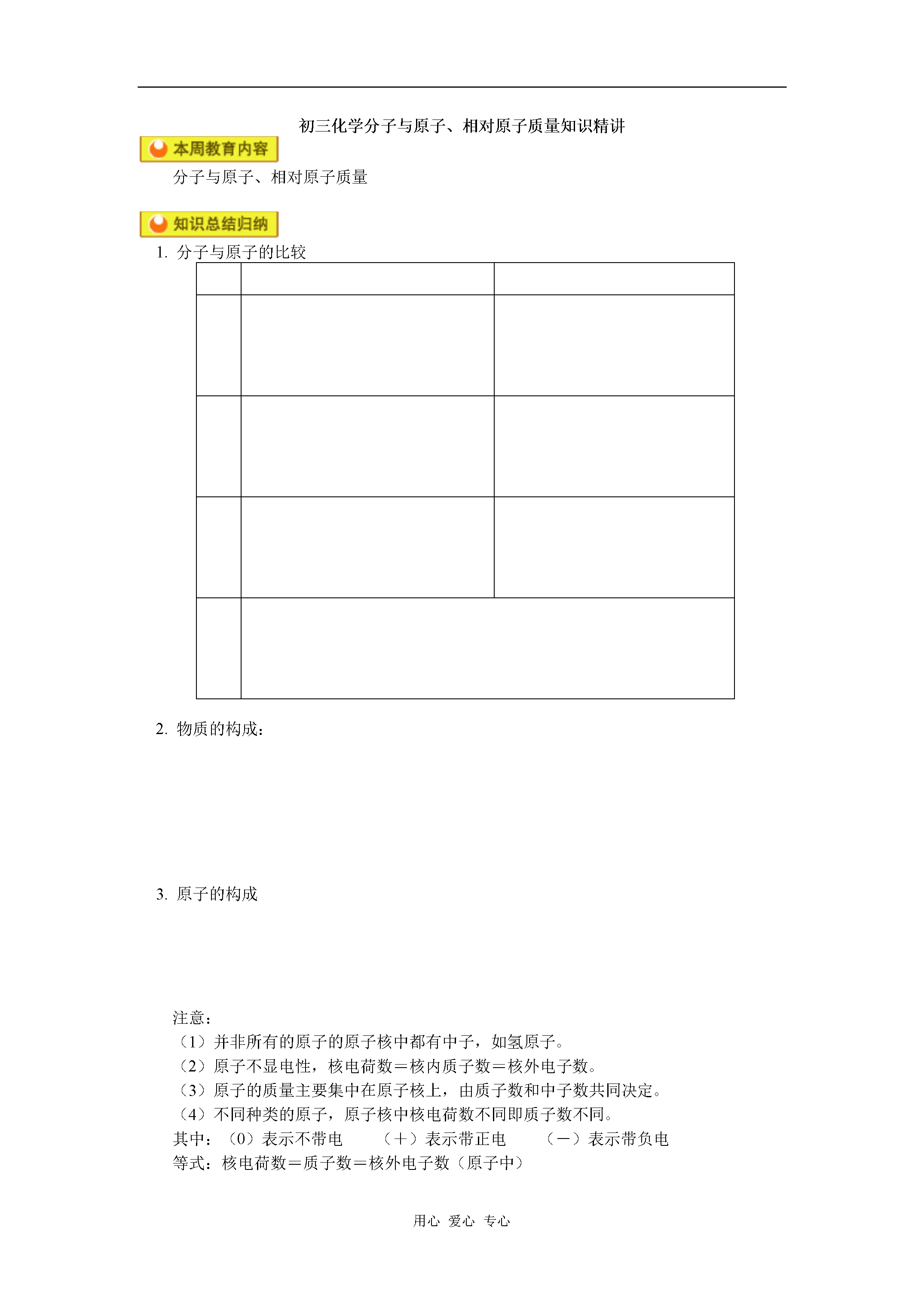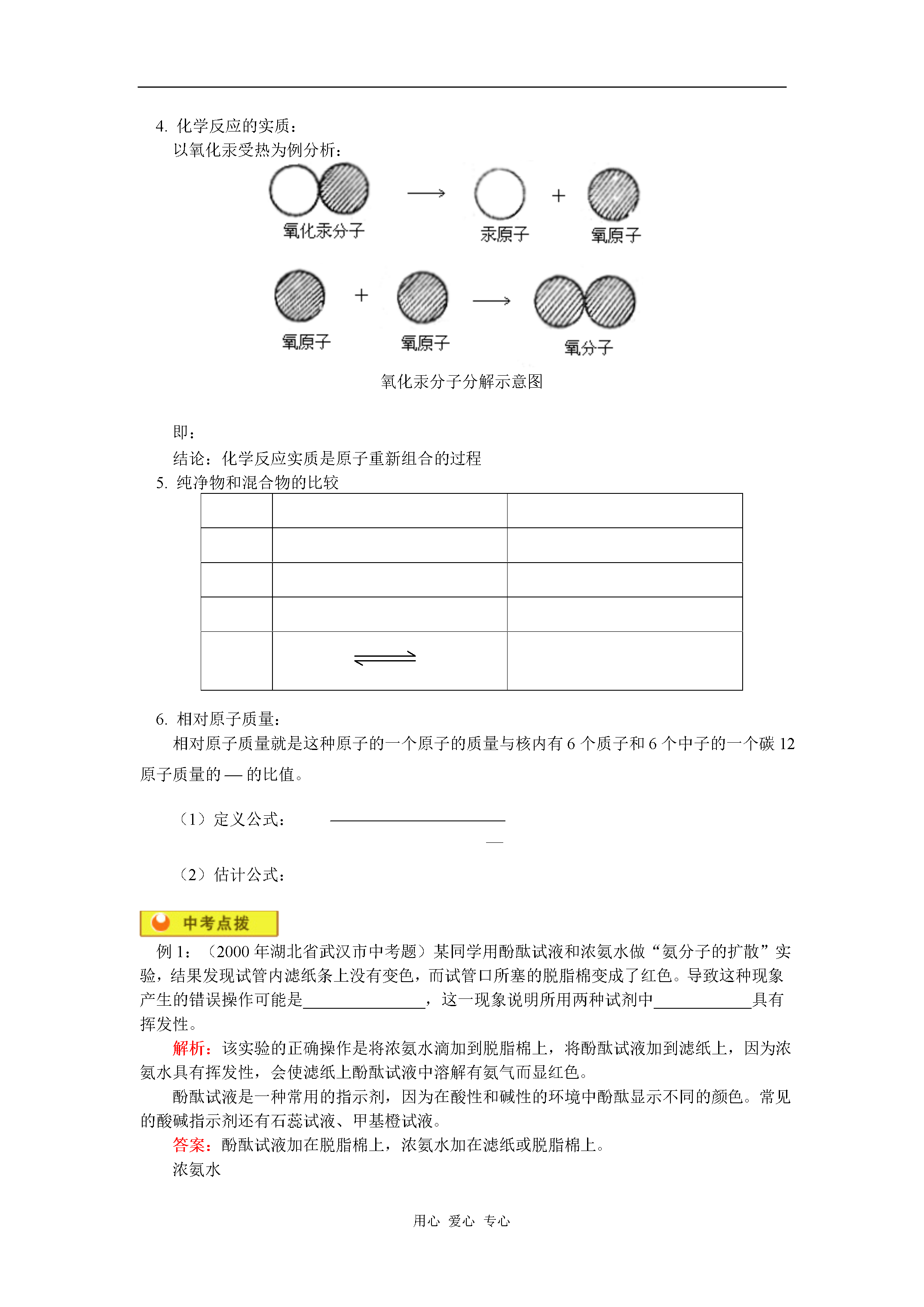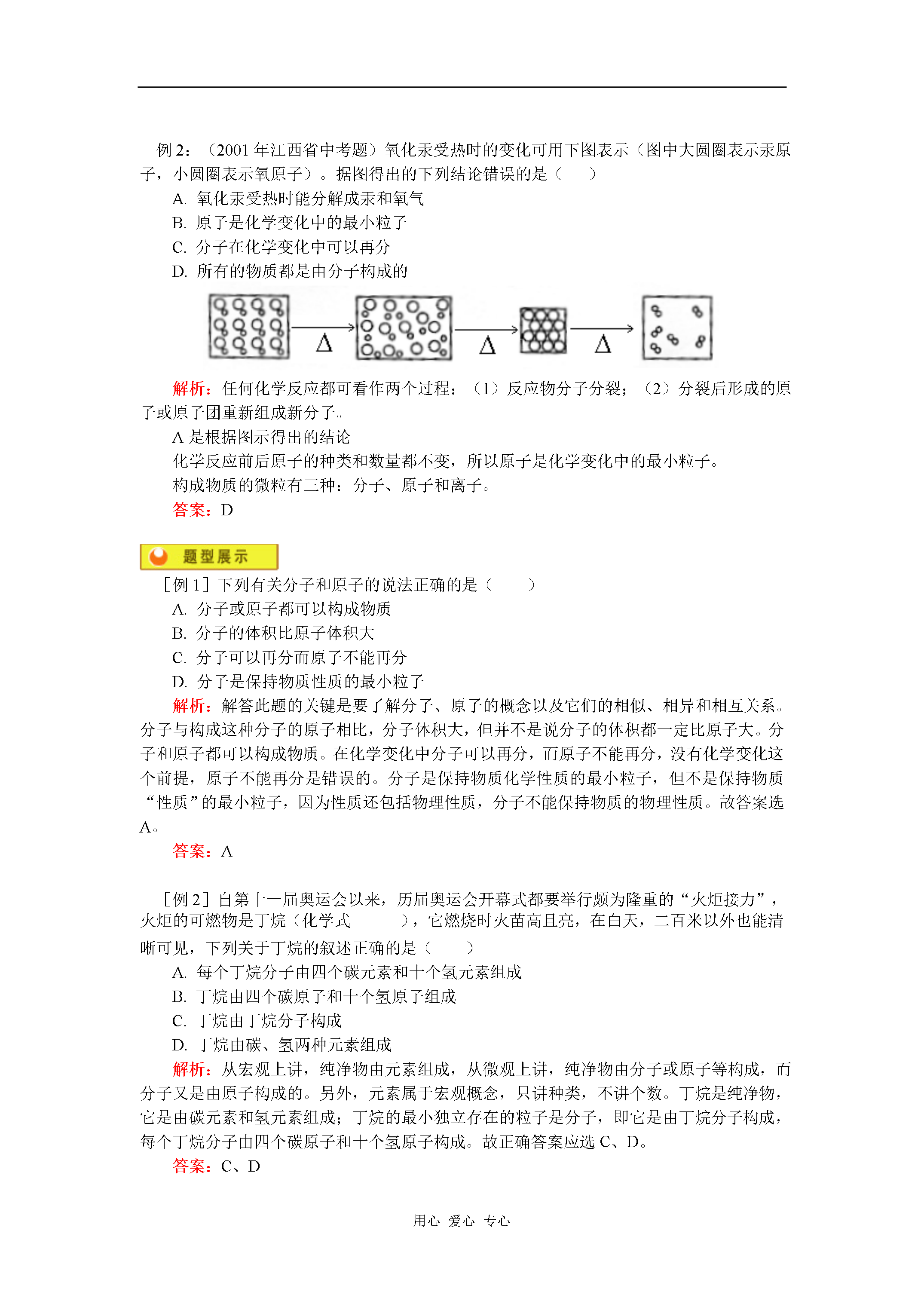 用心爱心专心初三化学分子与原子、相对原子质量知识精讲分子与原子、相对原子质量1.分子与原子的比较2.物质的构成:3.原子的构成注意:(1)并非所有的原子的原子核中都有中子,如氢原子。(2)原子不显电性,核电荷数=核内质子数=核外电子数。(3)原子的质量主要集中在原子核上,由质子数和中子数共同决定。(4)不同种类的原子,原子核中核电荷数不同即质子数不同。其中:(0)表示不带电(+)表示带正电(-)表示带负电等式:核电荷数=质子数=核外电子数(原子中)4.化学反应的实质:以氧化汞受热为例分析:氧化汞分子分解示意图即:结论:化学反应实质是原子重新组合的过程5.纯净物和混合物的比较6.相对原子质量:相对原子质量就是这种原子的一个原子的质量与核内有6个质子和6个中子的一个碳12原子质量的的比值。(1)定义公式:(2)估计公式:例1:(2000年湖北省武汉市中考题)某同学用酚酞试液和浓氨水做“氨分子的扩散”实验,结果发现试管内滤纸条上没有变色,而试管口所塞的脱脂棉变成了红色。导致这种现象产生的错误操作可能是_______________,这一现象说明所用两种试剂中____________具有挥发性。解析:该实验的正确操作是将浓氨水滴加到脱脂棉上,将酚酞试液加到滤纸上,因为浓氨水具有挥发性,会使滤纸上酚酞试液中溶解有氨气而显红色。酚酞试液是一种常用的指示剂,因为在酸性和碱性的环境中酚酞显示不同的颜色。常见的酸碱指示剂还有石蕊试液、甲基橙试液。答案:酚酞试液加在脱脂棉上,浓氨水加在滤纸或脱脂棉上。浓氨水例2:(2001年江西省中考题)氧化汞受热时的变化可用下图表示(图中大圆圈表示汞原子,小圆圈表示氧原子)。据图得出的下列结论错误的是()A.氧化汞受热时能分解成汞和氧气B.原子是化学变化中的最小粒子C.分子在化学变化中可以再分D.所有的物质都是由分子构成的解析:任何化学反应都可看作两个过程:(1)反应物分子分裂;(2)分裂后形成的原子或原子团重新组成新分子。A是根据图示得出的结论化学反应前后原子的种类和数量都不变,所以原子是化学变化中的最小粒子。构成物质的微粒有三种:分子、原子和离子。答案:D[例1]下列有关分子和原子的说法正确的是()A.分子或原子都可以构成物质B.分子的体积比原子体积大C.分子可以再分而原子不能再分D.分子是保持物质性质的最小粒子解析:解答此题的关键是要了解分子、原子的概念以及它们的相似、相异和相互关系。分子与构成这种分子的原子相比,分子体积大,但并不是说分子的体积都一定比原子大。分子和原子都可以构成物质。在化学变化中分子可以再分,而原子不能再分,没有化学变化这个前提,原子不能再分是错误的。分子是保持物质化学性质的最小粒子,但不是保持物质“性质”的最小粒子,因为性质还包括物理性质,分子不能保持物质的物理性质。故答案选A。答案:A[例2]自第十一届奥运会以来,历届奥运会开幕式都要举行颇为隆重的“火炬接力”,火炬的可燃物是丁烷(化学式),它燃烧时火苗高且亮,在白天,二百米以外也能清晰可见,下列关于丁烷的叙述正确的是()A.每个丁烷分子由四个碳元素和十个氢元素组成B.丁烷由四个碳原子和十个氢原子组成C.丁烷由丁烷分子构成D.丁烷由碳、氢两种元素组成解析:从宏观上讲,纯净物由元素组成,从微观上讲,纯净物由分子或原子等构成,而分子又是由原子构成的。另外,元素属于宏观概念,只讲种类,不讲个数。丁烷是纯净物,它是由碳元素和氢元素组成;丁烷的最小独立存在的粒子是分子,即它是由丁烷分子构成,每个丁烷分子由四个碳原子和十个氢原子构成。故正确答案应选C、D。答案:C、D1.对分子的叙述,正确的是()A.分子是构成物质的唯一粒子B.由分子构成的物质,保持物质性质的是分子C.同种物质的每一个分子化学性质都相同D.分子的大小会随着物质的体积增大而变大2.下列物质中含有氧分子的是()A.氯酸钾B.高锰酸钾C.液氧D.二氧化碳3.下列变化中,构成物质的分子本身发生变化的是()A.糖溶于水B.衣箱中樟脑丸不久不见了C.工业上蒸发液态空气制氧气D.白磷自燃4.下列物质属于混合物的是()A.胆矾B.硫磺C.食盐水D.高锰酸钾5.下列各反应后的剩余固体物质属于纯净物的是()A.氯酸钾和二氧化锰受热完全分解B.加热高锰酸钾完全分解C.碱式碳酸铜受热完全分解D.加热氯酸钾和高锰酸钾混合物至完全分解6.1803年英国科学家道尔顿提出了原子学说,主要论点有:(1)物质都是由原子构成的;(2)原子是微小的不可分割的实心球体;(3)同类原子的性质和质量都相同。从现代观点看,这三点中不正确的是()A.(2)B.(1)(2)C.(2)(3)D.(1)(2)(3)7.据中央电视台6月3日对云南抚仙湖湖底古城考古的现场报道,科学家曾通过测定古生物遗骸中的碳—14含量来推断古城年代。碳