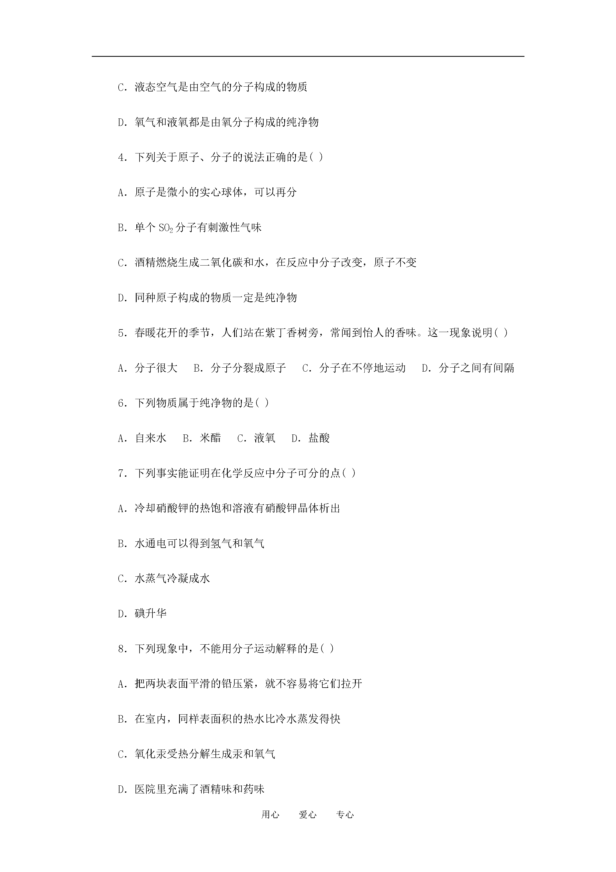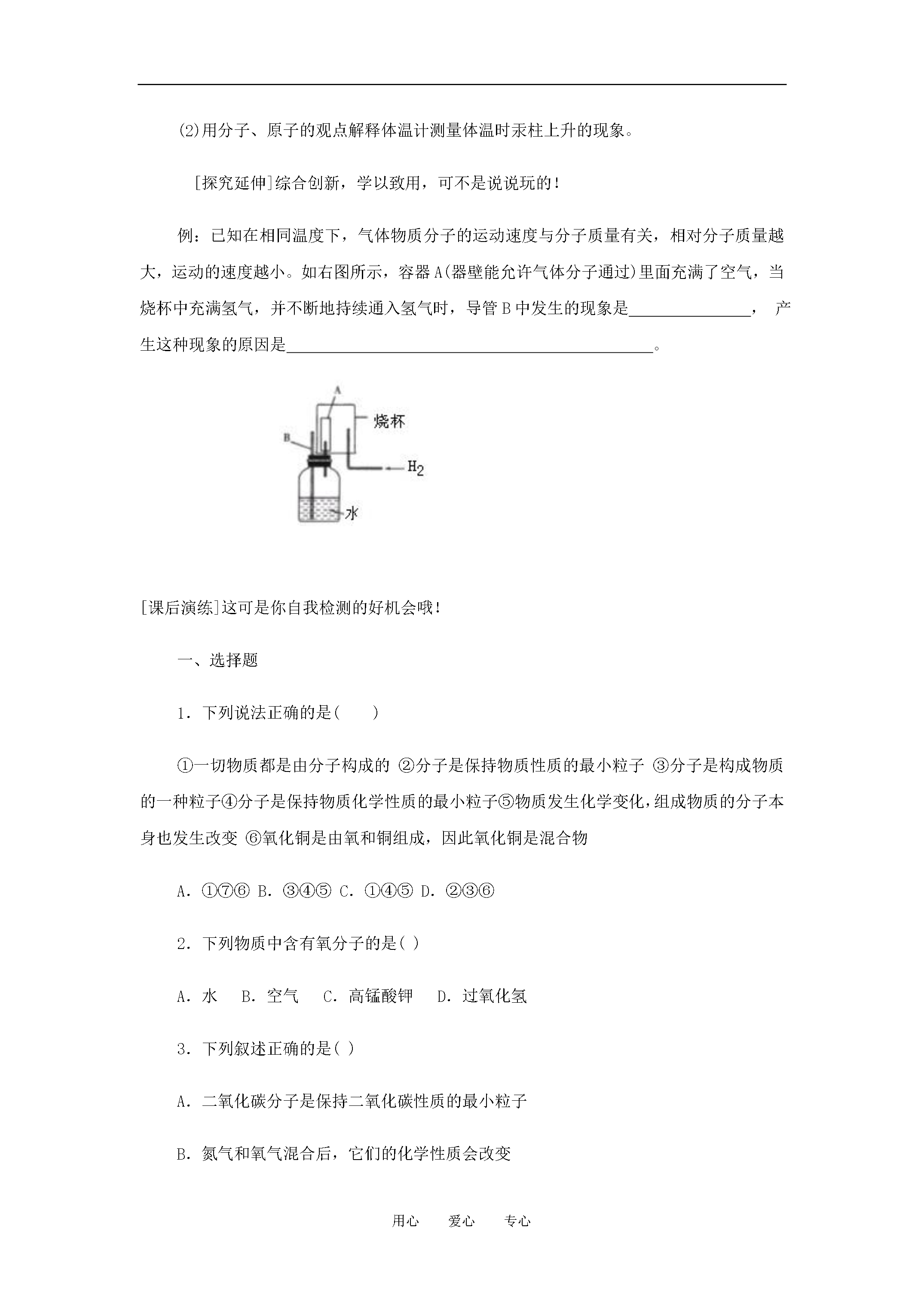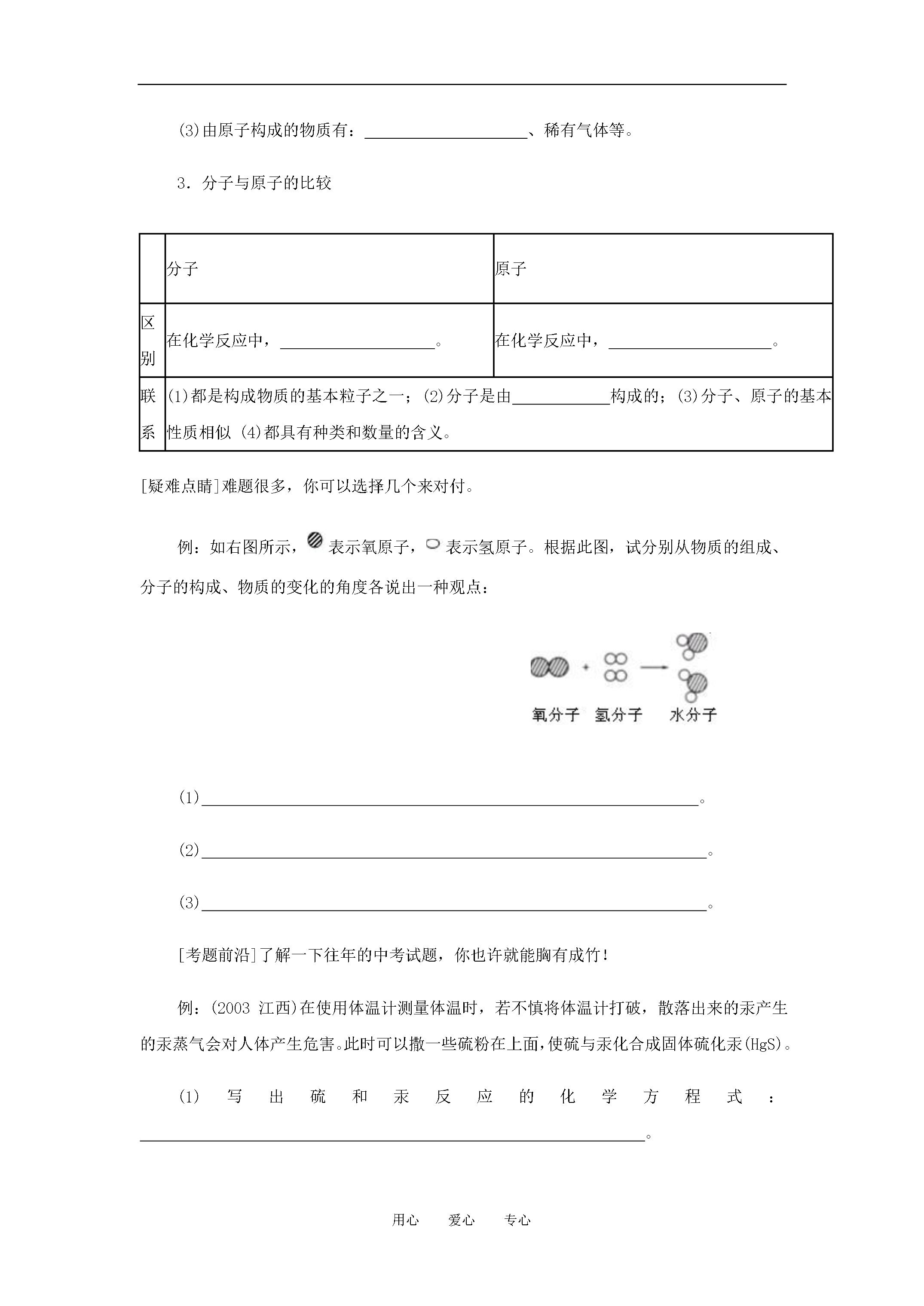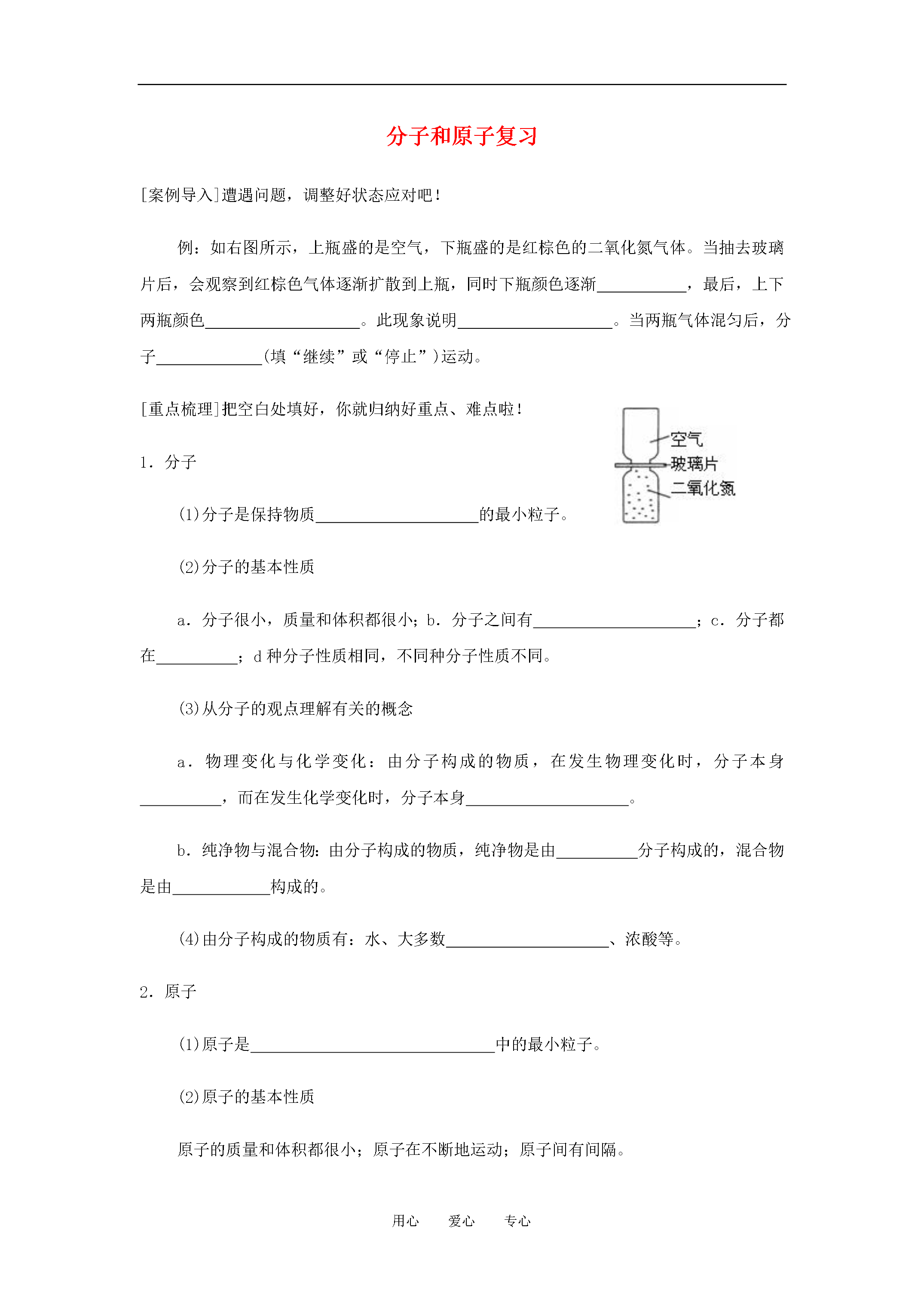 用心爱心专心分子和原子复习[案例导入]遭遇问题,调整好状态应对吧!例:如右图所示,上瓶盛的是空气,下瓶盛的是红棕色的二氧化氮气体。当抽去玻璃片后,会观察到红棕色气体逐渐扩散到上瓶,同时下瓶颜色逐渐,最后,上下两瓶颜色。此现象说明。当两瓶气体混匀后,分子(填“继续”或“停止”)运动。[重点梳理]把空白处填好,你就归纳好重点、难点啦!1.分子(1)分子是保持物质的最小粒子。(2)分子的基本性质a.分子很小,质量和体积都很小;b.分子之间有;c.分子都在;d种分子性质相同,不同种分子性质不同。(3)从分子的观点理解有关的概念a.物理变化与化学变化:由分子构成的物质,在发生物理变化时,分子本身,而在发生化学变化时,分子本身。b.纯净物与混合物:由分子构成的物质,纯净物是由分子构成的,混合物是由构成的。(4)由分子构成的物质有:水、大多数、浓酸等。2.原子(1)原子是中的最小粒子。(2)原子的基本性质原子的质量和体积都很小;原子在不断地运动;原子间有间隔。(3)由原子构成的物质有:、稀有气体等。3.分子与原子的比较分子原子区别在化学反应中,。在化学反应中,。联系(1)都是构成物质的基本粒子之一;(2)分子是由构成的;(3)分子、原子的基本性质相似(4)都具有种类和数量的含义。[疑难点睛]难题很多,你可以选择几个来对付。例:如右图所示,表示氧原子,表示氢原子。根据此图,试分别从物质的组成、分子的构成、物质的变化的角度各说出一种观点:(1)。(2)。(3)。[考题前沿]了解一下往年的中考试题,你也许就能胸有成竹!例:(2003江西)在使用体温计测量体温时,若不慎将体温计打破,散落出来的汞产生的汞蒸气会对人体产生危害。此时可以撒一些硫粉在上面,使硫与汞化合成固体硫化汞(HgS)。(1)写出硫和汞反应的化学方程式:。(2)用分子、原子的观点解释体温计测量体温时汞柱上升的现象。[探究延伸]综合创新,学以致用,可不是说说玩的!例:已知在相同温度下,气体物质分子的运动速度与分子质量有关,相对分子质量越大,运动的速度越小。如右图所示,容器A(器壁能允许气体分子通过)里面充满了空气,当烧杯中充满氢气,并不断地持续通入氢气时,导管B中发生的现象是,产生这种现象的原因是。[课后演练]这可是你自我检测的好机会哦!一、选择题1.下列说法正确的是()①一切物质都是由分子构成的②分子是保持物质性质的最小粒子③分子是构成物质的一种粒子④分子是保持物质化学性质的最小粒子⑤物质发生化学变化,组成物质的分子本身也发生改变⑥氧化铜是由氧和铜组成,因此氧化铜是混合物A.①⑦⑥B.③④⑤C.①④⑤D.②③⑥2.下列物质中含有氧分子的是()A.水B.空气C.高锰酸钾D.过氧化氢3.下列叙述正确的是()A.二氧化碳分子是保持二氧化碳性质的最小粒子B.氮气和氧气混合后,它们的化学性质会改变C.液态空气是由空气的分子构成的物质D.氧气和液氧都是由氧分子构成的纯净物4.下列关于原子、分子的说法正确的是()A.原子是微小的实心球体,可以再分B.单个SO2分子有刺激性气味C.酒精燃烧生成二氧化碳和水,在反应中分子改变,原子不变D.同种原子构成的物质一定是纯净物5.春暖花开的季节,人们站在紫丁香树旁,常闻到怡人的香味。这一现象说明()A.分子很大B.分子分裂成原子C.分子在不停地运动D.分子之间有间隔6.下列物质属于纯净物的是()A.自来水B.米醋C.液氧D.盐酸7.下列事实能证明在化学反应中分子可分的点()A.冷却硝酸钾的热饱和溶液有硝酸钾晶体析出B.水通电可以得到氢气和氧气C.水蒸气冷凝成水D.碘升华8.下列现象中,不能用分子运动解释的是()A.把两块表面平滑的铅压紧,就不容易将它们拉开B.在室内,同样表面积的热水比冷水蒸发得快C.氧化汞受热分解生成汞和氧气D.医院里充满了酒精味和药味二、填空题9.有下列物质:①氖气、②镁带、③二氧化硫、④液氧、⑤澄清石灰水、⑥空气、⑦水,其中含有氧分子的是,属于混合物的是,属于化合物的是,属于氧化物的是,由原子直接构成的是(均填序号)。10.在电解水的过程中,发生变化的粒子是;保持不变的粒子是和;生成的新粒子是和,该实验证明,在化学反应中,可再分,而不能再分。11.科学实验测定,一滴水(按20滴水的体积为1mL计算)里大约有1.67×1021个水分子,这一事实说明分子本身的质量。12.如右图所示,在试管中的滤纸条上A、B、C三处各滴上一滴紫色石蕊溶液,再向试管口的棉花团上滴一些浓盐酸,可以观察到A、B、C三处的石蕊溶液变成色,先后顺序为;该现象说明浓盐酸有哪些性质?(只需列举两条性质)(1);(2)。三、简答题13.请利用分子、原子的观点解释下列事实:(1)加油站里的汽油已经贮存在油罐中,但在离油罐一定距离内仍要“严禁烟火”。(2)液氢和氢气状态不同,但具