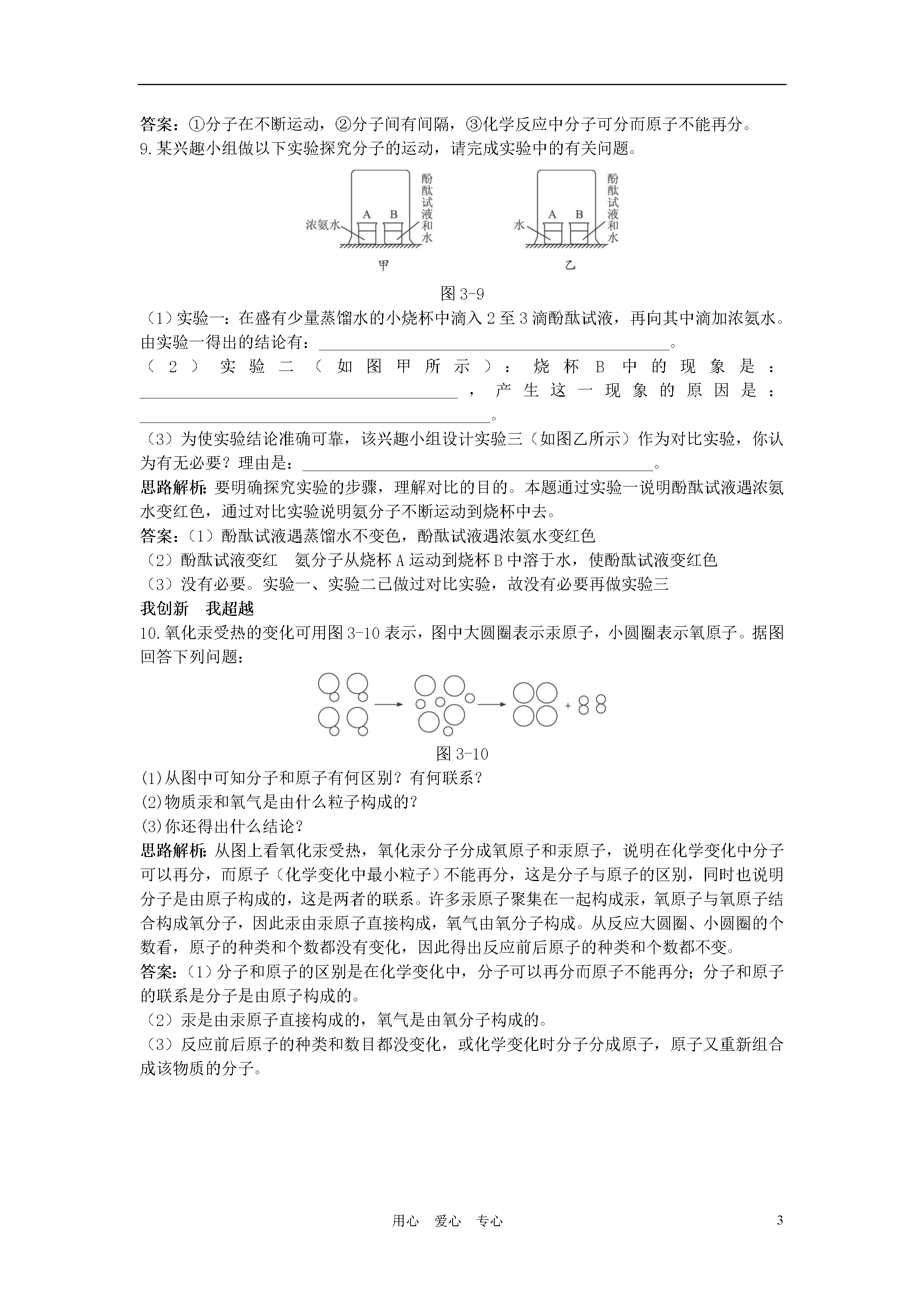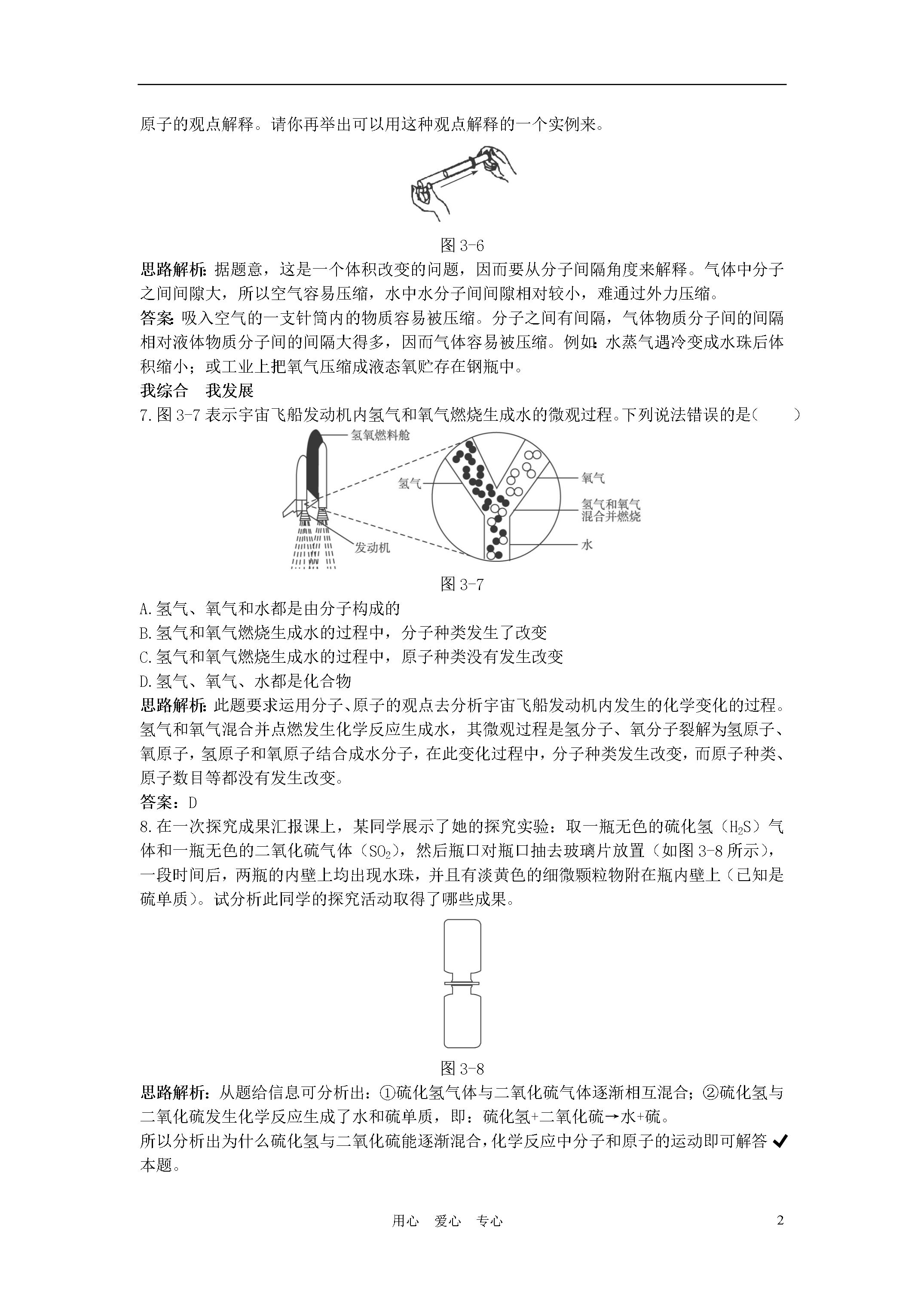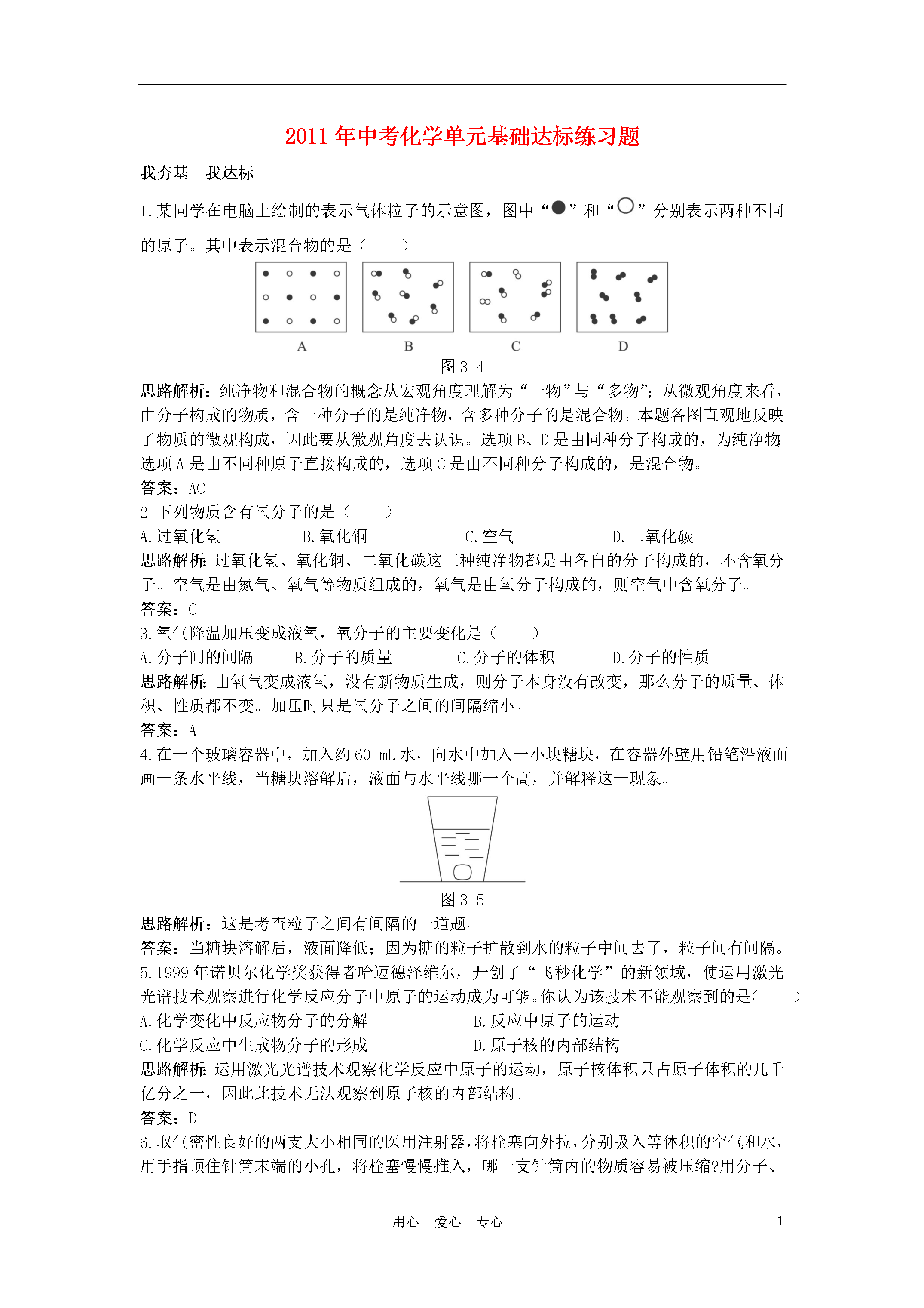 3用心爱心专心2011年中考化学单元基础达标练习题我夯基我达标1.某同学在电脑上绘制的表示气体粒子的示意图,图中“”和“”分别表示两种不同的原子。其中表示混合物的是()图3-4思路解析:纯净物和混合物的概念从宏观角度理解为“一物”与“多物”;从微观角度来看,由分子构成的物质,含一种分子的是纯净物,含多种分子的是混合物。本题各图直观地反映了物质的微观构成,因此要从微观角度去认识。选项B、D是由同种分子构成的,为纯净物;选项A是由不同种原子直接构成的,选项C是由不同种分子构成的,是混合物。答案:AC2.下列物质含有氧分子的是()A.过氧化氢B.氧化铜C.空气D.二氧化碳思路解析:过氧化氢、氧化铜、二氧化碳这三种纯净物都是由各自的分子构成的,不含氧分子。空气是由氮气、氧气等物质组成的,氧气是由氧分子构成的,则空气中含氧分子。答案:C3.氧气降温加压变成液氧,氧分子的主要变化是()A.分子间的间隔B.分子的质量C.分子的体积D.分子的性质思路解析:由氧气变成液氧,没有新物质生成,则分子本身没有改变,那么分子的质量、体积、性质都不变。加压时只是氧分子之间的间隔缩小。答案:A4.在一个玻璃容器中,加入约60mL水,向水中加入一小块糖块,在容器外壁用铅笔沿液面画一条水平线,当糖块溶解后,液面与水平线哪一个高,并解释这一现象。图3-5思路解析:这是考查粒子之间有间隔的一道题。答案:当糖块溶解后,液面降低;因为糖的粒子扩散到水的粒子中间去了,粒子间有间隔。5.1999年诺贝尔化学奖获得者哈迈德泽维尔,开创了“飞秒化学”的新领域,使运用激光光谱技术观察进行化学反应分子中原子的运动成为可能。你认为该技术不能观察到的是()A.化学变化中反应物分子的分解B.反应中原子的运动C.化学反应中生成物分子的形成D.原子核的内部结构思路解析:运用激光光谱技术观察化学反应中原子的运动,原子核体积只占原子体积的几千亿分之一,因此此技术无法观察到原子核的内部结构。答案:D6.取气密性良好的两支大小相同的医用注射器,将栓塞向外拉,分别吸入等体积的空气和水,用手指顶住针筒末端的小孔,将栓塞慢慢推入,哪一支针筒内的物质容易被压缩?用分子、原子的观点解释。请你再举出可以用这种观点解释的一个实例来。图3-6思路解析:据题意,这是一个体积改变的问题,因而要从分子间隔角度来解释。气体中分子之间间隙大,所以空气容易压缩,水中水分子间间隙相对较小,难通过外力压缩。答案:吸入空气的一支针筒内的物质容易被压缩。分子之间有间隔,气体物质分子间的间隔相对液体物质分子间的间隔大得多,因而气体容易被压缩。例如:水蒸气遇冷变成水珠后体积缩小;或工业上把氧气压缩成液态氧贮存在钢瓶中。我综合我发展7.图3-7表示宇宙飞船发动机内氢气和氧气燃烧生成水的微观过程。下列说法错误的是()图3-7A.氢气、氧气和水都是由分子构成的B.氢气和氧气燃烧生成水的过程中,分子种类发生了改变C.氢气和氧气燃烧生成水的过程中,原子种类没有发生改变D.氢气、氧气、水都是化合物思路解析:此题要求运用分子、原子的观点去分析宇宙飞船发动机内发生的化学变化的过程。氢气和氧气混合并点燃发生化学反应生成水,其微观过程是氢分子、氧分子裂解为氢原子、氧原子,氢原子和氧原子结合成水分子,在此变化过程中,分子种类发生改变,而原子种类、原子数目等都没有发生改变。答案:D8.在一次探究成果汇报课上,某同学展示了她的探究实验:取一瓶无色的硫化氢(H2S)气体和一瓶无色的二氧化硫气体(SO2),然后瓶口对瓶口抽去玻璃片放置(如图3-8所示),一段时间后,两瓶的内壁上均出现水珠,并且有淡黄色的细微颗粒物附在瓶内壁上(已知是硫单质)。试分析此同学的探究活动取得了哪些成果。图3-8思路解析:从题给信息可分析出:①硫化氢气体与二氧化硫气体逐渐相互混合;②硫化氢与二氧化硫发生化学反应生成了水和硫单质,即:硫化氢+二氧化硫→水+硫。所以分析出为什么硫化氢与二氧化硫能逐渐混合,化学反应中分子和原子的运动即可解答本题。答案:①分子在不断运动,②分子间有间隔,③化学反应中分子可分而原子不能再分。9.某兴趣小组做以下实验探究分子的运动,请完成实验中的有关问题。图3-9(1)实验一:在盛有少量蒸馏水的小烧杯中滴入2至3滴酚酞试液,再向其中滴加浓氨水。由实验一得出的结论有:___________________________________________。(2)实验二(如图甲所示):烧杯B中的现象是:_______________________________________,产生这一现象的原因是:___________________________________________。(3)为使实验结论准确可靠,该兴趣小组设计实验三(如图乙所示)作为对比实验,你认为有无