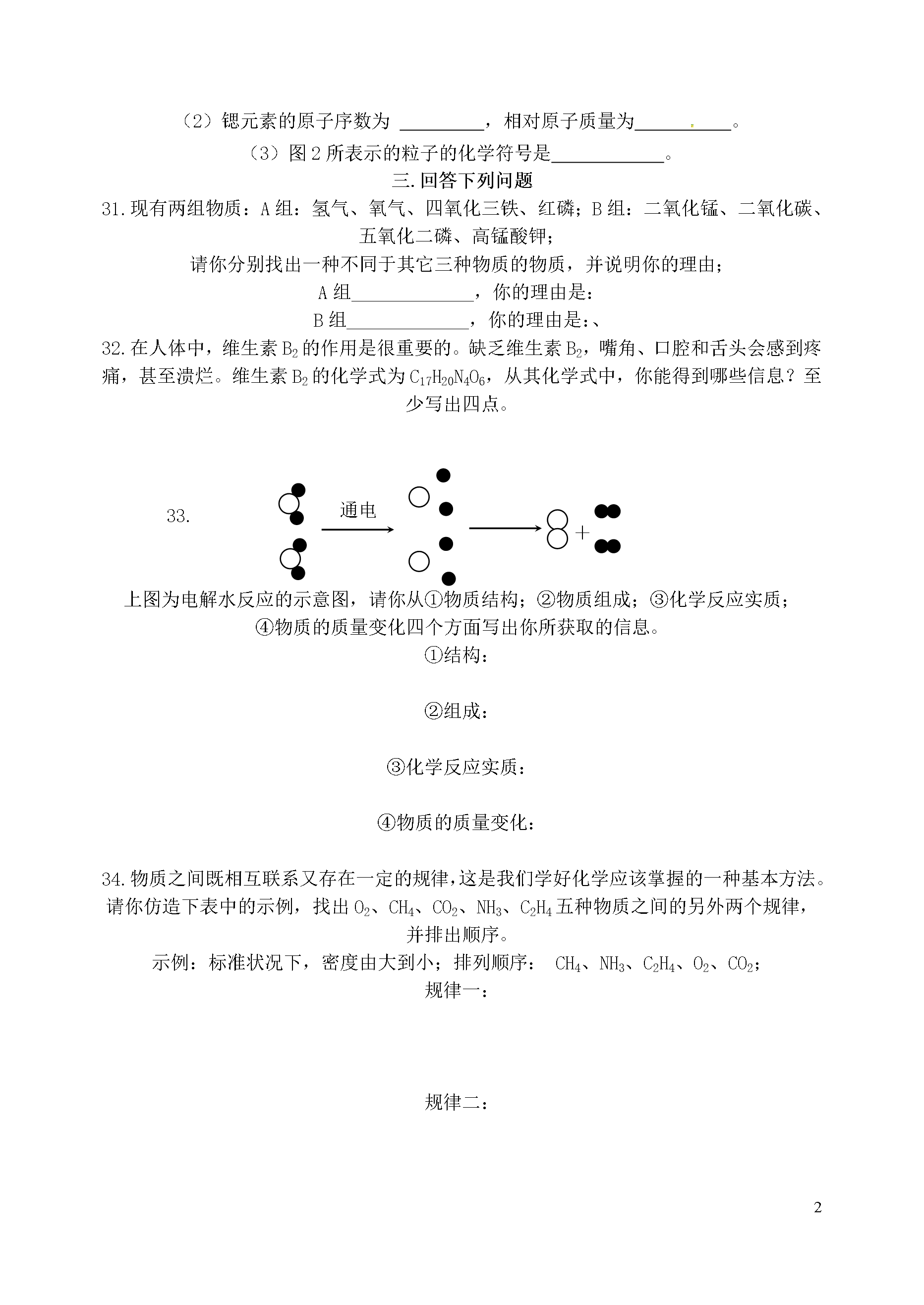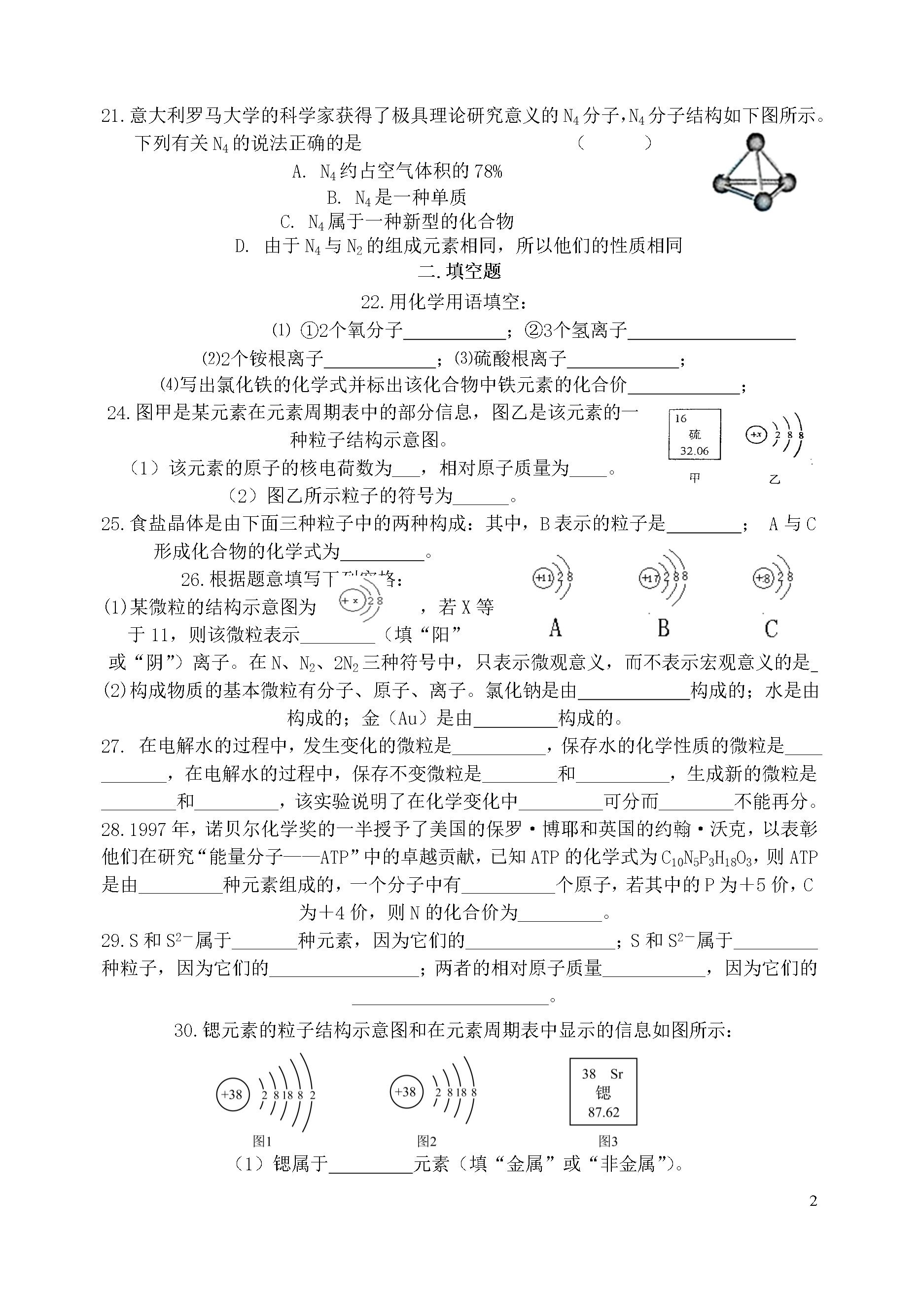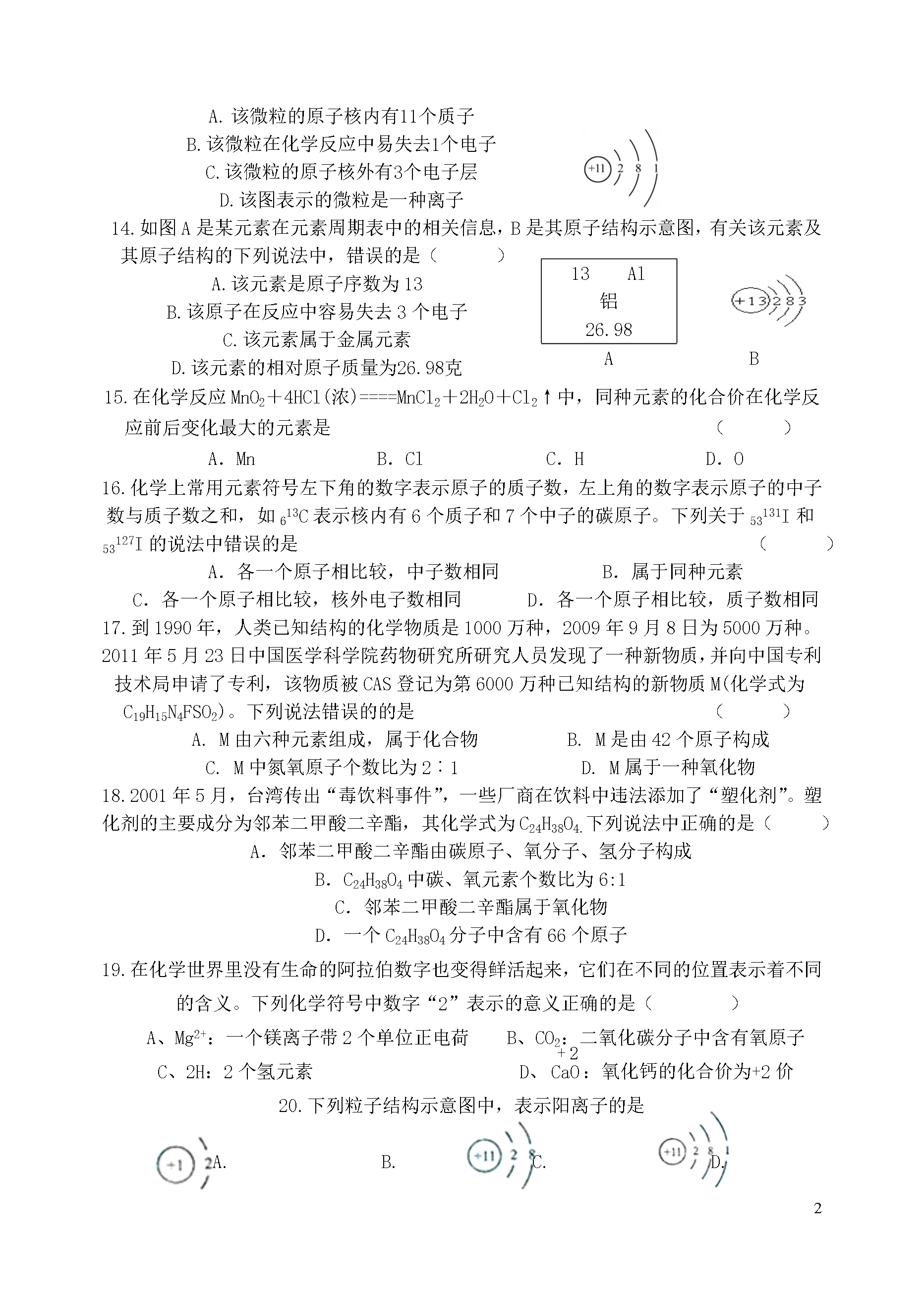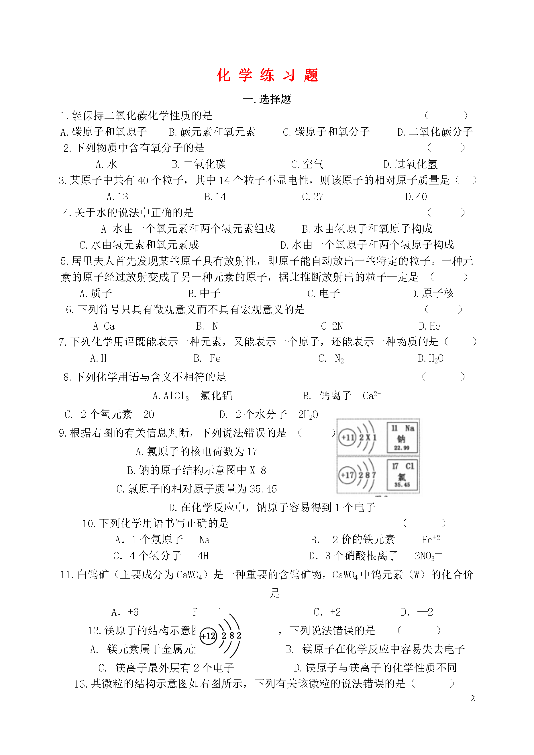 14化学练习题一.选择题1.能保持二氧化碳化学性质的是()A.碳原子和氧原子B.碳元素和氧元素C.碳原子和氧分子D.二氧化碳分子下列物质中含有氧分子的是()水B.二氧化碳C.空气D.过氧化氢3.某原子中共有40个粒子,其中14个粒子不显电性,则该原子的相对原子质量是()A.13B.14C.27D.404.关于水的说法中正确的是()A.水由一个氧元素和两个氢元素组成B.水由氢原子和氧原子构成C.水由氢元素和氧元素成D.水由一个氧原子和两个氢原子构成5.居里夫人首先发现某些原子具有放射性,即原子能自动放出一些特定的粒子。一种元素的原子经过放射变成了另一种元素的原子,据此推断放射出的粒子一定是()A.质子B.中子C.电子D.原子核6.下列符号只具有微观意义而不具有宏观意义的是()A.CaB.NC.2ND.He7.下列化学用语既能表示一种元素,又能表示一个原子,还能表示一种物质的是()A.HB.FeC.N2D.H2O8.下列化学用语与含义不相符的是()A.AlCl3—氯化铝B.钙离子—Ca2+C.2个氧元素—2OD.2个水分子—2H2O9.根据右图的有关信息判断,下列说法错误的是()A.氯原子的核电荷数为17B.钠的原子结构示意图中X=8C.氯原子的相对原子质量为35.45D.在化学反应中,钠原子容易得到1个电子10.下列化学用语书写正确的是()A.1个氖原子NaB.+2价的铁元素Fe+2C.4个氢分子4HD.3个硝酸根离子3NO3—11.白钨矿(主要成分为CaWO4)是一种重要的含钨矿物,CaWO4中钨元素(W)的化合价是A.+6B.+4C.+2D.—212.镁原子的结构示意图为,下列说法错误的是()A.镁元素属于金属元素B.镁原子在化学反应中容易失去电子C.镁离子最外层有2个电子D.镁原子与镁离子的化学性质不同13.某微粒的结构示意图如右图所示,下列有关该微粒的说法错误的是()A.该微粒的原子核内有11个质子B.该微粒在化学反应中易失去1个电子C.该微粒的原子核外有3个电子层D.该图表示的微粒是一种离子14.如图A是某元素在元素周期表中的相关信息,B是其原子结构示意图,有关该元素及其原子结构的下列说法中,错误的是()13Al铝26.98ABA.该元素是原子序数为13B.该原子在反应中容易失去3个电子C.该元素属于金属元素D.该元素的相对原子质量为26.98克15.在化学反应MnO2+4HCl(浓)====MnCl2+2H2O+Cl2↑中,同种元素的化合价在化学反应前后变化最大的元素是()A.MnB.ClC.HD.O16.化学上常用元素符号左下角的数字表示原子的质子数,左上角的数字表示原子的中子数与质子数之和,如613C表示核内有6个质子和7个中子的碳原子。下列关于53131I和53127I的说法中错误的是()A.各一个原子相比较,中子数相同B.属于同种元素C.各一个原子相比较,核外电子数相同D.各一个原子相比较,质子数相同17.到1990年,人类已知结构的化学物质是1000万种,2009年9月8日为5000万种。2011年5月23日中国医学科学院药物研究所研究人员发现了一种新物质,并向中国专利技术局申请了专利,该物质被CAS登记为第6000万种已知结构的新物质M(化学式为C19H15N4FSO2)。下列说法错误的的是()A.M由六种元素组成,属于化合物B.M是由42个原子构成C.M中氮氧原子个数比为2︰1D.M属于一种氧化物18.2001年5月,台湾传出“毒饮料事件”,一些厂商在饮料中违法添加了“塑化剂”。塑化剂的主要成分为邻苯二甲酸二辛酯,其化学式为C24H38O4.下列说法中正确的是()A.邻苯二甲酸二辛酯由碳原子、氧分子、氢分子构成B.C24H38O4中碳、氧元素个数比为6:1C.邻苯二甲酸二辛酯属于氧化物D.一个C24H38O4分子中含有66个原子19.在化学世界里没有生命的阿拉伯数字也变得鲜活起来,它们在不同的位置表示着不同的含义。下列化学符号中数字“2”表示的意义正确的是()A、Mg2+:一个镁离子带2个单位正电荷B、CO2:二氧化碳分子中含有氧原子C、2H:2个氢元素D、:氧化钙的化合价为+2价20.下列粒子结构示意图中,表示阳离子的是A.B.C.D.21.意大利罗马大学的科学家获得了极具理论研究意义的N4分子,N4分子结构如下图所示。下列有关N4的说法正确的是()A.N4约占空气体积的78%B.N4是一种单质C.N4属于一种新型的化合物D.由于N4与N2的组成元素相同,所以他们的性质相同二.填空题22.用化学用语填空:⑴①2个氧分子;②3个氢离子⑵2个铵根离子;⑶硫酸根离子;⑷写出氯化铁的化学式并标出该化合物中铁元素的化合价;24.图甲是某元素在元素周期表中的部分信息,图乙是该元素的一种粒子结构示意图。(1)该元