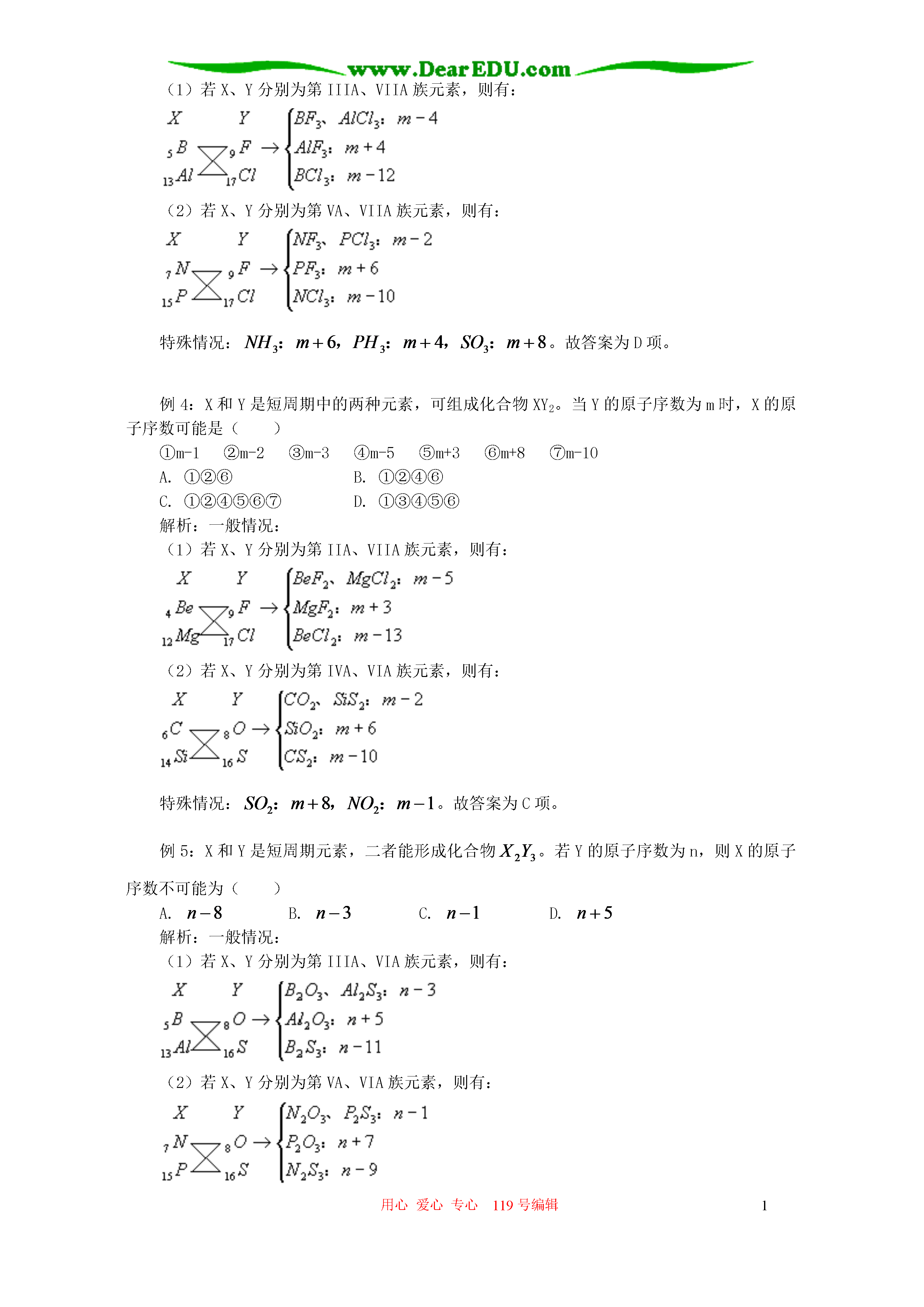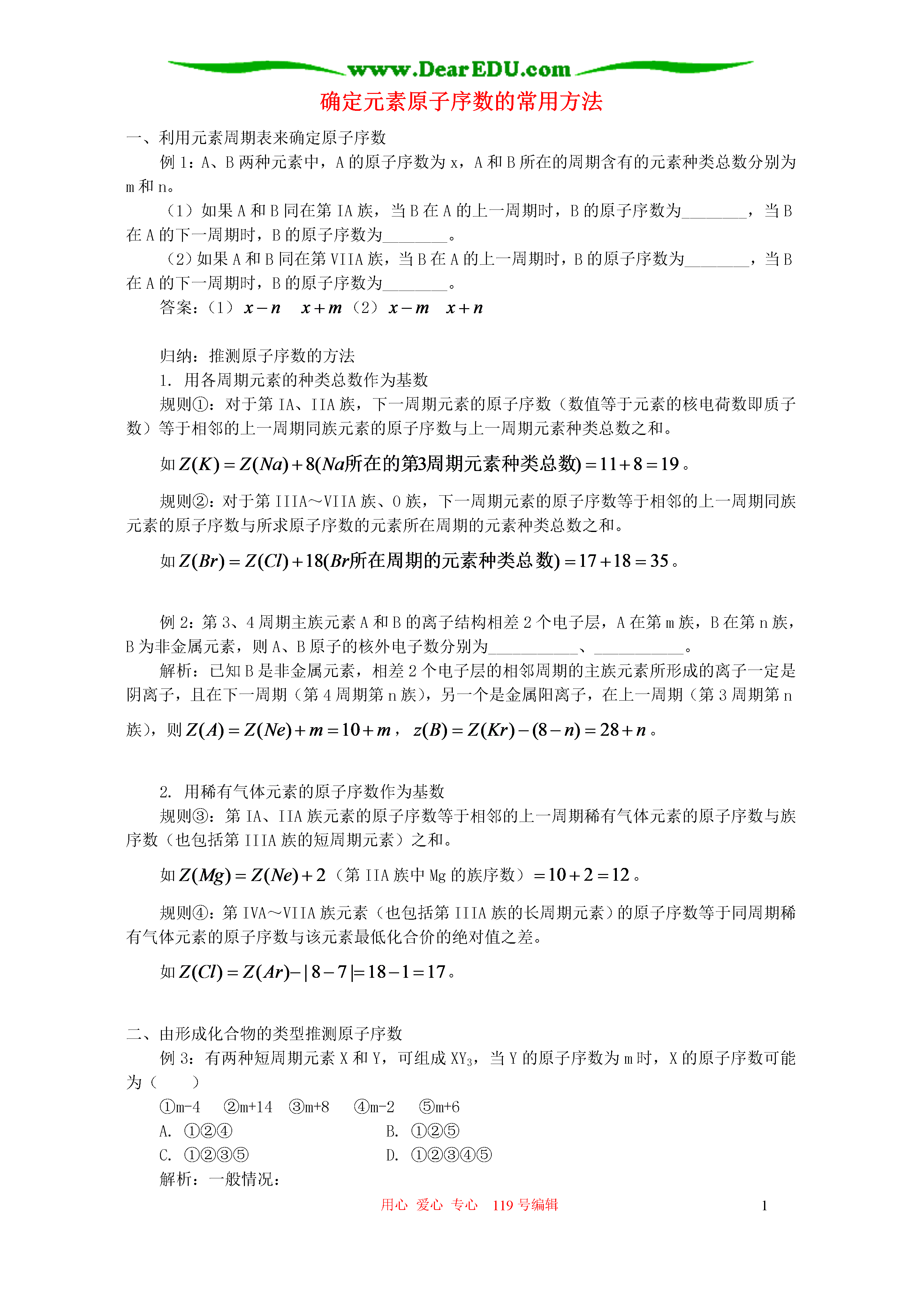 用心爱心专心119号编辑1确定元素原子序数的常用方法一、利用元素周期表来确定原子序数例1:A、B两种元素中,A的原子序数为x,A和B所在的周期含有的元素种类总数分别为m和n。(1)如果A和B同在第IA族,当B在A的上一周期时,B的原子序数为________,当B在A的下一周期时,B的原子序数为________。(2)如果A和B同在第VIIA族,当B在A的上一周期时,B的原子序数为________,当B在A的下一周期时,B的原子序数为________。答案:(1)(2)归纳:推测原子序数的方法1.用各周期元素的种类总数作为基数规则①:对于第IA、IIA族,下一周期元素的原子序数(数值等于元素的核电荷数即质子数)等于相邻的上一周期同族元素的原子序数与上一周期元素种类总数之和。如。规则②:对于第IIIA~VIIA族、0族,下一周期元素的原子序数等于相邻的上一周期同族元素的原子序数与所求原子序数的元素所在周期的元素种类总数之和。如。例2:第3、4周期主族元素A和B的离子结构相差2个电子层,A在第m族,B在第n族,B为非金属元素,则A、B原子的核外电子数分别为___________、___________。解析:已知B是非金属元素,相差2个电子层的相邻周期的主族元素所形成的离子一定是阴离子,且在下一周期(第4周期第n族),另一个是金属阳离子,在上一周期(第3周期第n族),则,。2.用稀有气体元素的原子序数作为基数规则③:第IA、IIA族元素的原子序数等于相邻的上一周期稀有气体元素的原子序数与族序数(也包括第IIIA族的短周期元素)之和。如(第IIA族中Mg的族序数)。规则④:第IVA~VIIA族元素(也包括第IIIA族的长周期元素)的原子序数等于同周期稀有气体元素的原子序数与该元素最低化合价的绝对值之差。如。二、由形成化合物的类型推测原子序数例3:有两种短周期元素X和Y,可组成XY3,当Y的原子序数为m时,X的原子序数可能为()①m-4②m+14③m+8④m-2⑤m+6A.①②④B.①②⑤C.①②③⑤D.①②③④⑤解析:一般情况:(1)若X、Y分别为第IIIA、VIIA族元素,则有:(2)若X、Y分别为第VA、VIIA族元素,则有:特殊情况:。故答案为D项。例4:X和Y是短周期中的两种元素,可组成化合物XY2。当Y的原子序数为m时,X的原子序数可能是()①m-1②m-2③m-3④m-5⑤m+3⑥m+8⑦m-10A.①②⑥B.①②④⑥C.①②④⑤⑥⑦D.①③④⑤⑥解析:一般情况:(1)若X、Y分别为第IIA、VIIA族元素,则有:(2)若X、Y分别为第IVA、VIA族元素,则有:特殊情况:。故答案为C项。例5:X和Y是短周期元素,二者能形成化合物。若Y的原子序数为n,则X的原子序数不可能为()A.B.C.D.解析:一般情况:(1)若X、Y分别为第IIIA、VIA族元素,则有:(2)若X、Y分别为第VA、VIA族元素,则有:故答案为A项。