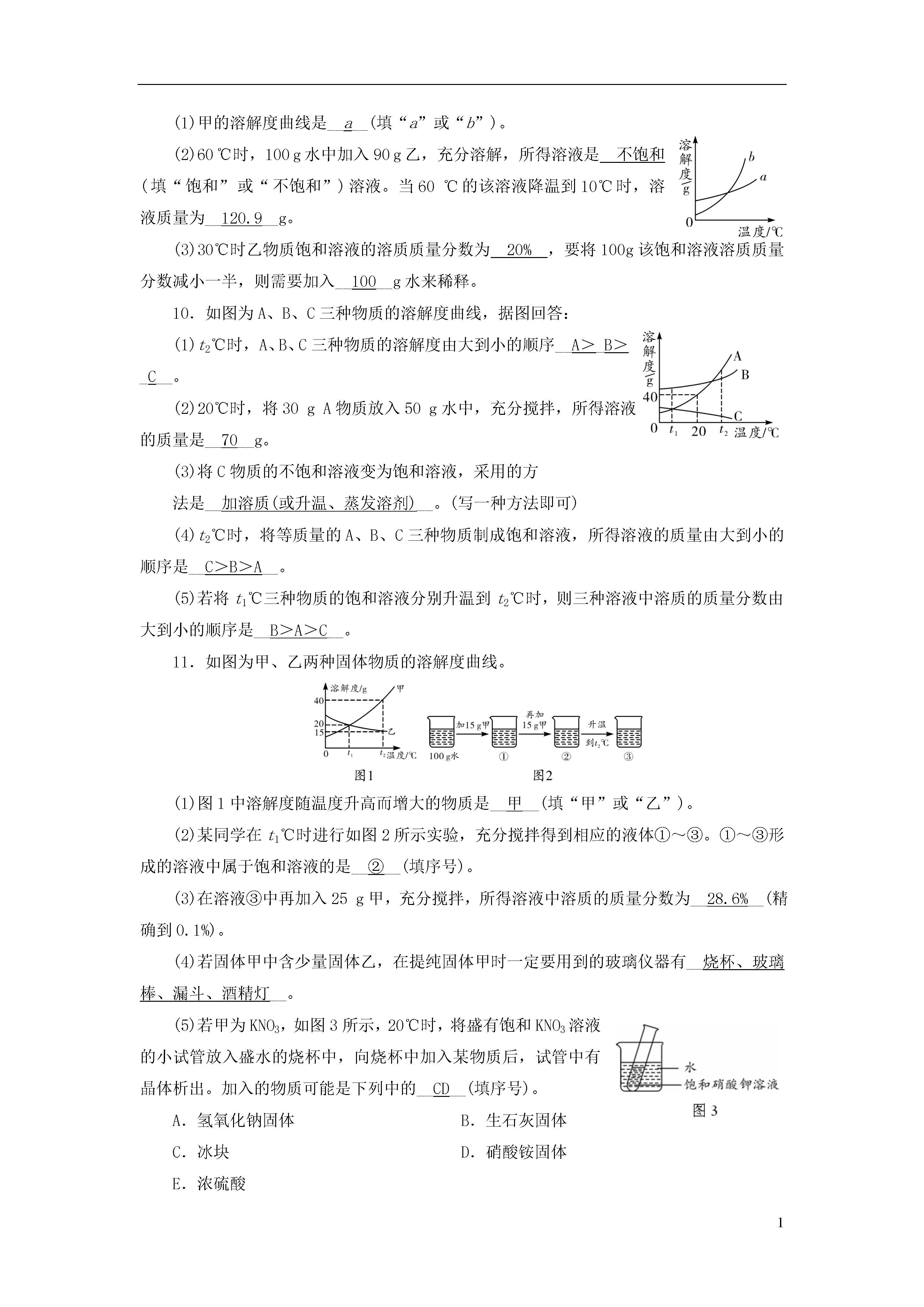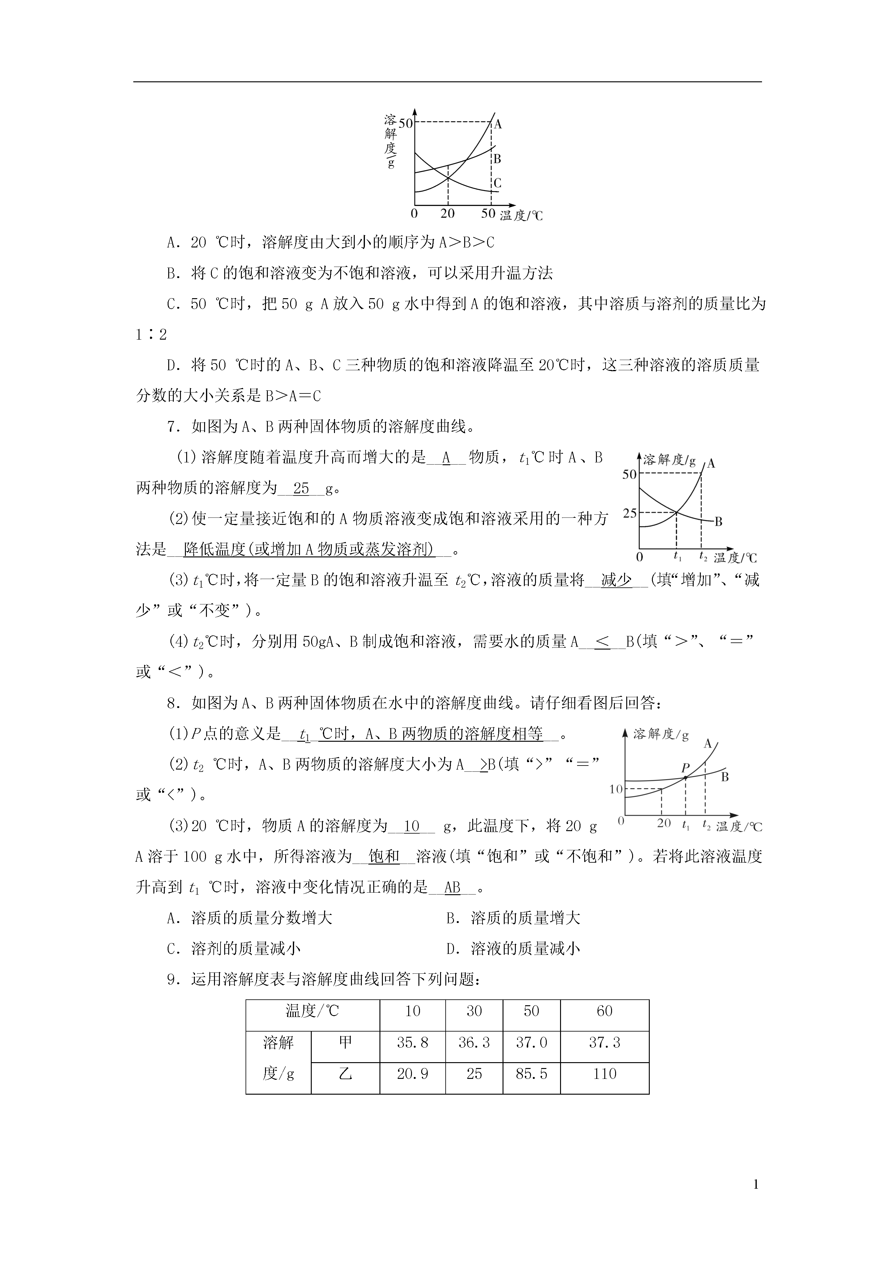 1第一部分第九单元课时11.关于溶液的说法正确的是(C)A.溶液都是无色透明的B.升高温度一定能使饱和溶液变为不饱和溶液C.将溶液倒出一半后,剩余溶液的密度和倒出部分的密度相同D.溶液中不能同时存在两种溶质2.下列物质放入水中温度显著降低的是(D)A.氢氧化钠B.氯化钠C.浓硫酸D.硝酸铵3.(2015成都)将60℃的硝酸钾溶液降温至20℃,有晶体析出。有关该过程的说法错误的是(A)A.60℃时的溶液一定是硝酸钾的饱和溶液B.20℃时的溶液一定是硝酸钾的饱和溶液C.硝酸钾的溶解度随温度降低而减小D.硝酸钾的晶体可采用降温结晶的方法得到4.如图是X、Y、Z三种固体物质的溶解度曲线,当它们的溶液接近饱和时,分别采用增加溶质、蒸发溶剂、升高温度三种方法,均可以变成饱和溶液的是(C)A.X溶液B.Y溶液C.Z溶液D.X、Y溶液5.如图是a、b两种固体物质(不含结晶水)的溶解度曲线。下列说法正确的是(B)A.b的溶解度大于a的溶解度B.t1℃时,将a、b两种物质的饱和溶液分别恒温蒸发等质量的水,析出晶体的质量一定相等C.将t2℃时b的不饱和溶液降温至t1℃,一定能得到b的饱和溶液D.t2℃时,a溶液的溶质质量分数一定小于b溶液的溶质质量分数6.三种不含结晶水的固体物质A、B、C的溶解度曲线如图,下列说法正确的是(C)A.20℃时,溶解度由大到小的顺序为A>B>CB.将C的饱和溶液变为不饱和溶液,可以采用升温方法C.50℃时,把50gA放入50g水中得到A的饱和溶液,其中溶质与溶剂的质量比为1∶2D.将50℃时的A、B、C三种物质的饱和溶液降温至20℃时,这三种溶液的溶质质量分数的大小关系是B>A=C7.如图为A、B两种固体物质的溶解度曲线。(1)溶解度随着温度升高而增大的是__A__物质,t1℃时A、B两种物质的溶解度为__25__g。(2)使一定量接近饱和的A物质溶液变成饱和溶液采用的一种方法是__降低温度(或增加A物质或蒸发溶剂)__。(3)t1℃时,将一定量B的饱和溶液升温至t2℃,溶液的质量将__减少__(填“增加”、“减少”或“不变”)。(4)t2℃时,分别用50gA、B制成饱和溶液,需要水的质量A__<__B(填“>”、“=”或“<”)。8.如图为A、B两种固体物质在水中的溶解度曲线。请仔细看图后回答:(1)P点的意义是__t1_℃时,A、B两物质的溶解度相等__。(2)t2℃时,A、B两物质的溶解度大小为A__>B(填“>”“=”或“<”)。(3)20℃时,物质A的溶解度为__10__g,此温度下,将20gA溶于100g水中,所得溶液为__饱和__溶液(填“饱和”或“不饱和”)。若将此溶液温度升高到t1℃时,溶液中变化情况正确的是__AB__。A.溶质的质量分数增大B.溶质的质量增大C.溶剂的质量减小D.溶液的质量减小9.运用溶解度表与溶解度曲线回答下列问题:温度/℃10305060溶解度/g甲35.836.337.037.3乙20.92585.5110(1)甲的溶解度曲线是__a__(填“a”或“b”)。(2)60℃时,100g水中加入90g乙,充分溶解,所得溶液是不饱和(填“饱和”或“不饱和”)溶液。当60℃的该溶液降温到10℃时,溶液质量为__120.9__g。(3)30℃时乙物质饱和溶液的溶质质量分数为20%,要将100g该饱和溶液溶质质量分数减小一半,则需要加入__100__g水来稀释。10.如图为A、B、C三种物质的溶解度曲线,据图回答:(1)t2℃时,A、B、C三种物质的溶解度由大到小的顺序__A>_B>_C__。(2)20℃时,将30gA物质放入50g水中,充分搅拌,所得溶液的质量是__70__g。(3)将C物质的不饱和溶液变为饱和溶液,采用的方法是__加溶质(或升温、蒸发溶剂)__。(写一种方法即可)(4)t2℃时,将等质量的A、B、C三种物质制成饱和溶液,所得溶液的质量由大到小的顺序是__C>B>A__。(5)若将t1℃三种物质的饱和溶液分别升温到t2℃时,则三种溶液中溶质的质量分数由大到小的顺序是__B>A>C__。11.如图为甲、乙两种固体物质的溶解度曲线。(1)图1中溶解度随温度升高而增大的物质是__甲__(填“甲”或“乙”)。(2)某同学在t1℃时进行如图2所示实验,充分搅拌得到相应的液体①~③。①~③形成的溶液中属于饱和溶液的是__②__(填序号)。(3)在溶液③中再加入25g甲,充分搅拌,所得溶液中溶质的质量分数为__28.6%__(精确到0.1%)。(4)若固体甲中含少量固体乙,在提纯固体甲时一定要用到的玻璃仪器有__烧杯、玻璃棒、漏斗、酒精灯__。(