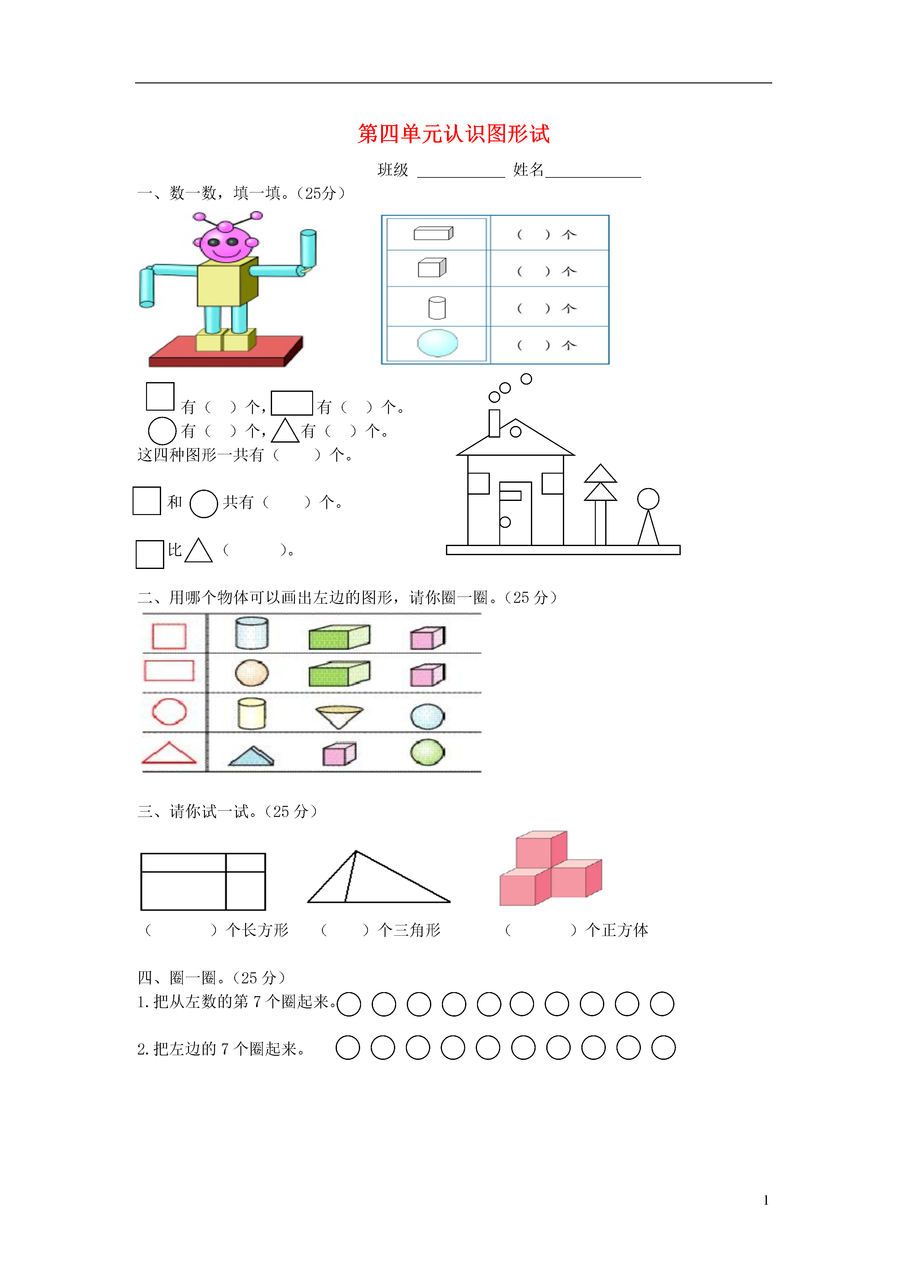 1第四单元认识图形试班级姓名一、数一数,填一填。(25分)有()个,有()个。有()个,有()个。这四种图形一共有()个。和共有()个。比()。二、用哪个物体可以画出左边的图形,请你圈一圈。(25分)三、请你试一试。(25分)()个长方形()个三角形()个正方体四、圈一圈。(25分)1.把从左数的第7个圈起来。2.把左边的7个圈起来。