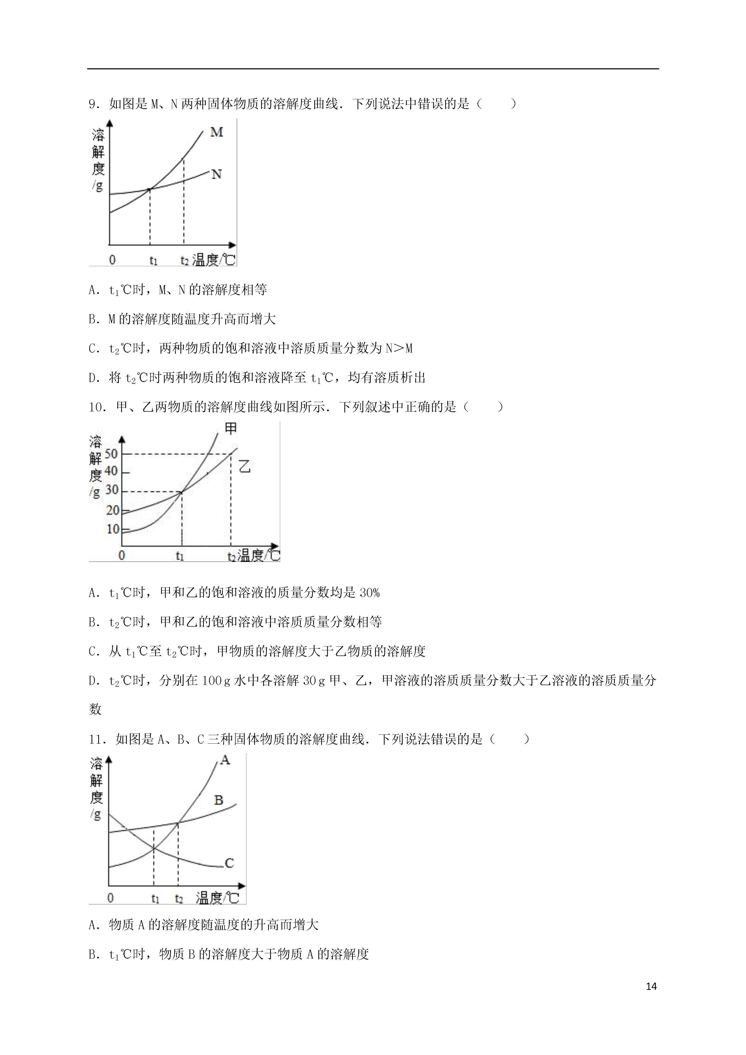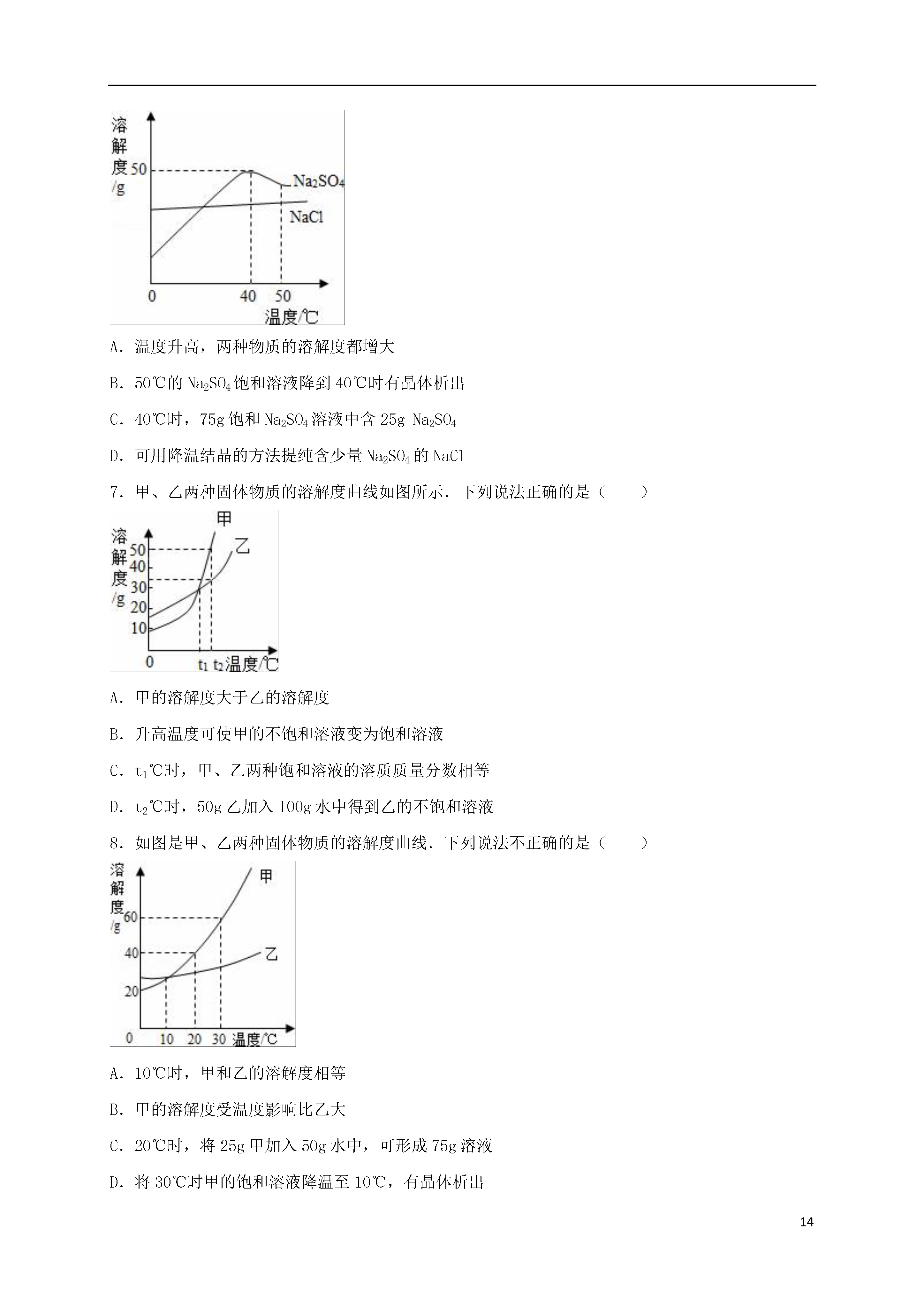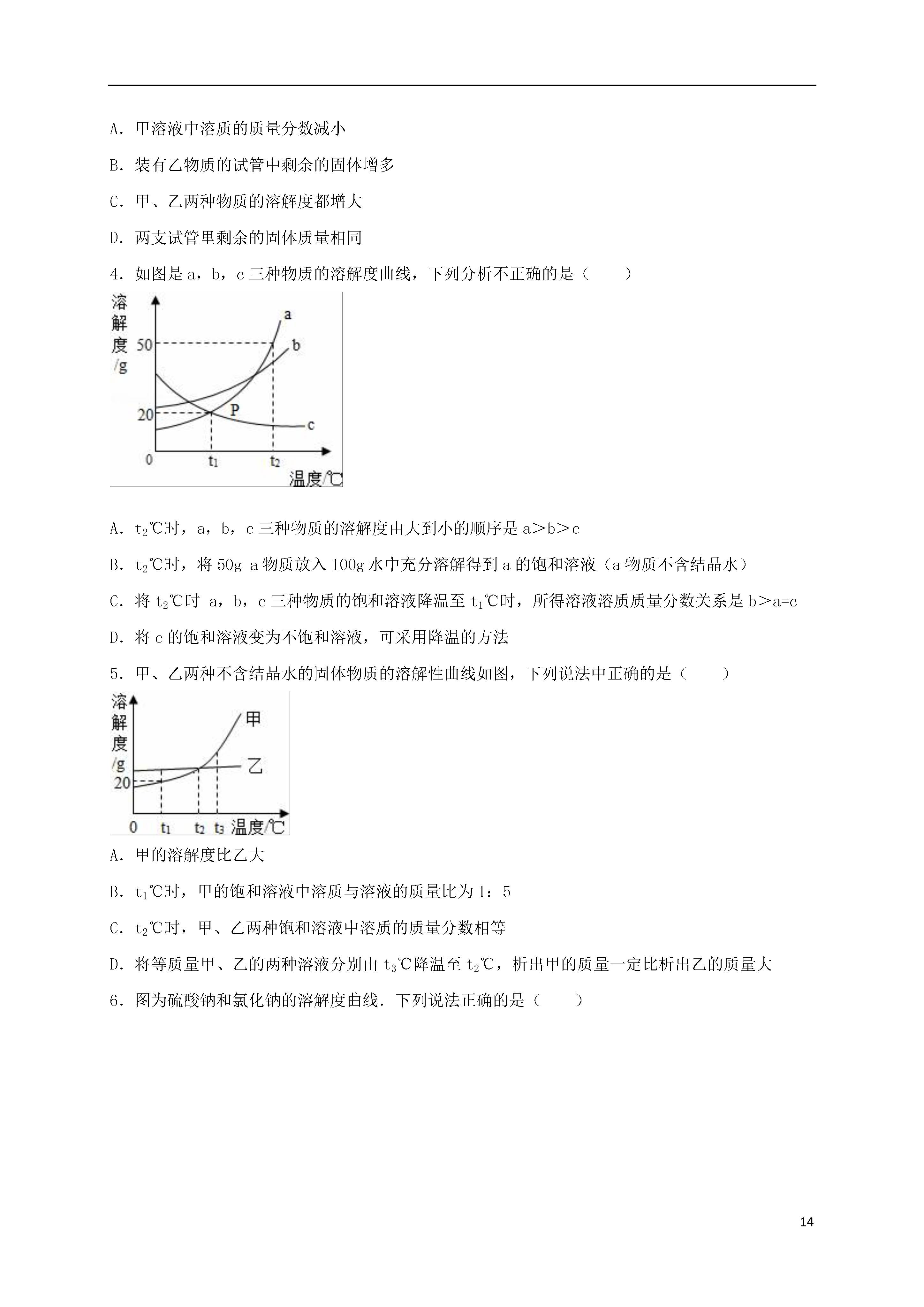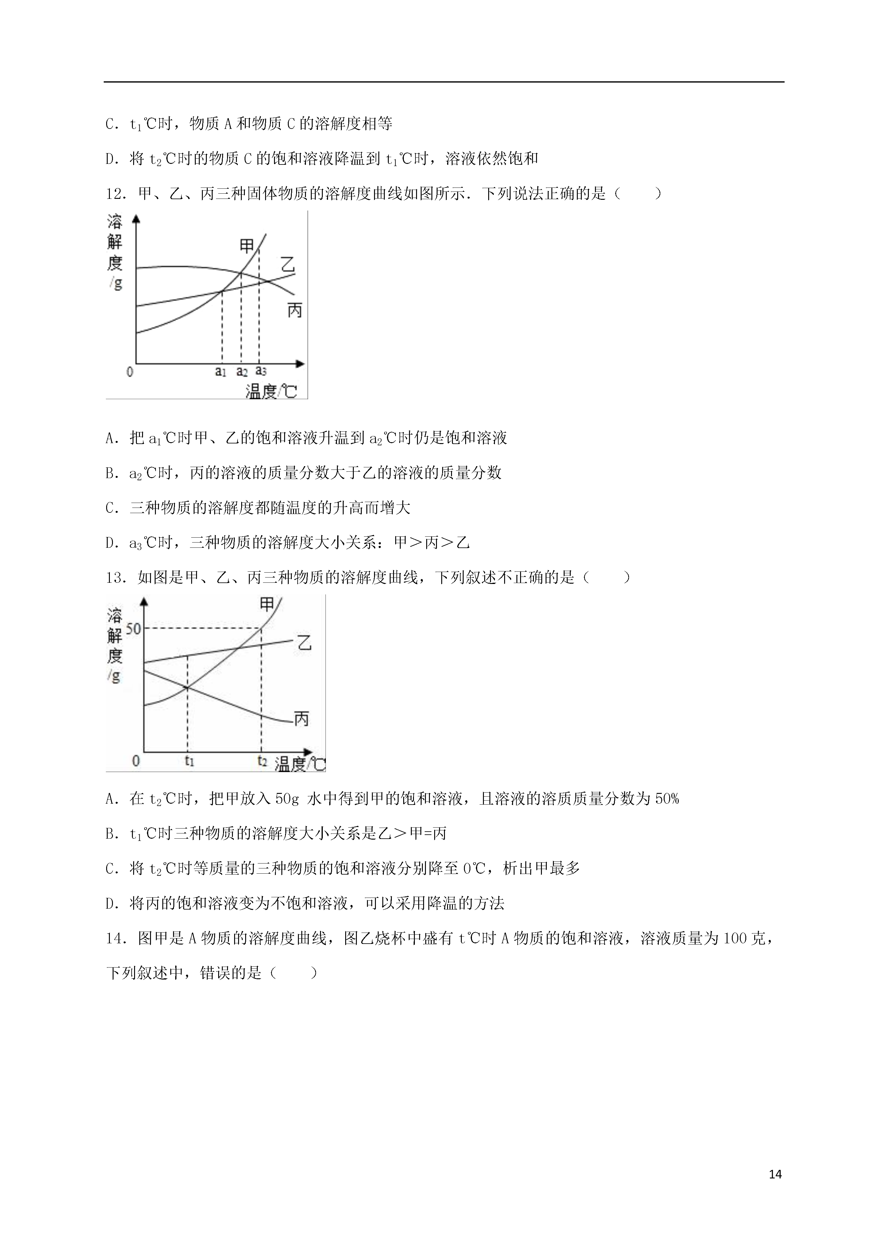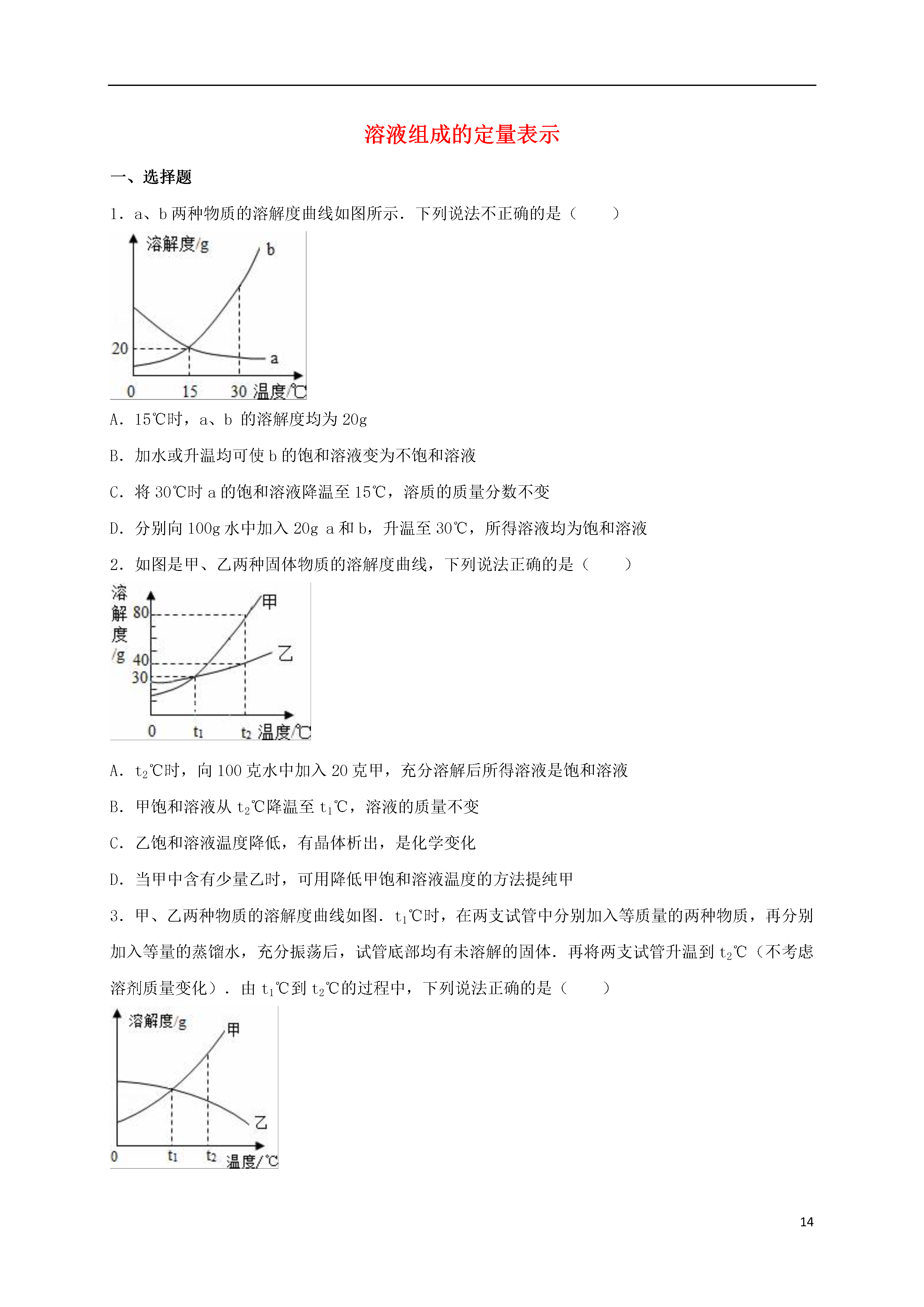 14溶液组成的定量表示一、选择题1.a、b两种物质的溶解度曲线如图所示.下列说法不正确的是()A.15℃时,a、b的溶解度均为20gB.加水或升温均可使b的饱和溶液变为不饱和溶液C.将30℃时a的饱和溶液降温至15℃,溶质的质量分数不变D.分别向100g水中加入20ga和b,升温至30℃,所得溶液均为饱和溶液2.如图是甲、乙两种固体物质的溶解度曲线,下列说法正确的是()A.t2℃时,向100克水中加入20克甲,充分溶解后所得溶液是饱和溶液B.甲饱和溶液从t2℃降温至t1℃,溶液的质量不变C.乙饱和溶液温度降低,有晶体析出,是化学变化D.当甲中含有少量乙时,可用降低甲饱和溶液温度的方法提纯甲3.甲、乙两种物质的溶解度曲线如图.t1℃时,在两支试管中分别加入等质量的两种物质,再分别加入等量的蒸馏水,充分振荡后,试管底部均有未溶解的固体.再将两支试管升温到t2℃(不考虑溶剂质量变化).由t1℃到t2℃的过程中,下列说法正确的是()A.甲溶液中溶质的质量分数减小B.装有乙物质的试管中剩余的固体增多C.甲、乙两种物质的溶解度都增大D.两支试管里剩余的固体质量相同4.如图是a,b,c三种物质的溶解度曲线,下列分析不正确的是()A.t2℃时,a,b,c三种物质的溶解度由大到小的顺序是a>b>cB.t2℃时,将50ga物质放入100g水中充分溶解得到a的饱和溶液(a物质不含结晶水)C.将t2℃时a,b,c三种物质的饱和溶液降温至t1℃时,所得溶液溶质质量分数关系是b>a=cD.将c的饱和溶液变为不饱和溶液,可采用降温的方法5.甲、乙两种不含结晶水的固体物质的溶解性曲线如图,下列说法中正确的是()A.甲的溶解度比乙大B.t1℃时,甲的饱和溶液中溶质与溶液的质量比为1:5C.t2℃时,甲、乙两种饱和溶液中溶质的质量分数相等D.将等质量甲、乙的两种溶液分别由t3℃降温至t2℃,析出甲的质量一定比析出乙的质量大6.图为硫酸钠和氯化钠的溶解度曲线.下列说法正确的是()A.温度升高,两种物质的溶解度都增大B.50℃的Na2SO4饱和溶液降到40℃时有晶体析出C.40℃时,75g饱和Na2SO4溶液中含25gNa2SO4D.可用降温结晶的方法提纯含少量Na2SO4的NaCl7.甲、乙两种固体物质的溶解度曲线如图所示.下列说法正确的是()A.甲的溶解度大于乙的溶解度B.升高温度可使甲的不饱和溶液变为饱和溶液C.t1℃时,甲、乙两种饱和溶液的溶质质量分数相等D.t2℃时,50g乙加入100g水中得到乙的不饱和溶液8.如图是甲、乙两种固体物质的溶解度曲线.下列说法不正确的是()A.10℃时,甲和乙的溶解度相等B.甲的溶解度受温度影响比乙大C.20℃时,将25g甲加入50g水中,可形成75g溶液D.将30℃时甲的饱和溶液降温至10℃,有晶体析出9.如图是M、N两种固体物质的溶解度曲线.下列说法中错误的是()A.t1℃时,M、N的溶解度相等B.M的溶解度随温度升高而增大C.t2℃时,两种物质的饱和溶液中溶质质量分数为N>MD.将t2℃时两种物质的饱和溶液降至t1℃,均有溶质析出10.甲、乙两物质的溶解度曲线如图所示.下列叙述中正确的是()A.t1℃时,甲和乙的饱和溶液的质量分数均是30%B.t2℃时,甲和乙的饱和溶液中溶质质量分数相等C.从t1℃至t2℃时,甲物质的溶解度大于乙物质的溶解度D.t2℃时,分别在100g水中各溶解30g甲、乙,甲溶液的溶质质量分数大于乙溶液的溶质质量分数11.如图是A、B、C三种固体物质的溶解度曲线.下列说法错误的是()A.物质A的溶解度随温度的升高而增大B.t1℃时,物质B的溶解度大于物质A的溶解度C.t1℃时,物质A和物质C的溶解度相等D.将t2℃时的物质C的饱和溶液降温到t1℃时,溶液依然饱和12.甲、乙、丙三种固体物质的溶解度曲线如图所示.下列说法正确的是()A.把a1℃时甲、乙的饱和溶液升温到a2℃时仍是饱和溶液B.a2℃时,丙的溶液的质量分数大于乙的溶液的质量分数C.三种物质的溶解度都随温度的升高而增大D.a3℃时,三种物质的溶解度大小关系:甲>丙>乙13.如图是甲、乙、丙三种物质的溶解度曲线,下列叙述不正确的是()A.在t2℃时,把甲放入50g水中得到甲的饱和溶液,且溶液的溶质质量分数为50%B.t1℃时三种物质的溶解度大小关系是乙>甲=丙C.将t2℃时等质量的三种物质的饱和溶液分别降至0℃,析出甲最多D.将丙的饱和溶液变为不饱和溶液,可以采用降温的方法14.图甲是A物质的溶解度曲线,图乙烧杯中盛有t℃时A物质的饱和溶液,溶液质量为100克,下列叙述