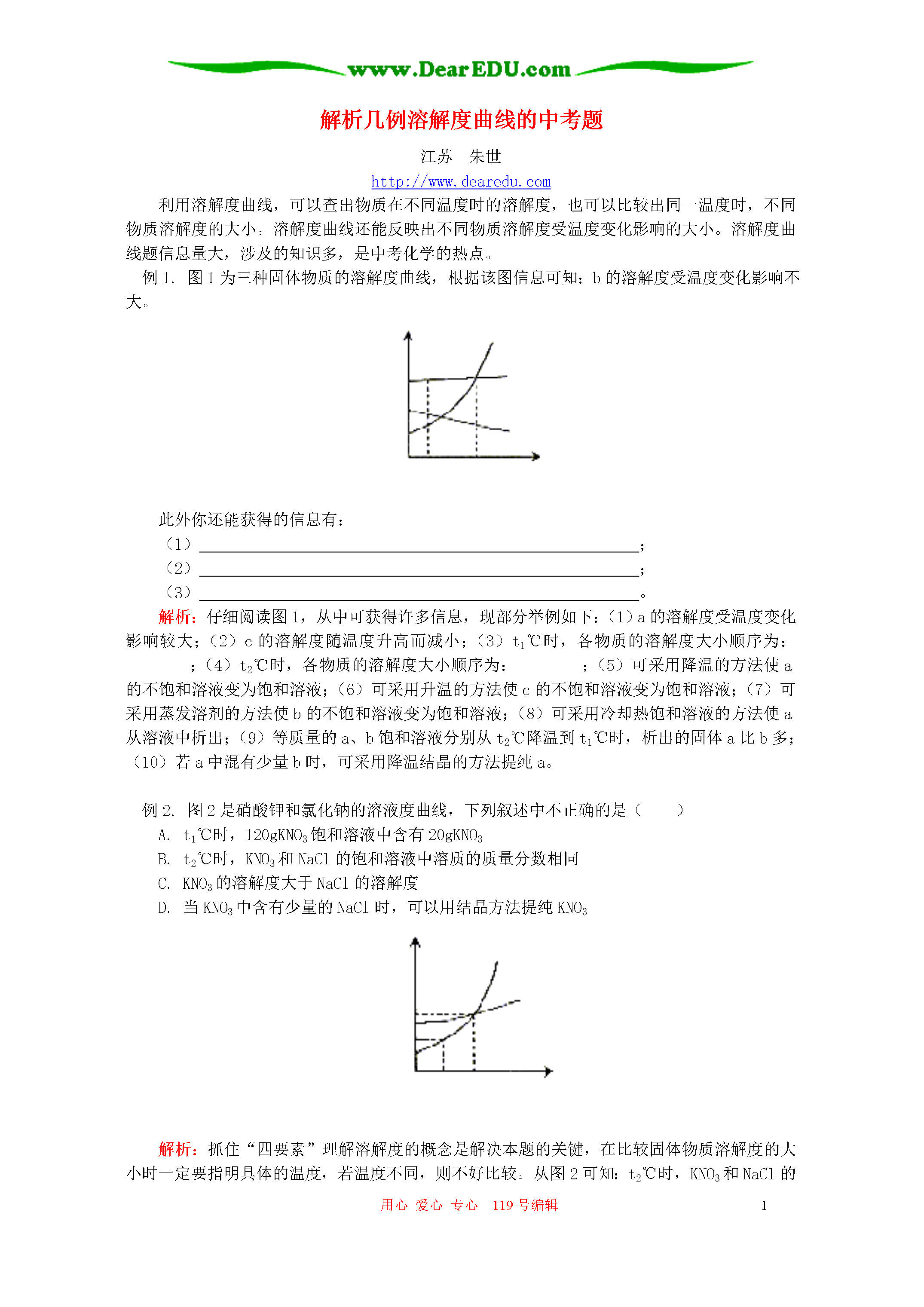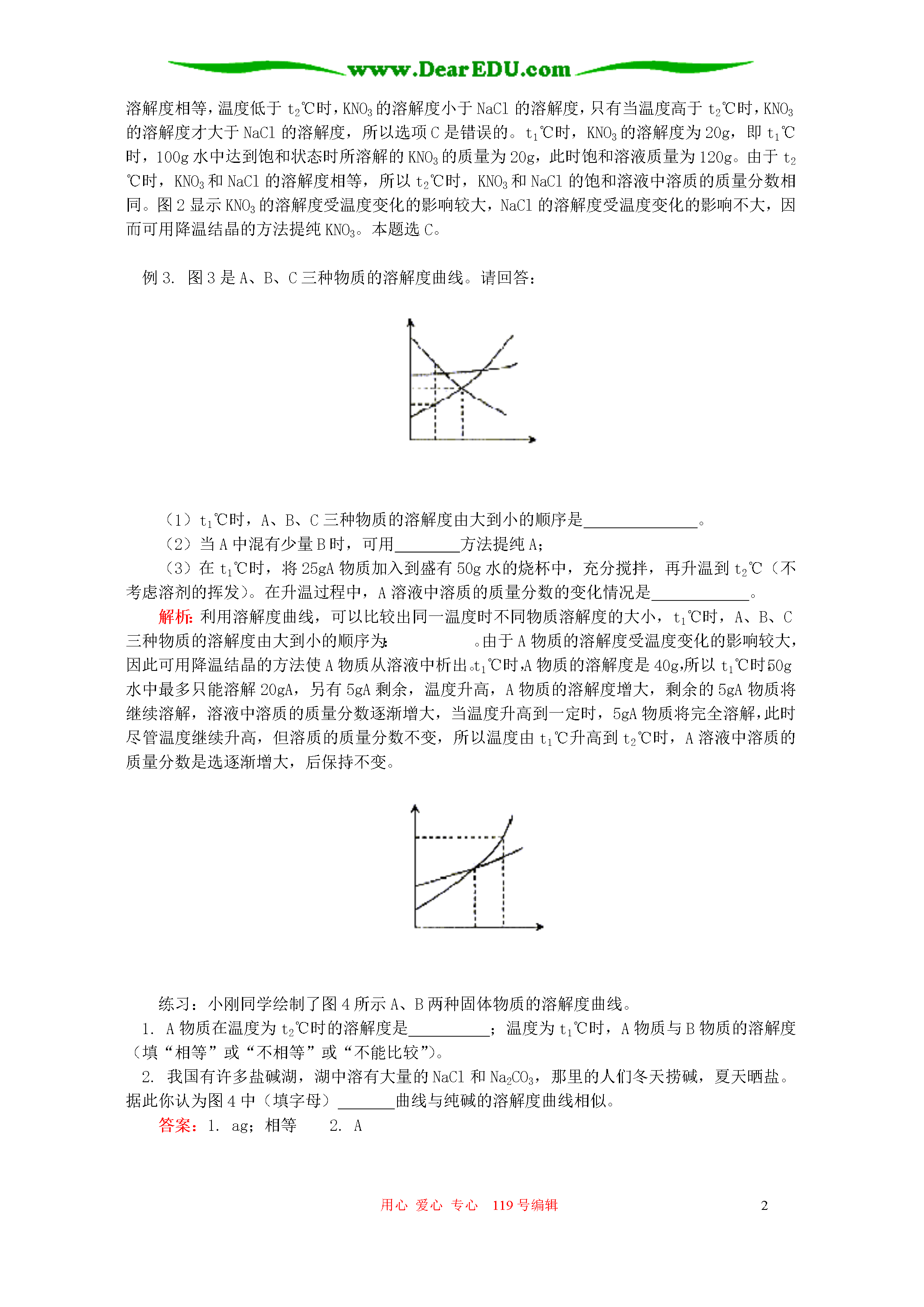 用心爱心专心119号编辑2解析几例溶解度曲线的中考题江苏朱世http://www.dearedu.com利用溶解度曲线,可以查出物质在不同温度时的溶解度,也可以比较出同一温度时,不同物质溶解度的大小。溶解度曲线还能反映出不同物质溶解度受温度变化影响的大小。溶解度曲线题信息量大,涉及的知识多,是中考化学的热点。例1.图1为三种固体物质的溶解度曲线,根据该图信息可知:b的溶解度受温度变化影响不大。此外你还能获得的信息有:(1);(2);(3)。解析:仔细阅读图1,从中可获得许多信息,现部分举例如下:(1)a的溶解度受温度变化影响较大;(2)c的溶解度随温度升高而减小;(3)t1℃时,各物质的溶解度大小顺序为:;(4)t2℃时,各物质的溶解度大小顺序为:;(5)可采用降温的方法使a的不饱和溶液变为饱和溶液;(6)可采用升温的方法使c的不饱和溶液变为饱和溶液;(7)可采用蒸发溶剂的方法使b的不饱和溶液变为饱和溶液;(8)可采用冷却热饱和溶液的方法使a从溶液中析出;(9)等质量的a、b饱和溶液分别从t2℃降温到t1℃时,析出的固体a比b多;(10)若a中混有少量b时,可采用降温结晶的方法提纯a。例2.图2是硝酸钾和氯化钠的溶液度曲线,下列叙述中不正确的是()A.t1℃时,120gKNO3饱和溶液中含有20gKNO3B.t2℃时,KNO3和NaCl的饱和溶液中溶质的质量分数相同C.KNO3的溶解度大于NaCl的溶解度D.当KNO3中含有少量的NaCl时,可以用结晶方法提纯KNO3解析:抓住“四要素”理解溶解度的概念是解决本题的关键,在比较固体物质溶解度的大小时一定要指明具体的温度,若温度不同,则不好比较。从图2可知:t2℃时,KNO3和NaCl的溶解度相等,温度低于t2℃时,KNO3的溶解度小于NaCl的溶解度,只有当温度高于t2℃时,KNO3的溶解度才大于NaCl的溶解度,所以选项C是错误的。t1℃时,KNO3的溶解度为20g,即t1℃时,100g水中达到饱和状态时所溶解的KNO3的质量为20g,此时饱和溶液质量为120g。由于t2℃时,KNO3和NaCl的溶解度相等,所以t2℃时,KNO3和NaCl的饱和溶液中溶质的质量分数相同。图2显示KNO3的溶解度受温度变化的影响较大,NaCl的溶解度受温度变化的影响不大,因而可用降温结晶的方法提纯KNO3。本题选C。例3.图3是A、B、C三种物质的溶解度曲线。请回答:(1)t1℃时,A、B、C三种物质的溶解度由大到小的顺序是。(2)当A中混有少量B时,可用方法提纯A;(3)在t1℃时,将25gA物质加入到盛有50g水的烧杯中,充分搅拌,再升温到t2℃(不考虑溶剂的挥发)。在升温过程中,A溶液中溶质的质量分数的变化情况是。解析:利用溶解度曲线,可以比较出同一温度时不同物质溶解度的大小,t1℃时,A、B、C三种物质的溶解度由大到小的顺序为:。由于A物质的溶解度受温度变化的影响较大,因此可用降温结晶的方法使A物质从溶液中析出。t1℃时,A物质的溶解度是40g,所以t1℃时,50g水中最多只能溶解20gA,另有5gA剩余,温度升高,A物质的溶解度增大,剩余的5gA物质将继续溶解,溶液中溶质的质量分数逐渐增大,当温度升高到一定时,5gA物质将完全溶解,此时尽管温度继续升高,但溶质的质量分数不变,所以温度由t1℃升高到t2℃时,A溶液中溶质的质量分数是选逐渐增大,后保持不变。练习:小刚同学绘制了图4所示A、B两种固体物质的溶解度曲线。1.A物质在温度为t2℃时的溶解度是;温度为t1℃时,A物质与B物质的溶解度(填“相等”或“不相等”或“不能比较”)。2.我国有许多盐碱湖,湖中溶有大量的NaCl和Na2CO3,那里的人们冬天捞碱,夏天晒盐。据此你认为图4中(填字母)曲线与纯碱的溶解度曲线相似。答案:1.ag;相等2.A