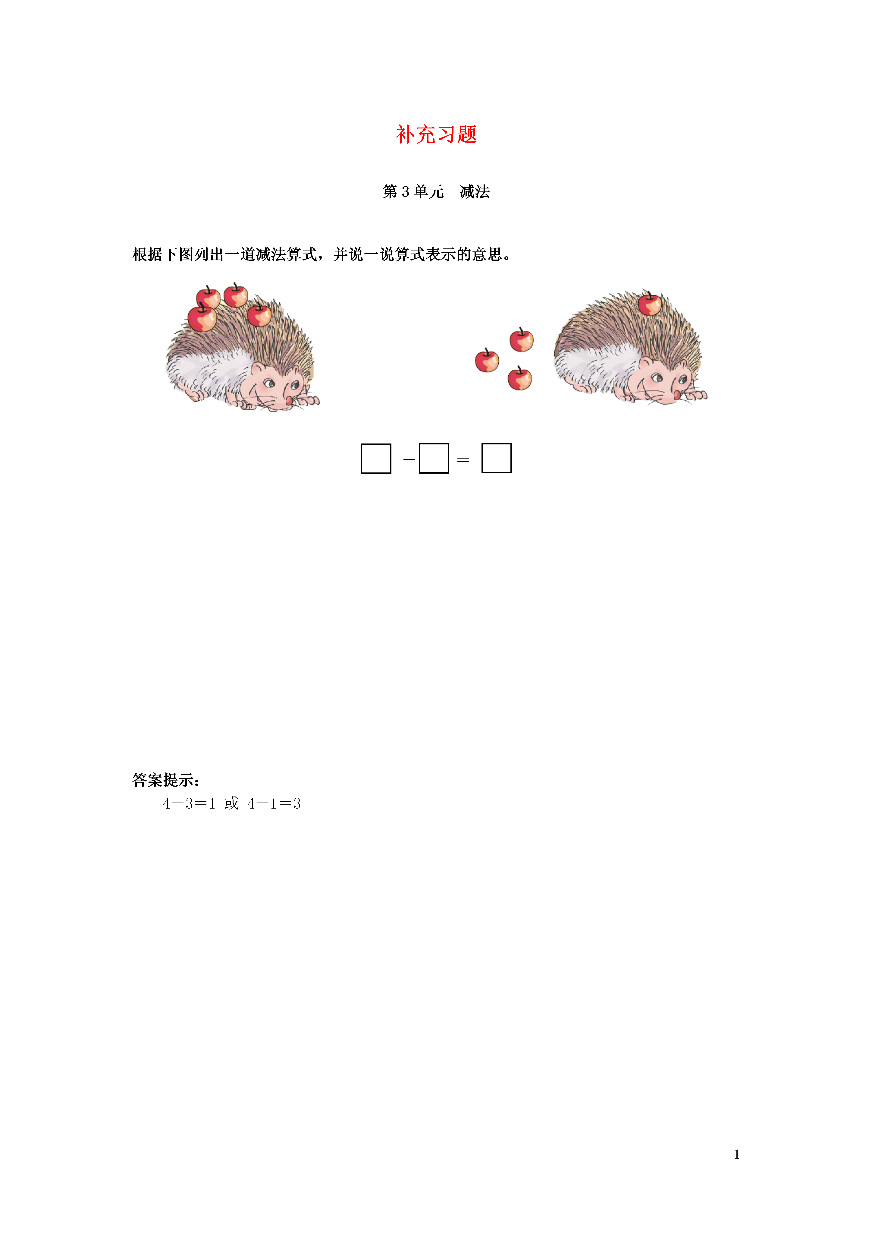 1补充习题第3单元减法根据下图列出一道减法算式,并说一说算式表示的意思。-=答案提示:4-3=1或4-1=3
