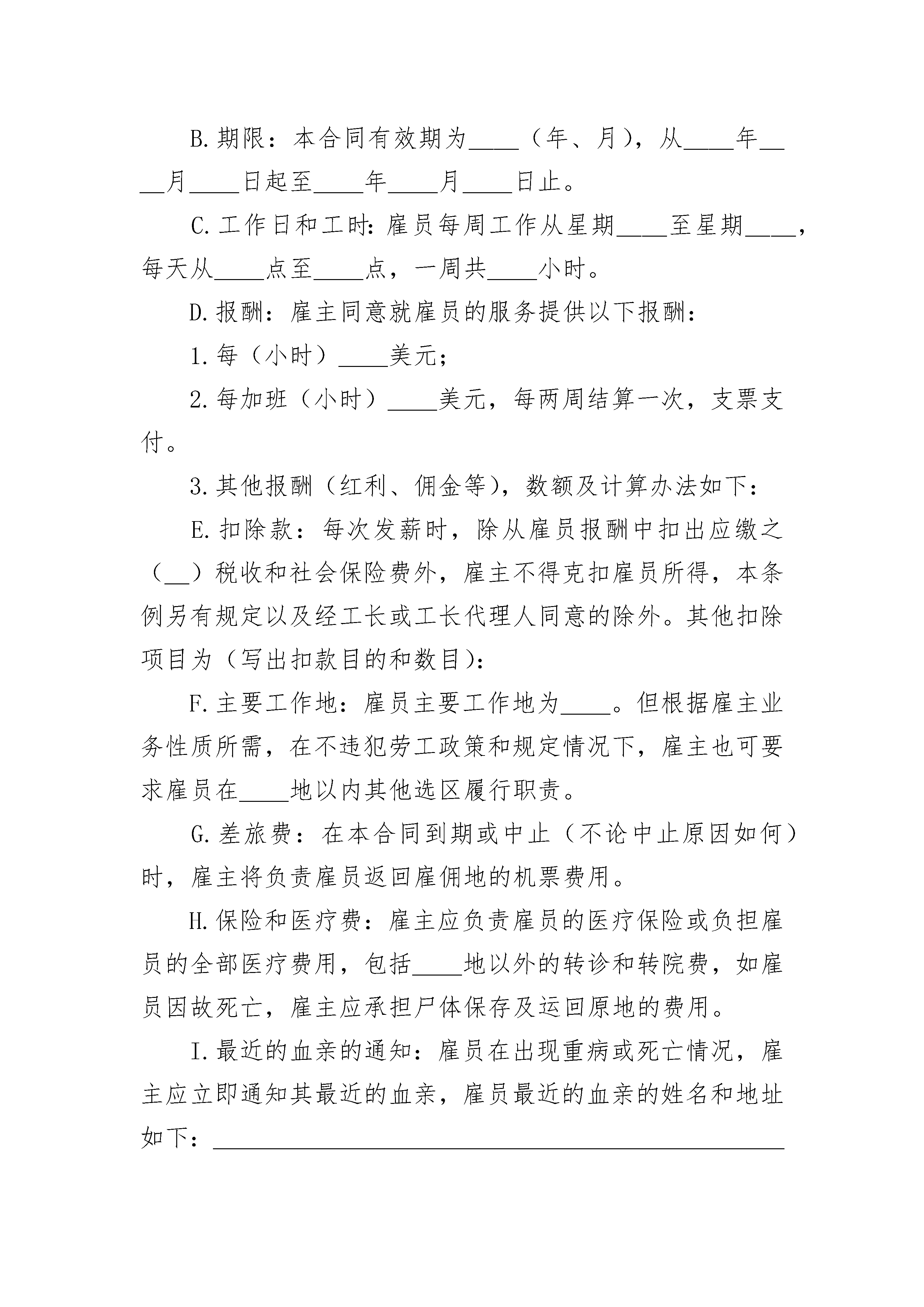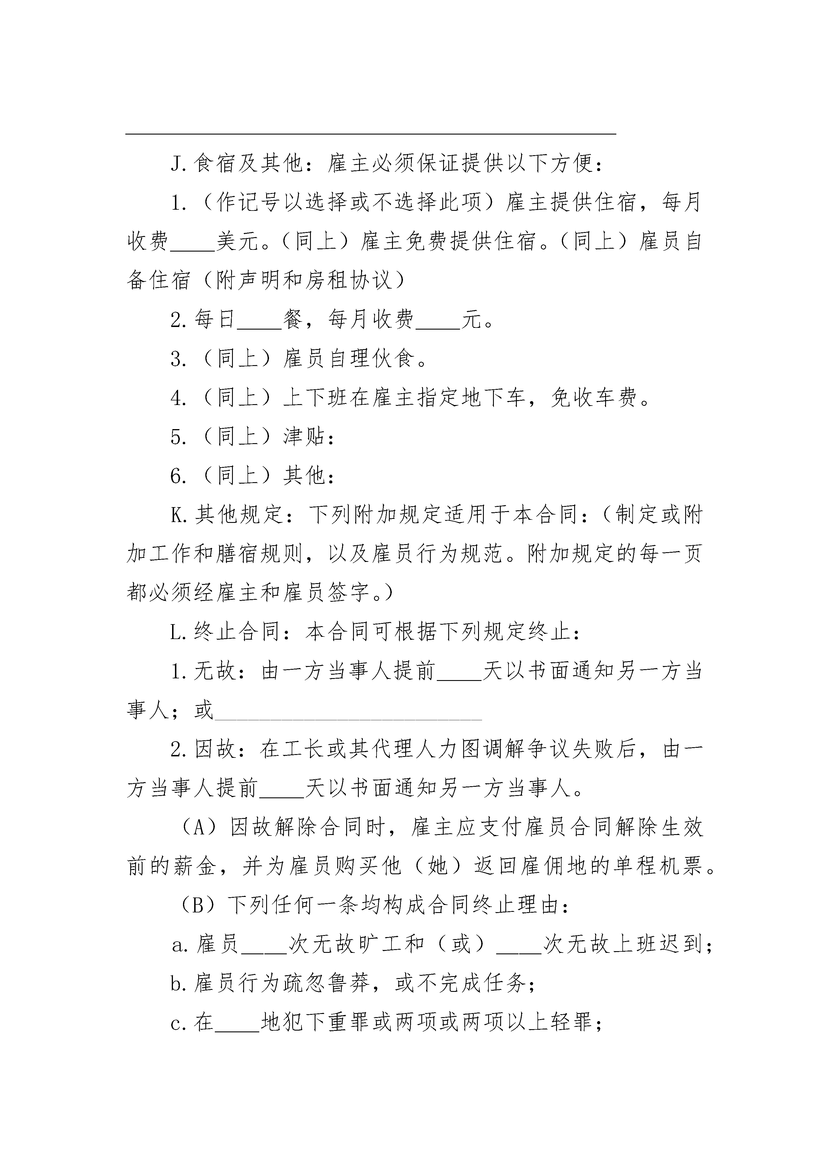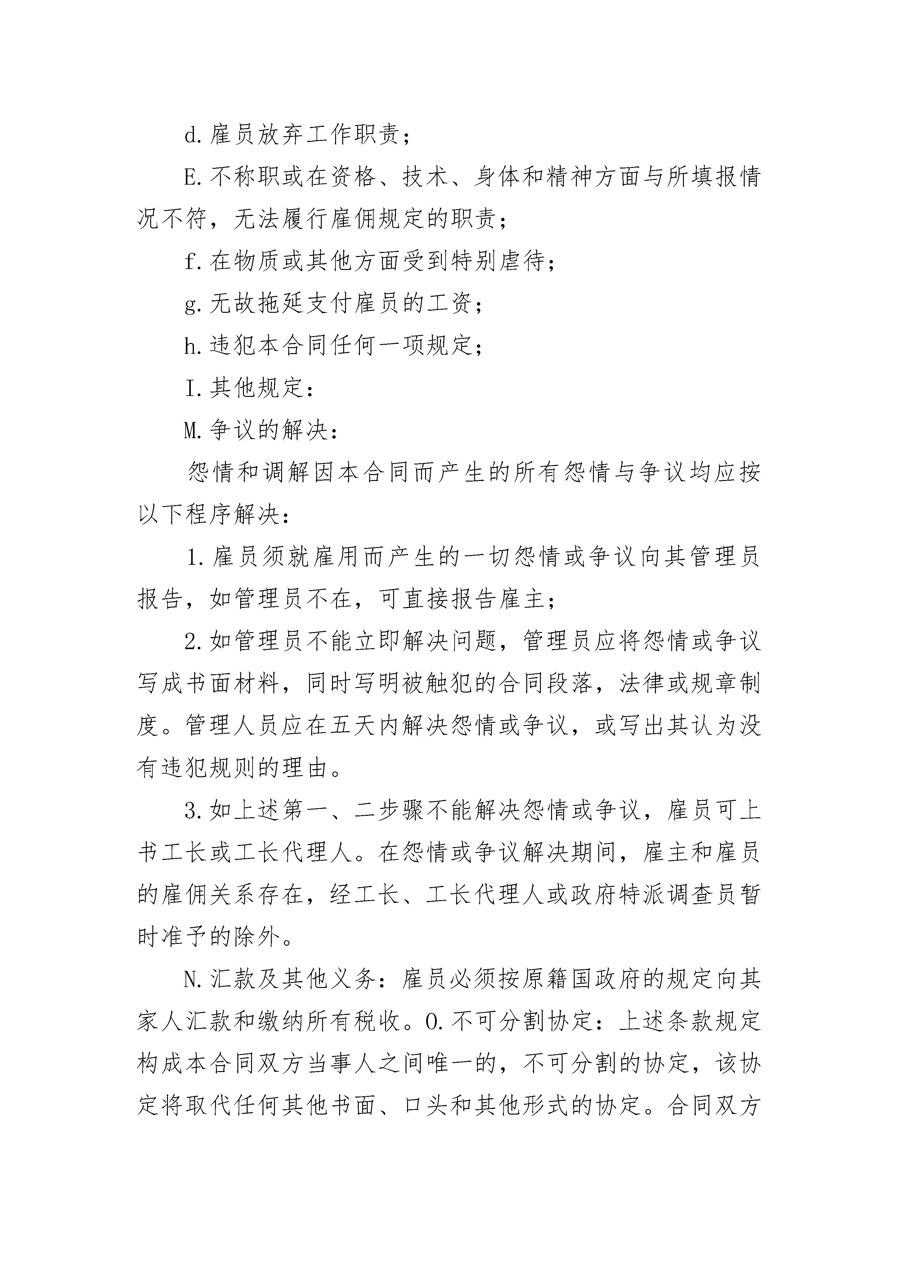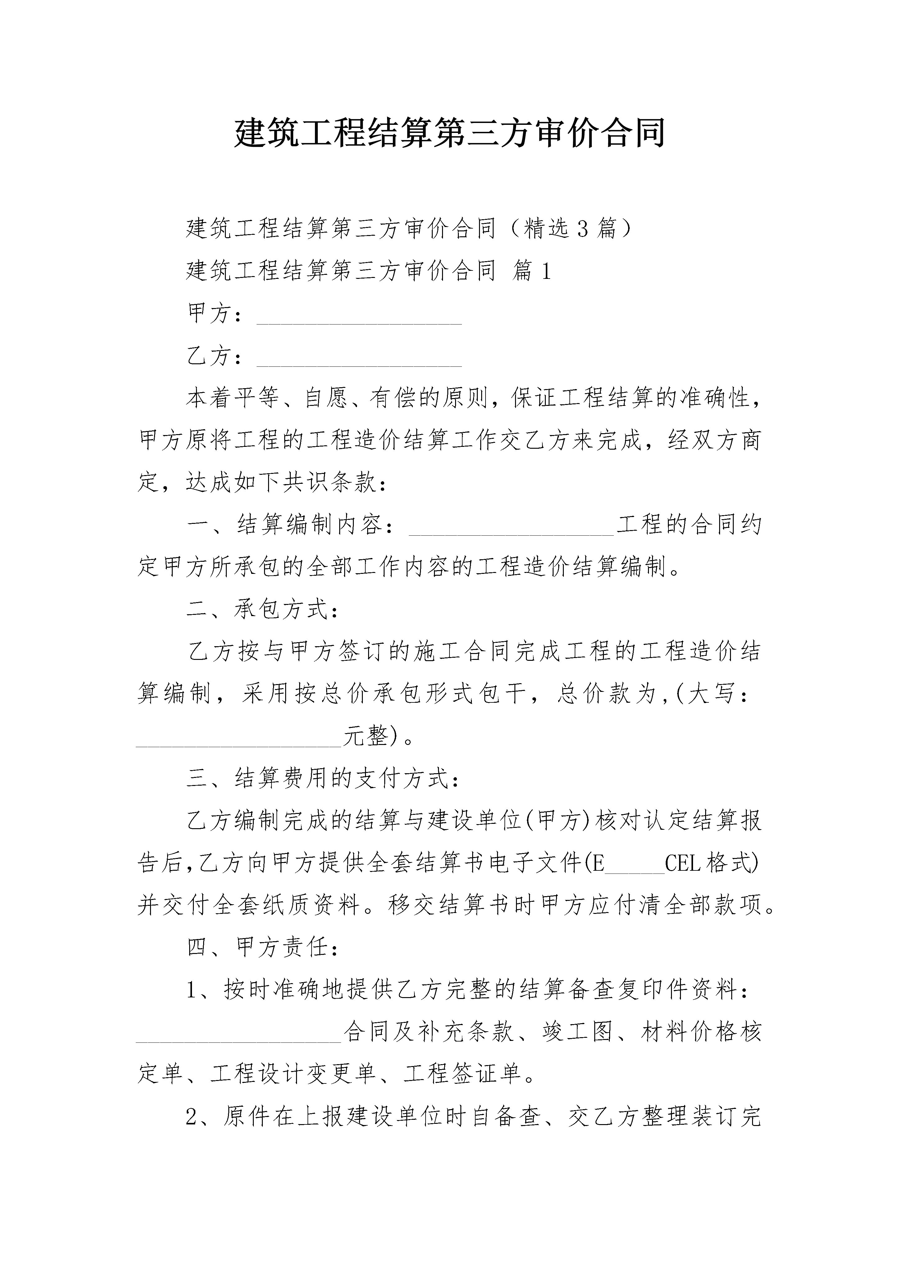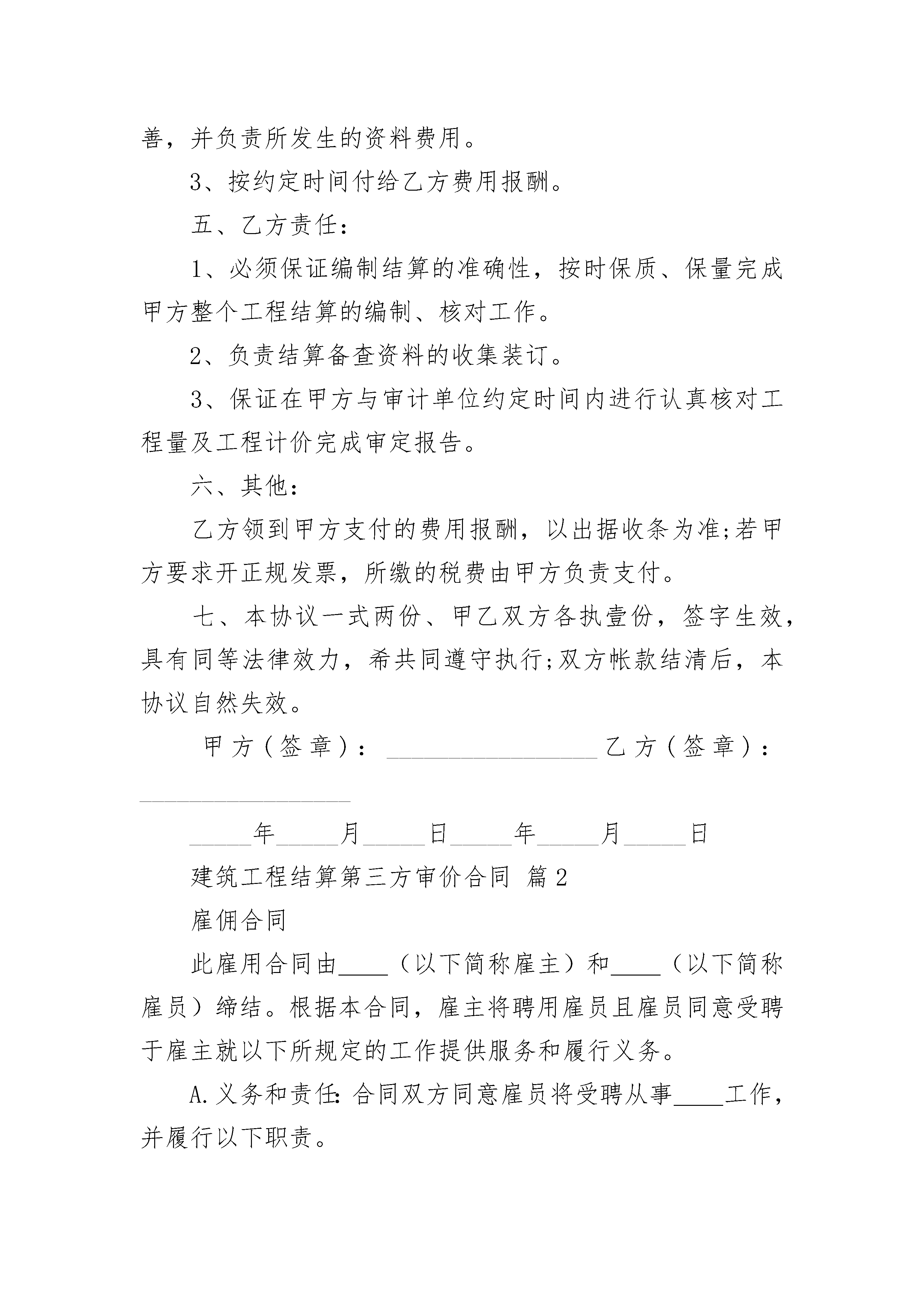 建筑工程结算第三方审价合同建筑工程结算第三方审价合同(精选3篇)建筑工程结算第三方审价合同篇1甲方:_________________乙方:_________________本着平等、自愿、有偿的原则,保证工程结算的准确性,甲方原将工程的工程造价结算工作交乙方来完成,经双方商定,达成如下共识条款:一、结算编制内容:_________________工程的合同约定甲方所承包的全部工作内容的工程造价结算编制。二、承包方式:乙方按与甲方签订的施工合同完成工程的工程造价结算编制,采用按总价承包形式包干,总价款为,(大写:_________________元整)。三、结算费用的支付方式:乙方编制完成的结算与建设单位(甲方)核对认定结算报告后,乙方向甲方提供全套结算书电子文件(E_____CEL格式)并交付全套纸质资料。移交结算书时甲方应付清全部款项。四、甲方责任:1、按时准确地提供乙方完整的结算备查复印件资料:_________________合同及补充条款、竣工图、材料价格核定单、工程设计变更单、工程签证单。2、原件在上报建设单位时自备查、交乙方整理装订完善,并负责所发生的资料费用。3、按约定时间付给乙方费用报酬。五、乙方责任:1、必须保证编制结算的准确性,按时保质、保量完成甲方整个工程结算的编制、核对工作。2、负责结算备查资料的收集装订。3、保证在甲方与审计单位约定时间内进行认真核对工程量及工程计价完成审定报告。六、其他:乙方领到甲方支付的费用报酬,以出据收条为准;若甲方要求开正规发票,所缴的税费由甲方负责支付。七、本协议一式两份、甲乙双方各执壹份,签字生效,具有同等法律效力,希共同遵守执行;双方帐款结清后,本协议自然失效。甲方(签章):_________________乙方(签章):______________________年_____月_____日_____年_____月_____日建筑工程结算第三方审价合同篇2雇佣合同此雇用合同由__(以下简称雇主)和__(以下简称雇员)缔结。根据本合同,雇主将聘用雇员且雇员同意受聘于雇主就以下所规定的工作提供服务和履行义务。A.义务和责任:合同双方同意雇员将受聘从事__工作,并履行以下职责。B.期限:本合同有效期为__(年、月),从__年__月__日起至__年__月__日止。C.工作日和工时:雇员每周工作从星期__至星期__,每天从__点至__点,一周共__小时。D.报酬:雇主同意就雇员的服务提供以下报酬:1.每(小时)__美元;2.每加班(小时)__美元,每两周结算一次,支票支付。3.其他报酬(红利、佣金等),数额及计算办法如下:E.扣除款:每次发薪时,除从雇员报酬中扣出应缴之(_)税收和社会保险费外,雇主不得克扣雇员所得,本条例另有规定以及经工长或工长代理人同意的除外。其他扣除项目为(写出扣款目的和数目):F.主要工作地:雇员主要工作地为__。但根据雇主业务性质所需,在不违犯劳工政策和规定情况下,雇主也可要求雇员在__地以内其他选区履行职责。G.差旅费:在本合同到期或中止(不论中止原因如何)时,雇主将负责雇员返回雇佣地的机票费用。H.保险和医疗费:雇主应负责雇员的医疗保险或负担雇员的全部医疗费用,包括__地以外的转诊和转院费,如雇员因故死亡,雇主应承担尸体保存及运回原地的费用。I.最近的血亲的通知:雇员在出现重病或死亡情况,雇主应立即通知其最近的血亲,雇员最近的血亲的姓名和地址如下:_____________________________________________J.食宿及其他:雇主必须保证提供以下方便:1.(作记号以选择或不选择此项)雇主提供住宿,每月收费__美元。(同上)雇主免费提供住宿。(同上)雇员自备住宿(附声明和房租协议)2.每日__餐,每月收费__元。3.(同上)雇员自理伙食。4.(同上)上下班在雇主指定地下车,免收车费。5.(同上)津贴:6.(同上)其他:K.其他规定:下列附加规定适用于本合同:(制定或附加工作和膳宿规则,以及雇员行为规范。附加规定的每一页都必须经雇主和雇员签字。)L.终止合同:本合同可根据下列规定终止:1.无故:由一方当事人提前__天以书面通知另一方当事人;或________________________2.因故:在工长或其代理人力图调解争议失败后,由一方当事人提前__天以书面通知另一方当事人。(A)因故解除合同时,雇主应支付雇员合同解除生效前的薪金,并为雇员购买他(她)返回雇佣地的单程机票。(B)下列任何一条均构成合同终止理由:a.雇员__次无故旷工和(或)__次无故上班迟到;b.雇员行为疏忽鲁莽,或不完成任务;c.在__地犯下重罪或两项或两项以上轻罪;d.雇员放弃工作职责;E.不称职或在资格、技术、身体和精神方面与所填报情况不符,无法履