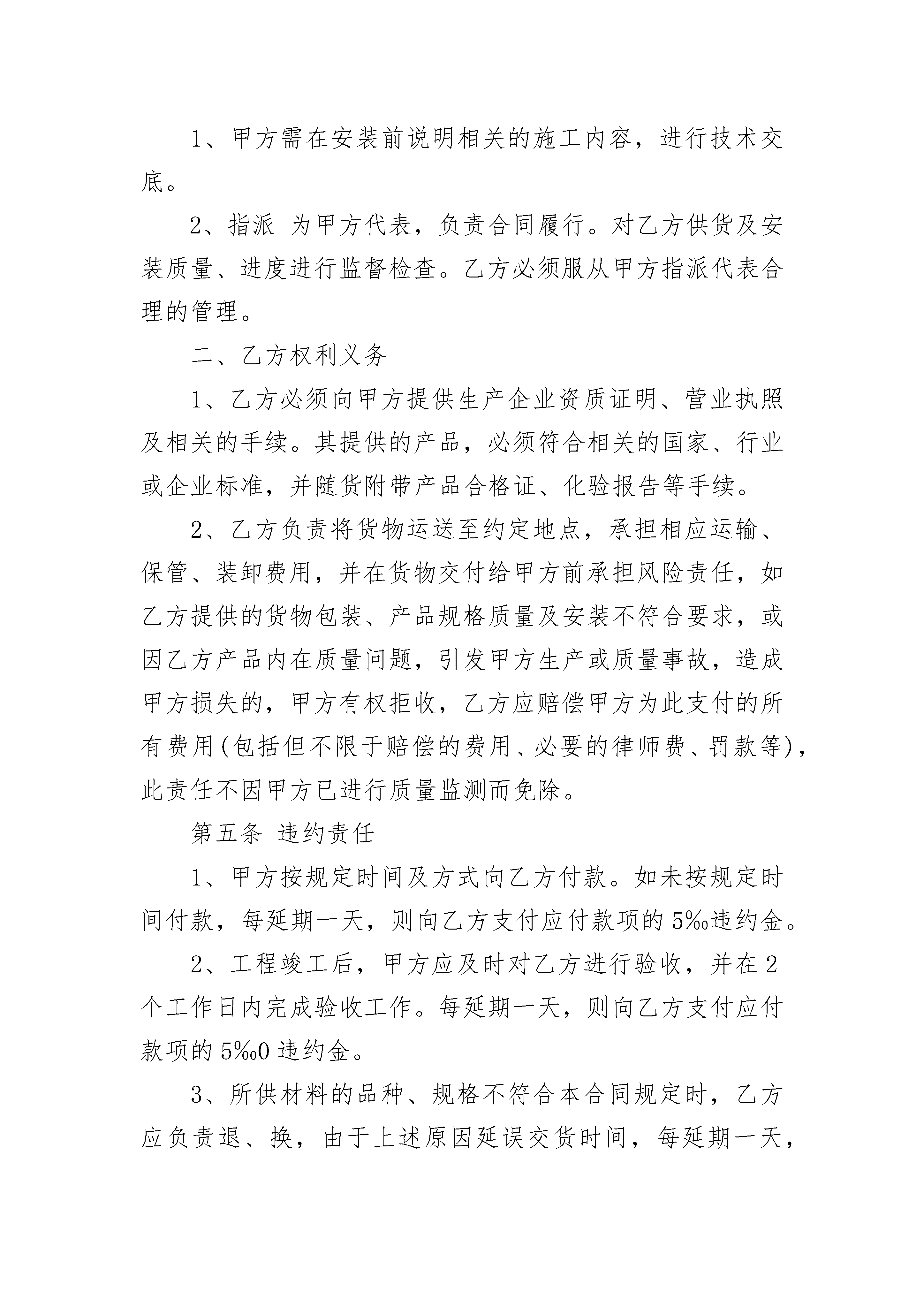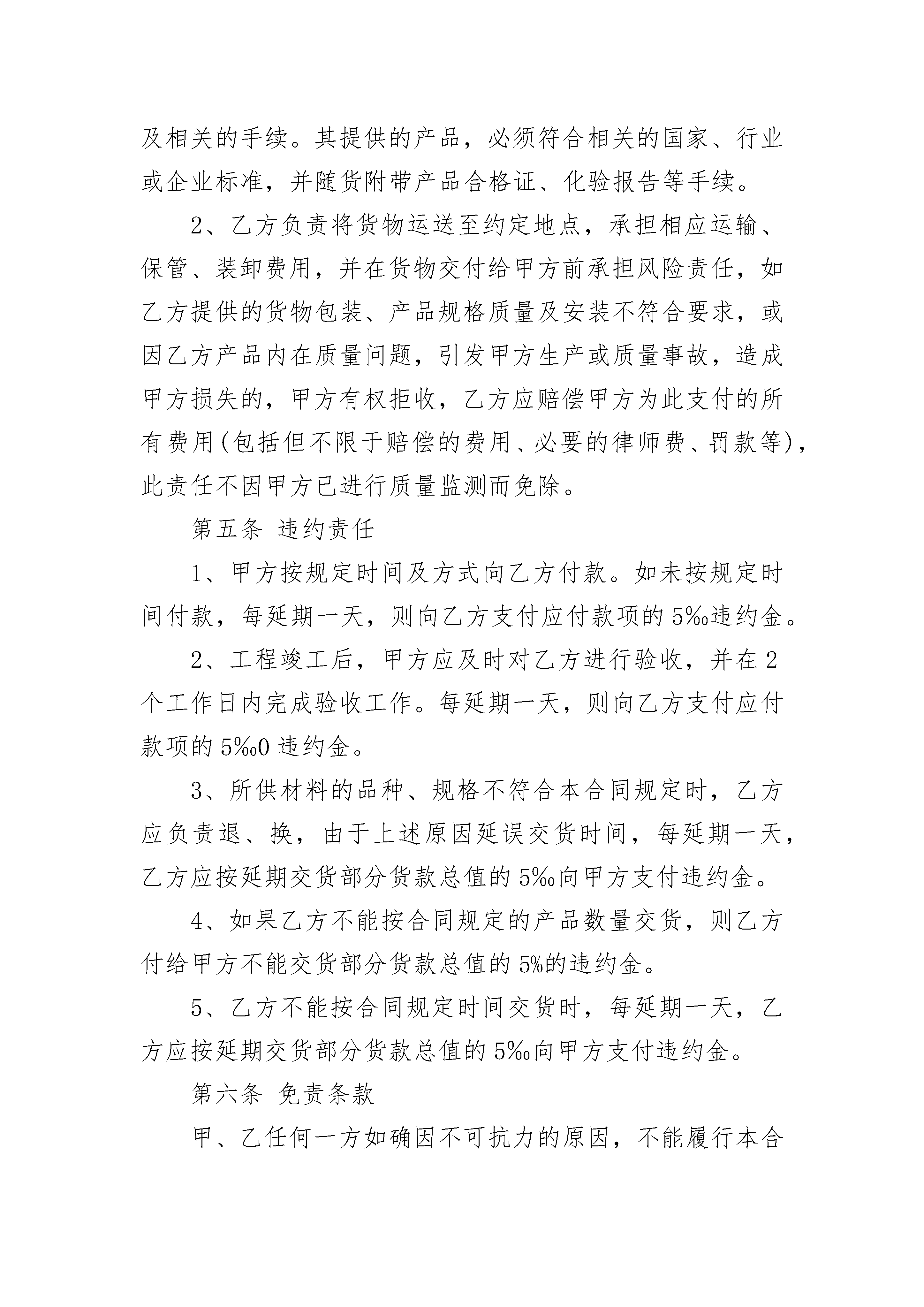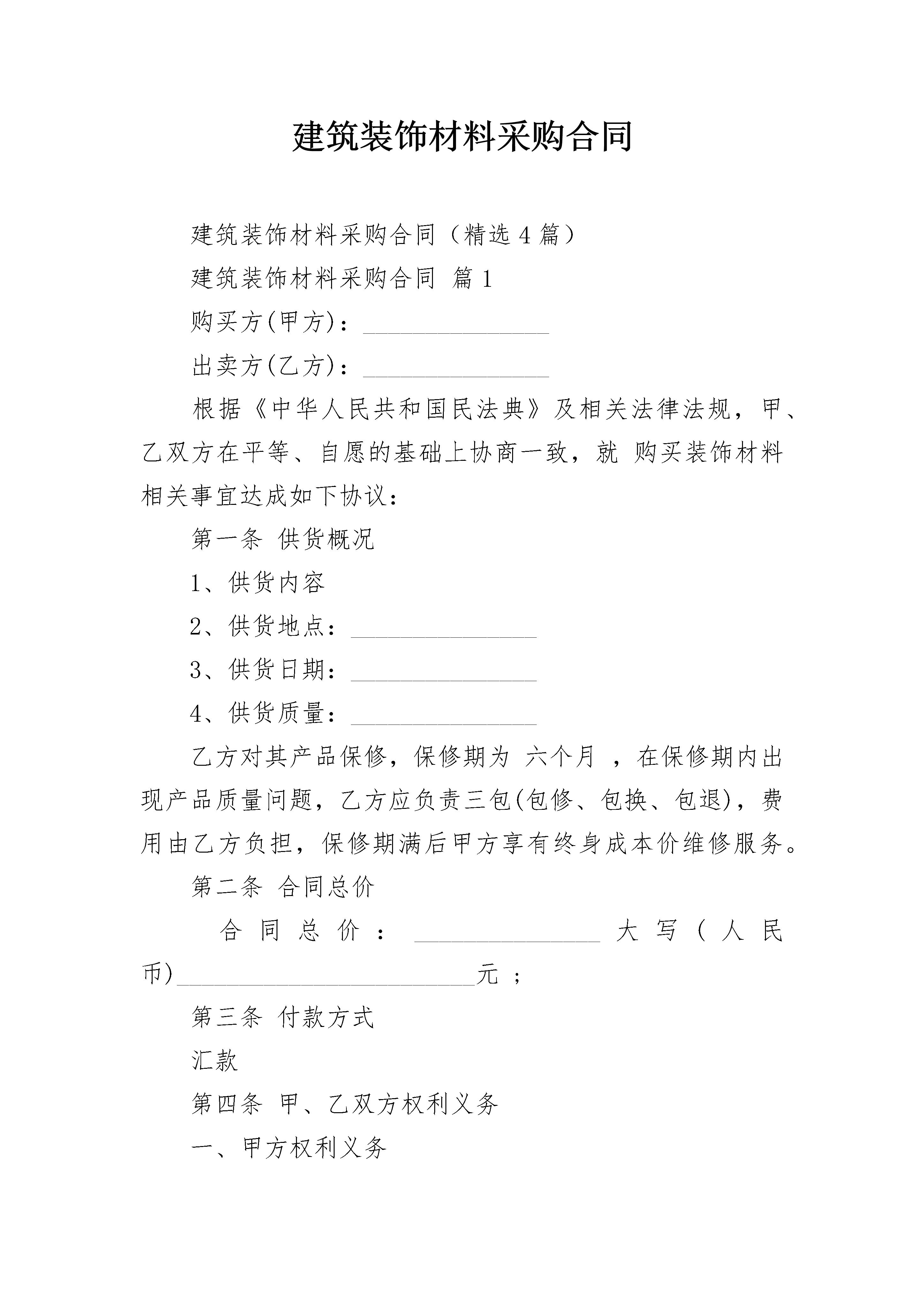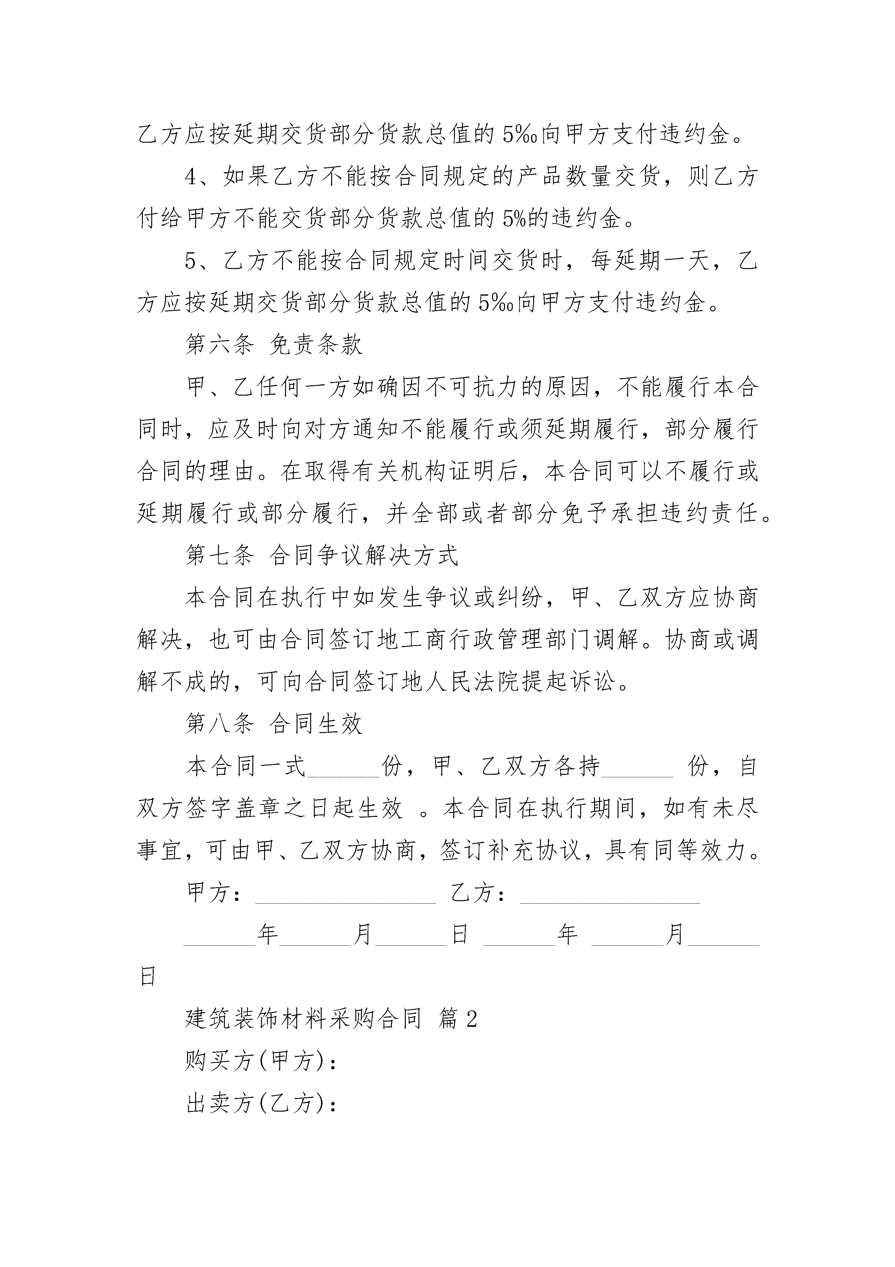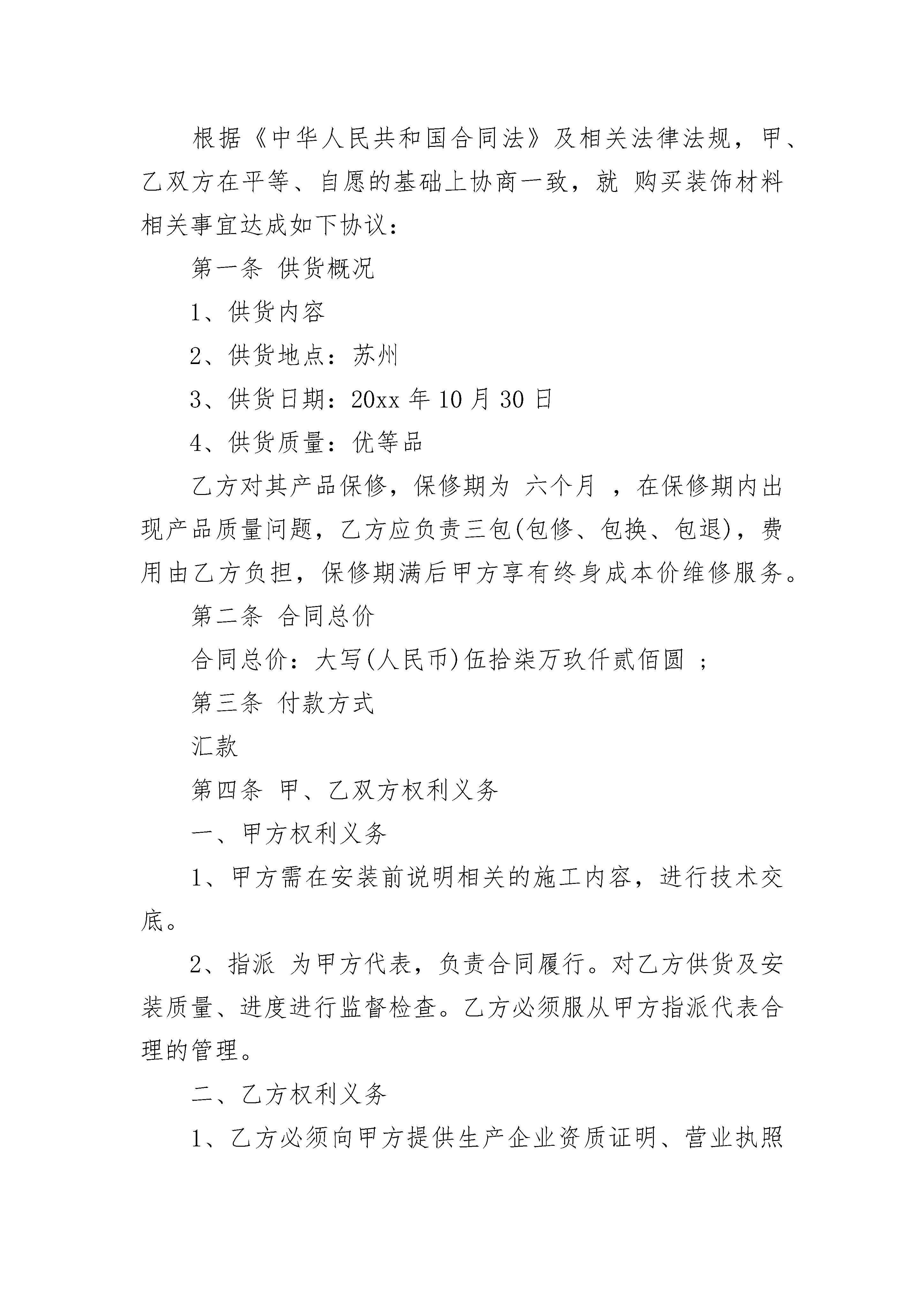 建筑装饰材料采购合同建筑装饰材料采购合同(精选4篇)建筑装饰材料采购合同篇1购买方(甲方):_______________出卖方(乙方):_______________根据《中华人民共和国民法典》及相关法律法规,甲、乙双方在平等、自愿的基础上协商一致,就购买装饰材料相关事宜达成如下协议:第一条供货概况1、供货内容2、供货地点:_______________3、供货日期:_______________4、供货质量:_______________乙方对其产品保修,保修期为六个月,在保修期内出现产品质量问题,乙方应负责三包(包修、包换、包退),费用由乙方负担,保修期满后甲方享有终身成本价维修服务。第二条合同总价合同总价:_______________大写(人民币)________________________元;第三条付款方式汇款第四条甲、乙双方权利义务一、甲方权利义务1、甲方需在安装前说明相关的施工内容,进行技术交底。2、指派为甲方代表,负责合同履行。对乙方供货及安装质量、进度进行监督检查。乙方必须服从甲方指派代表合理的管理。二、乙方权利义务1、乙方必须向甲方提供生产企业资质证明、营业执照及相关的手续。其提供的产品,必须符合相关的国家、行业或企业标准,并随货附带产品合格证、化验报告等手续。2、乙方负责将货物运送至约定地点,承担相应运输、保管、装卸费用,并在货物交付给甲方前承担风险责任,如乙方提供的货物包装、产品规格质量及安装不符合要求,或因乙方产品内在质量问题,引发甲方生产或质量事故,造成甲方损失的,甲方有权拒收,乙方应赔偿甲方为此支付的所有费用(包括但不限于赔偿的费用、必要的律师费、罚款等),此责任不因甲方已进行质量监测而免除。第五条违约责任1、甲方按规定时间及方式向乙方付款。如未按规定时间付款,每延期一天,则向乙方支付应付款项的5‰违约金。2、工程竣工后,甲方应及时对乙方进行验收,并在2个工作日内完成验收工作。每延期一天,则向乙方支付应付款项的5‰0违约金。3、所供材料的品种、规格不符合本合同规定时,乙方应负责退、换,由于上述原因延误交货时间,每延期一天,乙方应按延期交货部分货款总值的5‰向甲方支付违约金。4、如果乙方不能按合同规定的产品数量交货,则乙方付给甲方不能交货部分货款总值的5%的违约金。5、乙方不能按合同规定时间交货时,每延期一天,乙方应按延期交货部分货款总值的5‰向甲方支付违约金。第六条免责条款甲、乙任何一方如确因不可抗力的原因,不能履行本合同时,应及时向对方通知不能履行或须延期履行,部分履行合同的理由。在取得有关机构证明后,本合同可以不履行或延期履行或部分履行,并全部或者部分免予承担违约责任。第七条合同争议解决方式本合同在执行中如发生争议或纠纷,甲、乙双方应协商解决,也可由合同签订地工商行政管理部门调解。协商或调解不成的,可向合同签订地人民法院提起诉讼。第八条合同生效本合同一式______份,甲、乙双方各持______份,自双方签字盖章之日起生效。本合同在执行期间,如有未尽事宜,可由甲、乙双方协商,签订补充协议,具有同等效力。甲方:_______________乙方:_____________________年______月______日______年______月______日建筑装饰材料采购合同篇2购买方(甲方):出卖方(乙方):根据《中华人民共和国合同法》及相关法律法规,甲、乙双方在平等、自愿的基础上协商一致,就购买装饰材料相关事宜达成如下协议:第一条供货概况1、供货内容2、供货地点:苏州3、供货日期:20xx年10月30日4、供货质量:优等品乙方对其产品保修,保修期为六个月,在保修期内出现产品质量问题,乙方应负责三包(包修、包换、包退),费用由乙方负担,保修期满后甲方享有终身成本价维修服务。第二条合同总价合同总价:大写(人民币)伍拾柒万玖仟贰佰圆;第三条付款方式汇款第四条甲、乙双方权利义务一、甲方权利义务1、甲方需在安装前说明相关的施工内容,进行技术交底。2、指派为甲方代表,负责合同履行。对乙方供货及安装质量、进度进行监督检查。乙方必须服从甲方指派代表合理的管理。二、乙方权利义务1、乙方必须向甲方提供生产企业资质证明、营业执照及相关的手续。其提供的产品,必须符合相关的国家、行业或企业标准,并随货附带产品合格证、化验报告等手续。2、乙方负责将货物运送至约定地点,承担相应运输、保管、装卸费用,并在货物交付给甲方前承担风险责任,如乙方提供的货物包装、产品规格质量及安装不符合要求,或因乙方产品内在质量问题,引发甲方生产或质量事故,造成甲方损失的,甲方有权拒收,乙方应赔偿甲方为此支付的所有费用(包括但不限于赔偿的费用、必要的律师费、罚款等),此责任不因甲方已进行质量监测而免除。第五条违约责任1、甲方按规定时间