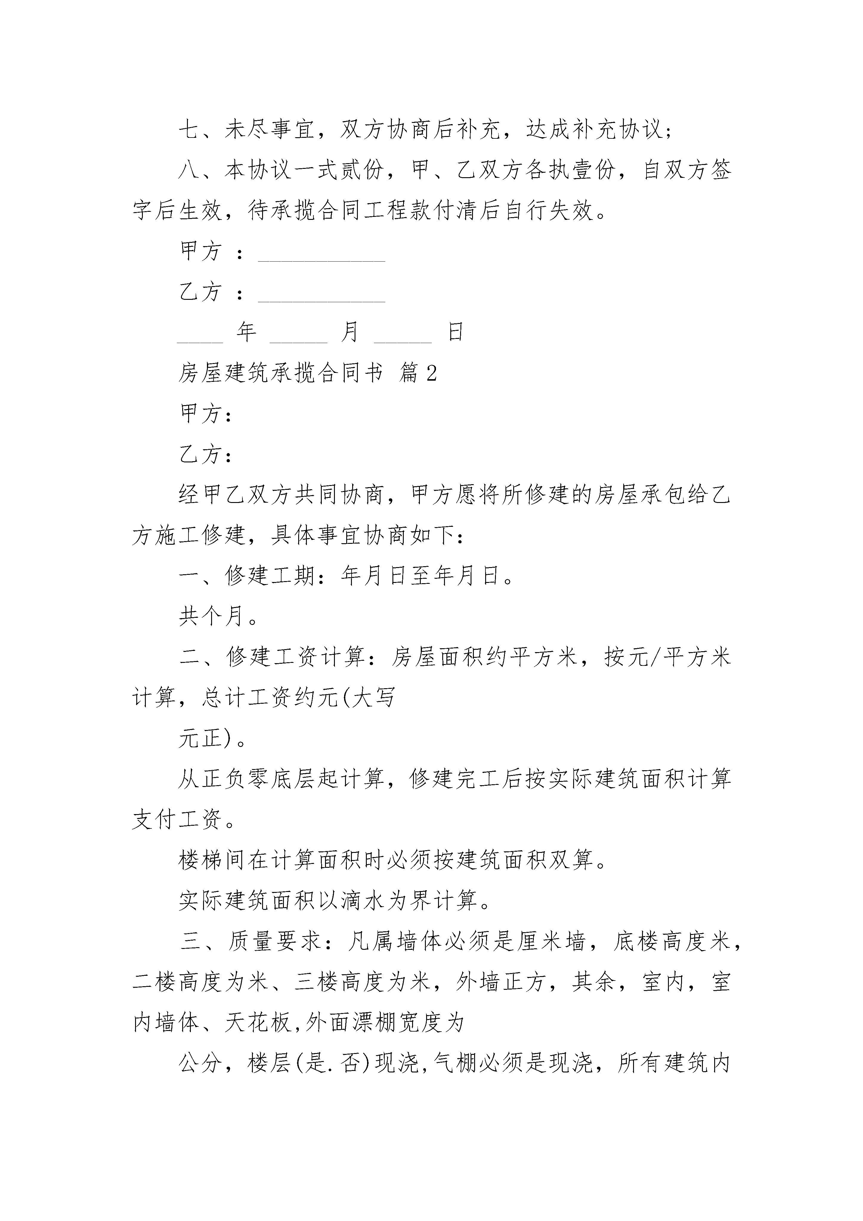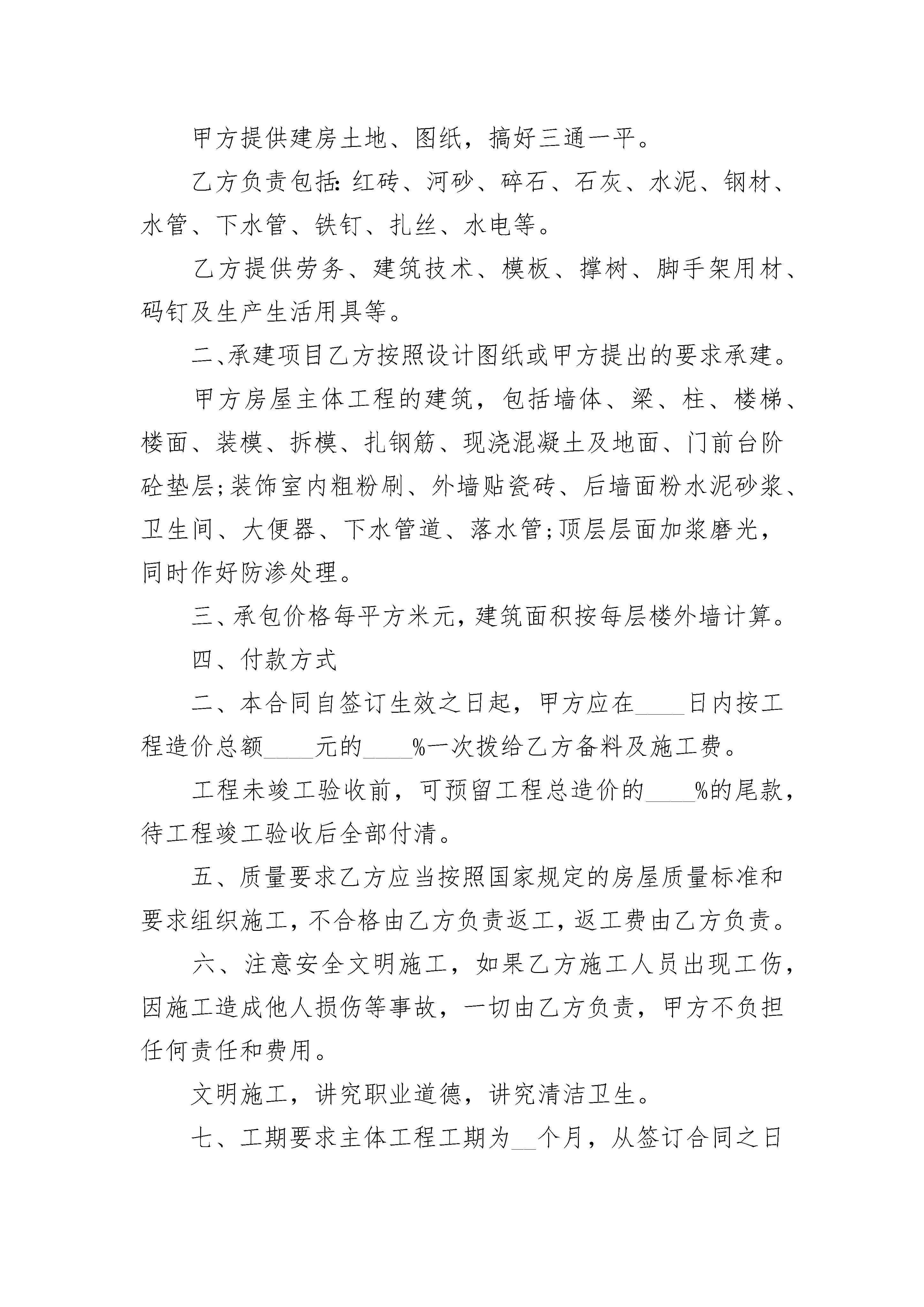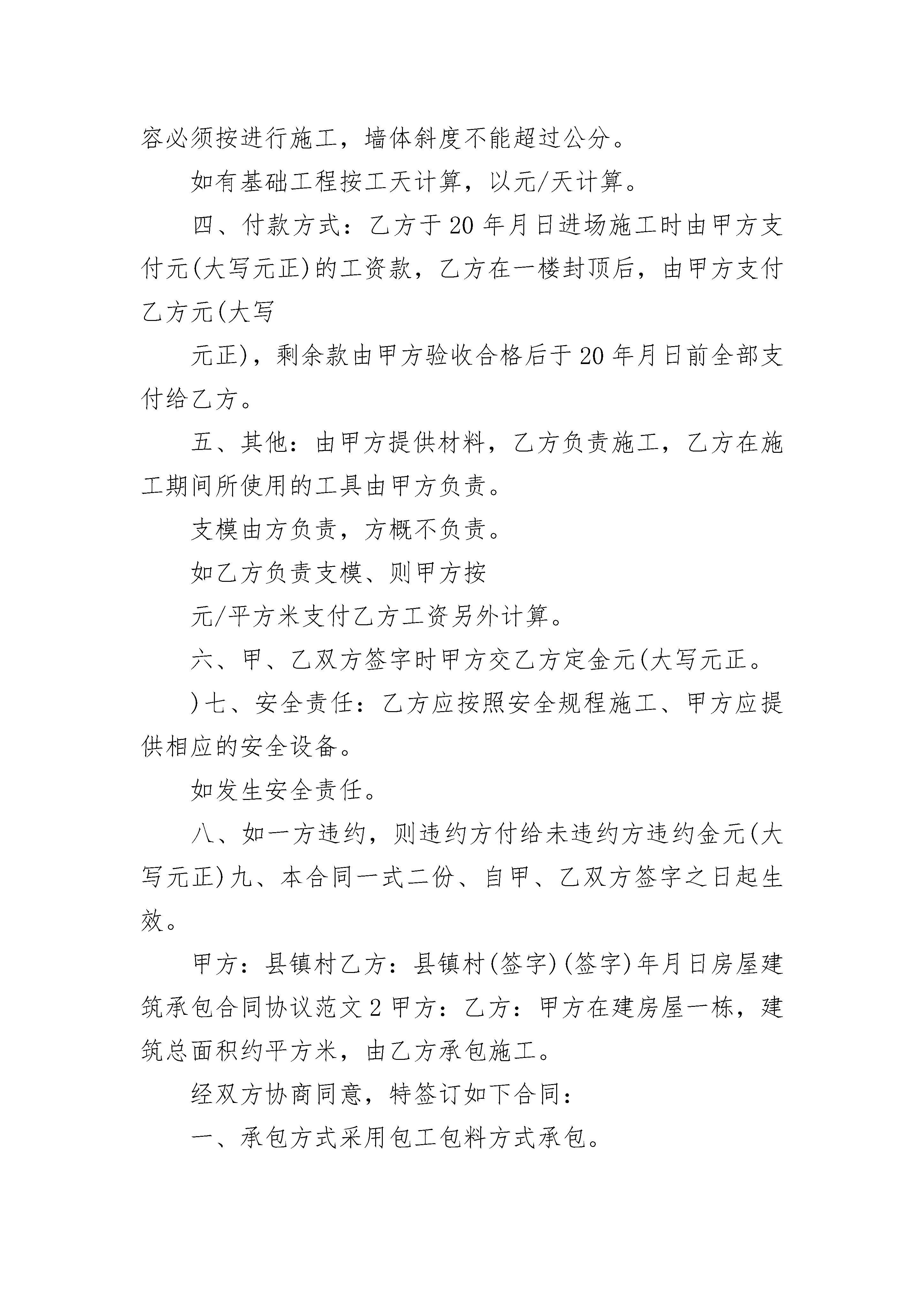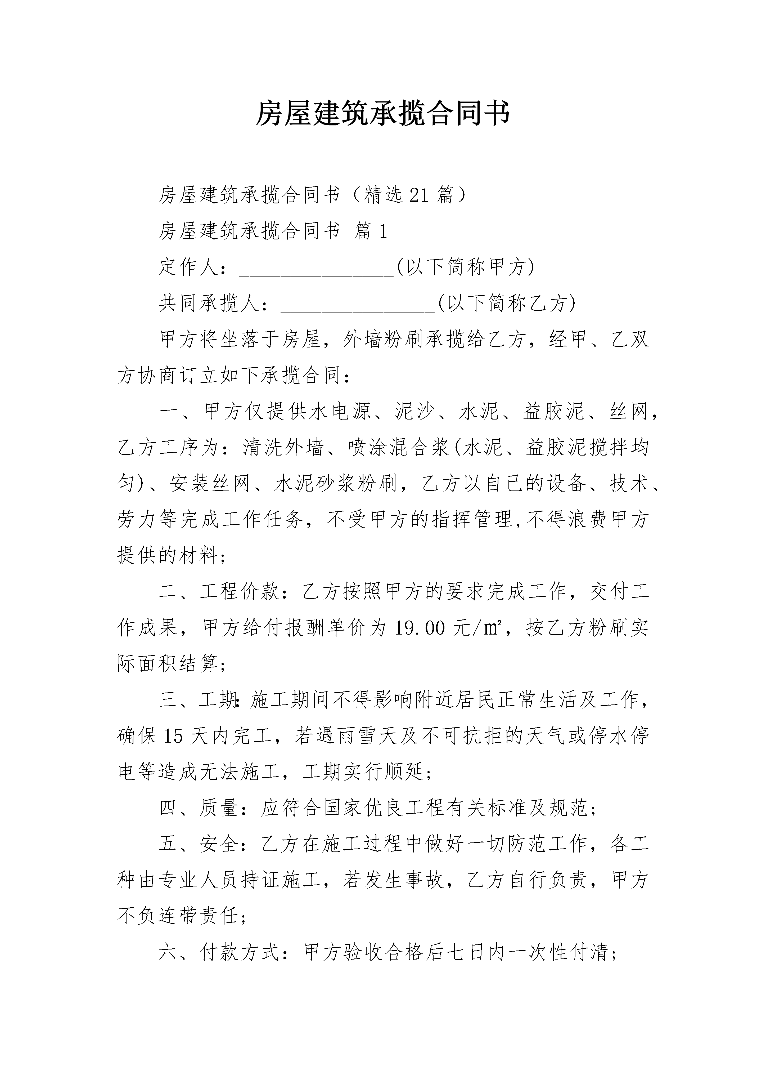 房屋建筑承揽合同书房屋建筑承揽合同书(精选21篇)房屋建筑承揽合同书篇1定作人:_______________(以下简称甲方)共同承揽人:_______________(以下简称乙方)甲方将坐落于房屋,外墙粉刷承揽给乙方,经甲、乙双方协商订立如下承揽合同:一、甲方仅提供水电源、泥沙、水泥、益胶泥、丝网,乙方工序为:清洗外墙、喷涂混合浆(水泥、益胶泥搅拌均匀)、安装丝网、水泥砂浆粉刷,乙方以自己的设备、技术、劳力等完成工作任务,不受甲方的指挥管理,不得浪费甲方提供的材料;二、工程价款:乙方按照甲方的要求完成工作,交付工作成果,甲方给付报酬单价为19.00元/㎡,按乙方粉刷实际面积结算;三、工期:施工期间不得影响附近居民正常生活及工作,确保15天内完工,若遇雨雪天及不可抗拒的天气或停水停电等造成无法施工,工期实行顺延;四、质量:应符合国家优良工程有关标准及规范;五、安全:乙方在施工过程中做好一切防范工作,各工种由专业人员持证施工,若发生事故,乙方自行负责,甲方不负连带责任;六、付款方式:甲方验收合格后七日内一次性付清;七、未尽事宜,双方协商后补充,达成补充协议;八、本协议一式贰份,甲、乙双方各执壹份,自双方签字后生效,待承揽合同工程款付清后自行失效。甲方:___________乙方:_______________年_____月_____日房屋建筑承揽合同书篇2甲方:乙方:经甲乙双方共同协商,甲方愿将所修建的房屋承包给乙方施工修建,具体事宜协商如下:一、修建工期:年月日至年月日。共个月。二、修建工资计算:房屋面积约平方米,按元/平方米计算,总计工资约元(大写元正)。从正负零底层起计算,修建完工后按实际建筑面积计算支付工资。楼梯间在计算面积时必须按建筑面积双算。实际建筑面积以滴水为界计算。三、质量要求:凡属墙体必须是厘米墙,底楼高度米,二楼高度为米、三楼高度为米,外墙正方,其余,室内,室内墙体、天花板,外面漂棚宽度为公分,楼层(是.否)现浇,气棚必须是现浇,所有建筑内容必须按进行施工,墙体斜度不能超过公分。如有基础工程按工天计算,以元/天计算。四、付款方式:乙方于20年月日进场施工时由甲方支付元(大写元正)的工资款,乙方在一楼封顶后,由甲方支付乙方元(大写元正),剩余款由甲方验收合格后于20年月日前全部支付给乙方。五、其他:由甲方提供材料,乙方负责施工,乙方在施工期间所使用的工具由甲方负责。支模由方负责,方概不负责。如乙方负责支模、则甲方按元/平方米支付乙方工资另外计算。六、甲、乙双方签字时甲方交乙方定金元(大写元正。)七、安全责任:乙方应按照安全规程施工、甲方应提供相应的安全设备。如发生安全责任。八、如一方违约,则违约方付给未违约方违约金元(大写元正)九、本合同一式二份、自甲、乙双方签字之日起生效。甲方:县镇村乙方:县镇村(签字)(签字)年月日房屋建筑承包合同协议范文2甲方:乙方:甲方在建房屋一栋,建筑总面积约平方米,由乙方承包施工。经双方协商同意,特签订如下合同:一、承包方式采用包工包料方式承包。甲方提供建房土地、图纸,搞好三通一平。乙方负责包括:红砖、河砂、碎石、石灰、水泥、钢材、水管、下水管、铁钉、扎丝、水电等。乙方提供劳务、建筑技术、模板、撑树、脚手架用材、码钉及生产生活用具等。二、承建项目乙方按照设计图纸或甲方提出的要求承建。甲方房屋主体工程的建筑,包括墙体、梁、柱、楼梯、楼面、装模、拆模、扎钢筋、现浇混凝土及地面、门前台阶砼垫层;装饰室内粗粉刷、外墙贴瓷砖、后墙面粉水泥砂浆、卫生间、大便器、下水管道、落水管;顶层层面加浆磨光,同时作好防渗处理。三、承包价格每平方米元,建筑面积按每层楼外墙计算。四、付款方式二、本合同自签订生效之日起,甲方应在____日内按工程造价总额____元的____%一次拨给乙方备料及施工费。工程未竣工验收前,可预留工程总造价的____%的尾款,待工程竣工验收后全部付清。五、质量要求乙方应当按照国家规定的房屋质量标准和要求组织施工,不合格由乙方负责返工,返工费由乙方负责。六、注意安全文明施工,如果乙方施工人员出现工伤,因施工造成他人损伤等事故,一切由乙方负责,甲方不负担任何责任和费用。文明施工,讲究职业道德,讲究清洁卫生。七、工期要求主体工程工期为__个月,从签订合同之日起计算,乙方必须在__日前完成主体工程,完工时间不能超过__天,乙方不能因各种原因拖延甲方建房完工时间。八、质量保修期乙方在组织施工中必须坚持“百年大计,质量第一”的方针,组织施工,要求全部工程达到合格标准;屋面防水工程,卫生间、房间和外墙面的防渗漏为2年九、其它未尽事宜,由甲乙双方协商解决。本合同一式二份,甲乙双方各执一份,从签字之日起生效。甲方签字(章):乙方签字(章):房屋建筑承揽合同书篇3房主人(甲方):_________
