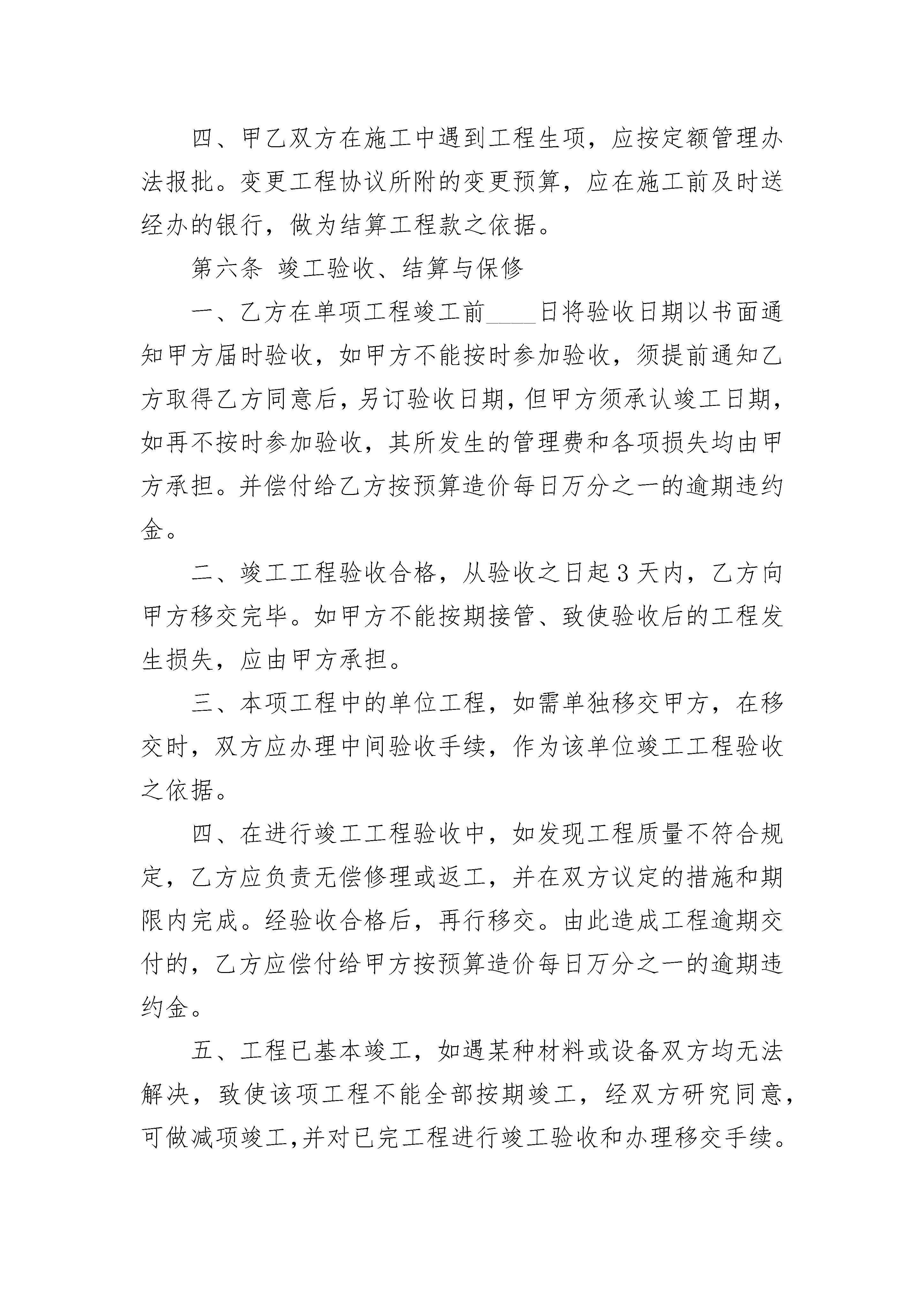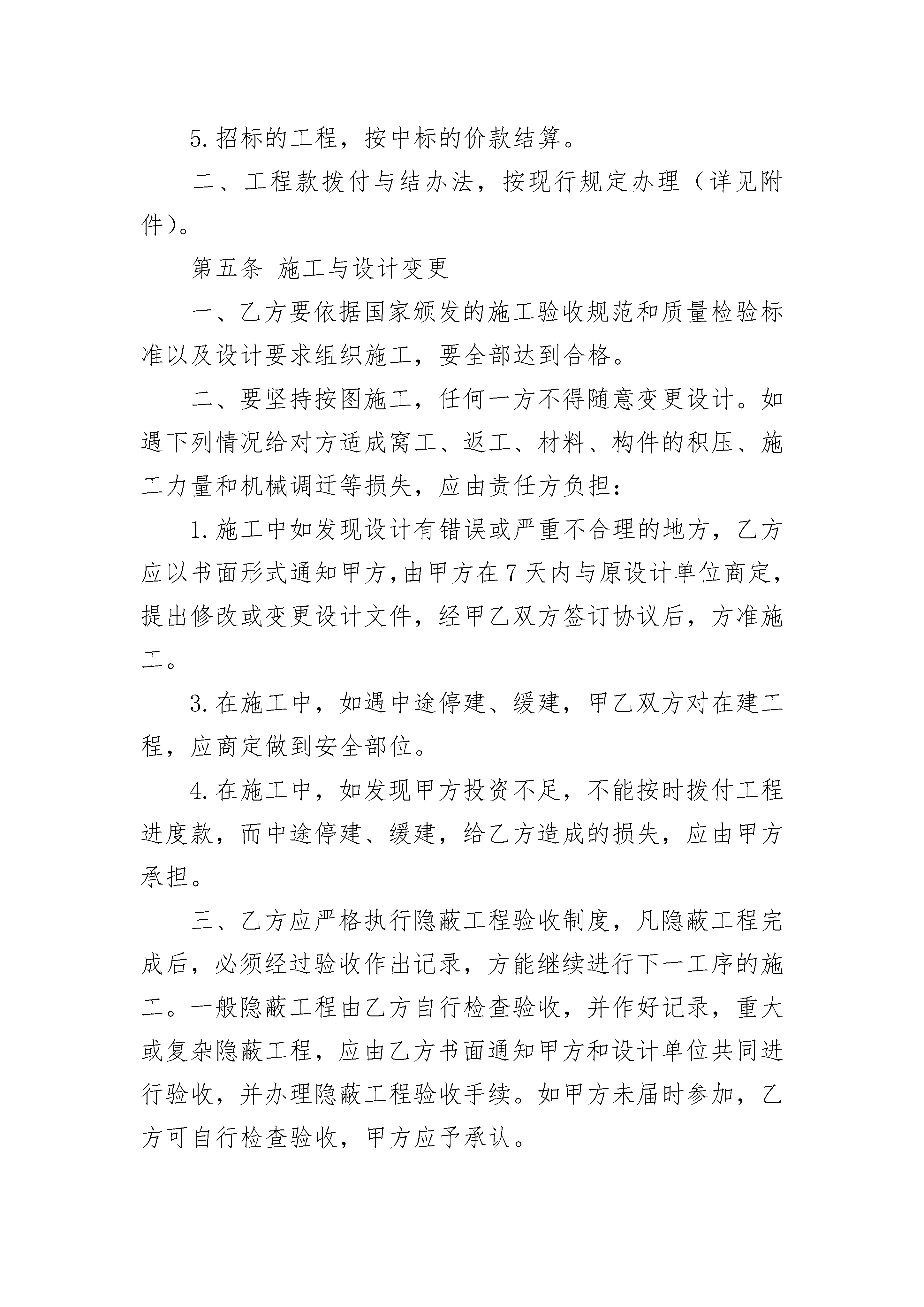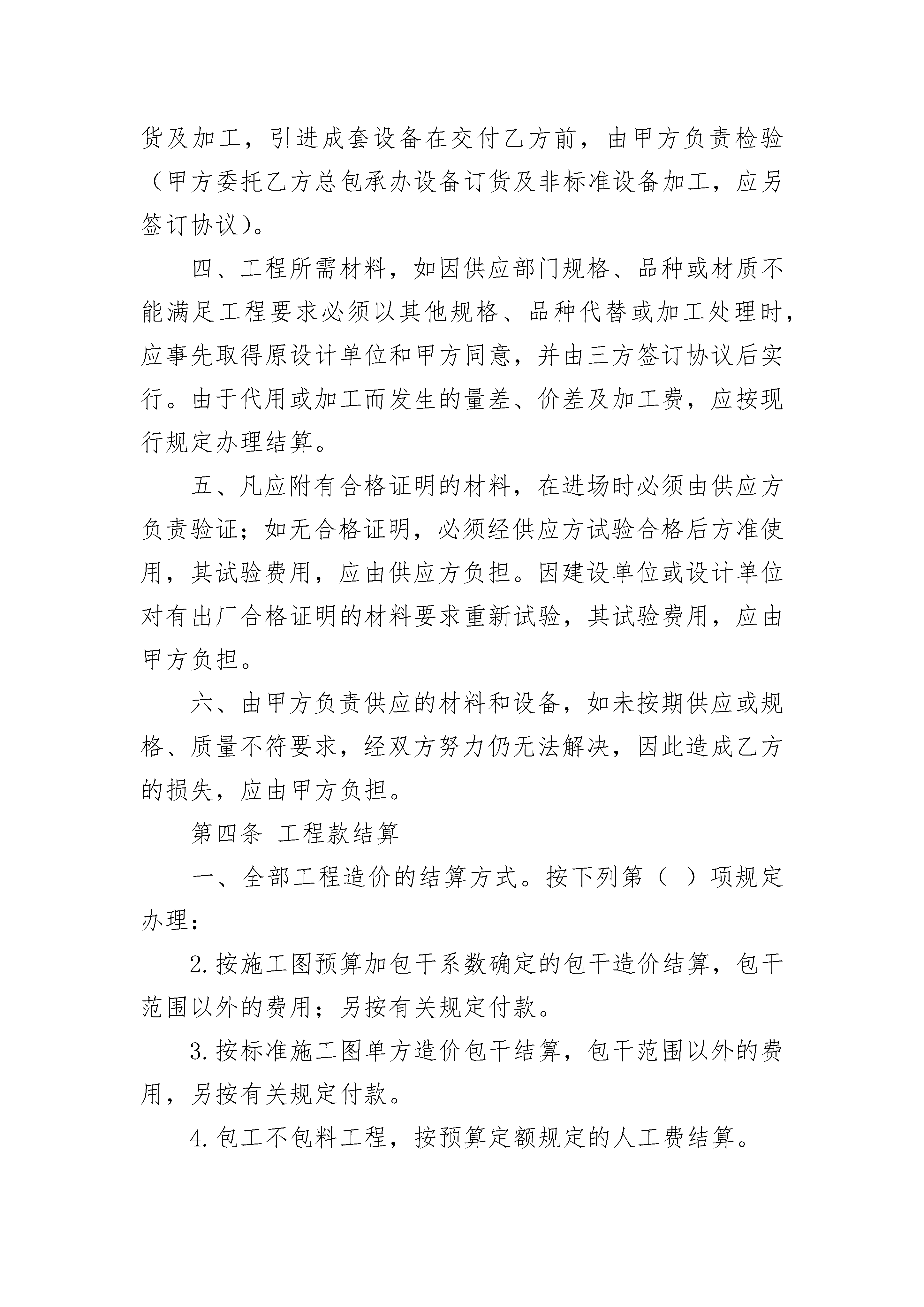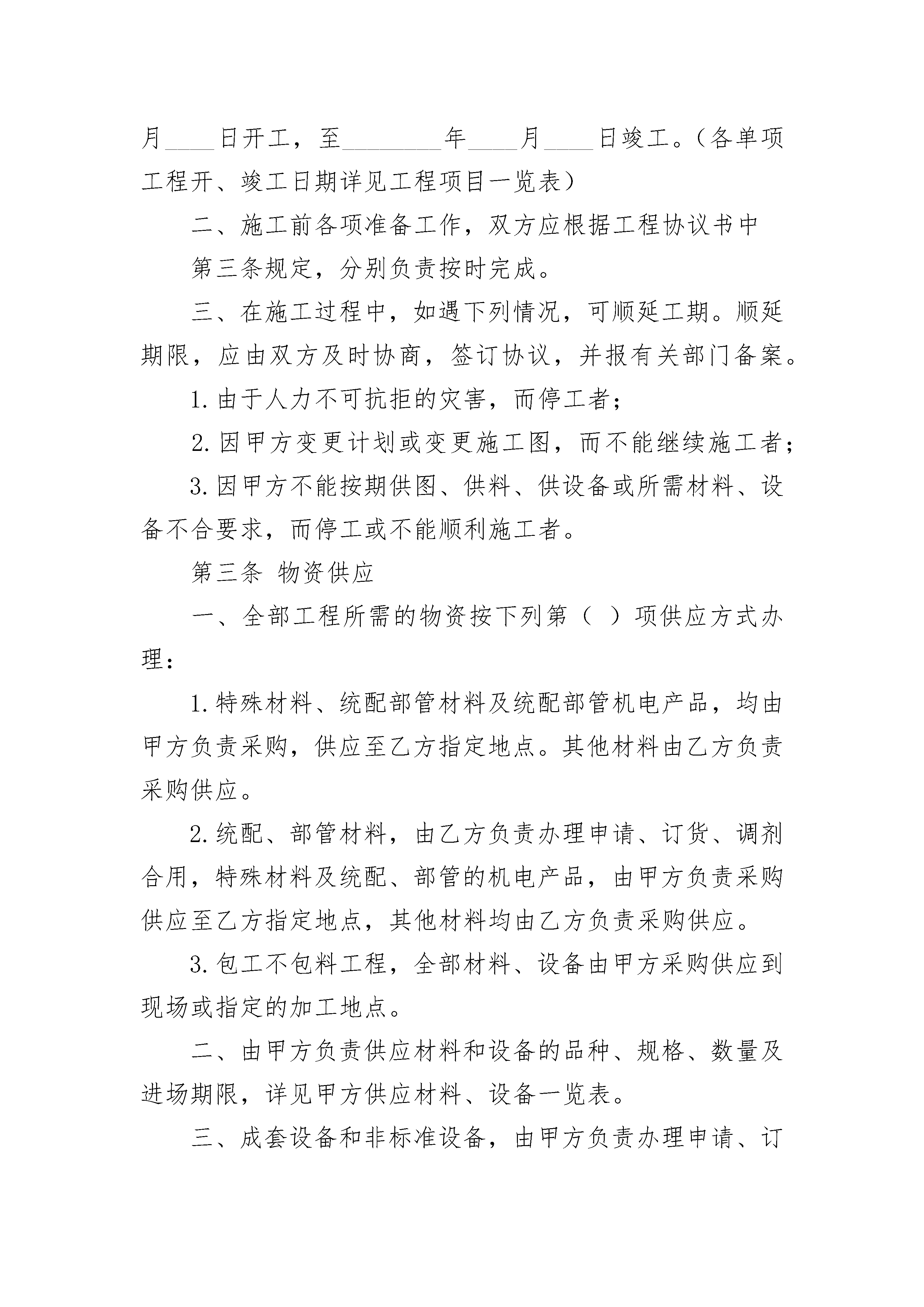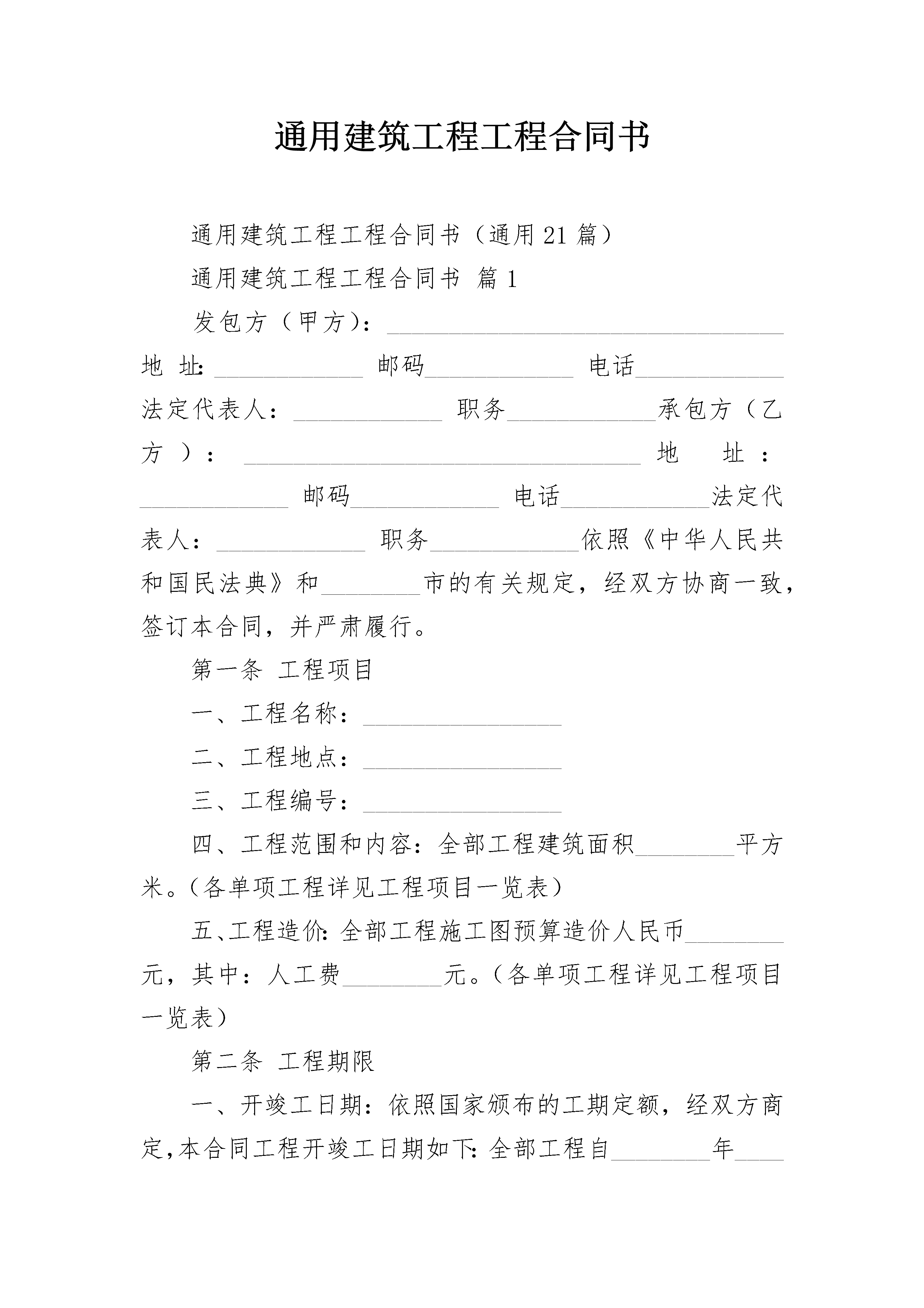 通用建筑工程工程合同书通用建筑工程工程合同书(通用21篇)通用建筑工程工程合同书篇1发包方(甲方):________________________________地址:____________邮码____________电话____________法定代表人:____________职务____________承包方(乙方):________________________________地址:____________邮码____________电话____________法定代表人:____________职务____________依照《中华人民共和国民法典》和________市的有关规定,经双方协商一致,签订本合同,并严肃履行。第一条工程项目一、工程名称:________________二、工程地点:________________三、工程编号:________________四、工程范围和内容:全部工程建筑面积________平方米。(各单项工程详见工程项目一览表)五、工程造价:全部工程施工图预算造价人民币________元,其中:人工费________元。(各单项工程详见工程项目一览表)第二条工程期限一、开竣工日期:依照国家颁布的工期定额,经双方商定,本合同工程开竣工日期如下:全部工程自________年____月____日开工,至________年____月____日竣工。(各单项工程开、竣工日期详见工程项目一览表)二、施工前各项准备工作,双方应根据工程协议书中第三条规定,分别负责按时完成。三、在施工过程中,如遇下列情况,可顺延工期。顺延期限,应由双方及时协商,签订协议,并报有关部门备案。1.由于人力不可抗拒的灾害,而停工者;2.因甲方变更计划或变更施工图,而不能继续施工者;3.因甲方不能按期供图、供料、供设备或所需材料、设备不合要求,而停工或不能顺利施工者。第三条物资供应一、全部工程所需的物资按下列第()项供应方式办理:1.特殊材料、统配部管材料及统配部管机电产品,均由甲方负责采购,供应至乙方指定地点。其他材料由乙方负责采购供应。2.统配、部管材料,由乙方负责办理申请、订货、调剂合用,特殊材料及统配、部管的机电产品,由甲方负责采购供应至乙方指定地点,其他材料均由乙方负责采购供应。3.包工不包料工程,全部材料、设备由甲方采购供应到现场或指定的加工地点。二、由甲方负责供应材料和设备的品种、规格、数量及进场期限,详见甲方供应材料、设备一览表。三、成套设备和非标准设备,由甲方负责办理申请、订货及加工,引进成套设备在交付乙方前,由甲方负责检验(甲方委托乙方总包承办设备订货及非标准设备加工,应另签订协议)。四、工程所需材料,如因供应部门规格、品种或材质不能满足工程要求必须以其他规格、品种代替或加工处理时,应事先取得原设计单位和甲方同意,并由三方签订协议后实行。由于代用或加工而发生的量差、价差及加工费,应按现行规定办理结算。五、凡应附有合格证明的材料,在进场时必须由供应方负责验证;如无合格证明,必须经供应方试验合格后方准使用,其试验费用,应由供应方负担。因建设单位或设计单位对有出厂合格证明的材料要求重新试验,其试验费用,应由甲方负担。六、由甲方负责供应的材料和设备,如未按期供应或规格、质量不符要求,经双方努力仍无法解决,因此造成乙方的损失,应由甲方负担。第四条工程款结算一、全部工程造价的结算方式。按下列第()项规定办理:2.按施工图预算加包干系数确定的包干造价结算,包干范围以外的费用;另按有关规定付款。3.按标准施工图单方造价包干结算,包干范围以外的费用,另按有关规定付款。4.包工不包料工程,按预算定额规定的人工费结算。5.招标的工程,按中标的价款结算。二、工程款拨付与结办法,按现行规定办理(详见附件)。第五条施工与设计变更一、乙方要依据国家颁发的施工验收规范和质量检验标准以及设计要求组织施工,要全部达到合格。二、要坚持按图施工,任何一方不得随意变更设计。如遇下列情况给对方适成窝工、返工、材料、构件的积压、施工力量和机械调迁等损失,应由责任方负担:1.施工中如发现设计有错误或严重不合理的地方,乙方应以书面形式通知甲方,由甲方在7天内与原设计单位商定,提出修改或变更设计文件,经甲乙双方签订协议后,方准施工。3.在施工中,如遇中途停建、缓建,甲乙双方对在建工程,应商定做到安全部位。4.在施工中,如发现甲方投资不足,不能按时拨付工程进度款,而中途停建、缓建,给乙方造成的损失,应由甲方承担。三、乙方应严格执行隐蔽工程验收制度,凡隐蔽工程完成后,必须经过验收作出记录,方能继续进行下一工序的施工。一般隐蔽工程由乙方自行检查验收,并作好记录,重大或复杂隐蔽工程,应由乙方书面通知甲方和设计单位共同进行验收,并办理隐蔽工程验收手续。如甲方