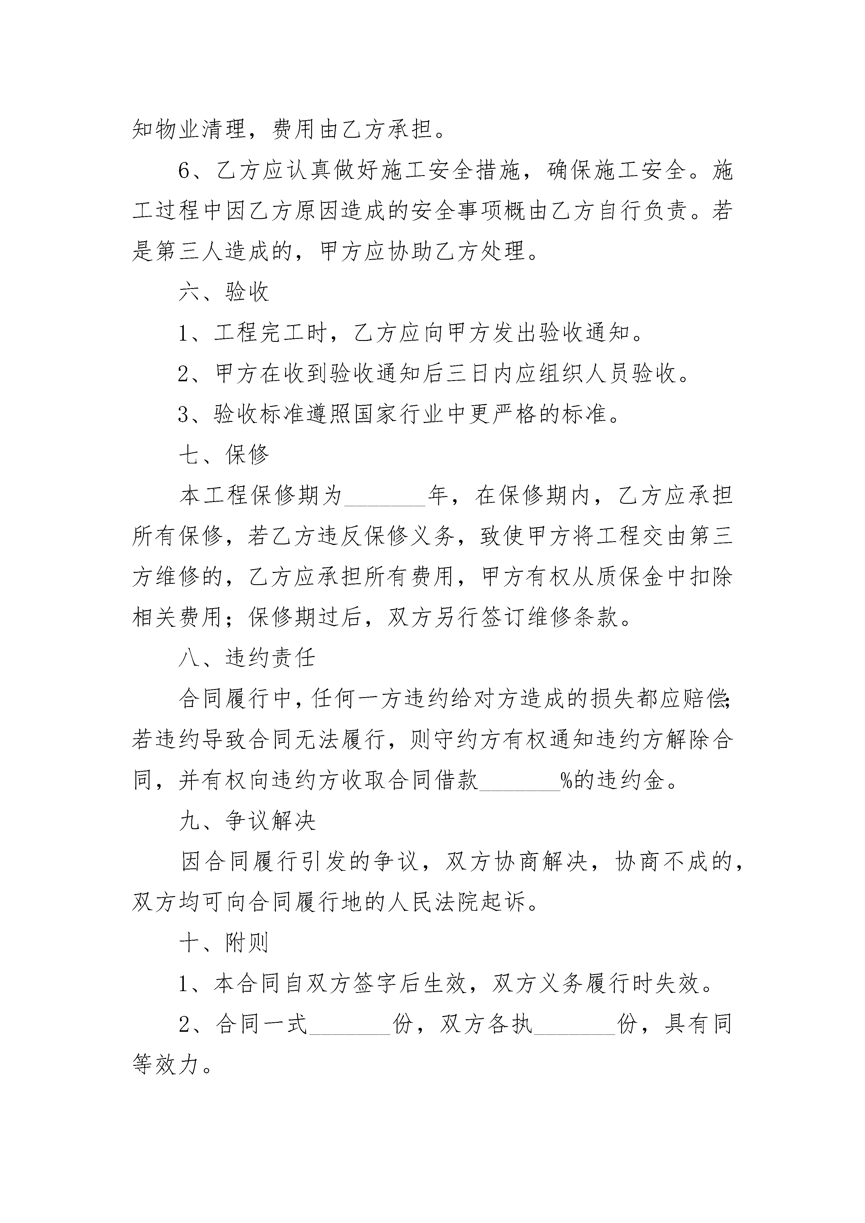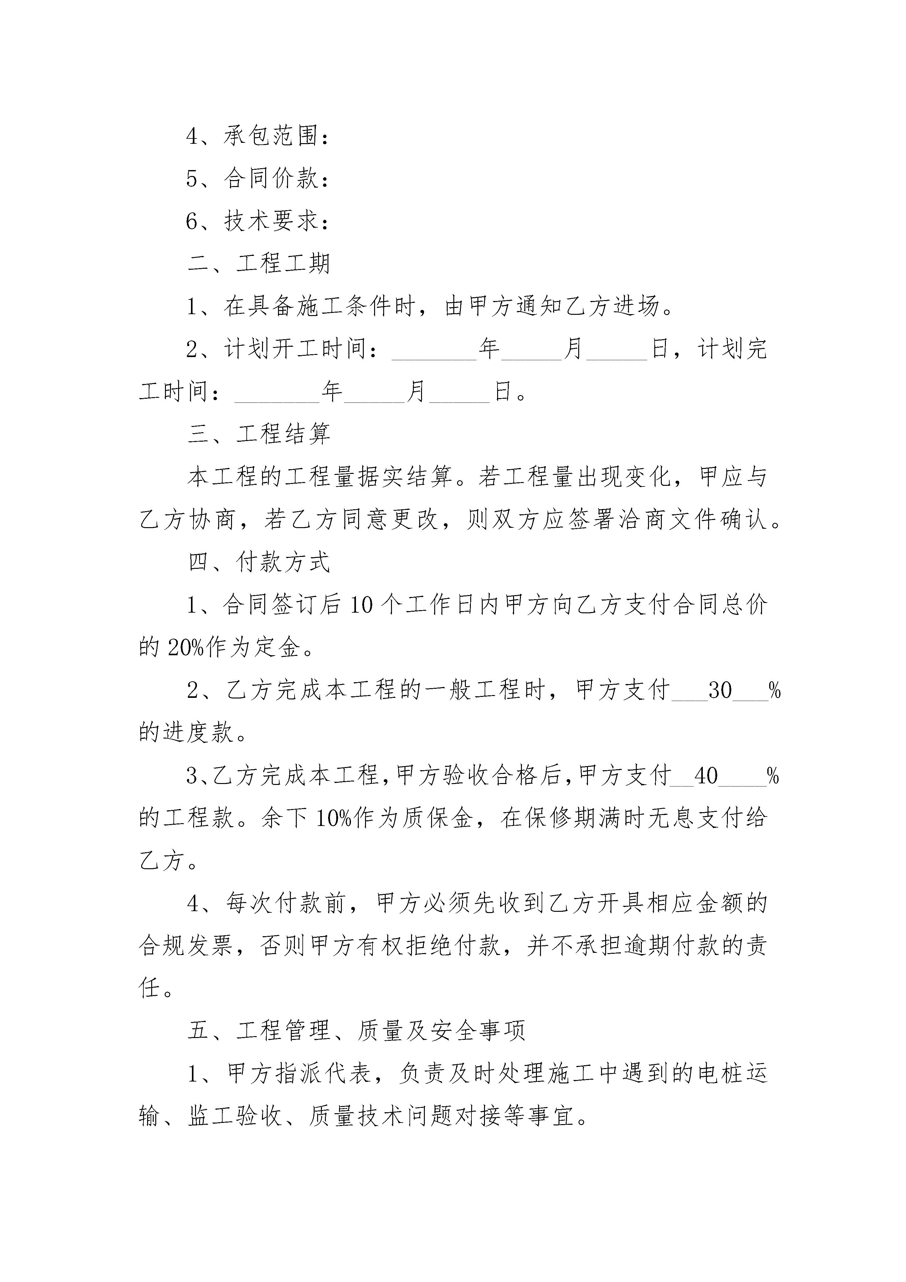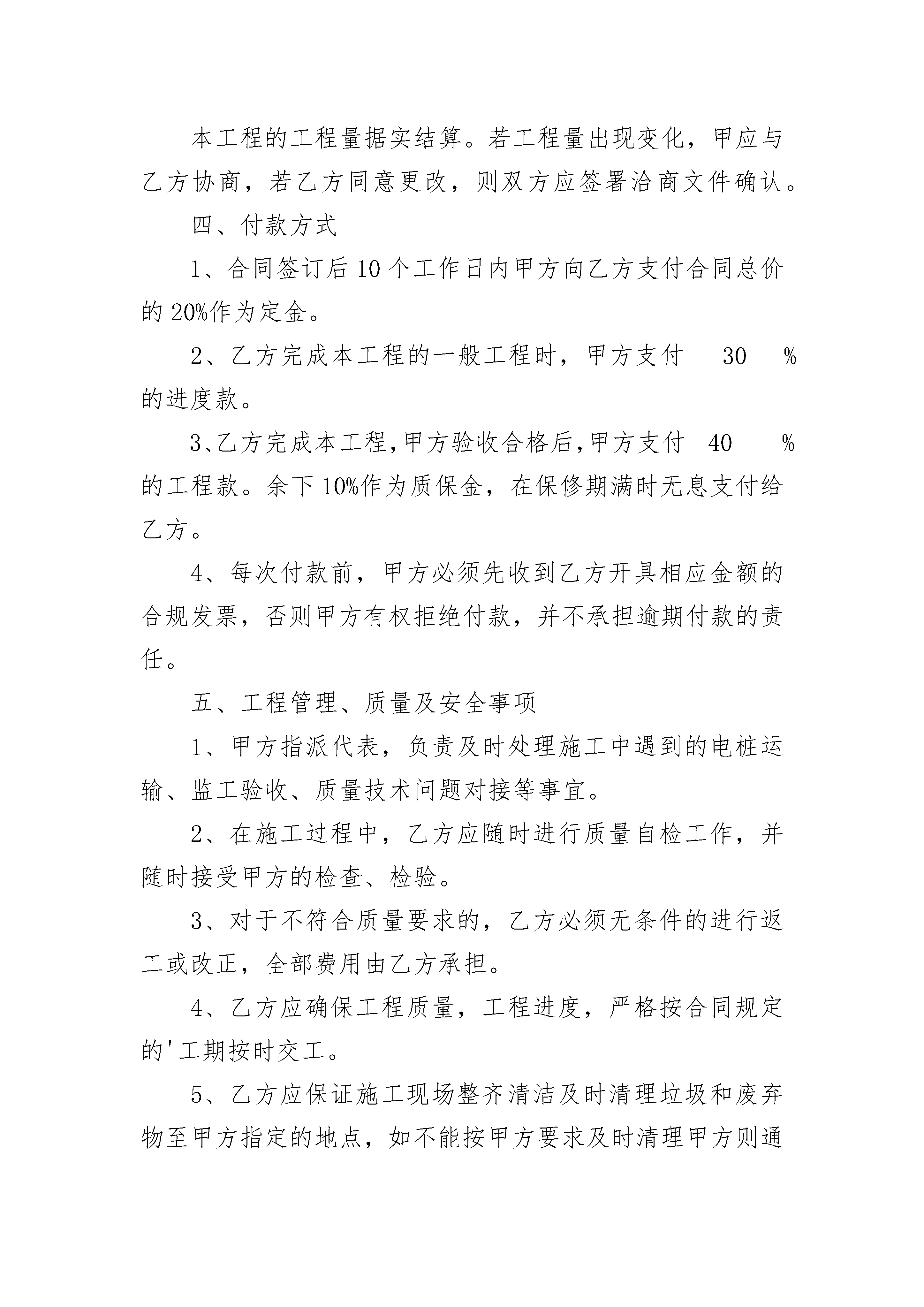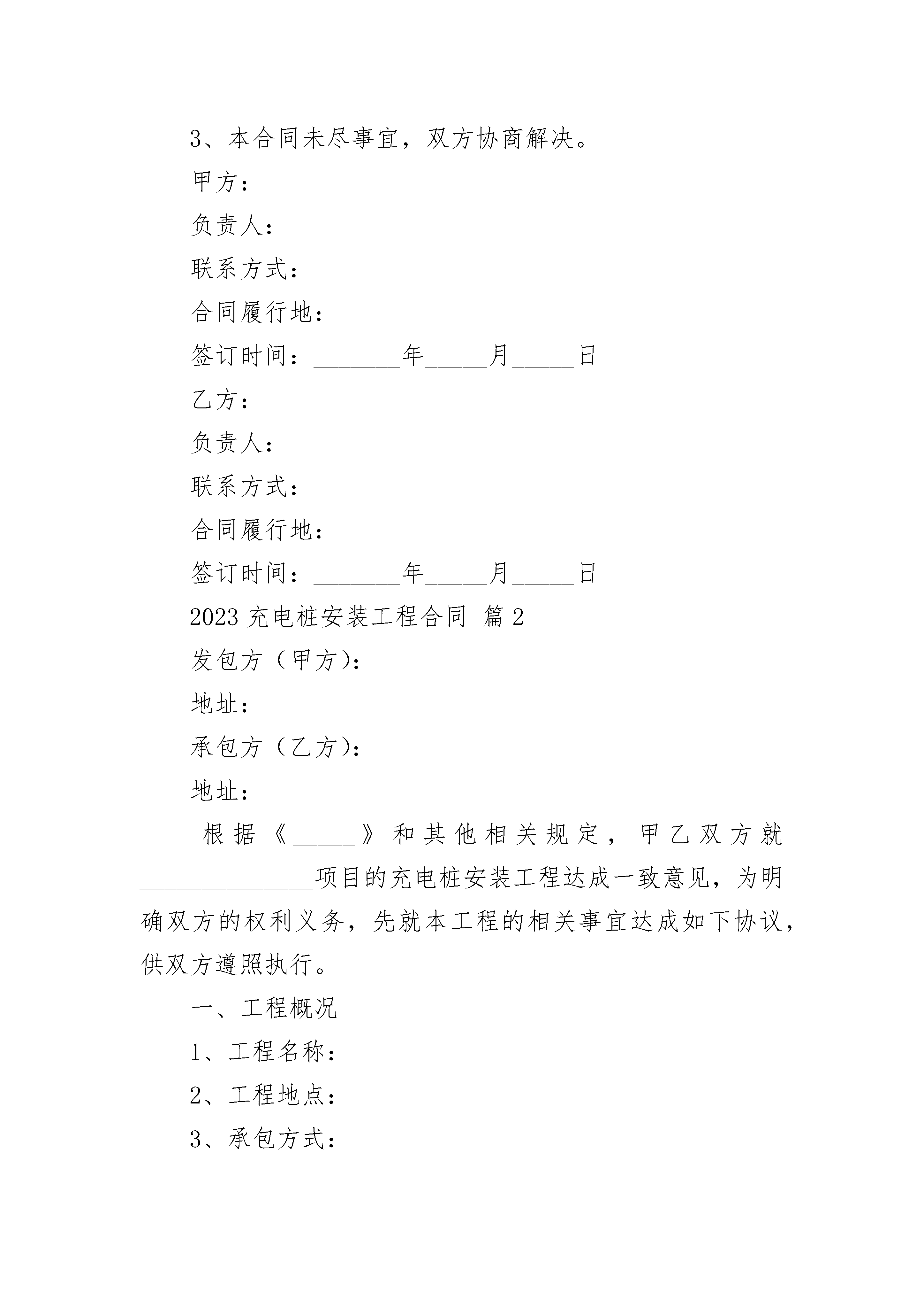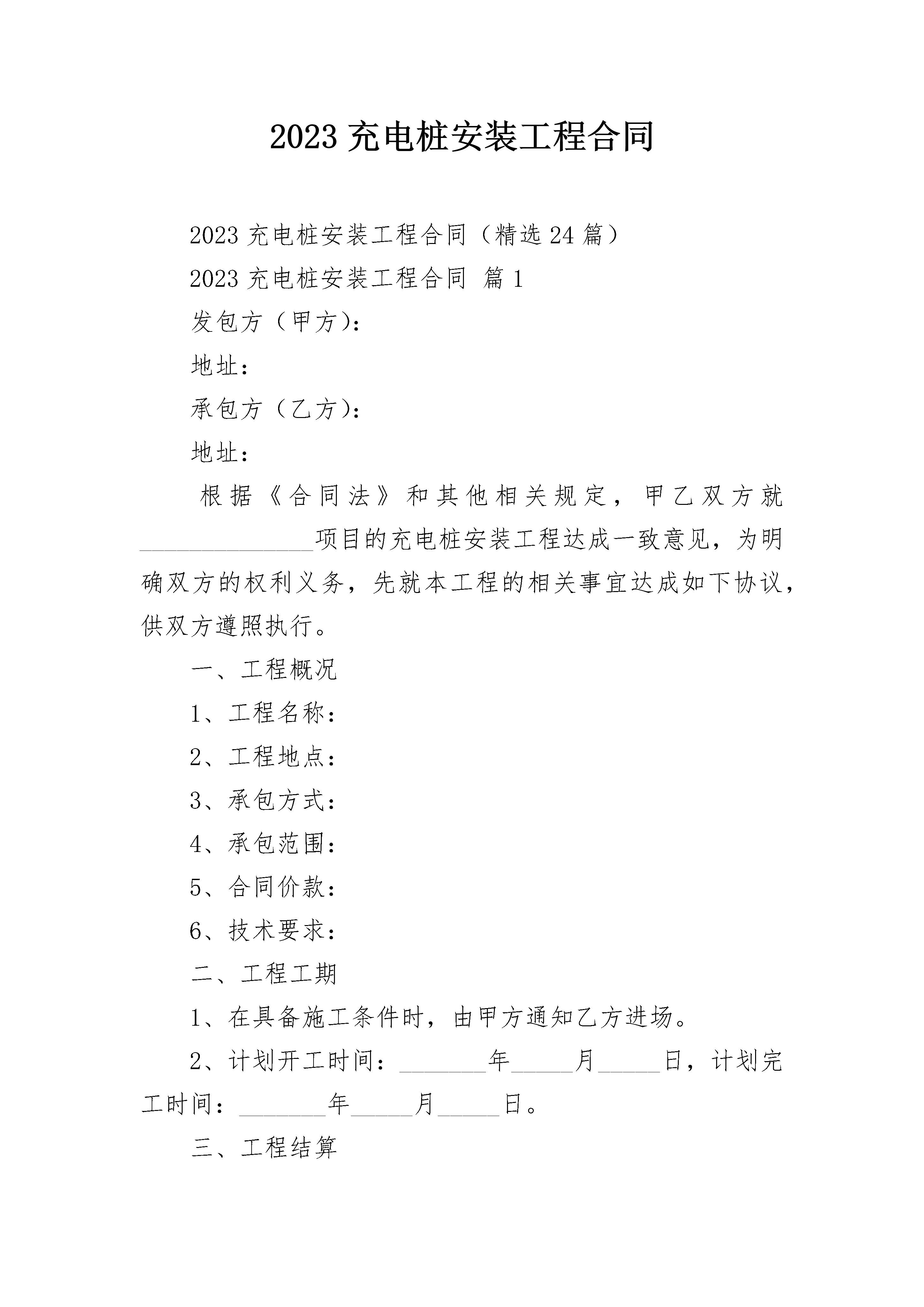 2023充电桩安装工程合同2023充电桩安装工程合同(精选24篇)2023充电桩安装工程合同篇1发包方(甲方):地址:承包方(乙方):地址:根据《合同法》和其他相关规定,甲乙双方就______________项目的充电桩安装工程达成一致意见,为明确双方的权利义务,先就本工程的相关事宜达成如下协议,供双方遵照执行。一、工程概况1、工程名称:2、工程地点:3、承包方式:4、承包范围:5、合同价款:6、技术要求:二、工程工期1、在具备施工条件时,由甲方通知乙方进场。2、计划开工时间:_______年_____月_____日,计划完工时间:_______年_____月_____日。三、工程结算本工程的工程量据实结算。若工程量出现变化,甲应与乙方协商,若乙方同意更改,则双方应签署洽商文件确认。四、付款方式1、合同签订后10个工作日内甲方向乙方支付合同总价的20%作为定金。2、乙方完成本工程的一般工程时,甲方支付___30___%的进度款。3、乙方完成本工程,甲方验收合格后,甲方支付__40____%的工程款。余下10%作为质保金,在保修期满时无息支付给乙方。4、每次付款前,甲方必须先收到乙方开具相应金额的合规发票,否则甲方有权拒绝付款,并不承担逾期付款的责任。五、工程管理、质量及安全事项1、甲方指派代表,负责及时处理施工中遇到的电桩运输、监工验收、质量技术问题对接等事宜。2、在施工过程中,乙方应随时进行质量自检工作,并随时接受甲方的检查、检验。3、对于不符合质量要求的,乙方必须无条件的进行返工或改正,全部费用由乙方承担。4、乙方应确保工程质量,工程进度,严格按合同规定的'工期按时交工。5、乙方应保证施工现场整齐清洁及时清理垃圾和废弃物至甲方指定的地点,如不能按甲方要求及时清理甲方则通知物业清理,费用由乙方承担。6、乙方应认真做好施工安全措施,确保施工安全。施工过程中因乙方原因造成的安全事项概由乙方自行负责。若是第三人造成的,甲方应协助乙方处理。六、验收1、工程完工时,乙方应向甲方发出验收通知。2、甲方在收到验收通知后三日内应组织人员验收。3、验收标准遵照国家行业中更严格的标准。七、保修本工程保修期为_______年,在保修期内,乙方应承担所有保修,若乙方违反保修义务,致使甲方将工程交由第三方维修的,乙方应承担所有费用,甲方有权从质保金中扣除相关费用;保修期过后,双方另行签订维修条款。八、违约责任合同履行中,任何一方违约给对方造成的损失都应赔偿;若违约导致合同无法履行,则守约方有权通知违约方解除合同,并有权向违约方收取合同借款_______%的违约金。九、争议解决因合同履行引发的争议,双方协商解决,协商不成的,双方均可向合同履行地的人民法院起诉。十、附则1、本合同自双方签字后生效,双方义务履行时失效。2、合同一式_______份,双方各执_______份,具有同等效力。3、本合同未尽事宜,双方协商解决。甲方:负责人:联系方式:合同履行地:签订时间:_______年_____月_____日乙方:负责人:联系方式:合同履行地:签订时间:_______年_____月_____日2023充电桩安装工程合同篇2发包方(甲方):地址:承包方(乙方):地址:根据《_____》和其他相关规定,甲乙双方就______________项目的充电桩安装工程达成一致意见,为明确双方的权利义务,先就本工程的相关事宜达成如下协议,供双方遵照执行。一、工程概况1、工程名称:2、工程地点:3、承包方式:4、承包范围:5、合同价款:6、技术要求:二、工程工期1、在具备施工条件时,由甲方通知乙方进场。2、计划开工时间:_______年_____月_____日,计划完工时间:_______年_____月_____日。三、工程结算本工程的工程量据实结算。若工程量出现变化,甲应与乙方协商,若乙方同意更改,则双方应签署洽商文件确认。四、付款方式1、合同签订后10个工作日内甲方向乙方支付合同总价的20%作为定金。2、乙方完成本工程的一般工程时,甲方支付___30___%的进度款。3、乙方完成本工程,甲方验收合格后,甲方支付__40____%的工程款。余下10%作为质保金,在保修期满时无息支付给乙方。4、每次付款前,甲方必须先收到乙方开具相应金额的合规发票,否则甲方有权拒绝付款,并不承担逾期付款的责任。五、工程管理、质量及安全事项1、甲方指派代表,负责及时处理施工中遇到的电桩运输、监工验收、质量技术问题对接等事宜。2、在施工过程中,乙方应随时进行质量自检工作,并随时接受甲方的检查、检验。3、对于不符合质量要求的,乙方必须无条件的进行返工或改正,全部费用由乙方承担。4、乙方应确保工程质量,工程进度,严格按合同规定的工期按时交工。5、乙方应保证施工现场整齐清洁及时清理垃圾和废弃物至甲方