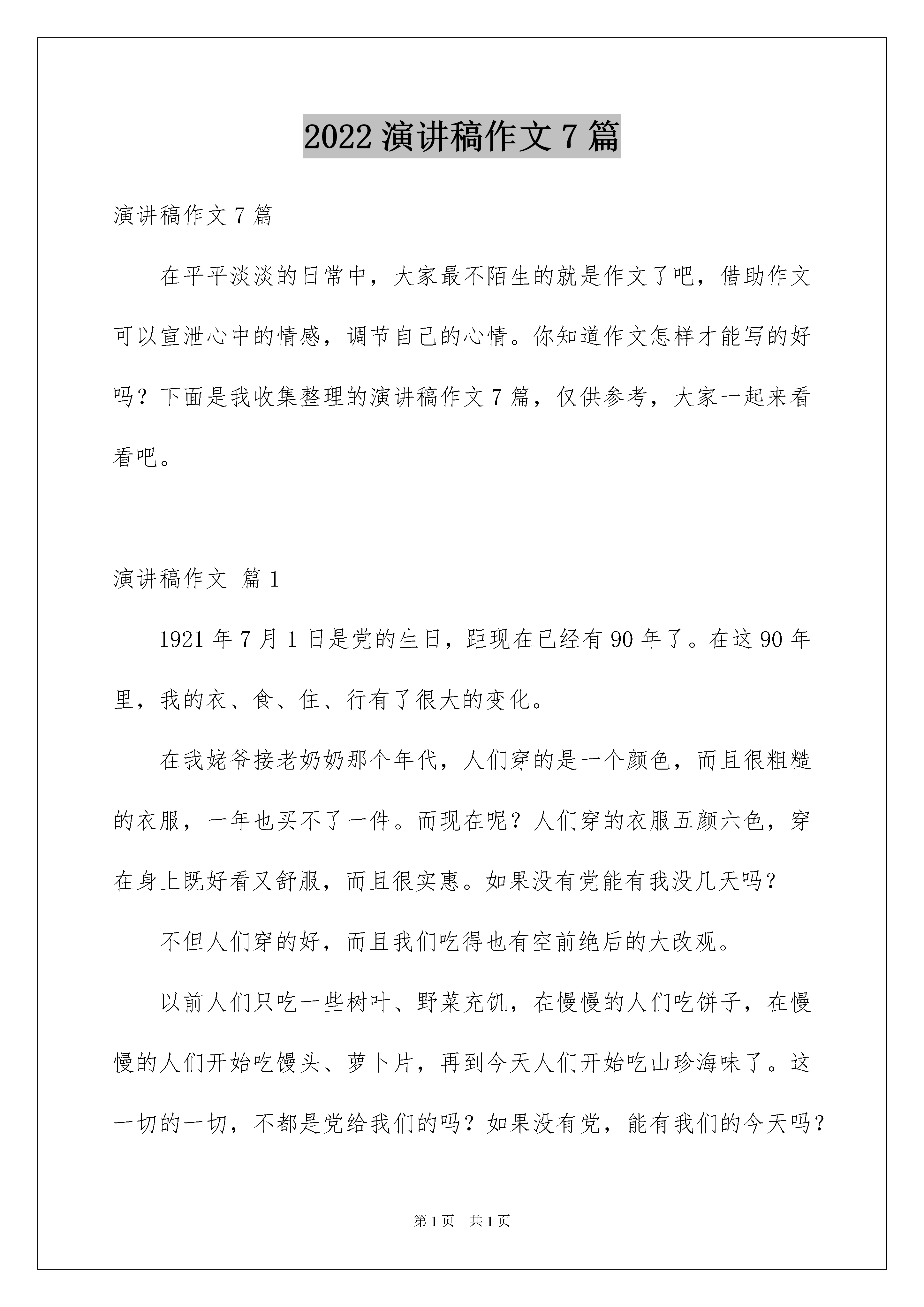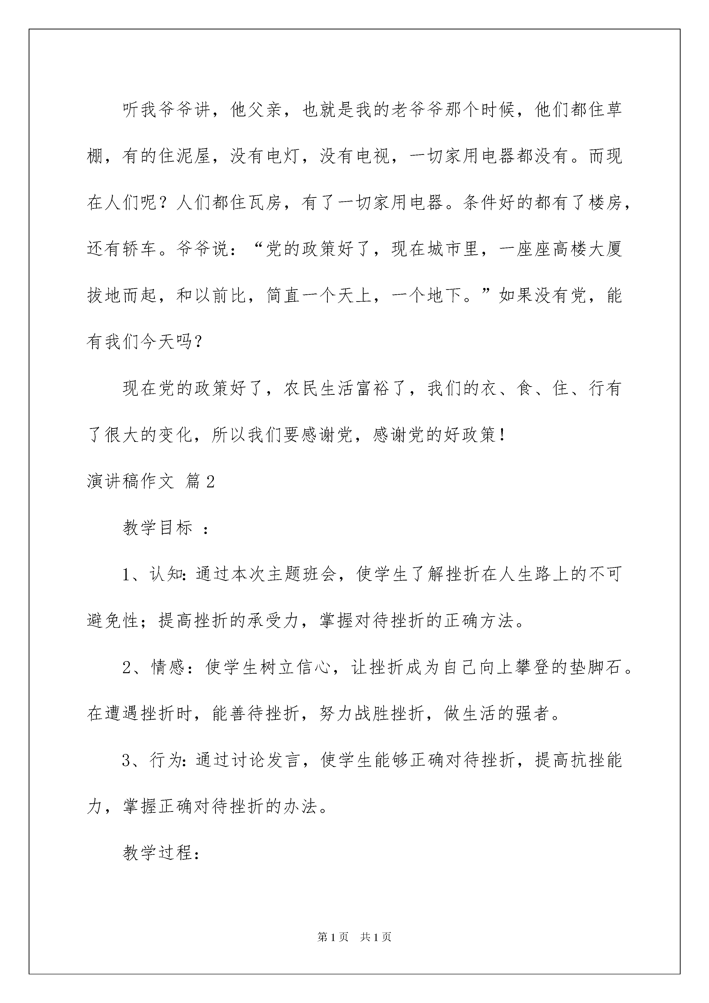 2022演讲稿作文7篇演讲稿作文7篇在平平淡淡的日常中,大家最不陌生的就是作文了吧,借助作文可以宣泄心中的情感,调节自己的心情。你知道作文怎样才能写的好吗?下面是我收集整理的演讲稿作文7篇,仅供参考,大家一起来看看吧。演讲稿作文篇11921年7月1日是党的生日,距现在已经有90年了。在这90年里,我的衣、食、住、行有了很大的变化。在我姥爷接老奶奶那个年代,人们穿的是一个颜色,而且很粗糙的衣服,一年也买不了一件。而现在呢?人们穿的衣服五颜六色,穿在身上既好看又舒服,而且很实惠。如果没有党能有我没几天吗?不但人们穿的好,而且我们吃得也有空前绝后的大改观。以前人们只吃一些树叶、野菜充饥,在慢慢的人们吃饼子,在慢慢的人们开始吃馒头、萝卜片,再到今天人们开始吃山珍海味了。这一切的一切,不都是党给我们的吗?如果没有党,能有我们的今天吗?听我爷爷讲,他父亲,也就是我的老爷爷那个时候,他们都住草棚,有的住泥屋,没有电灯,没有电视,一切家用电器都没有。而现在人们呢?人们都住瓦房,有了一切家用电器。条件好的都有了楼房,还有轿车。爷爷说:“党的政策好了,现在城市里,一座座高楼大厦拔地而起,和以前比,简直一个天上,一个地下。”如果没有党,能有我们今天吗?现在党的政策好了,农民生活富裕了,我们的衣、食、住、行有了很大的变化,所以我们要感谢党,感谢党的好政策!演讲稿作文篇2教学目标:1、认知:通过本次主题班会,使学生了解挫折在人生路上的不可避免性;提高挫折的承受力,掌握对待挫折的正确方法。2、情感:使学生树立信心,让挫折成为自己向上攀登的垫脚石。在遭遇挫折时,能善待挫折,努力战胜挫折,做生活的强者。3、行为:通过讨论发言,使学生能够正确对待挫折,提高抗挫能力,掌握正确对待挫折的办法。教学过程:一、回味生活认识挫折导入:同学们,我今天来调查一下你们:在人生的长河中,你们遇到过困难吗,遇到过的同学举手。你们当时是怎么对待的呢?(学生畅谈自己遇到的挫折和困难)。师:是啊,在茫茫的人生的长河中,我们要尝尽人生的酸甜苦辣。我们常常祝愿他人万事如意,心想事成,一帆风顺等等,但是、在现实中,人的生命,似洪水在奔流,不遇到岛屿、暗礁,难以激起美丽的浪花。这些岛屿和暗礁就是我们生活中遇到的挫折。挡住你前进的脚,这些挫折挡住我们前进的脚步,难怪说“挫折对弱者来说是万丈深渊,对强者来说是成功的阶梯”师:你听说过贵州某市一对孪生姐妹杀死自己亲生父母的事吗?生:没有呀,快说说是怎么回事。师:这是一幕不该发生的悲剧。20xx年秋天,贵州某市一对孪生姐妹初中毕业后,没有考进重点中学,多次受到父母的斥责。面对这些,姐妹俩的心理崩溃了,她俩承受不了来自父母的压力。于是,在一个可怕的夜晚,她俩悄悄地拧开了家中的煤气罐,将熟睡的父母毒死,然后双双出逃!你们听了这个故事,会有什么样的感受呢?师讲另外一个故事:他四岁之前不会说话,七岁之前不会认字,他的老师描述他:迟钝,不合群,神思恍惚,老在做白日梦.他曾被苏黎世工艺学校逐出校门并拒其入学.(爱因斯坦)学生对比作出正确的选择:微笑着面对挫折二、感受挫折品味挫折请同学具体谈谈自己所经历的一些挫折及受挫时的反应师:同学们在现实生活中也会遇到来自各方面的挫折,请同学们谈谈自己遇到的挫折故事,并谈谈受挫后当时的反应如何?生(积极发言)三、了解挫折分析原因师:每个人都有他自己的人生理想,有一个奋斗的目标。有志者总会不断地努力,向着自己的人生目标迈进,但在奋斗的过程中,总难免遇到这样或那样的挫折,那我们来分析一下产生挫折的原因可能有哪些。(生讨论)明确:有自然环境和时空限制,人的生老病死、天灾人祸造成生离死别,同学之间的矛盾、家长和老师的不理解,人的容貌、身材、体质、能力、知识水平等的限制,这些因素都有可能导致挫折。四、欣赏歌曲,并寻求榜样的力量,善待挫折。(《真心英雄》)师:看来,在人生的道路上不一定都铺满鲜花,也经常会是遍地荆棘。但是,不经历狂风暴雨,哪有美丽的彩虹?请同学们欣赏《真心英雄》欣赏歌曲,并感悟其歌词的涵义师:我们同学都喜欢遇挫折有承受力的人。那么我们也不必怕挫折,刚才歌中唱得好“不经风雨怎能见彩虹”,它讲出了人必须经历挫折,才能培养出坚忍不拔的抗挫折能力,要勇于正视挫折,磨炼自己,才能取得成功。我们都知道“宝剑锋从磨砺出,梅花香自苦寒来。”2请同学列举一些虽遭挫折但顽强抗争,最后取得成功的典型事例,请同学谈谈伟人或名人是如何对待挫折的1、贝多芬德国作曲家,被公认为有史以来最伟大的作曲家。在1800年左右患了耳疾,但初期并不严重,1802年病状加剧,终致医治无效,至1819年听觉全部丧失