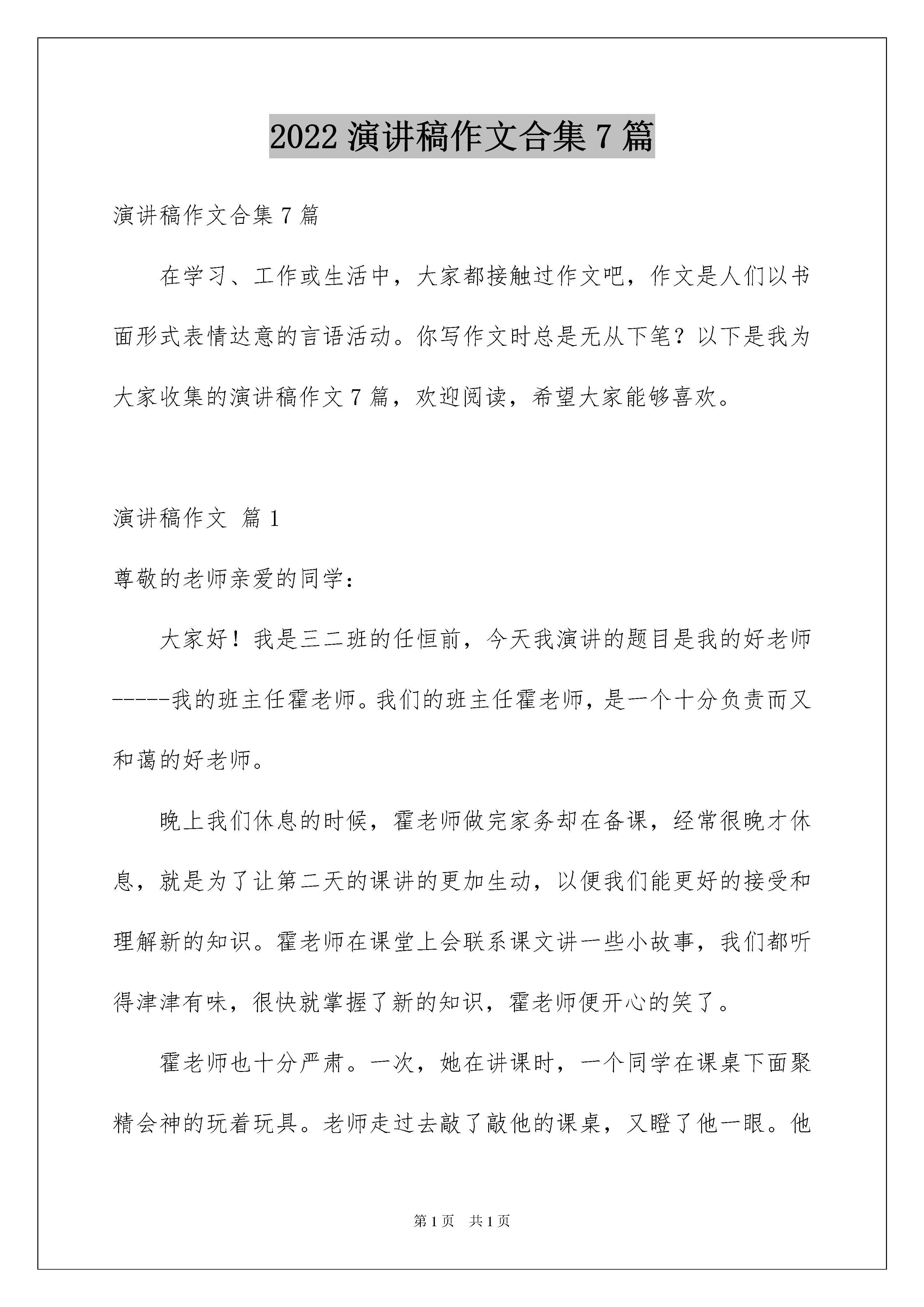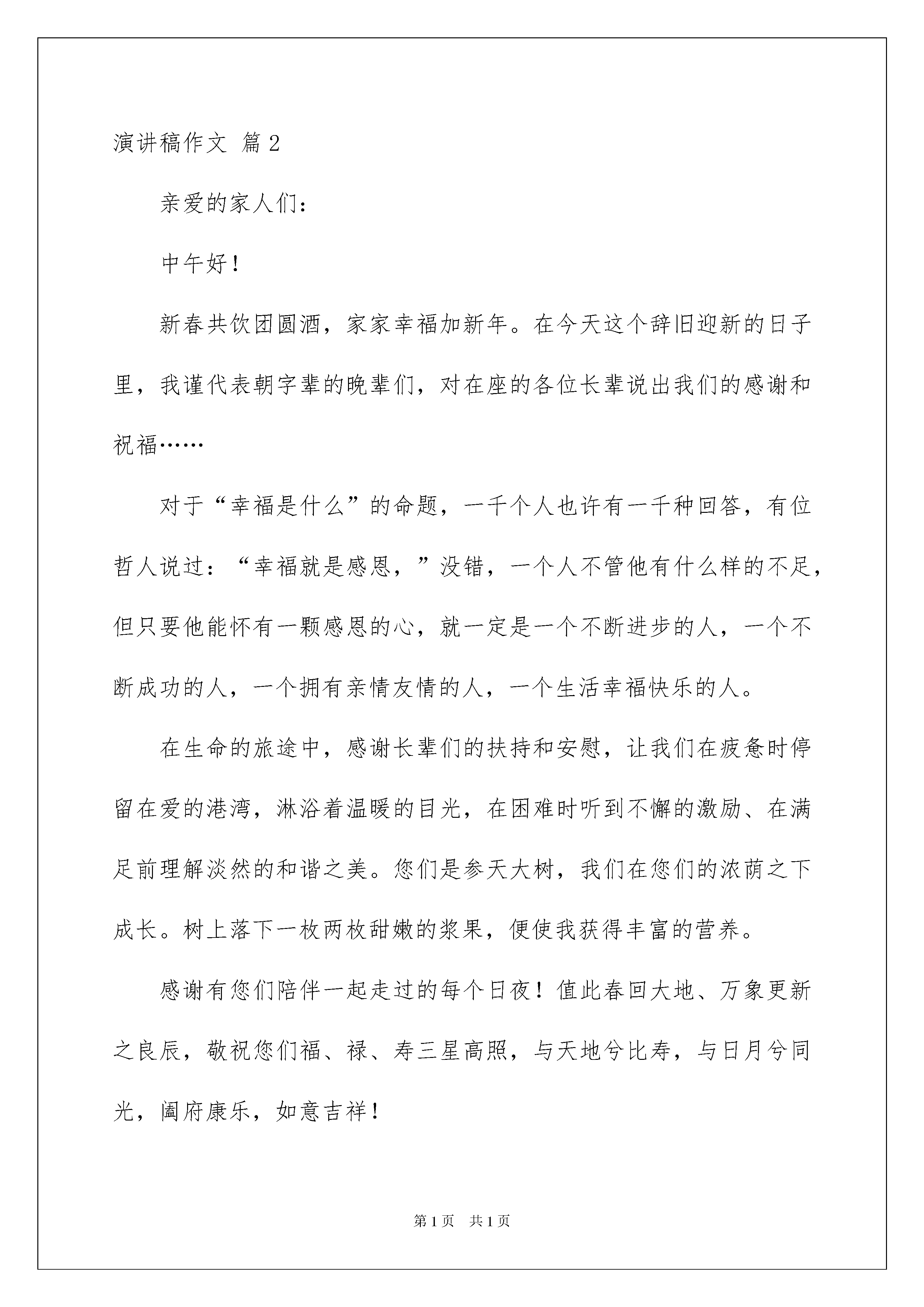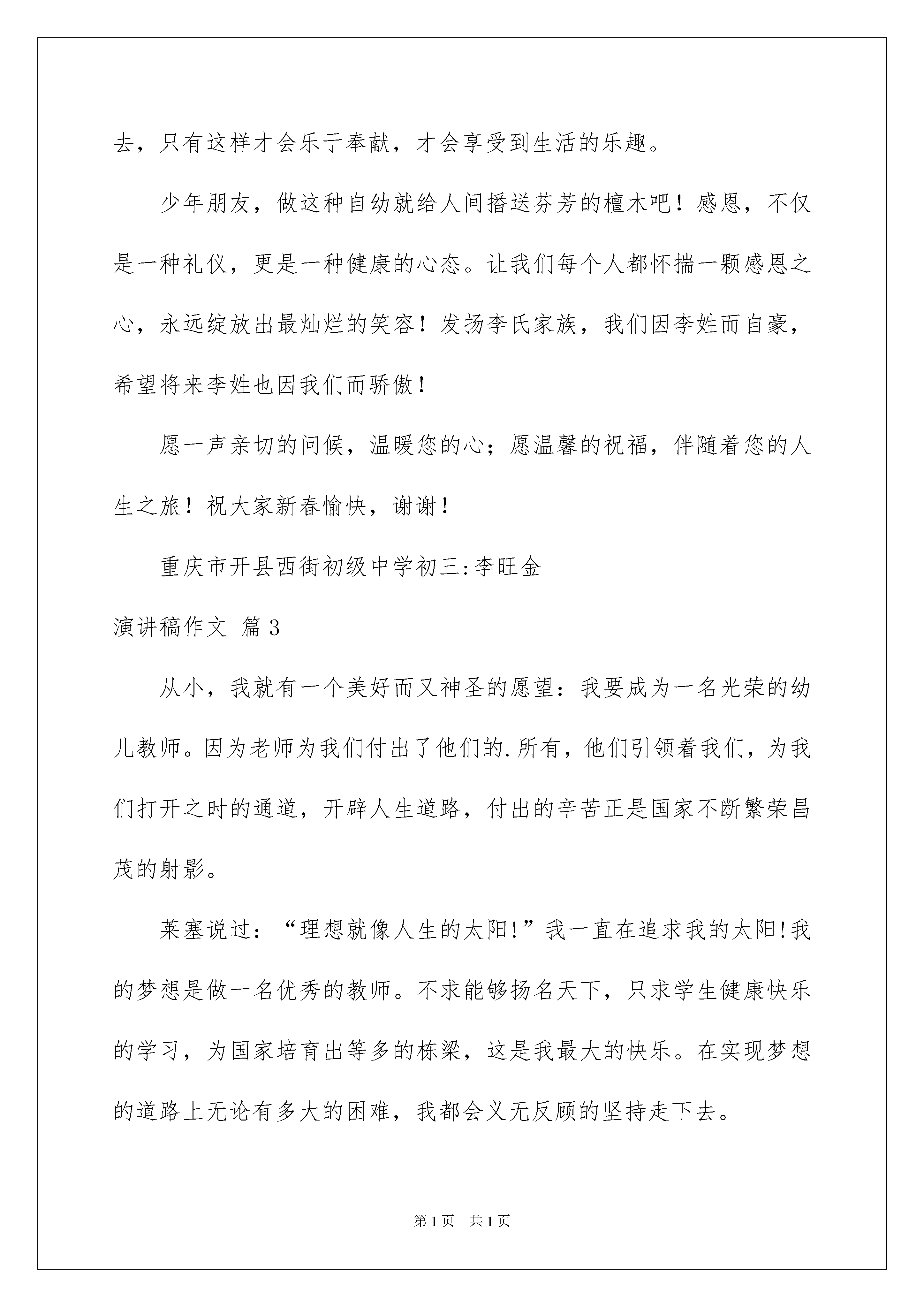 2022演讲稿作文合集7篇演讲稿作文合集7篇在学习、工作或生活中,大家都接触过作文吧,作文是人们以书面形式表情达意的言语活动。你写作文时总是无从下笔?以下是我为大家收集的演讲稿作文7篇,欢迎阅读,希望大家能够喜欢。演讲稿作文篇1尊敬的老师亲爱的同学:大家好!我是三二班的任恒前,今天我演讲的题目是我的好老师-----我的班主任霍老师。我们的班主任霍老师,是一个十分负责而又和蔼的好老师。晚上我们休息的时候,霍老师做完家务却在备课,经常很晚才休息,就是为了让第二天的课讲的更加生动,以便我们能更好的接受和理解新的知识。霍老师在课堂上会联系课文讲一些小故事,我们都听得津津有味,很快就掌握了新的知识,霍老师便开心的笑了。霍老师也十分严肃。一次,她在讲课时,一个同学在课桌下面聚精会神的玩着玩具。老师走过去敲了敲他的课桌,又瞪了他一眼。他放下玩具和我们一起专心致志的听讲。可是不一会儿,那个同学又拿起玩具,认真的玩耍了起来。霍老师看见了,严肃的说:"放学后,你留下。"那天下午,老师狠狠地批评了他。以后,这个同学上课认真多了。还有一次,霍老师发现一个同学的本子上有很多题没做,便给他的家长打电话,说老师要留他做作业。第二天,我们看到这个同学把没有做完的作业全部补完了,而且没有一个错题,我们都很好奇的问他怎么回事。他说:“霍老师,特别有耐心,辅导我写作业都到六点了,有我不会的题就给我讲解,所以我才全做对了。”我们听了告诉他:“是老师非常关心你,希望你的学习不落后。”上个星期我上课的时候肚子疼,捂着肚子趴在桌子上,霍老师看见以后问我怎么了,我告诉老师我的肚子疼,老师轻轻地摸摸了我的额头,说不热,又给我倒了一杯热水,霍老师赶紧又给我妈妈打电话,我感觉霍老师就像妈妈一样。我觉得我的班主任霍老师,就像蜡烛,燃烧了自己,照亮了别人。我喜欢霍老师。我的演讲完了,谢谢大家!演讲稿作文篇2亲爱的家人们:中午好!新春共饮团圆酒,家家幸福加新年。在今天这个辞旧迎新的日子里,我谨代表朝字辈的晚辈们,对在座的各位长辈说出我们的感谢和祝福……对于“幸福是什么”的命题,一千个人也许有一千种回答,有位哲人说过:“幸福就是感恩,”没错,一个人不管他有什么样的不足,但只要他能怀有一颗感恩的心,就一定是一个不断进步的人,一个不断成功的人,一个拥有亲情友情的人,一个生活幸福快乐的人。在生命的旅途中,感谢长辈们的扶持和安慰,让我们在疲惫时停留在爱的港湾,淋浴着温暖的目光,在困难时听到不懈的激励、在满足前理解淡然的和谐之美。您们是参天大树,我们在您们的浓荫之下成长。树上落下一枚两枚甜嫩的浆果,便使我获得丰富的营养。感谢有您们陪伴一起走过的每个日夜!值此春回大地、万象更新之良辰,敬祝您们福、禄、寿三星高照,与天地兮比寿,与日月兮同光,阖府康乐,如意吉祥!作为承载未来和向往明天的一辈,我想对我们同辈说,我们要秉承李氏家族自强不息的宝贵精神,以顽强的意志、务实的行动书写合格的青春答卷。在生命的历程中,不断地努力、奋斗和追求,实现人生价值,领悟人生真谛。在困难和挫折面前,要始终坚信:困难和挫折都是暂时的。心中常树必胜之志,胸中常立豁达之情,永远奋发向上。立足专业,广泛学习。用科学知识武装自己,用过硬素质充实自己,以实际行动报效祖国,服务社会。当然,我们能做的不仅仅是这些,让我们行动起来,把“感恩、自强、责任”这一美德进行到底!让我们感激在我们成长道路上循循善诱的长辈。让我们把“感恩之心”化为“感恩之行”吧,让我们回报父母:主动承担一些家务,体验父母的艰辛,减轻父母的负担,努力做让父母放心的好孩子。让我们回报老师:勤奋学习,刻苦钻研,插上创新的翅膀,在知识的海洋里遨游。生活是个大舞台,我们都是演员,扮演什么角色,不决定于导演,而在于自己。翻开这一页,打开自己的心扉,去接受生活的启迪……把别人对自己的帮助永远记在心头;将自己对别人的帮助从记忆中抹去,只有这样才会乐于奉献,才会享受到生活的乐趣。少年朋友,做这种自幼就给人间播送芬芳的檀木吧!感恩,不仅是一种礼仪,更是一种健康的心态。让我们每个人都怀揣一颗感恩之心,永远绽放出最灿烂的笑容!发扬李氏家族,我们因李姓而自豪,希望将来李姓也因我们而骄傲!愿一声亲切的问候,温暖您的心;愿温馨的祝福,伴随着您的人生之旅!祝大家新春愉快,谢谢!重庆市开县西街初级中学初三:李旺金演讲稿作文篇3从小,我就有一个美好而又神圣的愿望:我要成为一名光荣的幼儿教师。因为老师为我们付出了他们的.所有,他们引领着我们,为我们打开之时的通道,开辟人生道路,付出的辛苦正是国家不断繁荣昌茂的射影。莱塞说过:“理想就像人生的太阳!”我一直