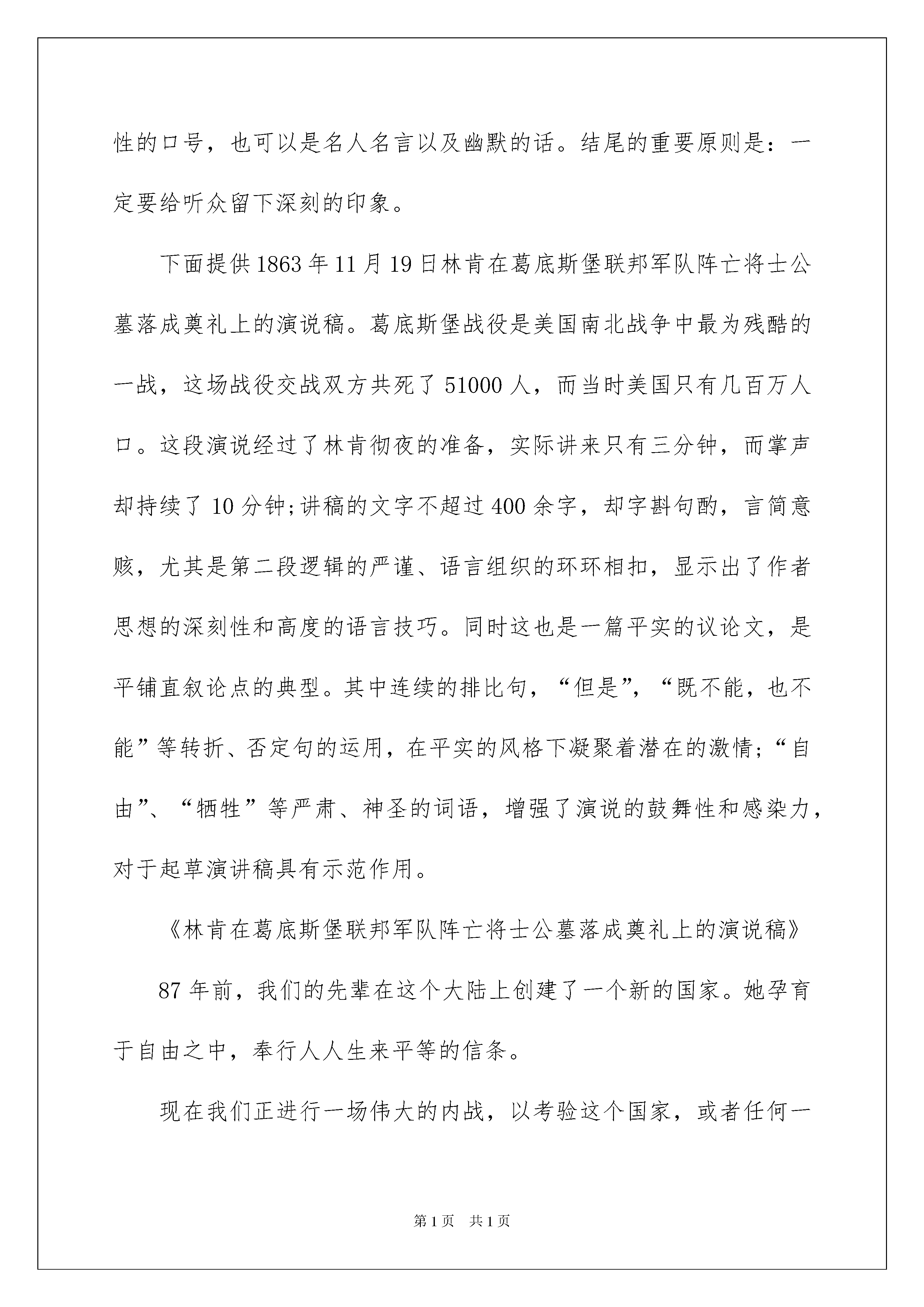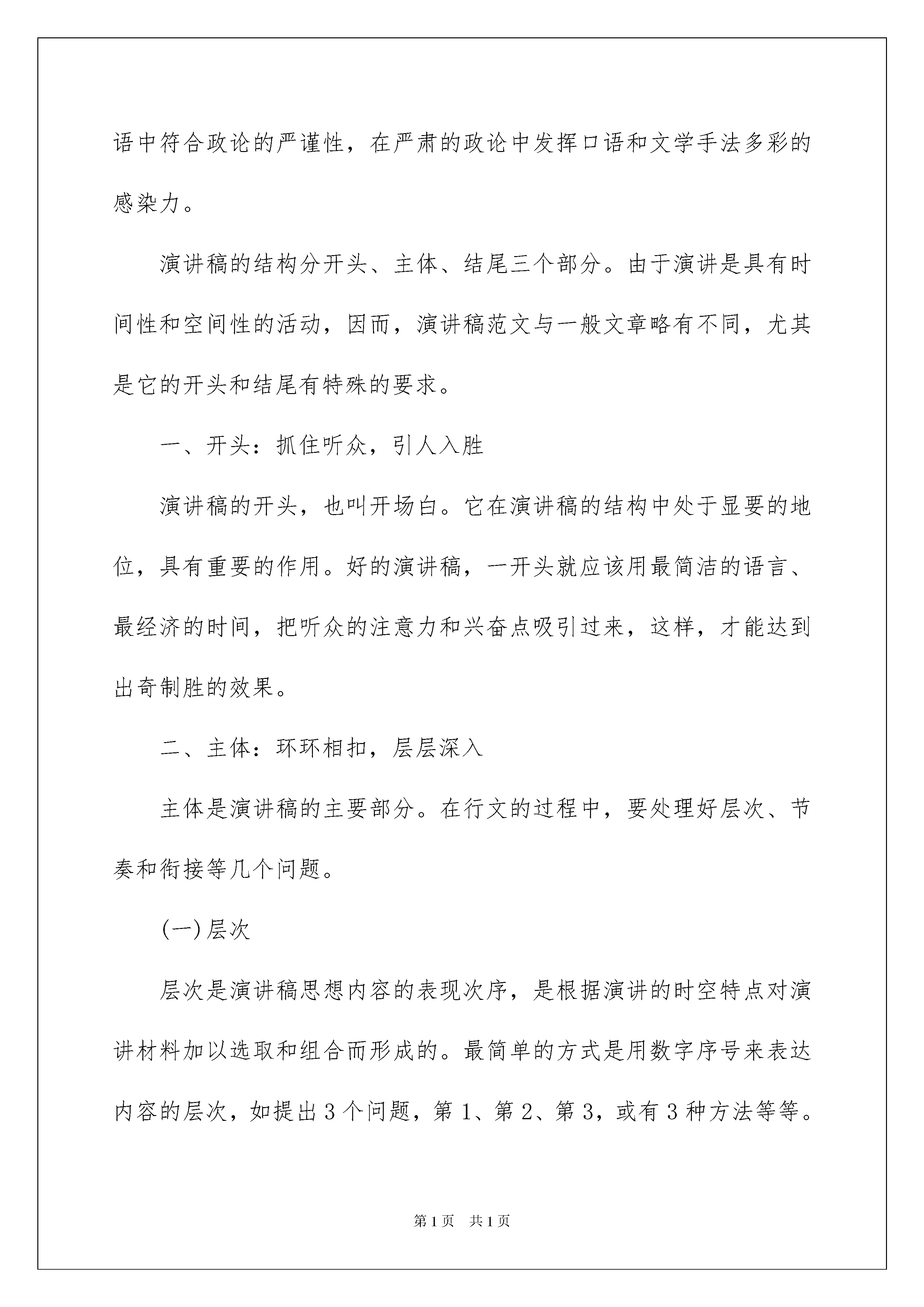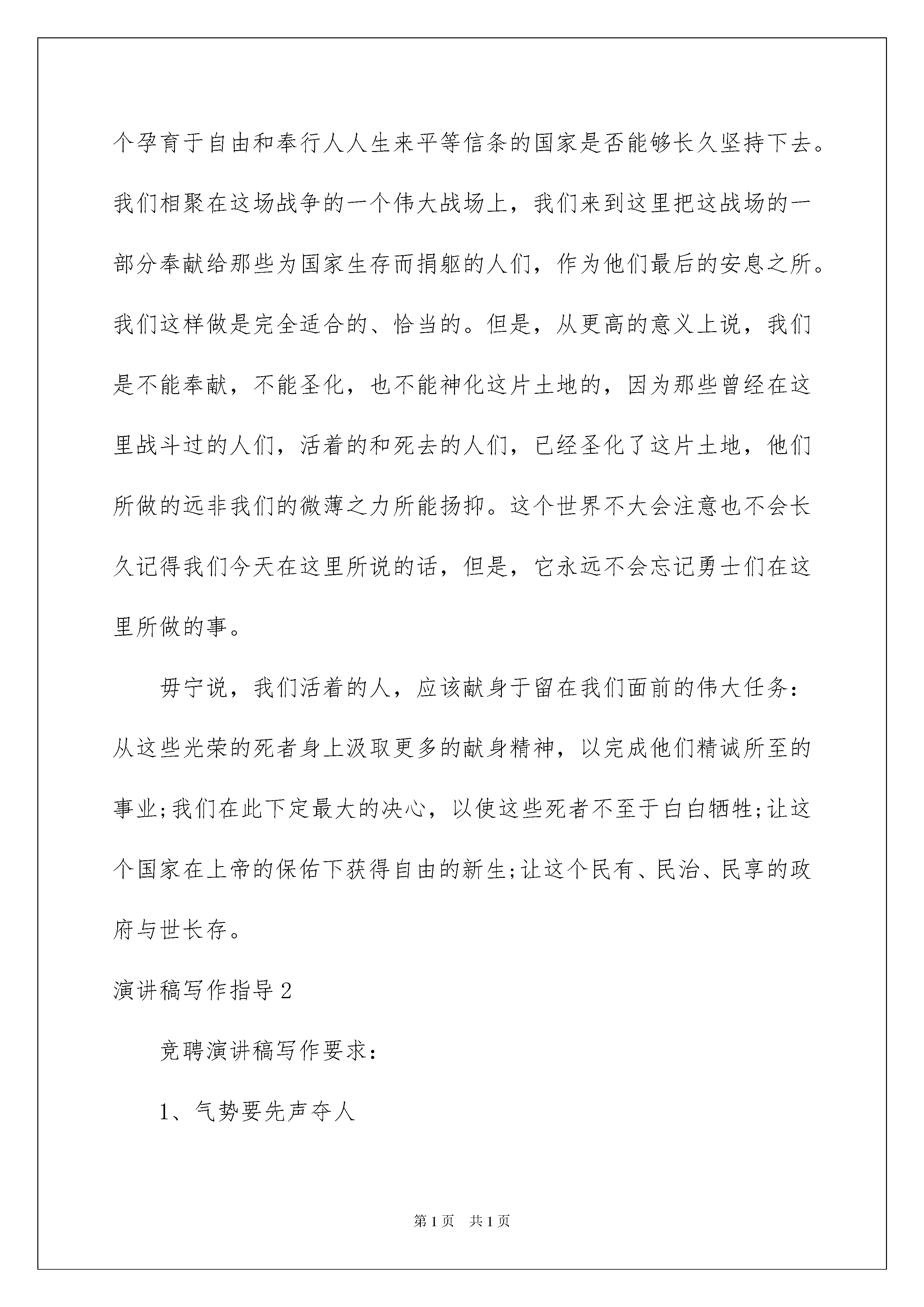 2022演讲稿写作指导演讲稿写作指导演讲稿特别注重结构清楚,层次简明。在日新月异的现代社会中,我们使用上演讲稿的情况与日俱增,为了让您在写演讲稿时更加简单方便,下面是我为大家整理的演讲稿写作指导,希望能够帮助到大家。演讲稿写作指导1演讲稿,也叫演讲辞,是演讲者为了在公共场合演讲而事先写的书面材料。演讲稿可以帮助演讲者整理演讲思路、规范演讲语言、提示演讲内容,从而提高演讲水平,使演讲更精彩,更能打动听众。可以用来交流思想、感情,表达主张、见解,具有宣传、鼓动和教育等作用。演讲稿作为演讲的底稿,与演讲的特性相吻合,具有鲜明的感情色彩和强烈的鼓舞性、感染力,是口头语言和书面语言的结合。演讲的口语表达要声情并茂,书面表达就要文情并茂。演讲与现场、会议等正式官方讲话不同,有较强的个性特征和感情色彩,可运用文学手法。在申论考试中,演讲稿应向正式讲话的写法靠拢,要在流畅的口语中符合政论的严谨性,在严肃的政论中发挥口语和文学手法多彩的感染力。演讲稿的结构分开头、主体、结尾三个部分。由于演讲是具有时间性和空间性的活动,因而,演讲稿范文与一般文章略有不同,尤其是它的开头和结尾有特殊的要求。一、开头:抓住听众,引人入胜演讲稿的开头,也叫开场白。它在演讲稿的结构中处于显要的地位,具有重要的作用。好的演讲稿,一开头就应该用最简洁的语言、最经济的时间,把听众的注意力和兴奋点吸引过来,这样,才能达到出奇制胜的效果。二、主体:环环相扣,层层深入主体是演讲稿的主要部分。在行文的过程中,要处理好层次、节奏和衔接等几个问题。(一)层次层次是演讲稿思想内容的表现次序,是根据演讲的时空特点对演讲材料加以选取和组合而形成的。最简单的方式是用数字序号来表达内容的层次,如提出3个问题,第1、第2、第3,或有3种方法等等。此外,演讲稿中也可以使用过渡句,或用“首先”“其次”“然后”等语词来区别层次,这也是使演讲思路清晰的有效方法。(二)节奏节奏是指演讲内容在结构安排上表现出的张弛起伏,主要通过演讲内容的变换来实现。节奏变化会使听众不至于疲劳,如在演讲稿范文中,适当地插入幽默、诗文、轶事等,使演讲内容不单一,以便听众的注意力能够长时间地保持高度集中。相反,如果节奏变换过于频繁,也会造成听众注意力涣散。(三)衔接衔接是指把演讲中的各个内容层次联结起来。演讲稿结构衔接的方法主要是运用两段内容、两个层次有联系的过渡段或过渡句,从而使各个内容层次的变换更为巧妙和自然,使演讲稿富于整体感,有助于演讲主题的深入人心。三、结尾:简洁有力,余音绕梁结尾是演讲内容的自然结束。言简意赅、余音绕梁的结尾能够震撼听众,促使听众不断地思考和回味。演讲稿结尾没有固定的格式,可以是对演讲全文要点进行简明扼要的小结,也可以是号召性、激励性的口号,也可以是名人名言以及幽默的话。结尾的重要原则是:一定要给听众留下深刻的印象。下面提供1863年11月19日林肯在葛底斯堡联邦军队阵亡将士公墓落成奠礼上的演说稿。葛底斯堡战役是美国南北战争中最为残酷的一战,这场战役交战双方共死了51000人,而当时美国只有几百万人口。这段演说经过了林肯彻夜的准备,实际讲来只有三分钟,而掌声却持续了10分钟;讲稿的文字不超过400余字,却字斟句酌,言简意赅,尤其是第二段逻辑的严谨、语言组织的环环相扣,显示出了作者思想的深刻性和高度的语言技巧。同时这也是一篇平实的议论文,是平铺直叙论点的典型。其中连续的排比句,“但是”,“既不能,也不能”等转折、否定句的运用,在平实的风格下凝聚着潜在的激情;“自由”、“牺牲”等严肃、神圣的词语,增强了演说的鼓舞性和感染力,对于起草演讲稿具有示范作用。《林肯在葛底斯堡联邦军队阵亡将士公墓落成奠礼上的演说稿》87年前,我们的先辈在这个大陆上创建了一个新的国家。她孕育于自由之中,奉行人人生来平等的信条。现在我们正进行一场伟大的内战,以考验这个国家,或者任何一个孕育于自由和奉行人人生来平等信条的国家是否能够长久坚持下去。我们相聚在这场战争的一个伟大战场上,我们来到这里把这战场的一部分奉献给那些为国家生存而捐躯的人们,作为他们最后的安息之所。我们这样做是完全适合的、恰当的。但是,从更高的意义上说,我们是不能奉献,不能圣化,也不能神化这片土地的,因为那些曾经在这里战斗过的人们,活着的和死去的人们,已经圣化了这片土地,他们所做的远非我们的微薄之力所能扬抑。这个世界不大会注意也不会长久记得我们今天在这里所说的话,但是,它永远不会忘记勇士们在这里所做的事。毋宁说,我们活着的人,应该献身于留在我们面前的伟大任务:从这些光荣的死者身上汲取更多的献身精神,以完成他们精诚所至的