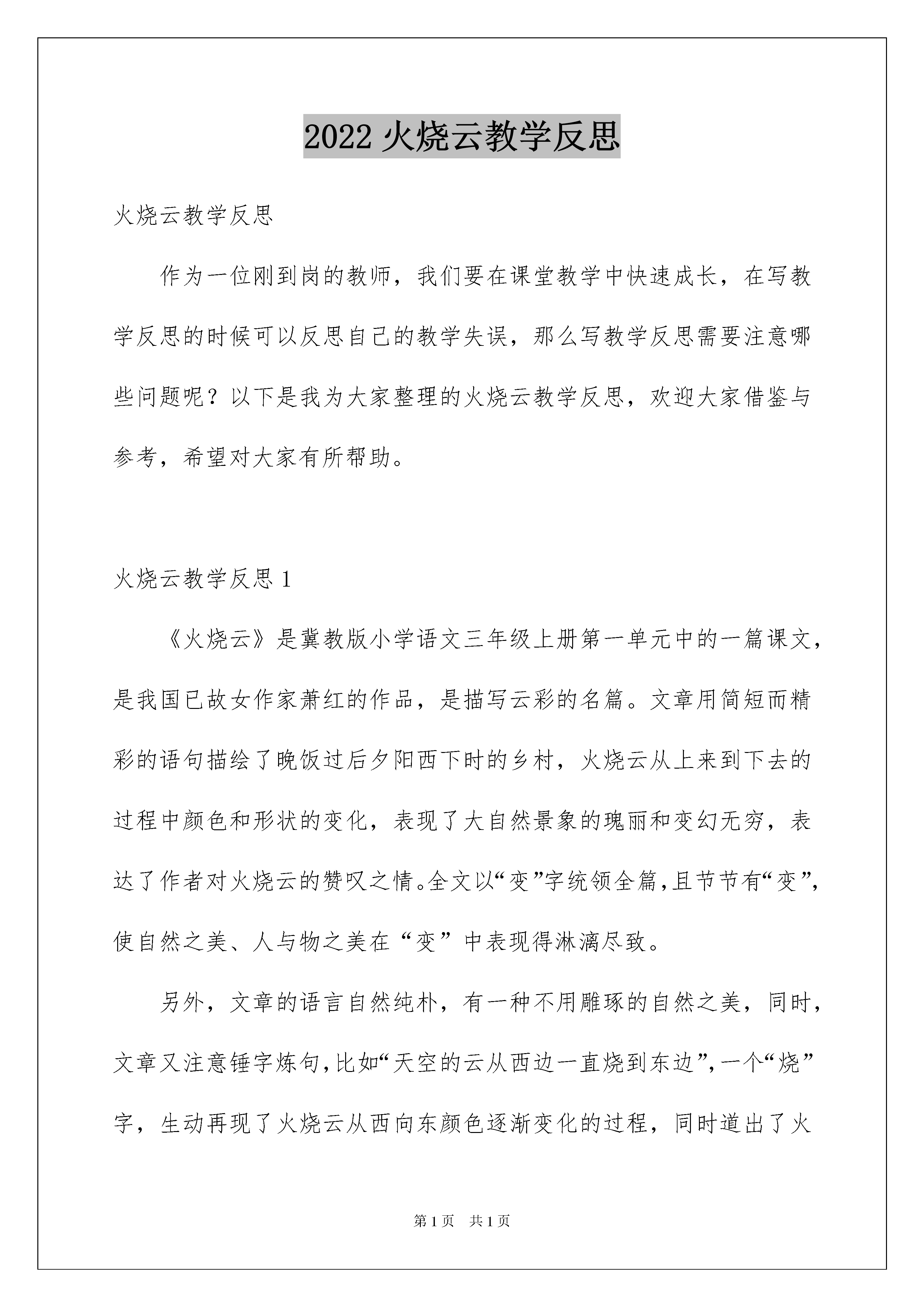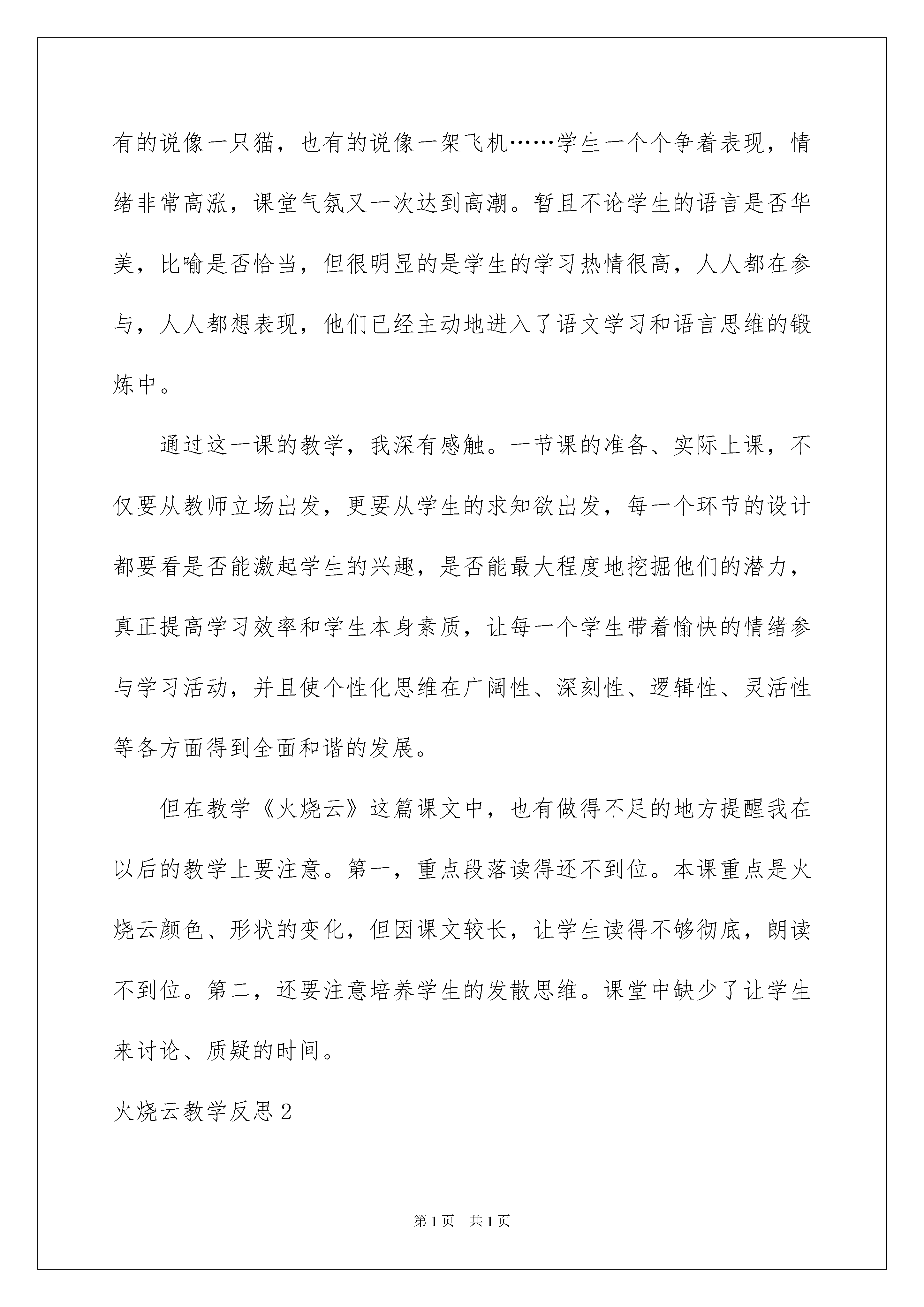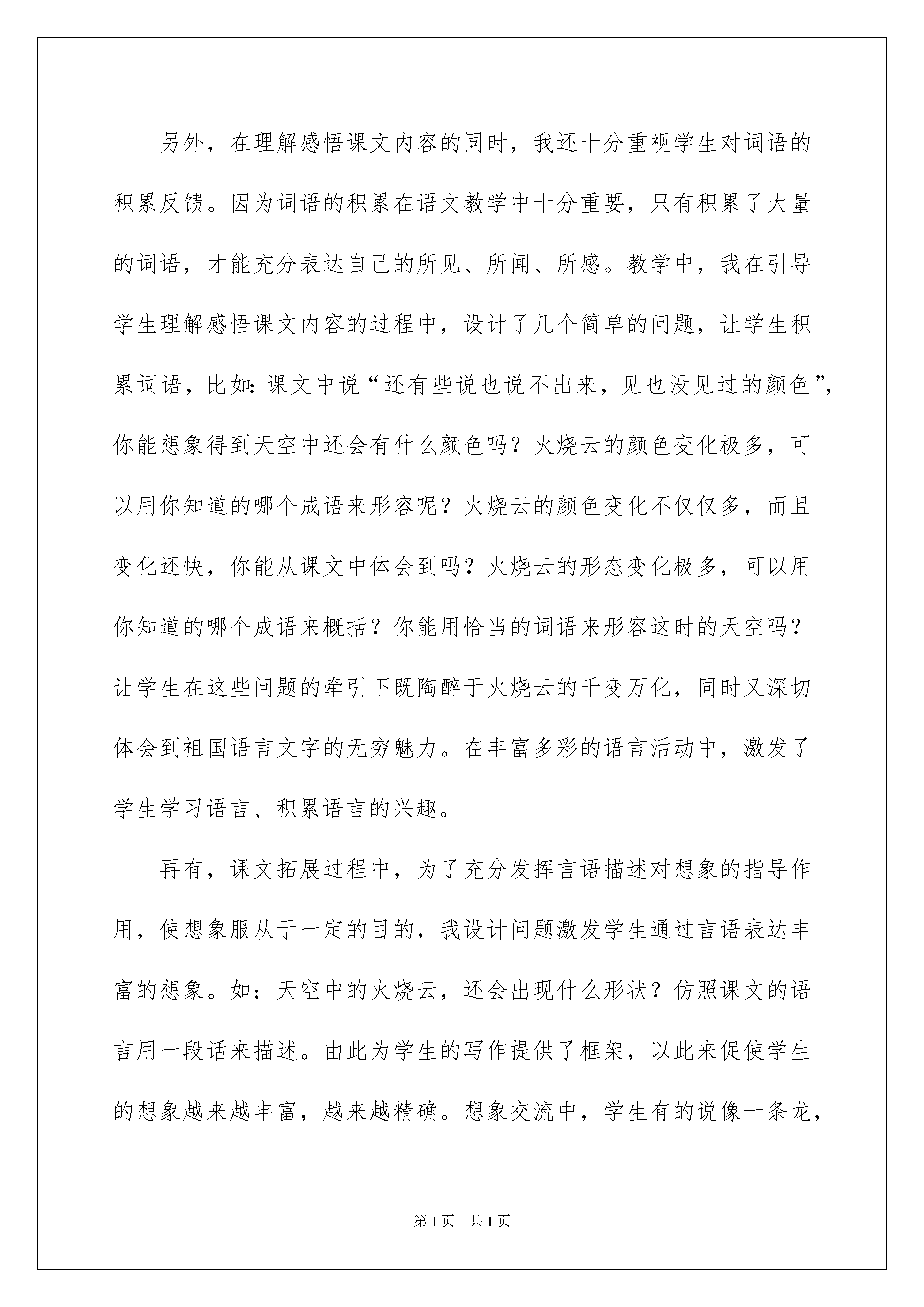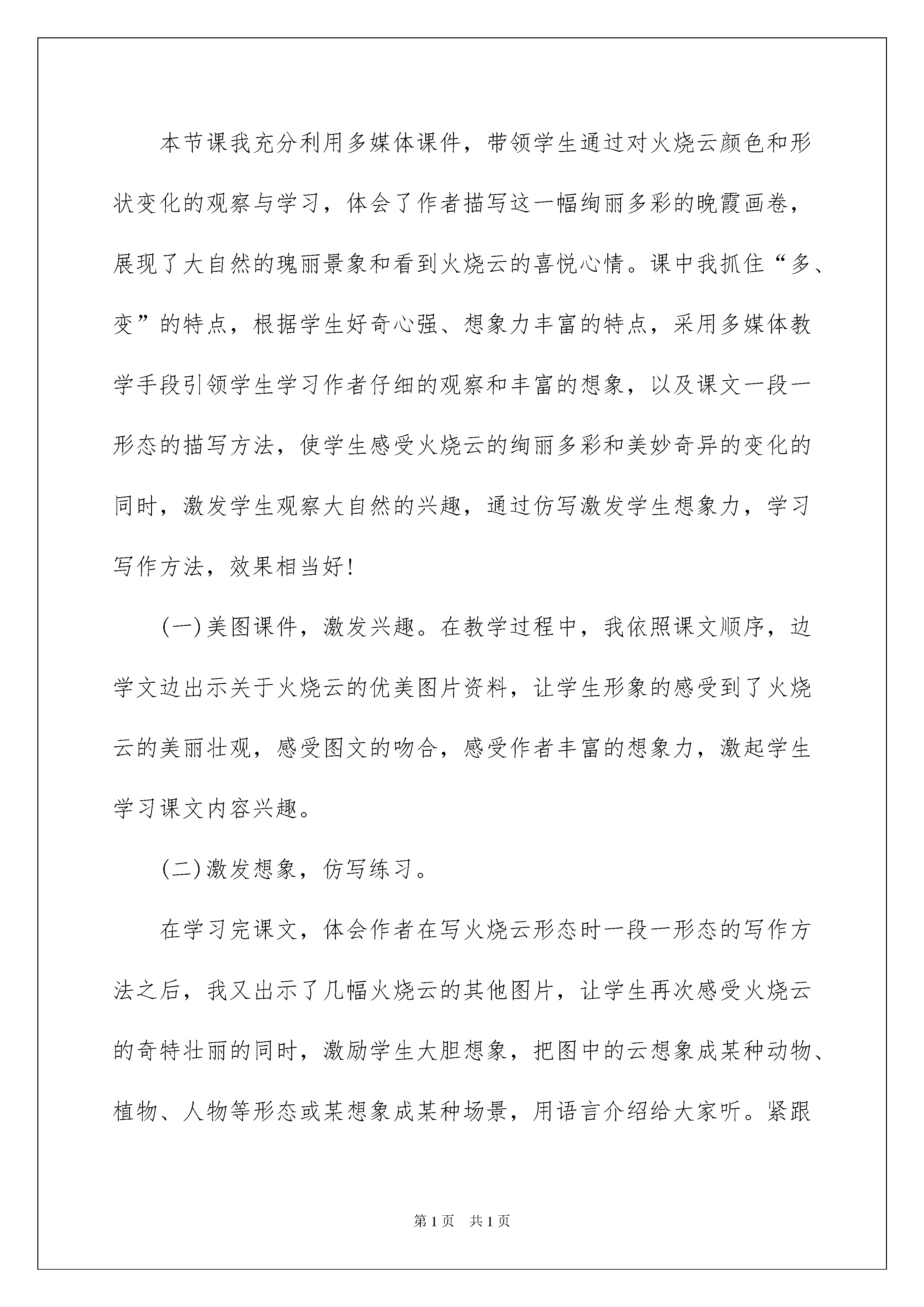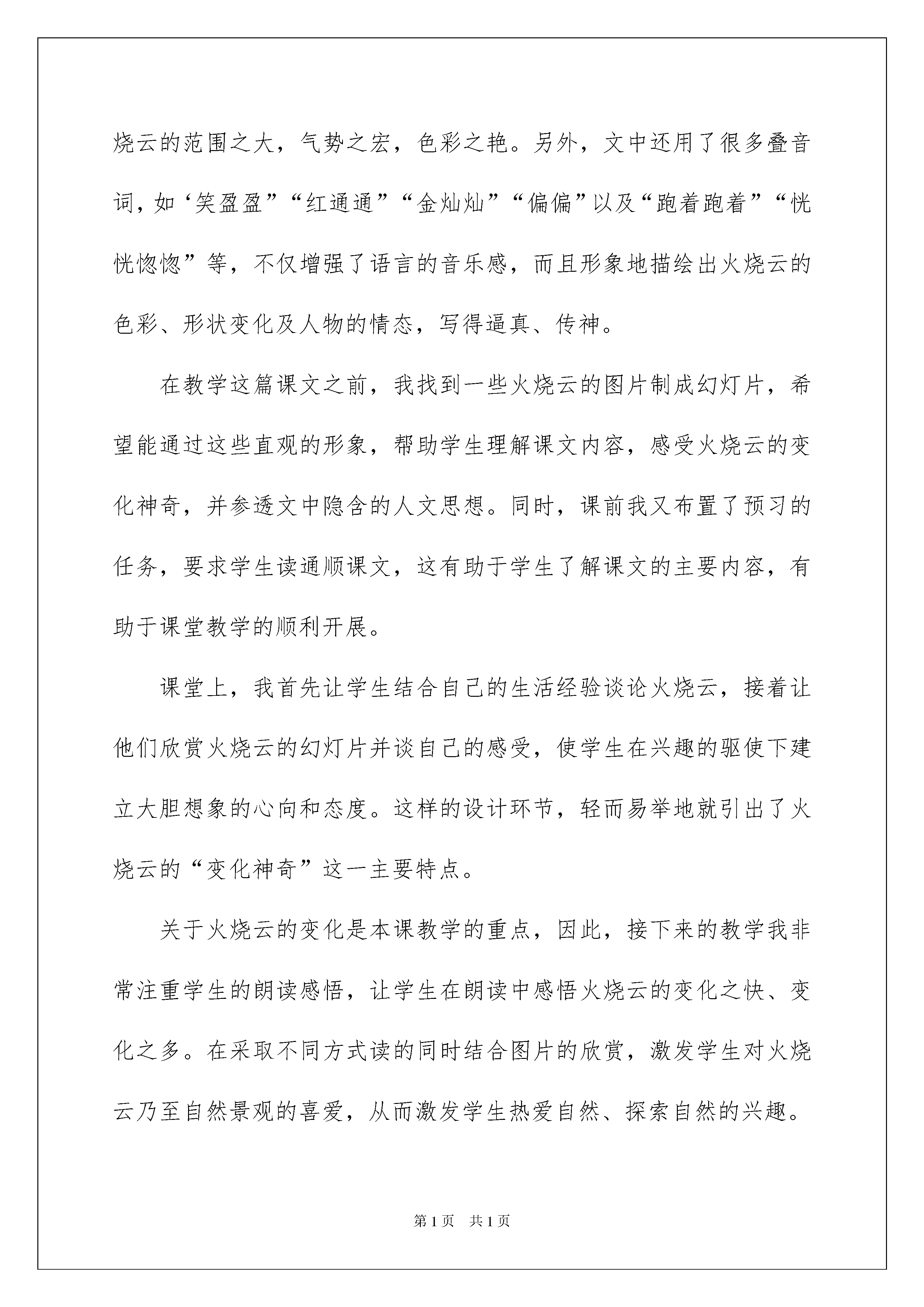 2022火烧云教学反思火烧云教学反思作为一位刚到岗的教师,我们要在课堂教学中快速成长,在写教学反思的时候可以反思自己的教学失误,那么写教学反思需要注意哪些问题呢?以下是我为大家整理的火烧云教学反思,欢迎大家借鉴与参考,希望对大家有所帮助。火烧云教学反思1《火烧云》是冀教版小学语文三年级上册第一单元中的一篇课文,是我国已故女作家萧红的作品,是描写云彩的名篇。文章用简短而精彩的语句描绘了晚饭过后夕阳西下时的乡村,火烧云从上来到下去的过程中颜色和形状的变化,表现了大自然景象的瑰丽和变幻无穷,表达了作者对火烧云的赞叹之情。全文以“变”字统领全篇,且节节有“变”,使自然之美、人与物之美在“变”中表现得淋漓尽致。另外,文章的语言自然纯朴,有一种不用雕琢的自然之美,同时,文章又注意锤字炼句,比如“天空的云从西边一直烧到东边”,一个“烧”字,生动再现了火烧云从西向东颜色逐渐变化的过程,同时道出了火烧云的范围之大,气势之宏,色彩之艳。另外,文中还用了很多叠音词,如‘笑盈盈”“红通通”“金灿灿”“偏偏”以及“跑着跑着”“恍恍惚惚”等,不仅增强了语言的音乐感,而且形象地描绘出火烧云的色彩、形状变化及人物的情态,写得逼真、传神。在教学这篇课文之前,我找到一些火烧云的图片制成幻灯片,希望能通过这些直观的形象,帮助学生理解课文内容,感受火烧云的变化神奇,并参透文中隐含的人文思想。同时,课前我又布置了预习的任务,要求学生读通顺课文,这有助于学生了解课文的主要内容,有助于课堂教学的顺利开展。课堂上,我首先让学生结合自己的生活经验谈论火烧云,接着让他们欣赏火烧云的幻灯片并谈自己的感受,使学生在兴趣的驱使下建立大胆想象的心向和态度。这样的设计环节,轻而易举地就引出了火烧云的“变化神奇”这一主要特点。关于火烧云的变化是本课教学的重点,因此,接下来的教学我非常注重学生的朗读感悟,让学生在朗读中感悟火烧云的变化之快、变化之多。在采取不同方式读的同时结合图片的欣赏,激发学生对火烧云乃至自然景观的喜爱,从而激发学生热爱自然、探索自然的兴趣。另外,在理解感悟课文内容的同时,我还十分重视学生对词语的积累反馈。因为词语的积累在语文教学中十分重要,只有积累了大量的词语,才能充分表达自己的所见、所闻、所感。教学中,我在引导学生理解感悟课文内容的过程中,设计了几个简单的问题,让学生积累词语,比如:课文中说“还有些说也说不出来,见也没见过的颜色”,你能想象得到天空中还会有什么颜色吗?火烧云的颜色变化极多,可以用你知道的哪个成语来形容呢?火烧云的颜色变化不仅仅多,而且变化还快,你能从课文中体会到吗?火烧云的形态变化极多,可以用你知道的哪个成语来概括?你能用恰当的词语来形容这时的天空吗?让学生在这些问题的牵引下既陶醉于火烧云的千变万化,同时又深切体会到祖国语言文字的无穷魅力。在丰富多彩的语言活动中,激发了学生学习语言、积累语言的兴趣。再有,课文拓展过程中,为了充分发挥言语描述对想象的指导作用,使想象服从于一定的目的,我设计问题激发学生通过言语表达丰富的想象。如:天空中的火烧云,还会出现什么形状?仿照课文的语言用一段话来描述。由此为学生的写作提供了框架,以此来促使学生的想象越来越丰富,越来越精确。想象交流中,学生有的说像一条龙,有的说像一只猫,也有的说像一架飞机……学生一个个争着表现,情绪非常高涨,课堂气氛又一次达到高潮。暂且不论学生的语言是否华美,比喻是否恰当,但很明显的是学生的学习热情很高,人人都在参与,人人都想表现,他们已经主动地进入了语文学习和语言思维的锻炼中。通过这一课的教学,我深有感触。一节课的准备、实际上课,不仅要从教师立场出发,更要从学生的求知欲出发,每一个环节的设计都要看是否能激起学生的兴趣,是否能最大程度地挖掘他们的潜力,真正提高学习效率和学生本身素质,让每一个学生带着愉快的情绪参与学习活动,并且使个性化思维在广阔性、深刻性、逻辑性、灵活性等各方面得到全面和谐的发展。但在教学《火烧云》这篇课文中,也有做得不足的地方提醒我在以后的教学上要注意。第一,重点段落读得还不到位。本课重点是火烧云颜色、形状的变化,但因课文较长,让学生读得不够彻底,朗读不到位。第二,还要注意培养学生的发散思维。课堂中缺少了让学生来讨论、质疑的时间。火烧云教学反思2本节课我充分利用多媒体课件,带领学生通过对火烧云颜色和形状变化的观察与学习,体会了作者描写这一幅绚丽多彩的晚霞画卷,展现了大自然的瑰丽景象和看到火烧云的喜悦心情。课中我抓住“多、变”的特点,根据学生好奇心强、想象力丰富的特点,采用多媒体教学手段引领学生学习作者仔细的观察和丰富的想象,以及