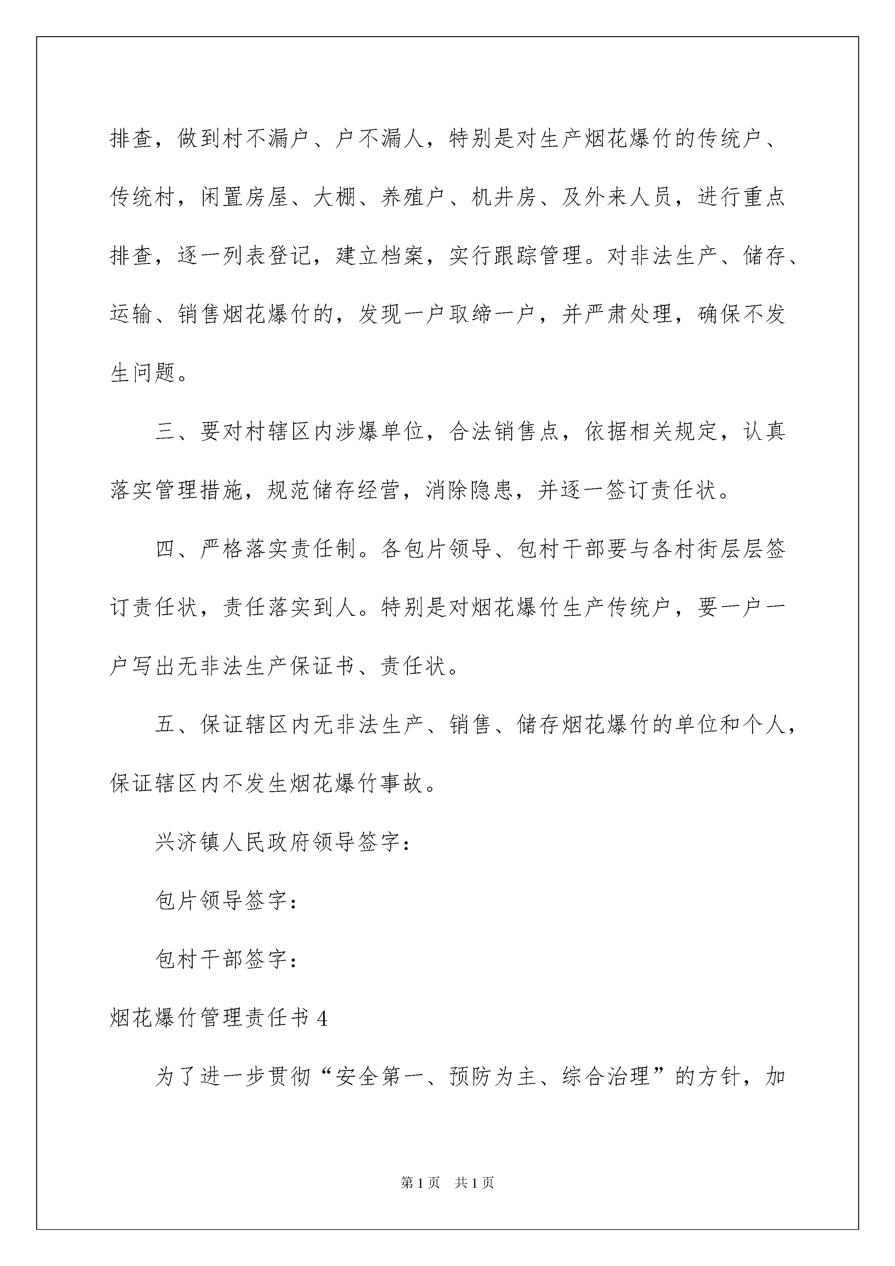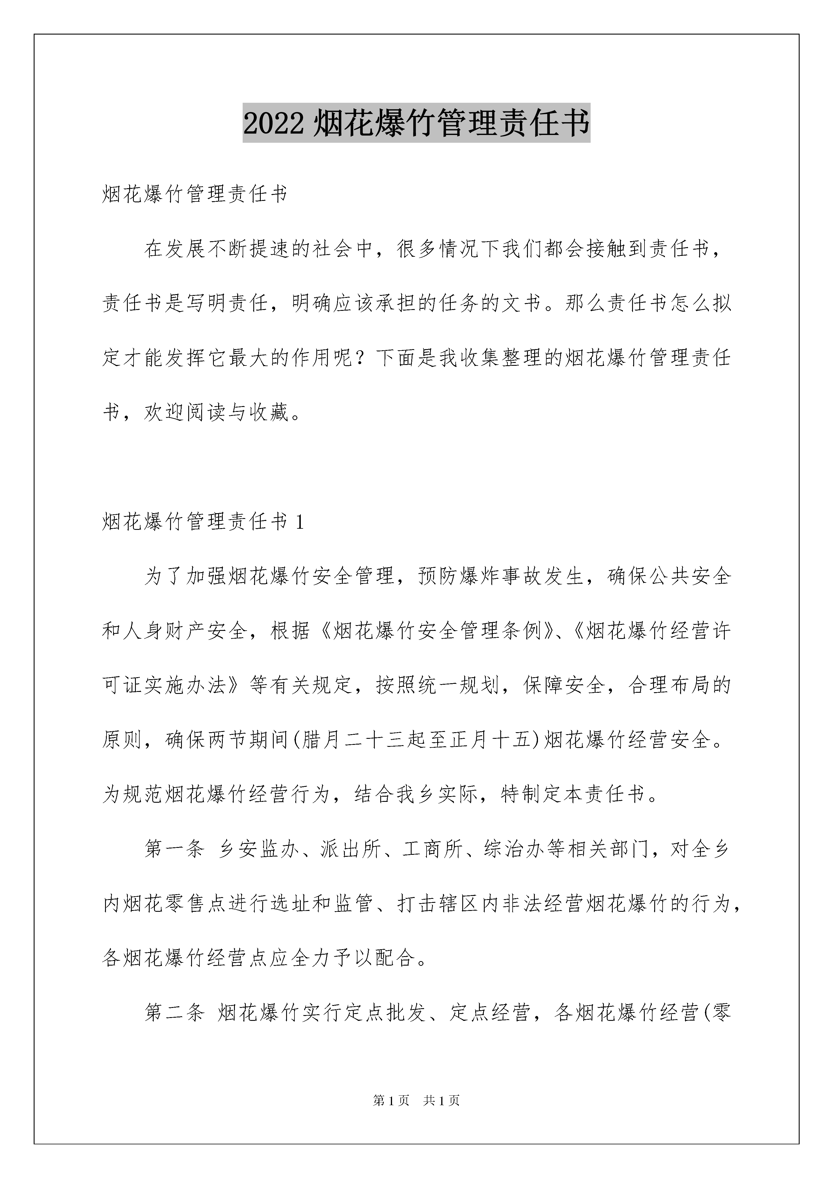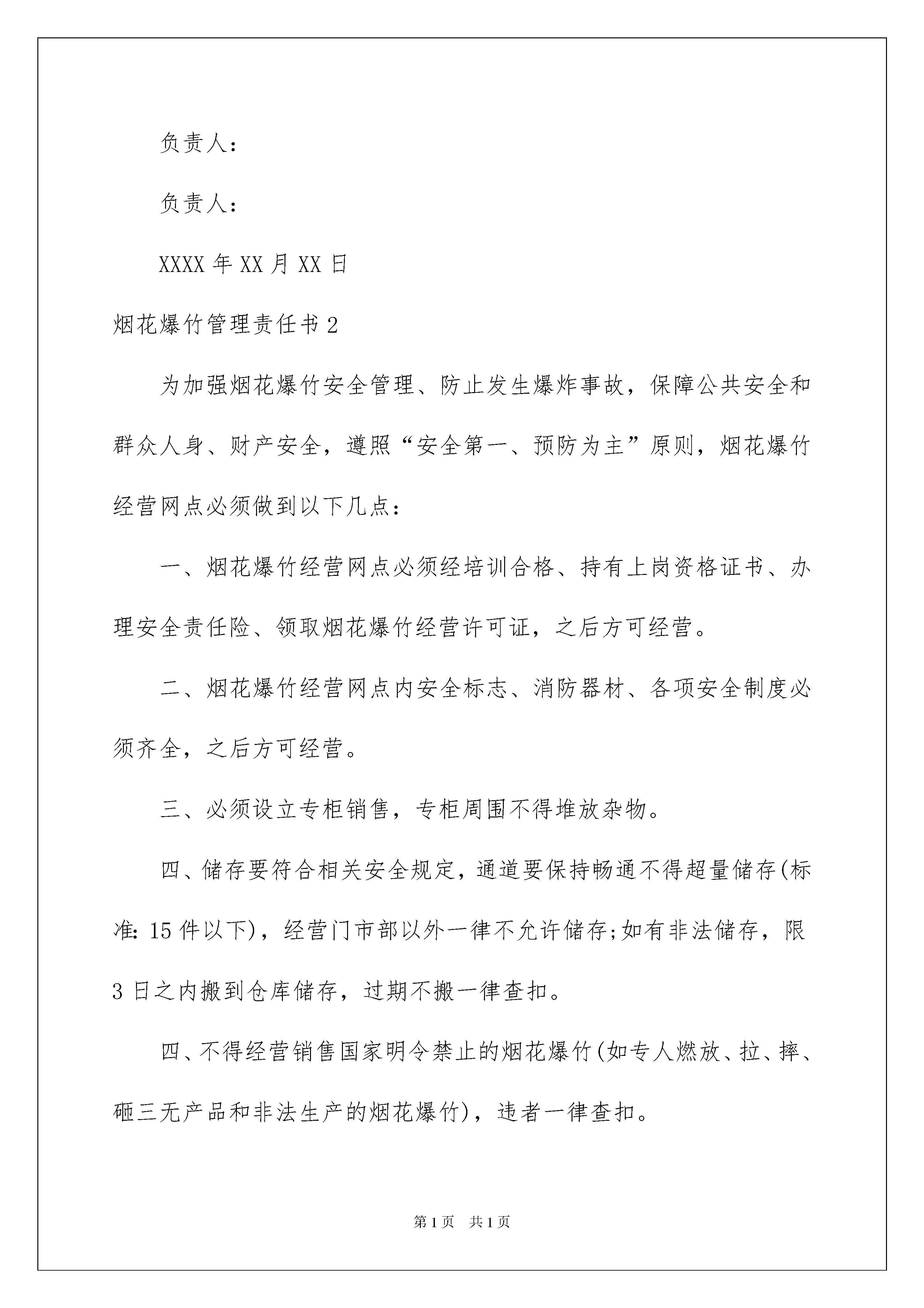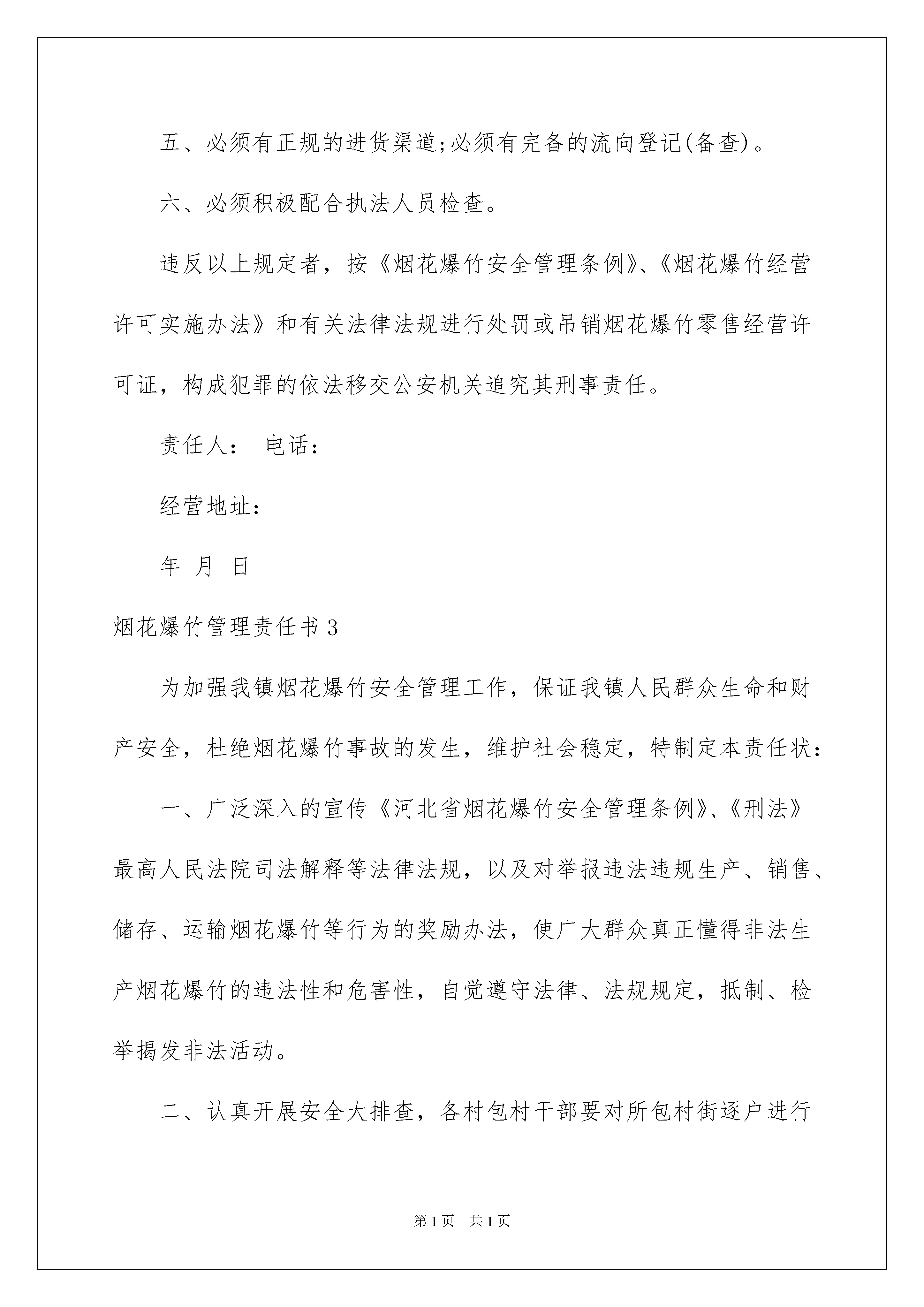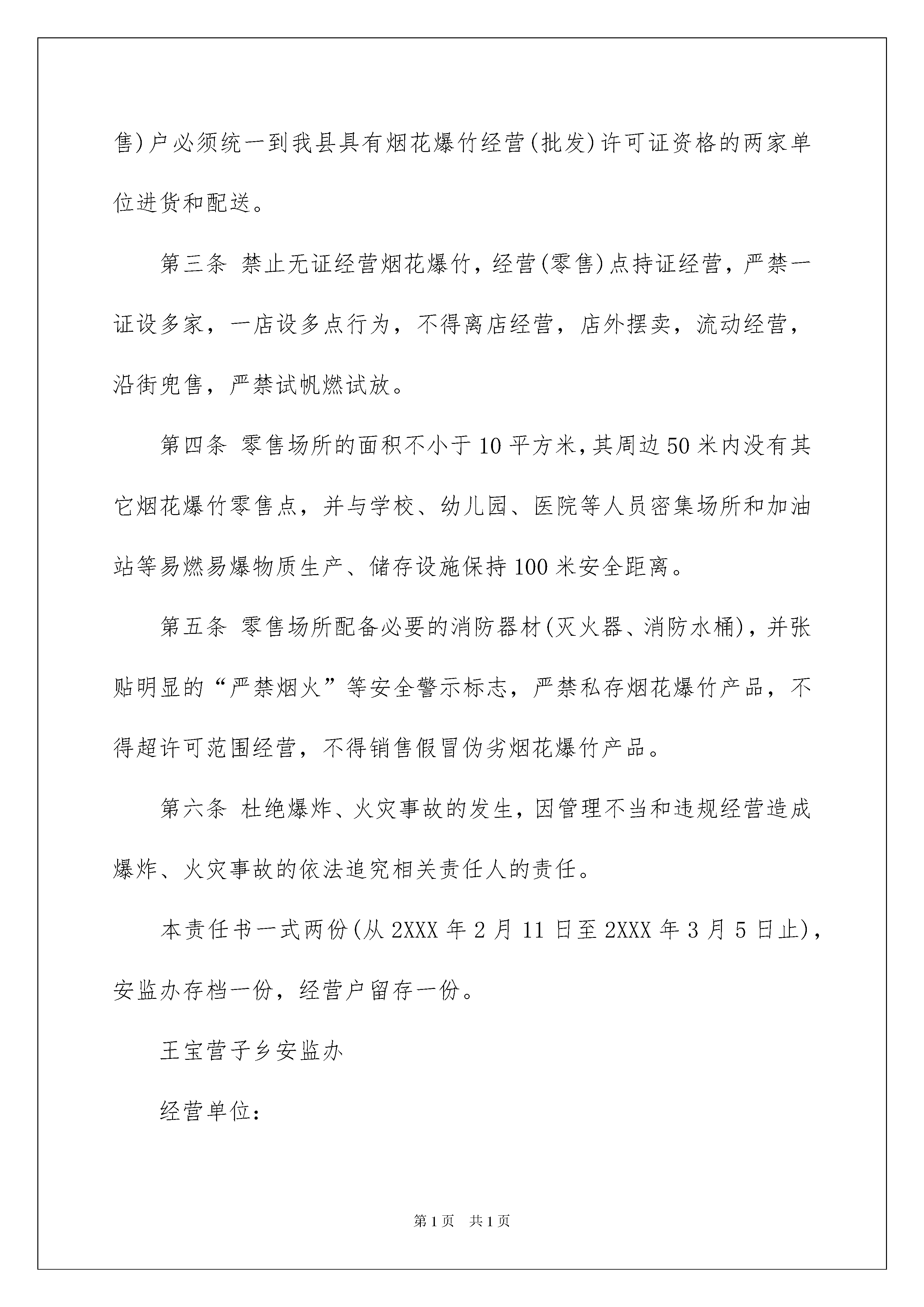 2022烟花爆竹管理责任书烟花爆竹管理责任书在发展不断提速的社会中,很多情况下我们都会接触到责任书,责任书是写明责任,明确应该承担的任务的文书。那么责任书怎么拟定才能发挥它最大的作用呢?下面是我收集整理的烟花爆竹管理责任书,欢迎阅读与收藏。烟花爆竹管理责任书1为了加强烟花爆竹安全管理,预防爆炸事故发生,确保公共安全和人身财产安全,根据《烟花爆竹安全管理条例》、《烟花爆竹经营许可证实施办法》等有关规定,按照统一规划,保障安全,合理布局的原则,确保两节期间(腊月二十三起至正月十五)烟花爆竹经营安全。为规范烟花爆竹经营行为,结合我乡实际,特制定本责任书。第一条乡安监办、派出所、工商所、综治办等相关部门,对全乡内烟花零售点进行选址和监管、打击辖区内非法经营烟花爆竹的行为,各烟花爆竹经营点应全力予以配合。第二条烟花爆竹实行定点批发、定点经营,各烟花爆竹经营(零售)户必须统一到我县具有烟花爆竹经营(批发)许可证资格的两家单位进货和配送。第三条禁止无证经营烟花爆竹,经营(零售)点持证经营,严禁一证设多家,一店设多点行为,不得离店经营,店外摆卖,流动经营,沿街兜售,严禁试帆燃试放。第四条零售场所的面积不小于10平方米,其周边50米内没有其它烟花爆竹零售点,并与学校、幼儿园、医院等人员密集场所和加油站等易燃易爆物质生产、储存设施保持100米安全距离。第五条零售场所配备必要的消防器材(灭火器、消防水桶),并张贴明显的“严禁烟火”等安全警示标志,严禁私存烟花爆竹产品,不得超许可范围经营,不得销售假冒伪劣烟花爆竹产品。第六条杜绝爆炸、火灾事故的发生,因管理不当和违规经营造成爆炸、火灾事故的依法追究相关责任人的责任。本责任书一式两份(从2XXX年2月11日至2XXX年3月5日止),安监办存档一份,经营户留存一份。王宝营子乡安监办经营单位:负责人:负责人:XXXX年XX月XX日烟花爆竹管理责任书2为加强烟花爆竹安全管理、防止发生爆炸事故,保障公共安全和群众人身、财产安全,遵照“安全第一、预防为主”原则,烟花爆竹经营网点必须做到以下几点:一、烟花爆竹经营网点必须经培训合格、持有上岗资格证书、办理安全责任险、领取烟花爆竹经营许可证,之后方可经营。二、烟花爆竹经营网点内安全标志、消防器材、各项安全制度必须齐全,之后方可经营。三、必须设立专柜销售,专柜周围不得堆放杂物。四、储存要符合相关安全规定,通道要保持畅通不得超量储存(标准:15件以下),经营门市部以外一律不允许储存;如有非法储存,限3日之内搬到仓库储存,过期不搬一律查扣。四、不得经营销售国家明令禁止的烟花爆竹(如专人燃放、拉、摔、砸三无产品和非法生产的烟花爆竹),违者一律查扣。五、必须有正规的进货渠道;必须有完备的流向登记(备查)。六、必须积极配合执法人员检查。违反以上规定者,按《烟花爆竹安全管理条例》、《烟花爆竹经营许可实施办法》和有关法律法规进行处罚或吊销烟花爆竹零售经营许可证,构成犯罪的依法移交公安机关追究其刑事责任。责任人:电话:经营地址:年月日烟花爆竹管理责任书3为加强我镇烟花爆竹安全管理工作,保证我镇人民群众生命和财产安全,杜绝烟花爆竹事故的发生,维护社会稳定,特制定本责任状:一、广泛深入的宣传《河北省烟花爆竹安全管理条例》、《刑法》最高人民法院司法解释等法律法规,以及对举报违法违规生产、销售、储存、运输烟花爆竹等行为的奖励办法,使广大群众真正懂得非法生产烟花爆竹的违法性和危害性,自觉遵守法律、法规规定,抵制、检举揭发非法活动。二、认真开展安全大排查,各村包村干部要对所包村街逐户进行排查,做到村不漏户、户不漏人,特别是对生产烟花爆竹的传统户、传统村,闲置房屋、大棚、养殖户、机井房、及外来人员,进行重点排查,逐一列表登记,建立档案,实行跟踪管理。对非法生产、储存、运输、销售烟花爆竹的,发现一户取缔一户,并严肃处理,确保不发生问题。三、要对村辖区内涉爆单位,合法销售点,依据相关规定,认真落实管理措施,规范储存经营,消除隐患,并逐一签订责任状。四、严格落实责任制。各包片领导、包村干部要与各村街层层签订责任状,责任落实到人。特别是对烟花爆竹生产传统户,要一户一户写出无非法生产保证书、责任状。五、保证辖区内无非法生产、销售、储存烟花爆竹的单位和个人,保证辖区内不发生烟花爆竹事故。兴济镇人民政府领导签字:包片领导签字:包村干部签字:烟花爆竹管理责任书4为了进一步贯彻“安全第一、预防为主、综合治理”的方针,加强烟花爆竹经营环境的安全管理,保障人民生命财产安全,根据《安全生产法》、《安全生产许可条例》、《烟花爆竹安全管理条例》和省、市有关烟花爆竹经营安全