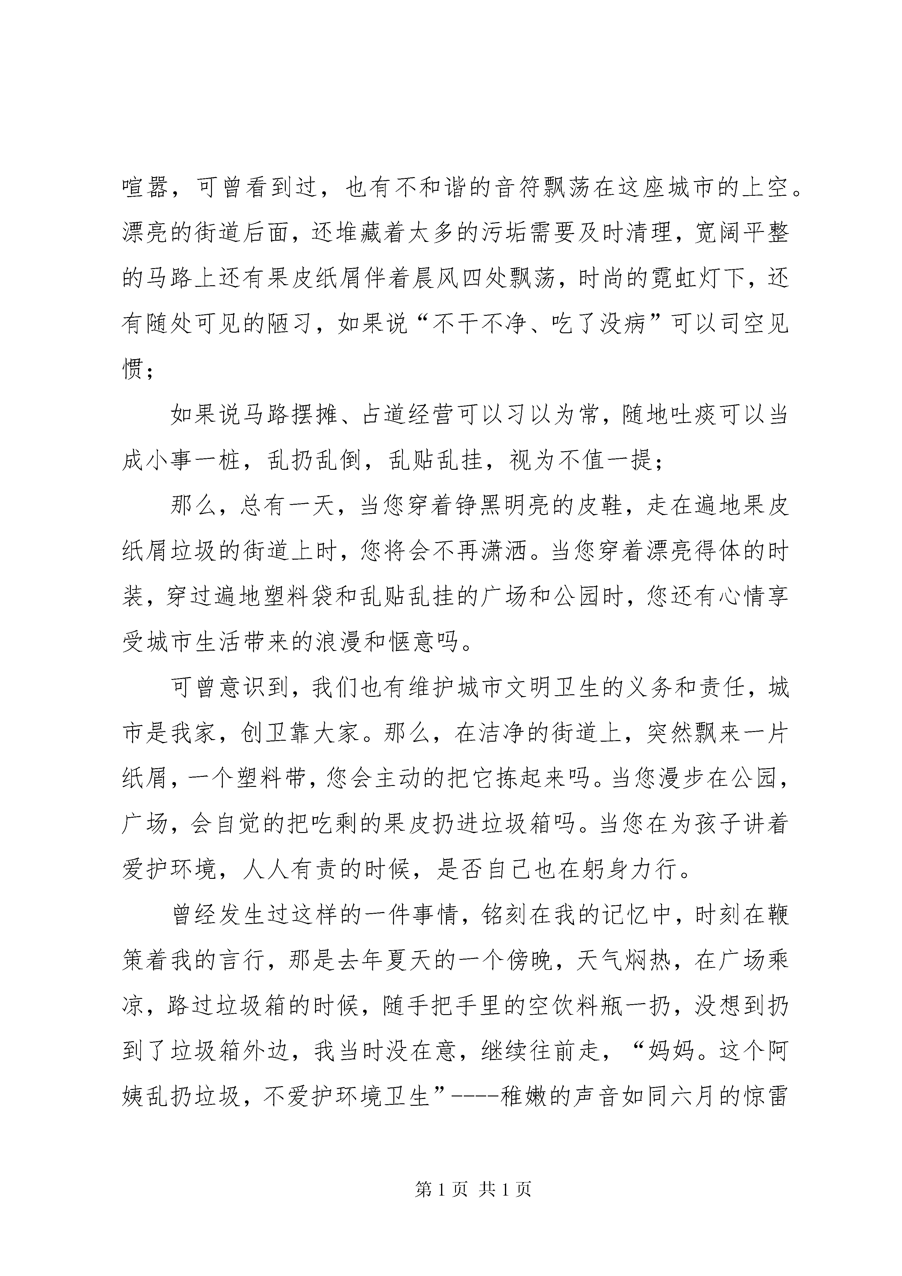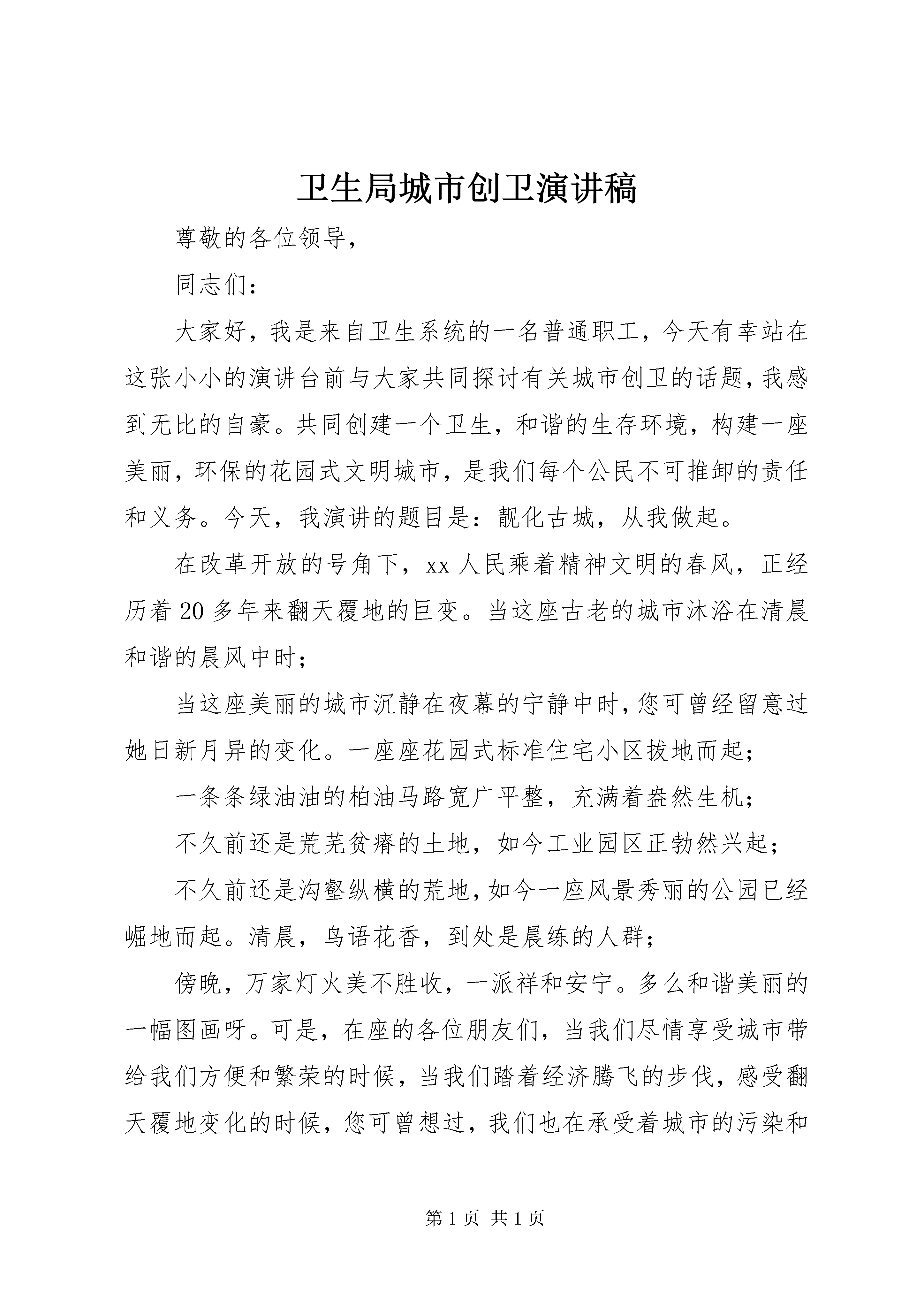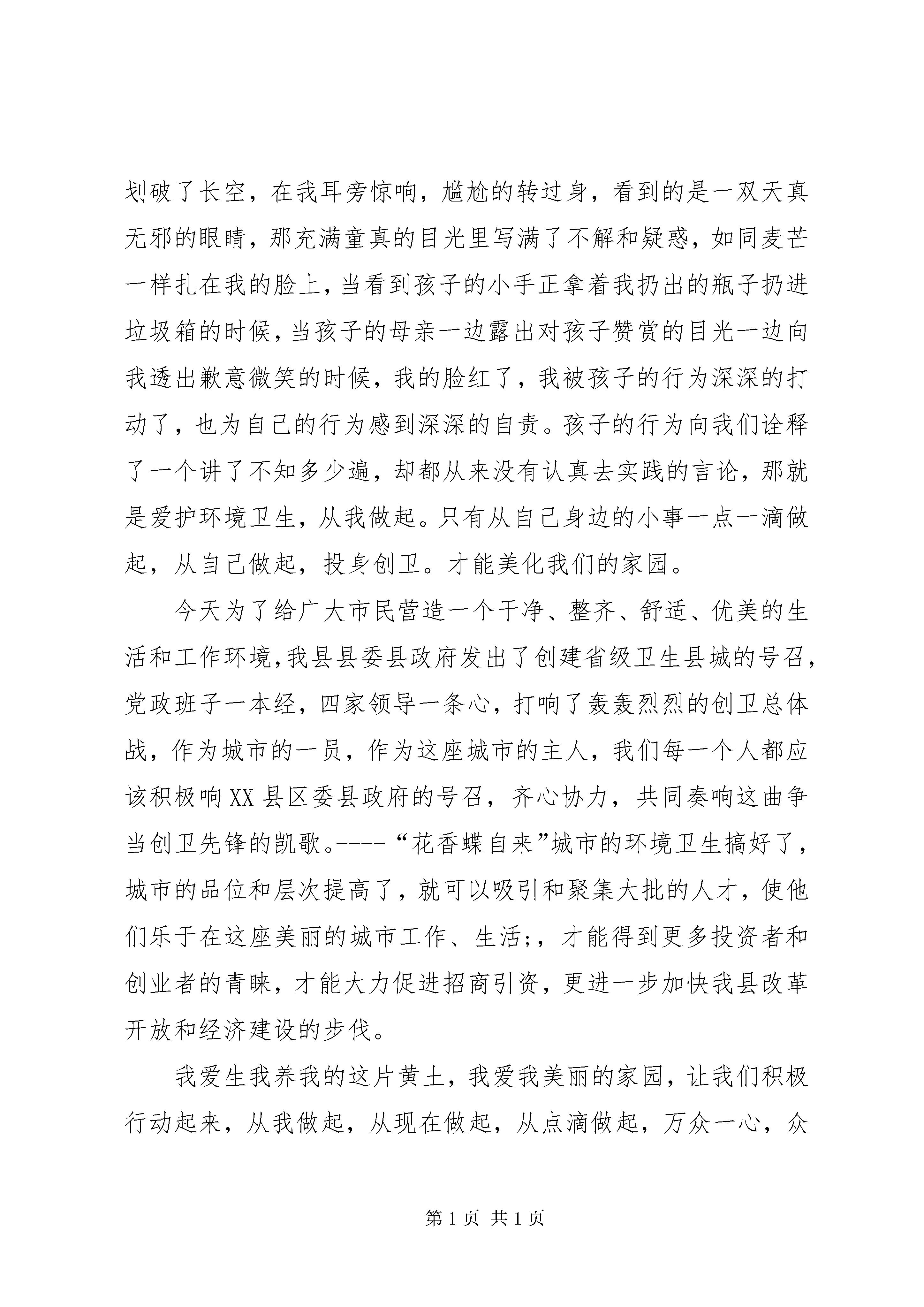 卫生局城市创卫演讲稿尊敬的各位领导,同志们:大家好,我是来自卫生系统的一名普通职工,今天有幸站在这张小小的演讲台前与大家共同探讨有关城市创卫的话题,我感到无比的自豪。共同创建一个卫生,和谐的生存环境,构建一座美丽,环保的花园式文明城市,是我们每个公民不可推卸的责任和义务。今天,我演讲的题目是:靓化古城,从我做起。在改革开放的号角下,xx人民乘着精神文明的春风,正经历着20多年来翻天覆地的巨变。当这座古老的城市沐浴在清晨和谐的晨风中时;当这座美丽的城市沉静在夜幕的宁静中时,您可曾经留意过她日新月异的变化。一座座花园式标准住宅小区拔地而起;一条条绿油油的柏油马路宽广平整,充满着盎然生机;不久前还是荒芜贫瘠的土地,如今工业园区正勃然兴起;不久前还是沟壑纵横的荒地,如今一座风景秀丽的公园已经崛地而起。清晨,鸟语花香,到处是晨练的人群;傍晚,万家灯火美不胜收,一派祥和安宁。多么和谐美丽的一幅图画呀。可是,在座的各位朋友们,当我们尽情享受城市带给我们方便和繁荣的时候,当我们踏着经济腾飞的步伐,感受翻天覆地变化的时候,您可曾想过,我们也在承受着城市的污染和喧嚣,可曾看到过,也有不和谐的音符飘荡在这座城市的上空。漂亮的街道后面,还堆藏着太多的污垢需要及时清理,宽阔平整的马路上还有果皮纸屑伴着晨风四处飘荡,时尚的霓虹灯下,还有随处可见的陋习,如果说“不干不净、吃了没病”可以司空见惯;如果说马路摆摊、占道经营可以习以为常,随地吐痰可以当成小事一桩,乱扔乱倒,乱贴乱挂,视为不值一提;那么,总有一天,当您穿着铮黑明亮的皮鞋,走在遍地果皮纸屑垃圾的街道上时,您将会不再潇洒。当您穿着漂亮得体的时装,穿过遍地塑料袋和乱贴乱挂的广场和公园时,您还有心情享受城市生活带来的浪漫和惬意吗。可曾意识到,我们也有维护城市文明卫生的义务和责任,城市是我家,创卫靠大家。那么,在洁净的街道上,突然飘来一片纸屑,一个塑料带,您会主动的把它拣起来吗。当您漫步在公园,广场,会自觉的把吃剩的果皮扔进垃圾箱吗。当您在为孩子讲着爱护环境,人人有责的时候,是否自己也在躬身力行。曾经发生过这样的一件事情,铭刻在我的记忆中,时刻在鞭策着我的言行,那是去年夏天的一个傍晚,天气焖热,在广场乘凉,路过垃圾箱的时候,随手把手里的空饮料瓶一扔,没想到扔到了垃圾箱外边,我当时没在意,继续往前走,“妈妈。这个阿姨乱扔垃圾,不爱护环境卫生”----稚嫩的声音如同六月的惊雷划破了长空,在我耳旁惊响,尴尬的转过身,看到的是一双天真无邪的眼睛,那充满童真的目光里写满了不解和疑惑,如同麦芒一样扎在我的脸上,当看到孩子的小手正拿着我扔出的瓶子扔进垃圾箱的时候,当孩子的母亲一边露出对孩子赞赏的目光一边向我透出歉意微笑的时候,我的脸红了,我被孩子的行为深深的打动了,也为自己的行为感到深深的自责。孩子的行为向我们诠释了一个讲了不知多少遍,却都从来没有认真去实践的言论,那就是爱护环境卫生,从我做起。只有从自己身边的小事一点一滴做起,从自己做起,投身创卫。才能美化我们的家园。今天为了给广大市民营造一个干净、整齐、舒适、优美的生活和工作环境,我县县委县政府发出了创建省级卫生县城的号召,党政班子一本经,四家领导一条心,打响了轰轰烈烈的创卫总体战,作为城市的一员,作为这座城市的主人,我们每一个人都应该积极响XX县区委县政府的号召,齐心协力,共同奏响这曲争当创卫先锋的凯歌。----“花香蝶自来”城市的环境卫生搞好了,城市的品位和层次提高了,就可以吸引和聚集大批的人才,使他们乐于在这座美丽的城市工作、生活;,才能得到更多投资者和创业者的青睐,才能大力促进招商引资,更进一步加快我县改革开放和经济建设的步伐。我爱生我养我的这片黄土,我爱我美丽的家园,让我们积极行动起来,从我做起,从现在做起,从点滴做起,万众一心,众志成城,就一定能够做好各项工作,创建省级卫生县城的目标就一定能够实现。让我们用爱心去关注我们周围的变化,用我们的热情去传播创卫的理念,用我们的行动去肩负创卫的重任。”那时我们的家园会变得更美丽。xx的明天会更辉煌。谢谢大家。