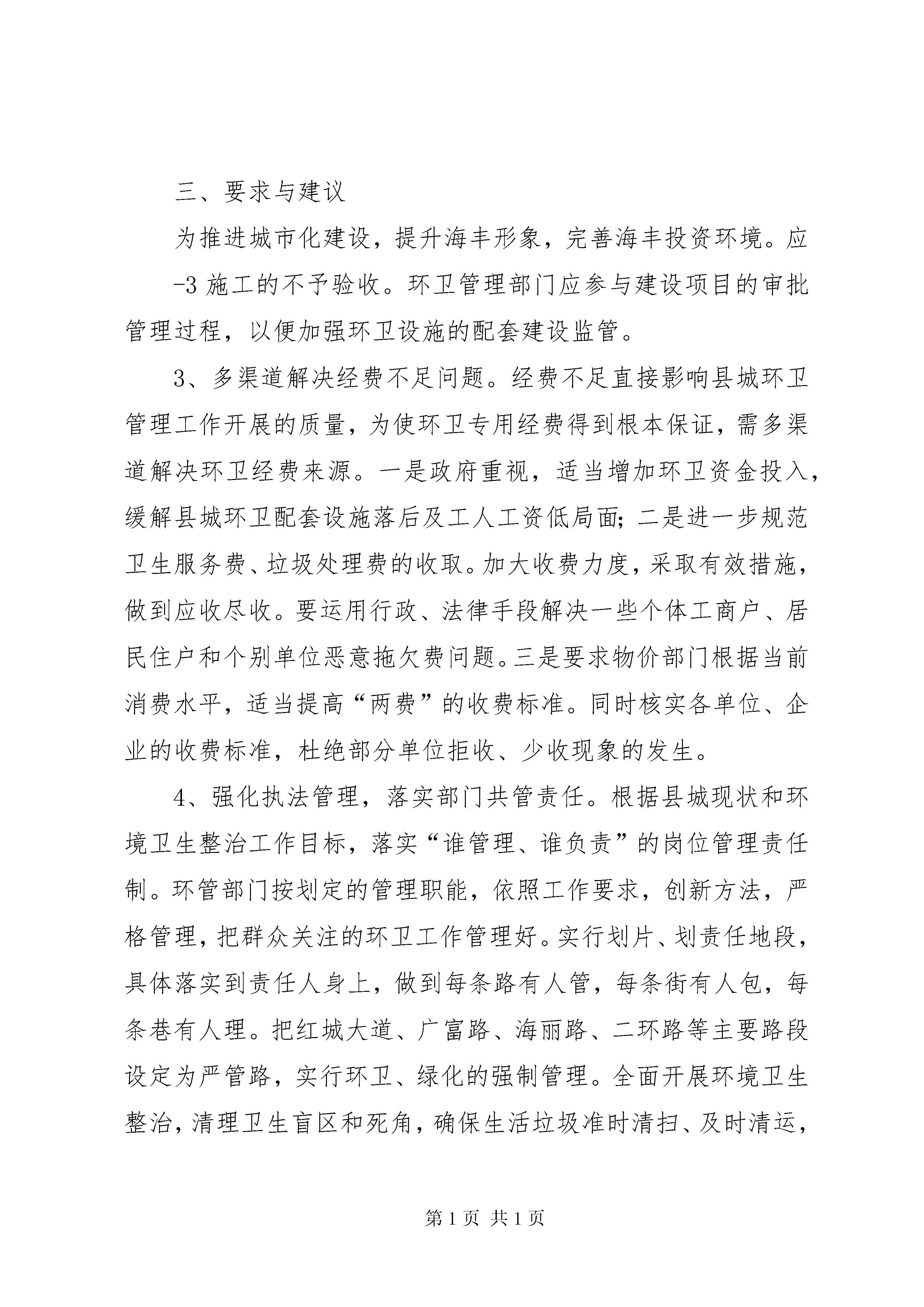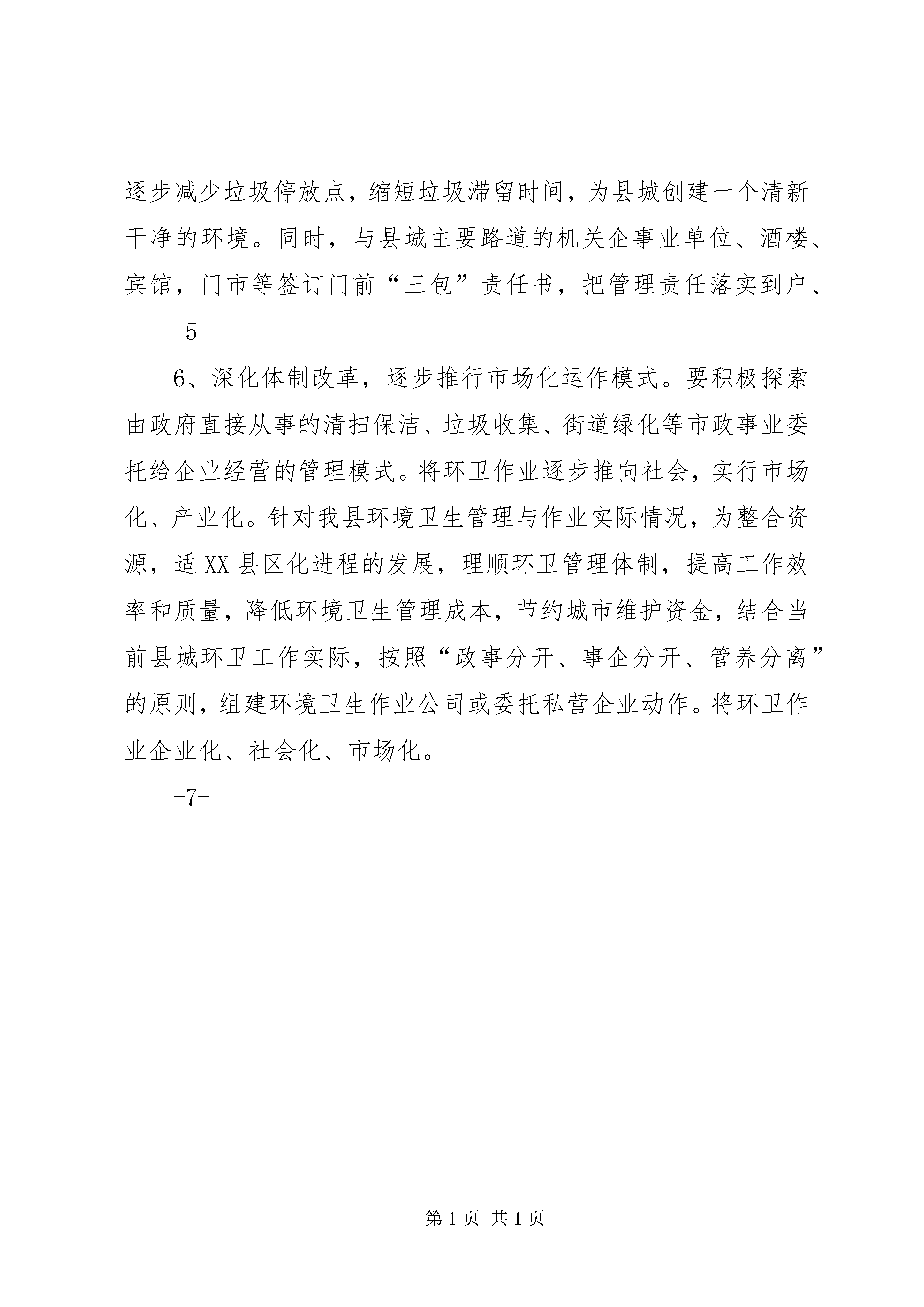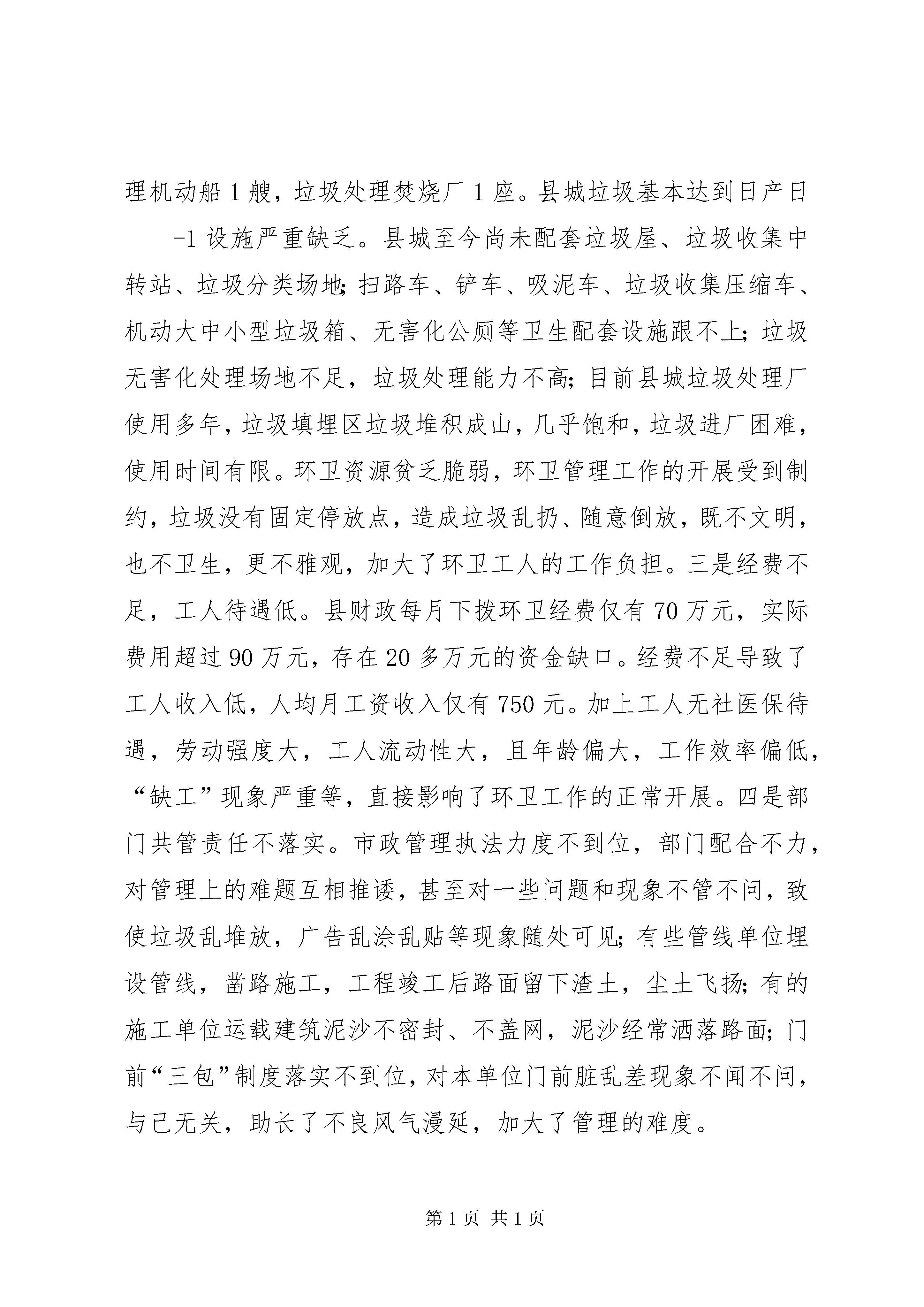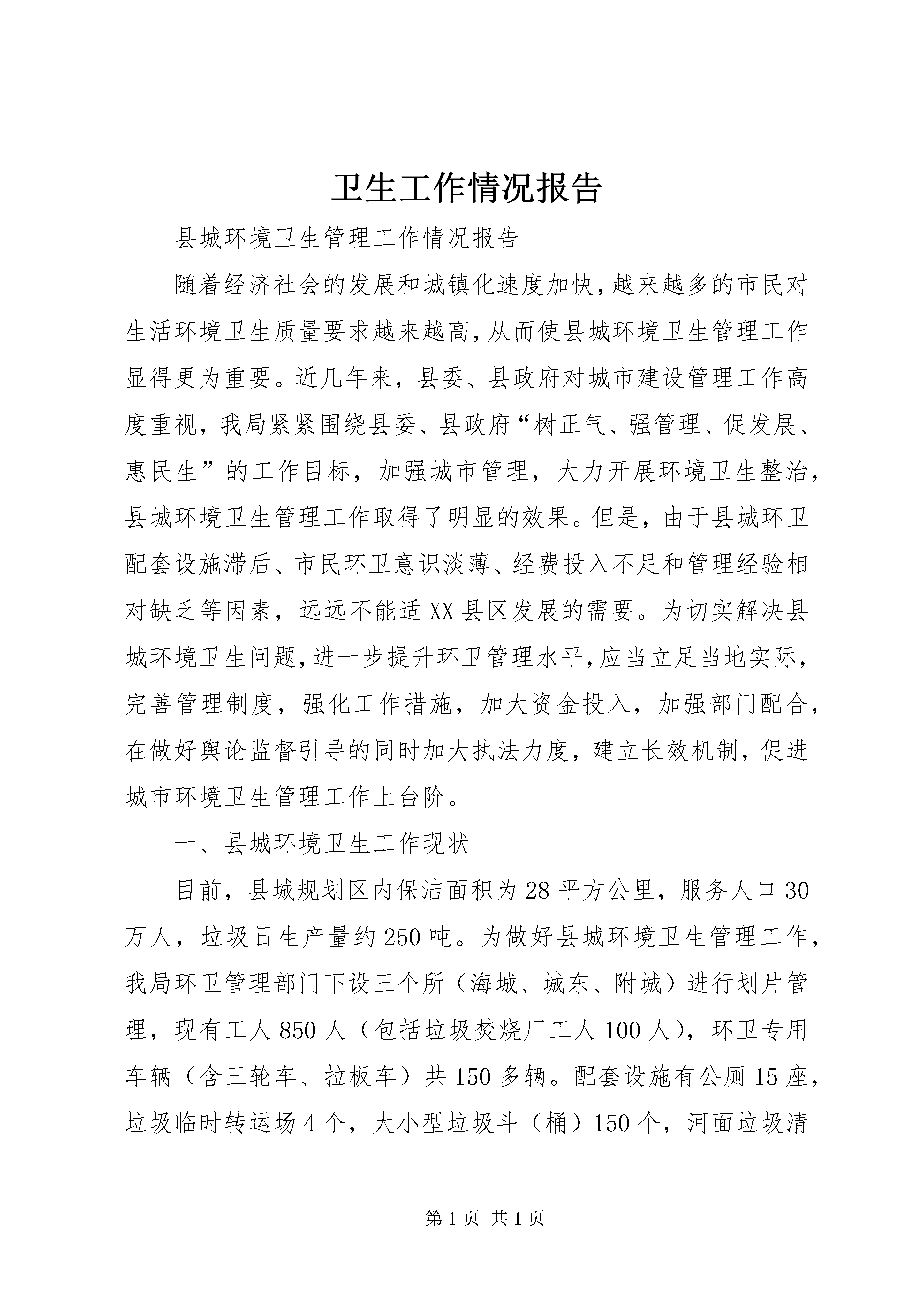 卫生工作情况报告县城环境卫生管理工作情况报告随着经济社会的发展和城镇化速度加快,越来越多的市民对生活环境卫生质量要求越来越高,从而使县城环境卫生管理工作显得更为重要。近几年来,县委、县政府对城市建设管理工作高度重视,我局紧紧围绕县委、县政府“树正气、强管理、促发展、惠民生”的工作目标,加强城市管理,大力开展环境卫生整治,县城环境卫生管理工作取得了明显的效果。但是,由于县城环卫配套设施滞后、市民环卫意识淡薄、经费投入不足和管理经验相对缺乏等因素,远远不能适XX县区发展的需要。为切实解决县城环境卫生问题,进一步提升环卫管理水平,应当立足当地实际,完善管理制度,强化工作措施,加大资金投入,加强部门配合,在做好舆论监督引导的同时加大执法力度,建立长效机制,促进城市环境卫生管理工作上台阶。一、县城环境卫生工作现状目前,县城规划区内保洁面积为28平方公里,服务人口30万人,垃圾日生产量约250吨。为做好县城环境卫生管理工作,我局环卫管理部门下设三个所(海城、城东、附城)进行划片管理,现有工人850人(包括垃圾焚烧厂工人100人),环卫专用车辆(含三轮车、拉板车)共150多辆。配套设施有公厕15座,垃圾临时转运场4个,大小型垃圾斗(桶)150个,河面垃圾清理机动船1艘,垃圾处理焚烧厂1座。县城垃圾基本达到日产日-1设施严重缺乏。县城至今尚未配套垃圾屋、垃圾收集中转站、垃圾分类场地;扫路车、铲车、吸泥车、垃圾收集压缩车、机动大中小型垃圾箱、无害化公厕等卫生配套设施跟不上;垃圾无害化处理场地不足,垃圾处理能力不高;目前县城垃圾处理厂使用多年,垃圾填埋区垃圾堆积成山,几乎饱和,垃圾进厂困难,使用时间有限。环卫资源贫乏脆弱,环卫管理工作的开展受到制约,垃圾没有固定停放点,造成垃圾乱扔、随意倒放,既不文明,也不卫生,更不雅观,加大了环卫工人的工作负担。三是经费不足,工人待遇低。县财政每月下拨环卫经费仅有70万元,实际费用超过90万元,存在20多万元的资金缺口。经费不足导致了工人收入低,人均月工资收入仅有750元。加上工人无社医保待遇,劳动强度大,工人流动性大,且年龄偏大,工作效率偏低,“缺工”现象严重等,直接影响了环卫工作的正常开展。四是部门共管责任不落实。市政管理执法力度不到位,部门配合不力,对管理上的难题互相推诿,甚至对一些问题和现象不管不问,致使垃圾乱堆放,广告乱涂乱贴等现象随处可见;有些管线单位埋设管线,凿路施工,工程竣工后路面留下渣土,尘土飞扬;有的施工单位运载建筑泥沙不密封、不盖网,泥沙经常洒落路面;门前“三包”制度落实不到位,对本单位门前脏乱差现象不闻不问,与己无关,助长了不良风气漫延,加大了管理的难度。三、要求与建议为推进城市化建设,提升海丰形象,完善海丰投资环境。应-3施工的不予验收。环卫管理部门应参与建设项目的审批管理过程,以便加强环卫设施的配套建设监管。3、多渠道解决经费不足问题。经费不足直接影响县城环卫管理工作开展的质量,为使环卫专用经费得到根本保证,需多渠道解决环卫经费来源。一是政府重视,适当增加环卫资金投入,缓解县城环卫配套设施落后及工人工资低局面;二是进一步规范卫生服务费、垃圾处理费的收取。加大收费力度,采取有效措施,做到应收尽收。要运用行政、法律手段解决一些个体工商户、居民住户和个别单位恶意拖欠费问题。三是要求物价部门根据当前消费水平,适当提高“两费”的收费标准。同时核实各单位、企业的收费标准,杜绝部分单位拒收、少收现象的发生。4、强化执法管理,落实部门共管责任。根据县城现状和环境卫生整治工作目标,落实“谁管理、谁负责”的岗位管理责任制。环管部门按划定的管理职能,依照工作要求,创新方法,严格管理,把群众关注的环卫工作管理好。实行划片、划责任地段,具体落实到责任人身上,做到每条路有人管,每条街有人包,每条巷有人理。把红城大道、广富路、海丽路、二环路等主要路段设定为严管路,实行环卫、绿化的强制管理。全面开展环境卫生整治,清理卫生盲区和死角,确保生活垃圾准时清扫、及时清运,逐步减少垃圾停放点,缩短垃圾滞留时间,为县城创建一个清新干净的环境。同时,与县城主要路道的机关企事业单位、酒楼、宾馆,门市等签订门前“三包”责任书,把管理责任落实到户、-56、深化体制改革,逐步推行市场化运作模式。要积极探索由政府直接从事的清扫保洁、垃圾收集、街道绿化等市政事业委托给企业经营的管理模式。将环卫作业逐步推向社会,实行市场化、产业化。针对我县环境卫生管理与作业实际情况,为整合资源,适XX县区化进程的发展,理顺环卫管理体制,提高工作效率和质量,降低环境卫生管理成本,节约城市维护资金,结合当前县城环卫工作实际,按照“政事分开、事企分开、管养分离”的原则,组建环境卫生作业公司或委托私营企业动作。将环卫作业企业化、社会化、市场