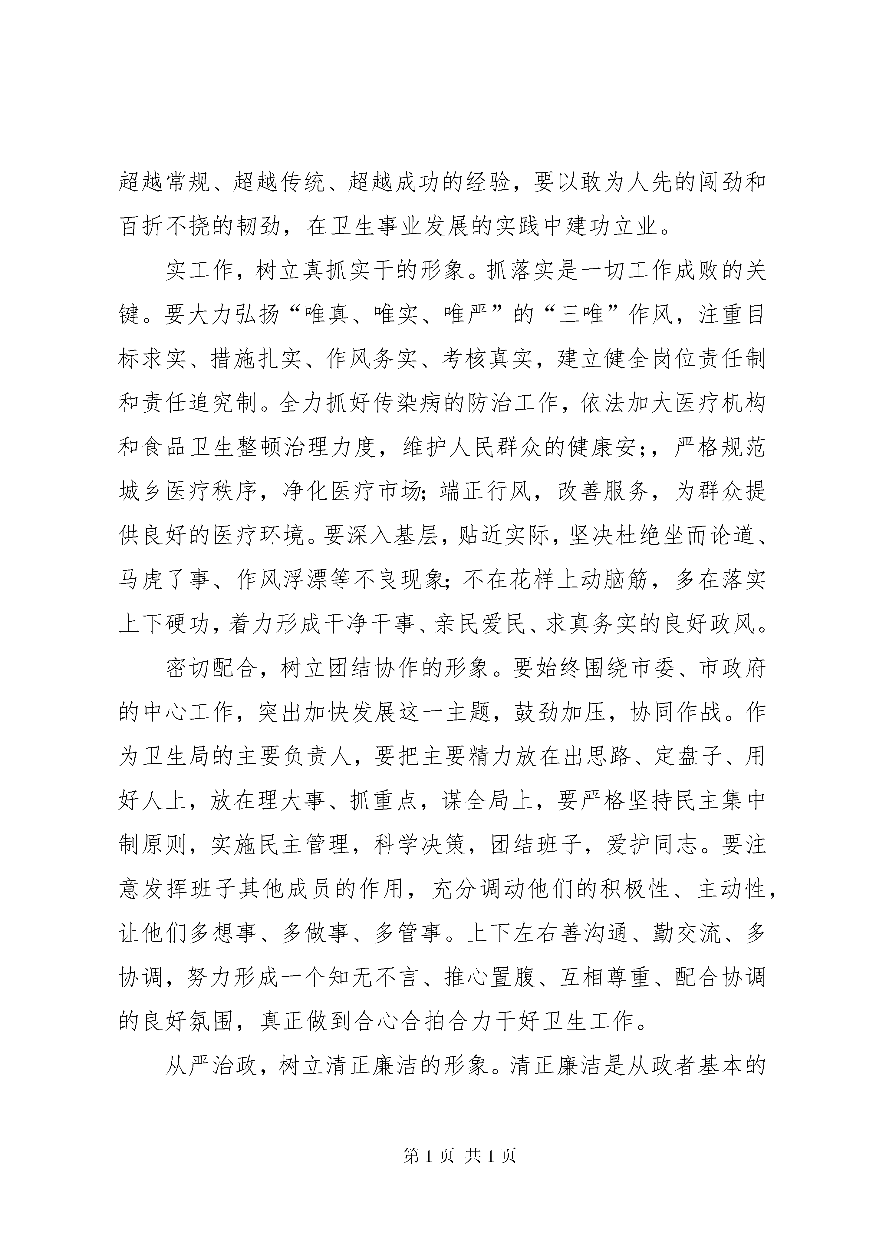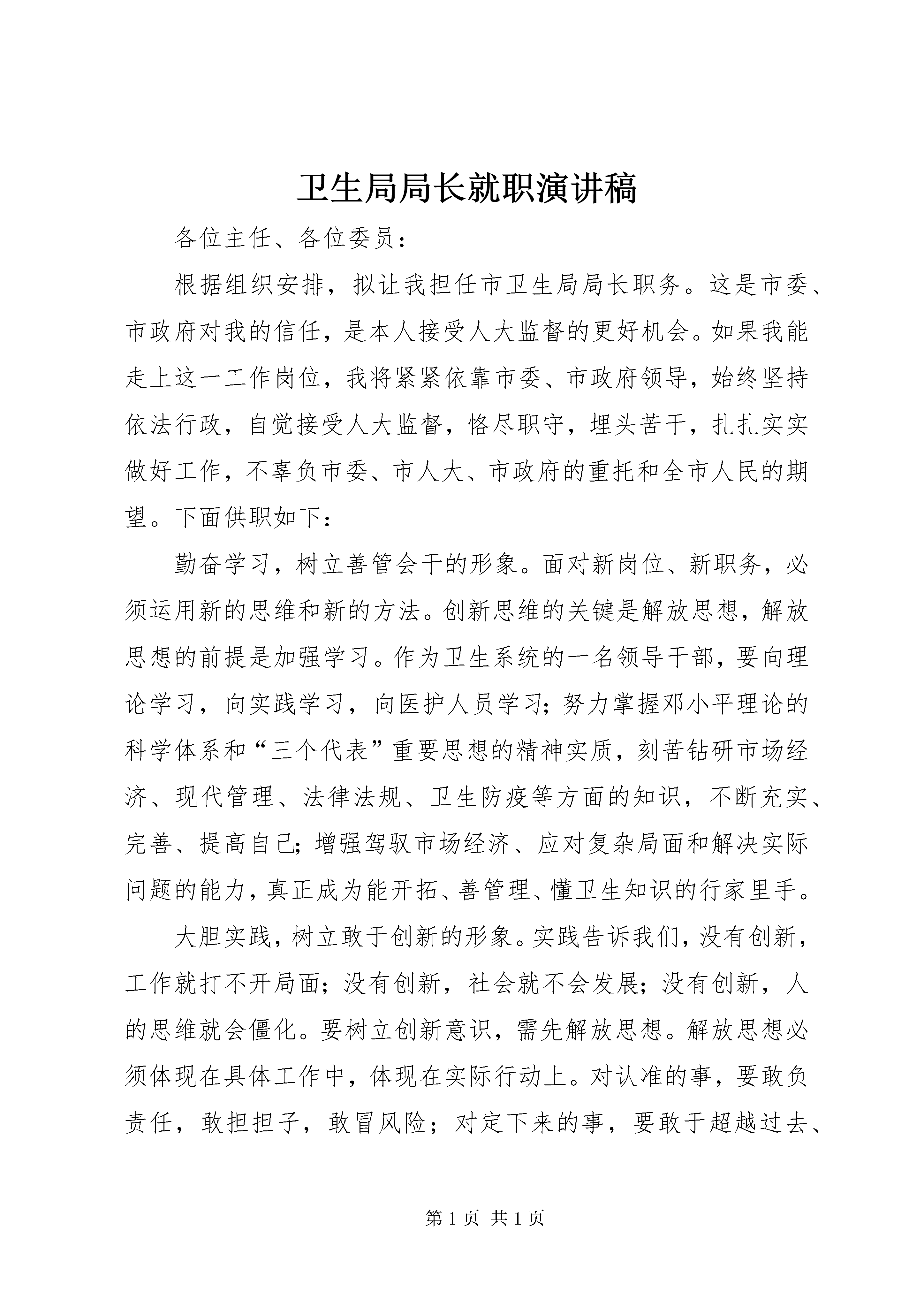 卫生局局长就职演讲稿各位主任、各位委员:根据组织安排,拟让我担任市卫生局局长职务。这是市委、市政府对我的信任,是本人接受人大监督的更好机会。如果我能走上这一工作岗位,我将紧紧依靠市委、市政府领导,始终坚持依法行政,自觉接受人大监督,恪尽职守,埋头苦干,扎扎实实做好工作,不辜负市委、市人大、市政府的重托和全市人民的期望。下面供职如下:勤奋学习,树立善管会干的形象。面对新岗位、新职务,必须运用新的思维和新的方法。创新思维的关键是解放思想,解放思想的前提是加强学习。作为卫生系统的一名领导干部,要向理论学习,向实践学习,向医护人员学习;努力掌握邓小平理论的科学体系和“三个代表”重要思想的精神实质,刻苦钻研市场经济、现代管理、法律法规、卫生防疫等方面的知识,不断充实、完善、提高自己;增强驾驭市场经济、应对复杂局面和解决实际问题的能力,真正成为能开拓、善管理、懂卫生知识的行家里手。大胆实践,树立敢于创新的形象。实践告诉我们,没有创新,工作就打不开局面;没有创新,社会就不会发展;没有创新,人的思维就会僵化。要树立创新意识,需先解放思想。解放思想必须体现在具体工作中,体现在实际行动上。对认准的事,要敢负责任,敢担担子,敢冒风险;对定下来的事,要敢于超越过去、超越常规、超越传统、超越成功的经验,要以敢为人先的闯劲和百折不挠的韧劲,在卫生事业发展的实践中建功立业。实工作,树立真抓实干的形象。抓落实是一切工作成败的关键。要大力弘扬“唯真、唯实、唯严”的“三唯”作风,注重目标求实、措施扎实、作风务实、考核真实,建立健全岗位责任制和责任追究制。全力抓好传染病的防治工作,依法加大医疗机构和食品卫生整顿治理力度,维护人民群众的健康安;,严格规范城乡医疗秩序,净化医疗市场;端正行风,改善服务,为群众提供良好的医疗环境。要深入基层,贴近实际,坚决杜绝坐而论道、马虎了事、作风浮漂等不良现象;不在花样上动脑筋,多在落实上下硬功,着力形成干净干事、亲民爱民、求真务实的良好政风。密切配合,树立团结协作的形象。要始终围绕市委、市政府的中心工作,突出加快发展这一主题,鼓劲加压,协同作战。作为卫生局的主要负责人,要把主要精力放在出思路、定盘子、用好人上,放在理大事、抓重点,谋全局上,要严格坚持民主集中制原则,实施民主管理,科学决策,团结班子,爱护同志。要注意发挥班子其他成员的作用,充分调动他们的积极性、主动性,让他们多想事、多做事、多管事。上下左右善沟通、勤交流、多协调,努力形成一个知无不言、推心置腹、互相尊重、配合协调的良好氛围,真正做到合心合拍合力干好卫生工作。从严治政,树立清正廉洁的形象。清正廉洁是从政者基本的职业准则和职业道德。在新的工作岗位上,要大力弘扬艰苦奋斗、勤俭办事的优良传统,坚决反对铺张浪费,大力压缩各项支出,切实降低工作成本。要带头执行中央关于廉政建设的若干规定和党员领导干部从政的六条准则,始终把自己置于法律、制度和群众的监督约束之下,不滥用权力,不谋取私利。要做到“堂堂正正做人,清清白白做官,扎扎实实做事,公公正正执法”。常思贪欲之害,常弃非分之想,常怀律已之心,常修为政之德。做到清正廉洁、质朴无华、淡泊平和、两袖清风。努力建设一支政治坚定、勤政为民、公道正派、廉洁奉公、团结高效的高素质卫生医疗队伍。依法行政,树立法治卫生的形象。卫生局作为市政府的重要职能部门,在推进依法行政、提高政府部门工作水平上担负着重要职责。我将认真履行岗位责任,把依法行政贯穿于卫生工作的实践,自觉依法办事、依法管理、依法行使职权;认真落实行政执法责任制,按照执法范围,抓好任务落实。自觉接受人大监督,坚决贯彻市人大及常委会通过的各项决议、决定,定期向市人大常委会报告工作,重大问题及时向市人大汇报;及时请求市人大常委会领导视察、检查、指导工作,认真办理人大代表的意见和建议;采取聘请人大代表担任执法执纪监督员等形式,及时征求人大代表的意见和建议,不断改进工作,提高依法行政水平。谢谢各位主任、各位委员。