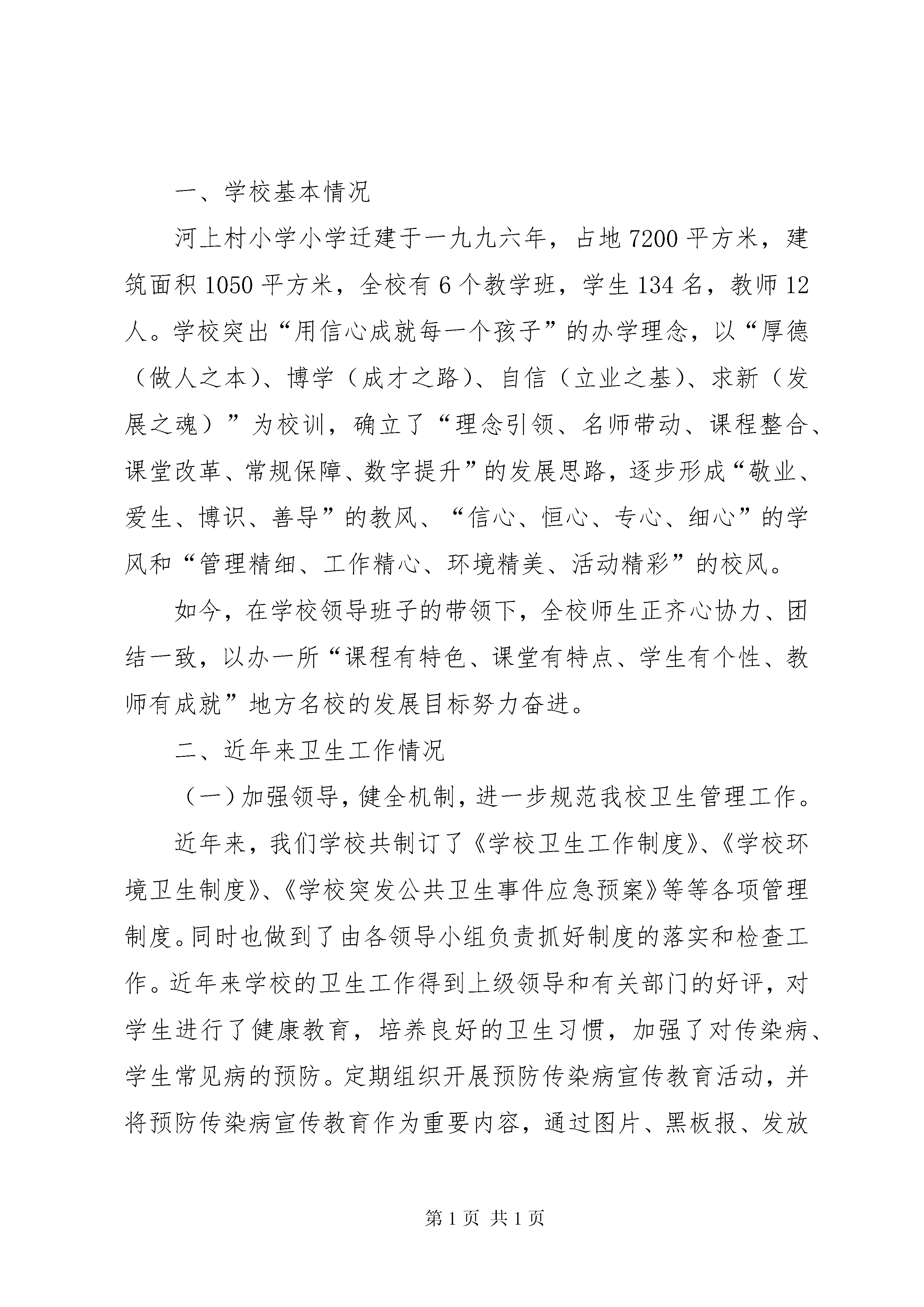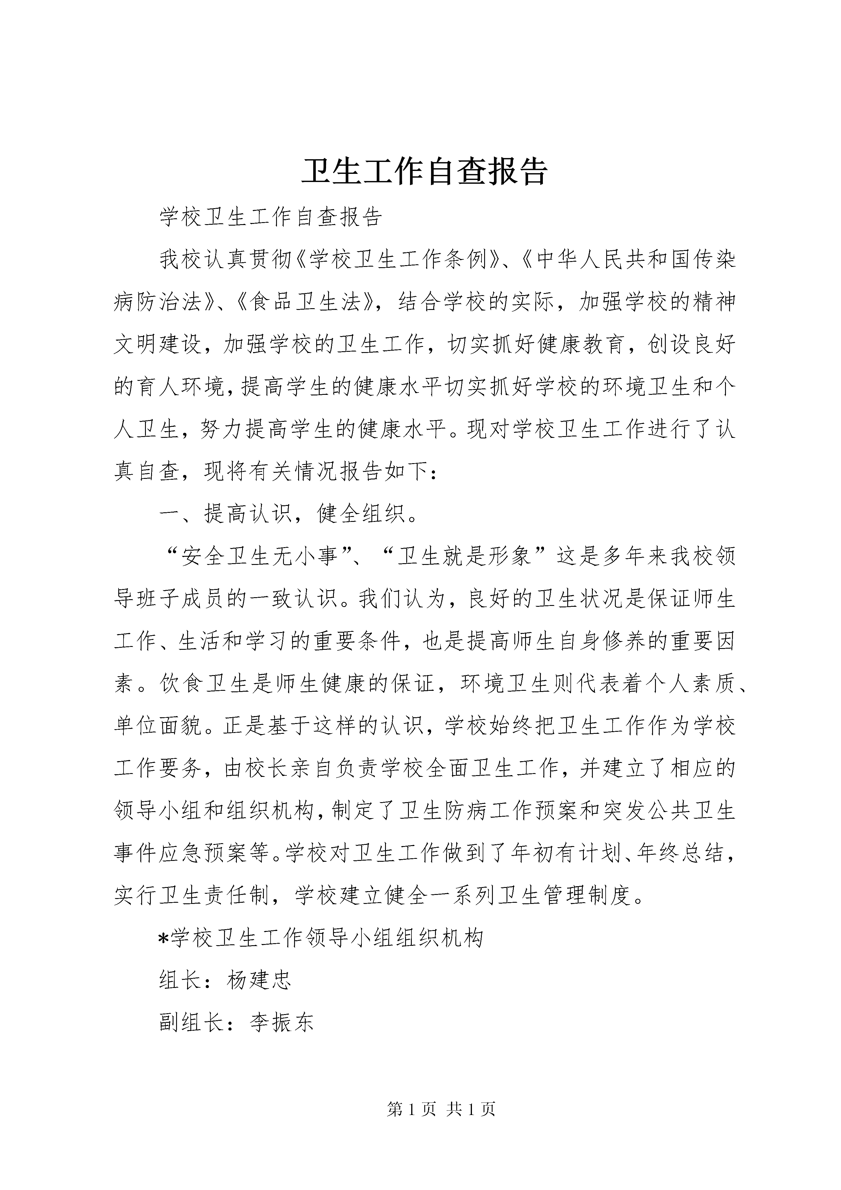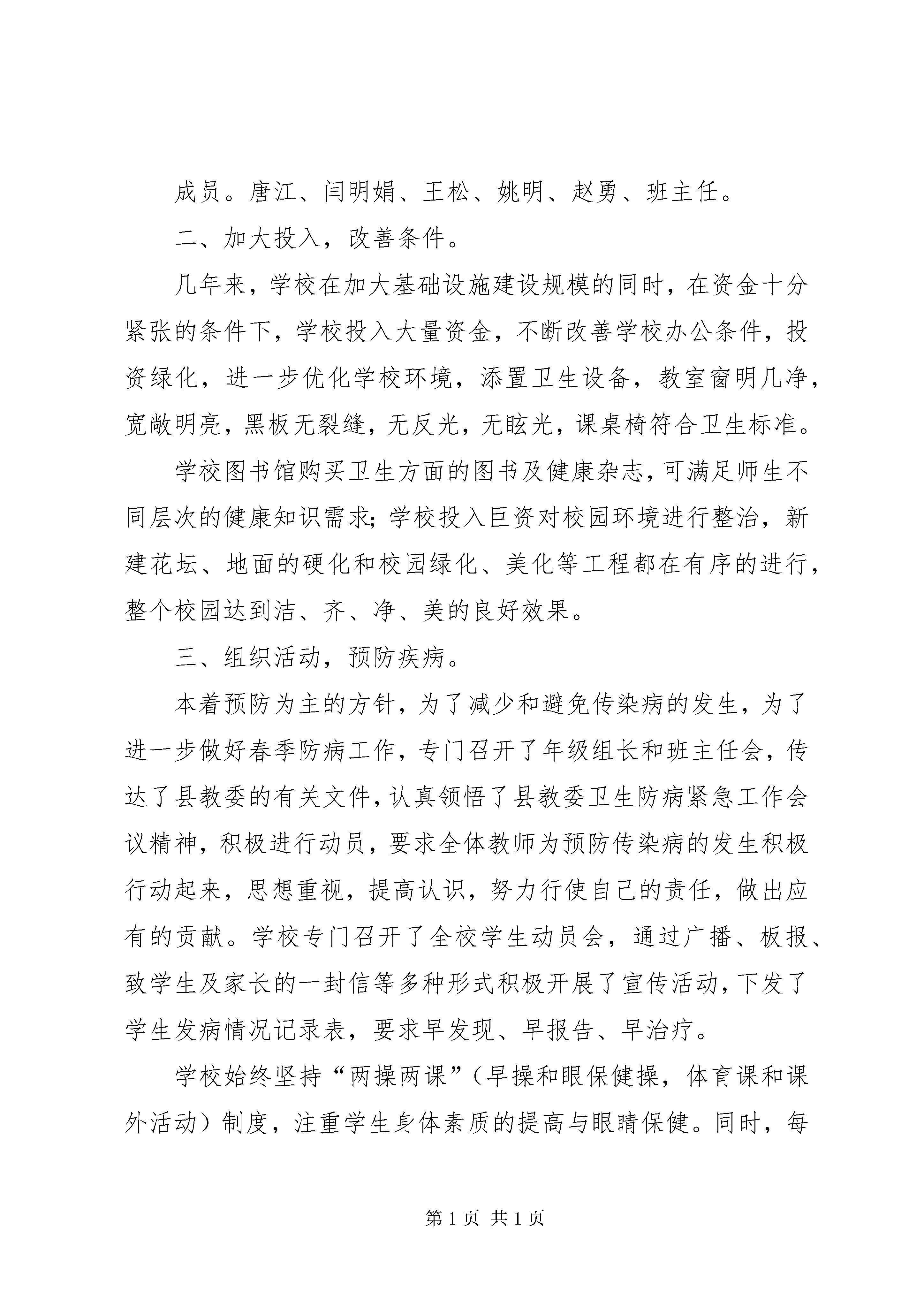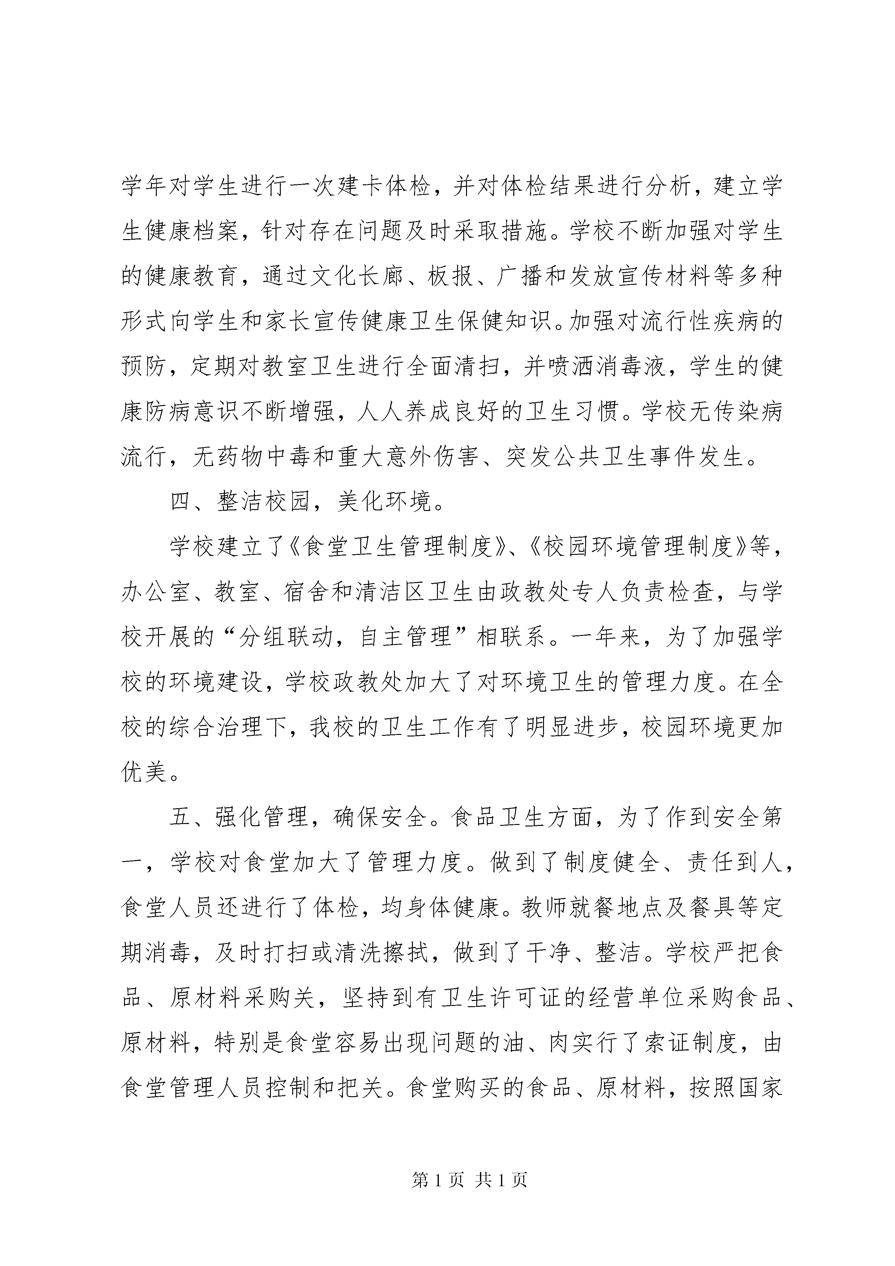 卫生工作自查报告学校卫生工作自查报告我校认真贯彻《学校卫生工作条例》、《中华人民共和国传染病防治法》、《食品卫生法》,结合学校的实际,加强学校的精神文明建设,加强学校的卫生工作,切实抓好健康教育,创设良好的育人环境,提高学生的健康水平切实抓好学校的环境卫生和个人卫生,努力提高学生的健康水平。现对学校卫生工作进行了认真自查,现将有关情况报告如下:一、提高认识,健全组织。“安全卫生无小事”、“卫生就是形象”这是多年来我校领导班子成员的一致认识。我们认为,良好的卫生状况是保证师生工作、生活和学习的重要条件,也是提高师生自身修养的重要因素。饮食卫生是师生健康的保证,环境卫生则代表着个人素质、单位面貌。正是基于这样的认识,学校始终把卫生工作作为学校工作要务,由校长亲自负责学校全面卫生工作,并建立了相应的领导小组和组织机构,制定了卫生防病工作预案和突发公共卫生事件应急预案等。学校对卫生工作做到了年初有计划、年终总结,实行卫生责任制,学校建立健全一系列卫生管理制度。*学校卫生工作领导小组组织机构组长:杨建忠副组长:李振东成员。唐江、闫明娟、王松、姚明、赵勇、班主任。二、加大投入,改善条件。几年来,学校在加大基础设施建设规模的同时,在资金十分紧张的条件下,学校投入大量资金,不断改善学校办公条件,投资绿化,进一步优化学校环境,添置卫生设备,教室窗明几净,宽敞明亮,黑板无裂缝,无反光,无眩光,课桌椅符合卫生标准。学校图书馆购买卫生方面的图书及健康杂志,可满足师生不同层次的健康知识需求;学校投入巨资对校园环境进行整治,新建花坛、地面的硬化和校园绿化、美化等工程都在有序的进行,整个校园达到洁、齐、净、美的良好效果。三、组织活动,预防疾病。本着预防为主的方针,为了减少和避免传染病的发生,为了进一步做好春季防病工作,专门召开了年级组长和班主任会,传达了县教委的有关文件,认真领悟了县教委卫生防病紧急工作会议精神,积极进行动员,要求全体教师为预防传染病的发生积极行动起来,思想重视,提高认识,努力行使自己的责任,做出应有的贡献。学校专门召开了全校学生动员会,通过广播、板报、致学生及家长的一封信等多种形式积极开展了宣传活动,下发了学生发病情况记录表,要求早发现、早报告、早治疗。学校始终坚持“两操两课”(早操和眼保健操,体育课和课外活动)制度,注重学生身体素质的提高与眼睛保健。同时,每学年对学生进行一次建卡体检,并对体检结果进行分析,建立学生健康档案,针对存在问题及时采取措施。学校不断加强对学生的健康教育,通过文化长廊、板报、广播和发放宣传材料等多种形式向学生和家长宣传健康卫生保健知识。加强对流行性疾病的预防,定期对教室卫生进行全面清扫,并喷洒消毒液,学生的健康防病意识不断增强,人人养成良好的卫生习惯。学校无传染病流行,无药物中毒和重大意外伤害、突发公共卫生事件发生。四、整洁校园,美化环境。学校建立了《食堂卫生管理制度》、《校园环境管理制度》等,办公室、教室、宿舍和清洁区卫生由政教处专人负责检查,与学校开展的“分组联动,自主管理”相联系。一年来,为了加强学校的环境建设,学校政教处加大了对环境卫生的管理力度。在全校的综合治理下,我校的卫生工作有了明显进步,校园环境更加优美。五、强化管理,确保安全。食品卫生方面,为了作到安全第一,学校对食堂加大了管理力度。做到了制度健全、责任到人,食堂人员还进行了体检,均身体健康。教师就餐地点及餐具等定期消毒,及时打扫或清洗擦拭,做到了干净、整洁。学校严把食品、原材料采购关,坚持到有卫生许可证的经营单位采购食品、原材料,特别是食堂容易出现问题的油、肉实行了索证制度,由食堂管理人员控制和把关。食堂购买的食品、原材料,按照国家有关规定向经营单位索证,所购物品必须符合卫生规定,并填写采购登记表及台帐;仓库有专职保管员,严格食品出入库登记制度,仓库及冷藏设备清洁,通风良好,分类放置,分库存放。食品加工声所设施完备,符合卫生要求。食堂工作人员一律持双证(健康检查证、岗位培训合格证)上岗,并严格按照有关规定保持个人卫生,有效保证了教师的身心健康。六、克服不足,再上台阶。我们在自查中发现,尽管我们付出了相当的努力,但终因各种条件所限,在卫生工作还存在硬件设施方面的一些不足,如教学楼和宿舍楼内无水房、厕所;操场未铺设塑胶跑道和人工草坪;学校食堂消毒设施不齐全。今后,我们将进一步加大对卫生工作的投入,不断改善学校卫生环境和条件,使学校卫生工作乃至整体工作再上新的台阶。苇子峪镇中学2013年篇二:卫生工作自查报告卫生工作自查报告学校尤其农村小学卫生工作是教育教学工作的重要组成部分,它关系到孩子们能不能健康生活、学习和成长的一个重要问题。对学校而言,培养学生健康的体魄、健全的人格,远比传授知识更重要。我校围绕《学校卫生工作条例》广