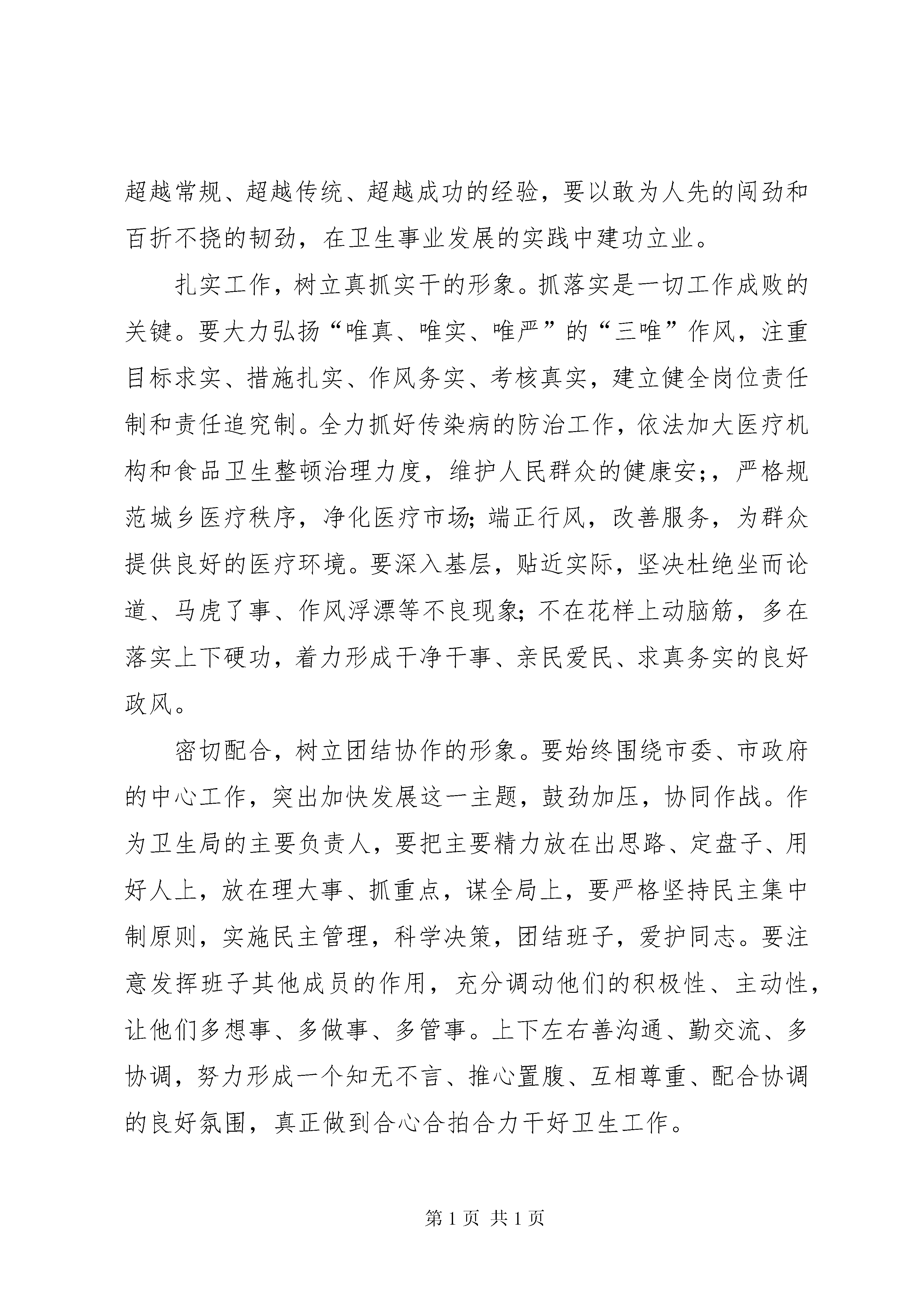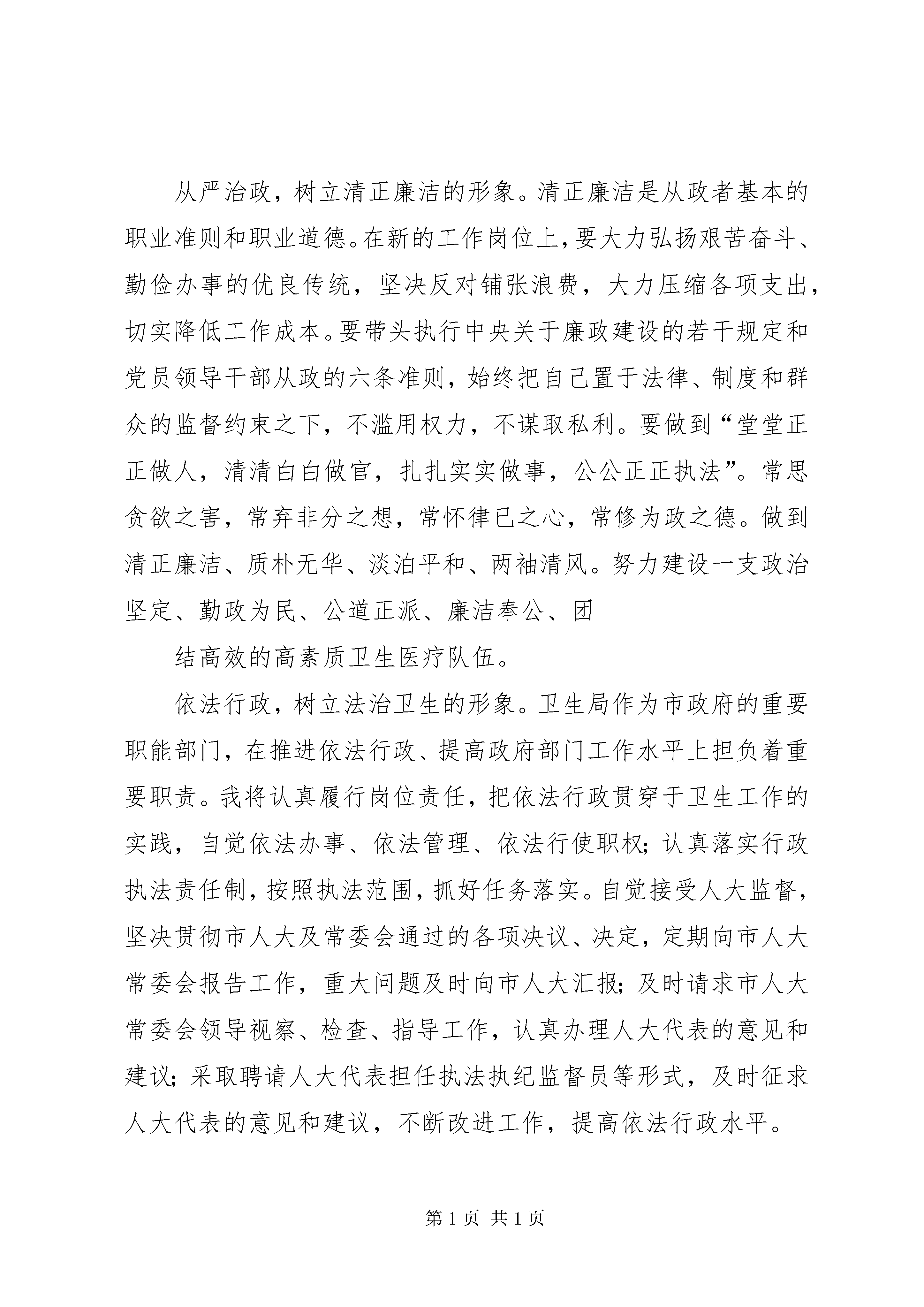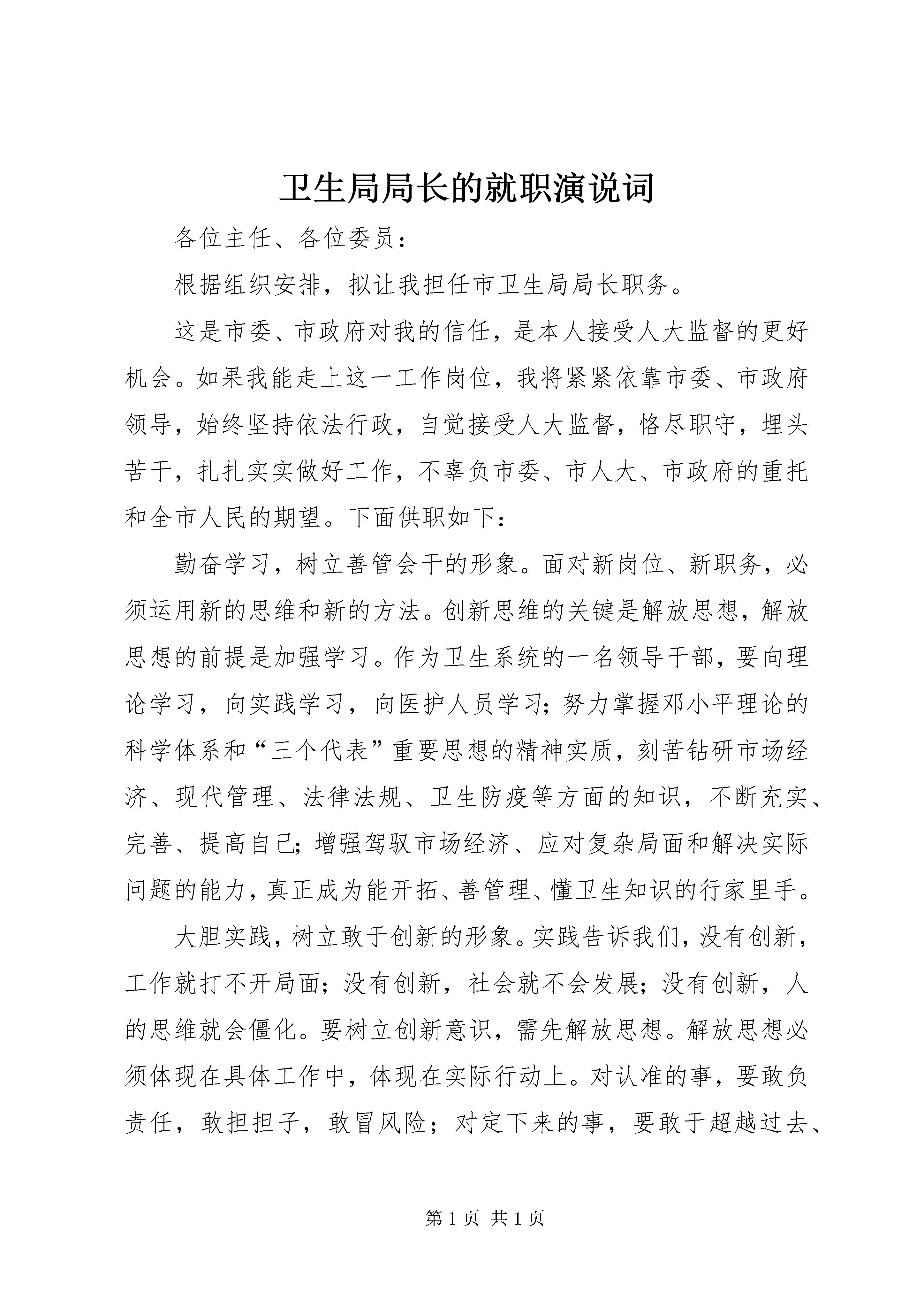 卫生局局长的就职演说词各位主任、各位委员:根据组织安排,拟让我担任市卫生局局长职务。这是市委、市政府对我的信任,是本人接受人大监督的更好机会。如果我能走上这一工作岗位,我将紧紧依靠市委、市政府领导,始终坚持依法行政,自觉接受人大监督,恪尽职守,埋头苦干,扎扎实实做好工作,不辜负市委、市人大、市政府的重托和全市人民的期望。下面供职如下:勤奋学习,树立善管会干的形象。面对新岗位、新职务,必须运用新的思维和新的方法。创新思维的关键是解放思想,解放思想的前提是加强学习。作为卫生系统的一名领导干部,要向理论学习,向实践学习,向医护人员学习;努力掌握邓小平理论的科学体系和“三个代表”重要思想的精神实质,刻苦钻研市场经济、现代管理、法律法规、卫生防疫等方面的知识,不断充实、完善、提高自己;增强驾驭市场经济、应对复杂局面和解决实际问题的能力,真正成为能开拓、善管理、懂卫生知识的行家里手。大胆实践,树立敢于创新的形象。实践告诉我们,没有创新,工作就打不开局面;没有创新,社会就不会发展;没有创新,人的思维就会僵化。要树立创新意识,需先解放思想。解放思想必须体现在具体工作中,体现在实际行动上。对认准的事,要敢负责任,敢担担子,敢冒风险;对定下来的事,要敢于超越过去、超越常规、超越传统、超越成功的经验,要以敢为人先的闯劲和百折不挠的韧劲,在卫生事业发展的实践中建功立业。扎实工作,树立真抓实干的形象。抓落实是一切工作成败的关键。要大力弘扬“唯真、唯实、唯严”的“三唯”作风,注重目标求实、措施扎实、作风务实、考核真实,建立健全岗位责任制和责任追究制。全力抓好传染病的防治工作,依法加大医疗机构和食品卫生整顿治理力度,维护人民群众的健康安;,严格规范城乡医疗秩序,净化医疗市场;端正行风,改善服务,为群众提供良好的医疗环境。要深入基层,贴近实际,坚决杜绝坐而论道、马虎了事、作风浮漂等不良现象;不在花样上动脑筋,多在落实上下硬功,着力形成干净干事、亲民爱民、求真务实的良好政风。密切配合,树立团结协作的形象。要始终围绕市委、市政府的中心工作,突出加快发展这一主题,鼓劲加压,协同作战。作为卫生局的主要负责人,要把主要精力放在出思路、定盘子、用好人上,放在理大事、抓重点,谋全局上,要严格坚持民主集中制原则,实施民主管理,科学决策,团结班子,爱护同志。要注意发挥班子其他成员的作用,充分调动他们的积极性、主动性,让他们多想事、多做事、多管事。上下左右善沟通、勤交流、多协调,努力形成一个知无不言、推心置腹、互相尊重、配合协调的良好氛围,真正做到合心合拍合力干好卫生工作。从严治政,树立清正廉洁的形象。清正廉洁是从政者基本的职业准则和职业道德。在新的工作岗位上,要大力弘扬艰苦奋斗、勤俭办事的优良传统,坚决反对铺张浪费,大力压缩各项支出,切实降低工作成本。要带头执行中央关于廉政建设的若干规定和党员领导干部从政的六条准则,始终把自己置于法律、制度和群众的监督约束之下,不滥用权力,不谋取私利。要做到“堂堂正正做人,清清白白做官,扎扎实实做事,公公正正执法”。常思贪欲之害,常弃非分之想,常怀律已之心,常修为政之德。做到清正廉洁、质朴无华、淡泊平和、两袖清风。努力建设一支政治坚定、勤政为民、公道正派、廉洁奉公、团结高效的高素质卫生医疗队伍。依法行政,树立法治卫生的形象。卫生局作为市政府的重要职能部门,在推进依法行政、提高政府部门工作水平上担负着重要职责。我将认真履行岗位责任,把依法行政贯穿于卫生工作的实践,自觉依法办事、依法管理、依法行使职权;认真落实行政执法责任制,按照执法范围,抓好任务落实。自觉接受人大监督,坚决贯彻市人大及常委会通过的各项决议、决定,定期向市人大常委会报告工作,重大问题及时向市人大汇报;及时请求市人大常委会领导视察、检查、指导工作,认真办理人大代表的意见和建议;采取聘请人大代表担任执法执纪监督员等形式,及时征求人大代表的意见和建议,不断改进工作,提高依法行政水平。谢谢各位主任、各位委员。