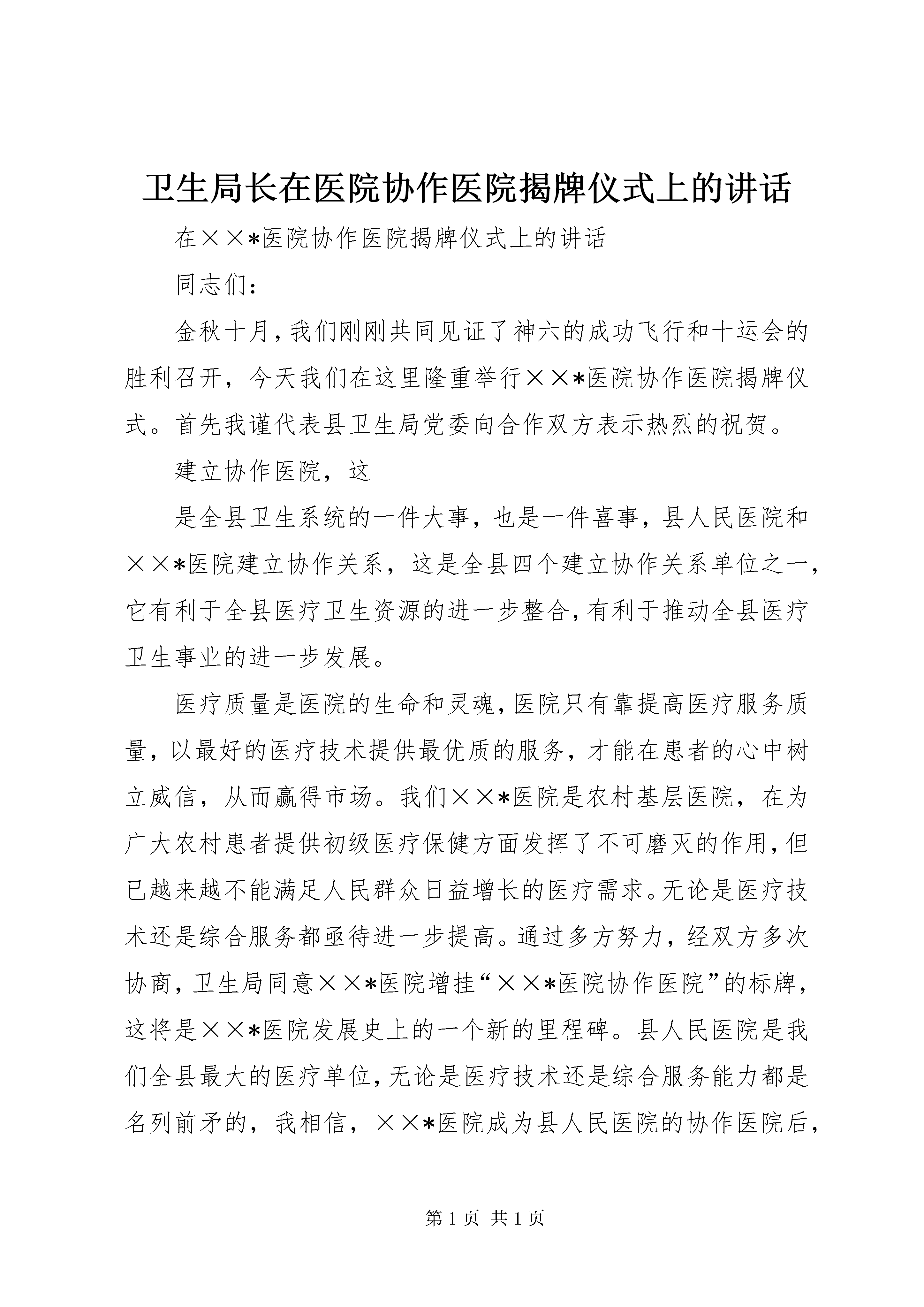 卫生局长在医院协作医院揭牌仪式上的讲话在××*医院协作医院揭牌仪式上的讲话同志们:金秋十月,我们刚刚共同见证了神六的成功飞行和十运会的胜利召开,今天我们在这里隆重举行××*医院协作医院揭牌仪式。首先我谨代表县卫生局党委向合作双方表示热烈的祝贺。建立协作医院,这是全县卫生系统的一件大事,也是一件喜事,县人民医院和××*医院建立协作关系,这是全县四个建立协作关系单位之一,它有利于全县医疗卫生资源的进一步整合,有利于推动全县医疗卫生事业的进一步发展。医疗质量是医院的生命和灵魂,医院只有靠提高医疗服务质量,以最好的医疗技术提供最优质的服务,才能在患者的心中树立威信,从而赢得市场。我们××*医院是农村基层医院,在为广大农村患者提供初级医疗保健方面发挥了不可磨灭的作用,但已越来越不能满足人民群众日益增长的医疗需求。无论是医疗技术还是综合服务都亟待进一步提高。通过多方努力,经双方多次协商,卫生局同意××*医院增挂“××*医院协作医院”的标牌,这将是××*医院发展史上的一个新的里程碑。县人民医院是我们全县最大的医疗单位,无论是医疗技术还是综合服务能力都是名列前矛的,我相信,××*医院成为县人民医院的协作医院后,将会直接受到人民医院专家在业务上的指导和帮助,从而为培养医学人才作出新的贡献,这也必将促进××*医院医疗工作的开展,提高医疗技术水平,造福××*人民。今天挂牌××*医院协作医院,这对××*医院来说是一个前所未有的大好机遇,我希望××*医院要抓住这个机遇,密切与人民医院的关系,主动加强业务上的联系,虚心接受指导,充分运用县人民医院的教学、科研技术优势,促进自己医疗技术水平和综合服务能力的提高。为××*人民提供更为优质的医疗服务,切实解决人民群众看病难、看病贵的问题。同时我也希望人民医院要把这次协作进一步落到实处,要从支援农村卫生工作的角度认识做好这项工作的重要性,真正体现基本现代化医院的实力,进一步扩大在全县医疗卫生事业中的影响,带动全县医疗卫生事业建设再上新台阶。最后祝双方协作取得圆满成功。谢谢大家。