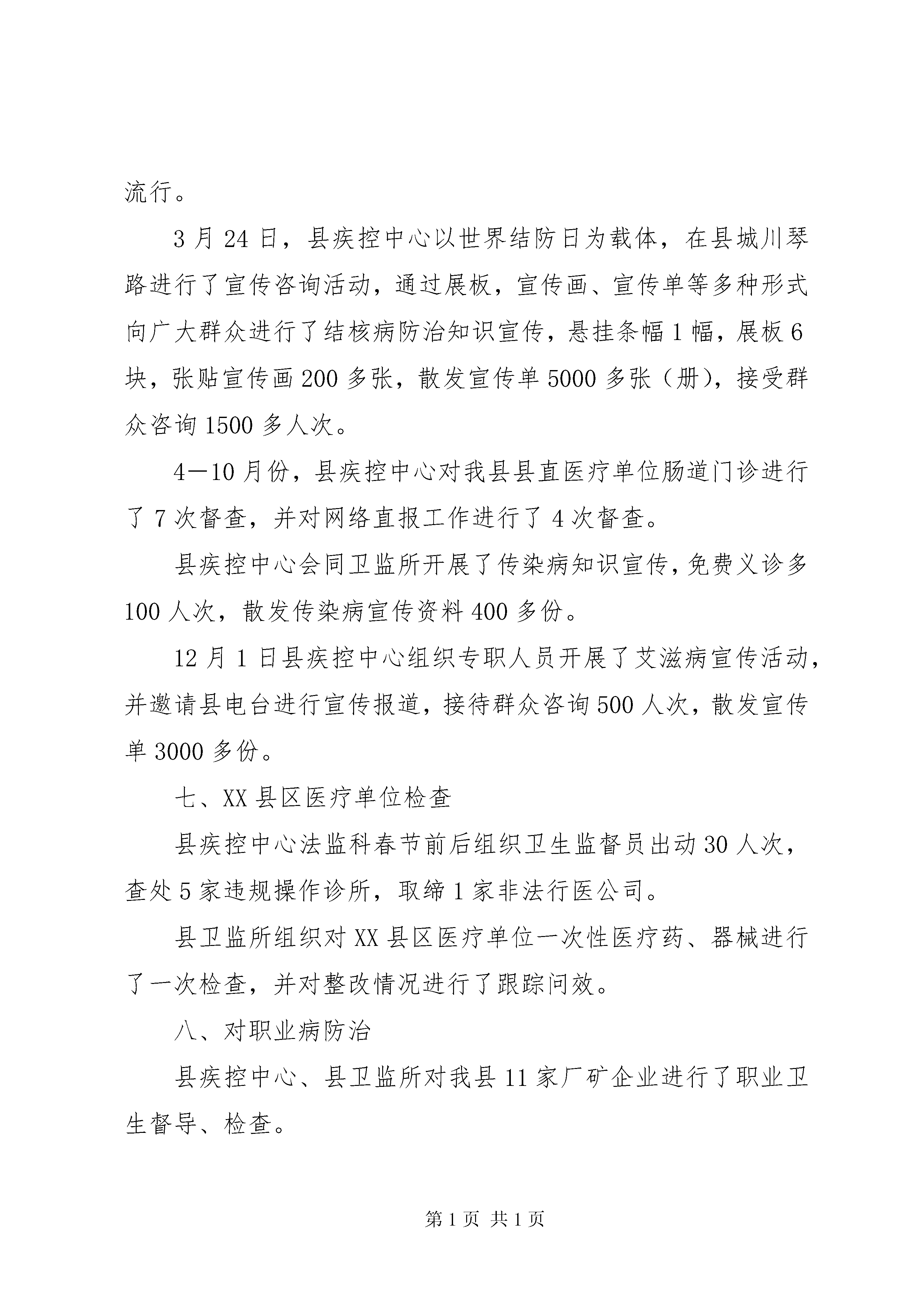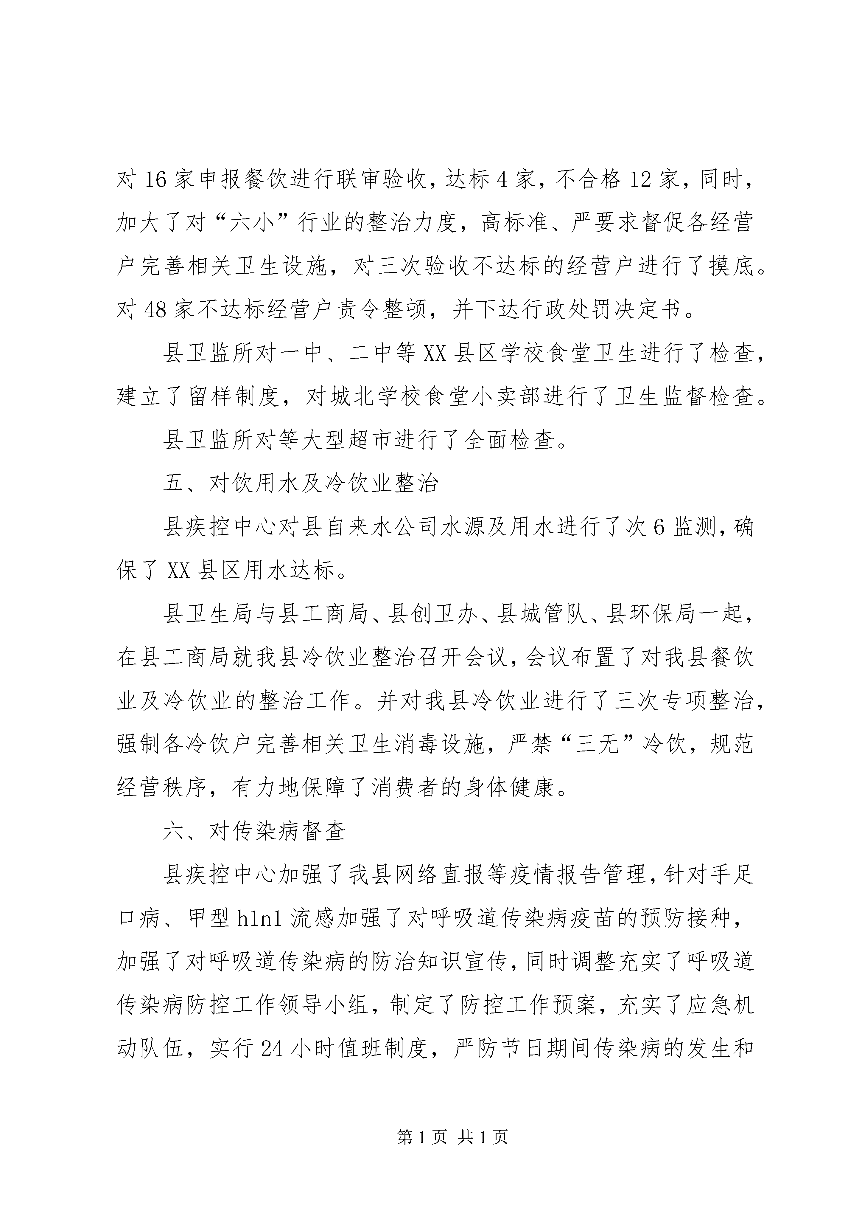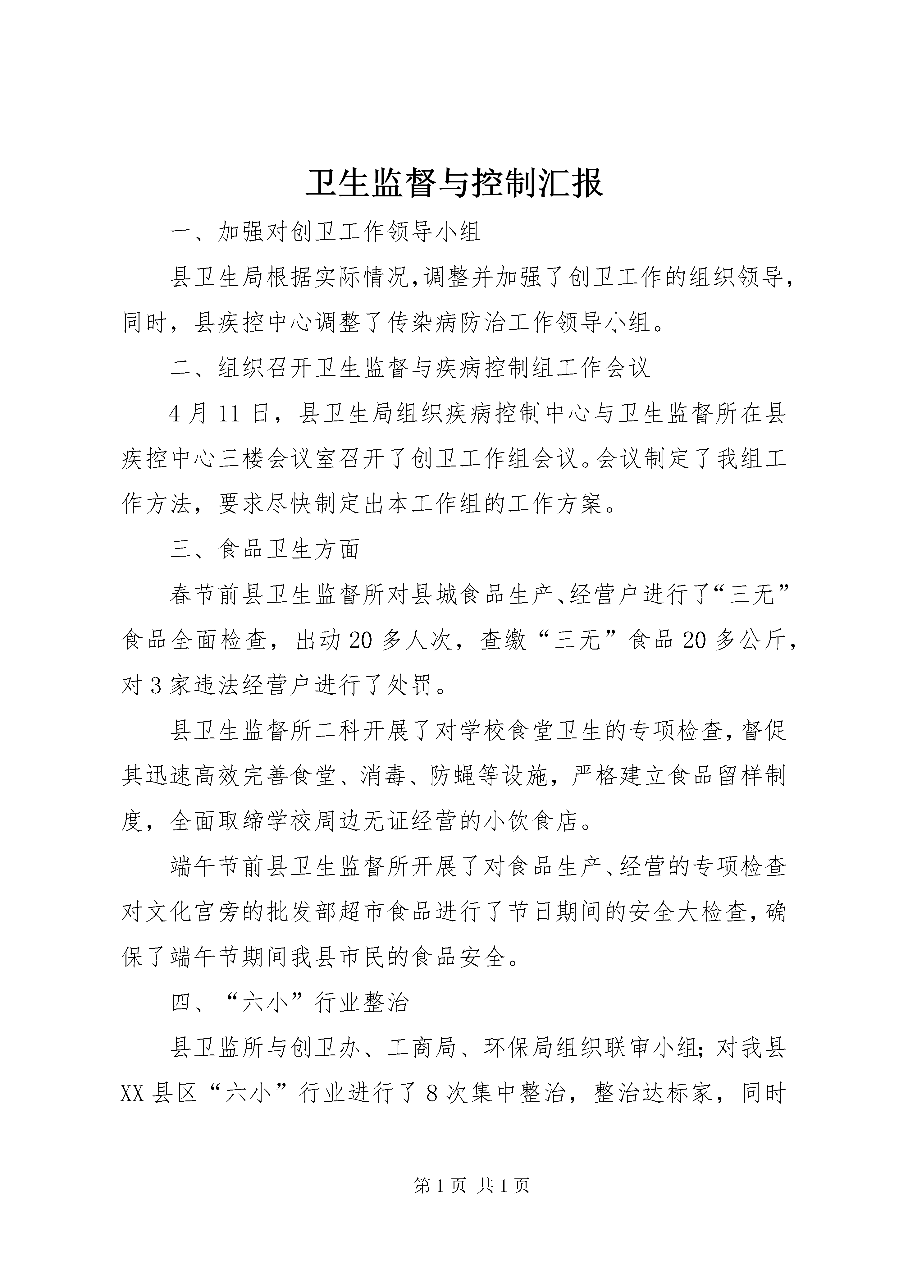卫生监督与控制汇报一、加强对创卫工作领导小组县卫生局根据实际情况,调整并加强了创卫工作的组织领导,同时,县疾控中心调整了传染病防治工作领导小组。二、组织召开卫生监督与疾病控制组工作会议4月11日,县卫生局组织疾病控制中心与卫生监督所在县疾控中心三楼会议室召开了创卫工作组会议。会议制定了我组工作方法,要求尽快制定出本工作组的工作方案。三、食品卫生方面春节前县卫生监督所对县城食品生产、经营户进行了“三无”食品全面检查,出动20多人次,查缴“三无”食品20多公斤,对3家违法经营户进行了处罚。县卫生监督所二科开展了对学校食堂卫生的专项检查,督促其迅速高效完善食堂、消毒、防蝇等设施,严格建立食品留样制度,全面取缔学校周边无证经营的小饮食店。端午节前县卫生监督所开展了对食品生产、经营的专项检查对文化宫旁的批发部超市食品进行了节日期间的安全大检查,确保了端午节期间我县市民的食品安全。四、“六小”行业整治县卫监所与创卫办、工商局、环保局组织联审小组;对我县XX县区“六小”行业进行了8次集中整治,整治达标家,同时对16家申报餐饮进行联审验收,达标4家,不合格12家,同时,加大了对“六小”行业的整治力度,高标准、严要求督促各经营户完善相关卫生设施,对三次验收不达标的经营户进行了摸底。对48家不达标经营户责令整顿,并下达行政处罚决定书。县卫监所对一中、二中等XX县区学校食堂卫生进行了检查,建立了留样制度,对城北学校食堂小卖部进行了卫生监督检查。县卫监所对等大型超市进行了全面检查。五、对饮用水及冷饮业整治县疾控中心对县自来水公司水源及用水进行了次6监测,确保了XX县区用水达标。县卫生局与县工商局、县创卫办、县城管队、县环保局一起,在县工商局就我县冷饮业整治召开会议,会议布置了对我县餐饮业及冷饮业的整治工作。并对我县冷饮业进行了三次专项整治,强制各冷饮户完善相关卫生消毒设施,严禁“三无”冷饮,规范经营秩序,有力地保障了消费者的身体健康。六、对传染病督查县疾控中心加强了我县网络直报等疫情报告管理,针对手足口病、甲型h1n1流感加强了对呼吸道传染病疫苗的预防接种,加强了对呼吸道传染病的防治知识宣传,同时调整充实了呼吸道传染病防控工作领导小组,制定了防控工作预案,充实了应急机动队伍,实行24小时值班制度,严防节日期间传染病的发生和流行。3月24日,县疾控中心以世界结防日为载体,在县城川琴路进行了宣传咨询活动,通过展板,宣传画、宣传单等多种形式向广大群众进行了结核病防治知识宣传,悬挂条幅1幅,展板6块,张贴宣传画200多张,散发宣传单5000多张(册),接受群众咨询1500多人次。4-10月份,县疾控中心对我县县直医疗单位肠道门诊进行了7次督查,并对网络直报工作进行了4次督查。县疾控中心会同卫监所开展了传染病知识宣传,免费义诊多100人次,散发传染病宣传资料400多份。12月1日县疾控中心组织专职人员开展了艾滋病宣传活动,并邀请县电台进行宣传报道,接待群众咨询500人次,散发宣传单3000多份。七、XX县区医疗单位检查县疾控中心法监科春节前后组织卫生监督员出动30人次,查处5家违规操作诊所,取缔1家非法行医公司。县卫监所组织对XX县区医疗单位一次性医疗药、器械进行了一次检查,并对整改情况进行了跟踪问效。八、对职业病防治县疾控中心、县卫监所对我县11家厂矿企业进行了职业卫生督导、检查。县卫生监督所与疾病控制中心会同园区对我县30余家企业进行了职业病防治宣传,同时对3家职业病高危企业职工进行了职业病防治检查。