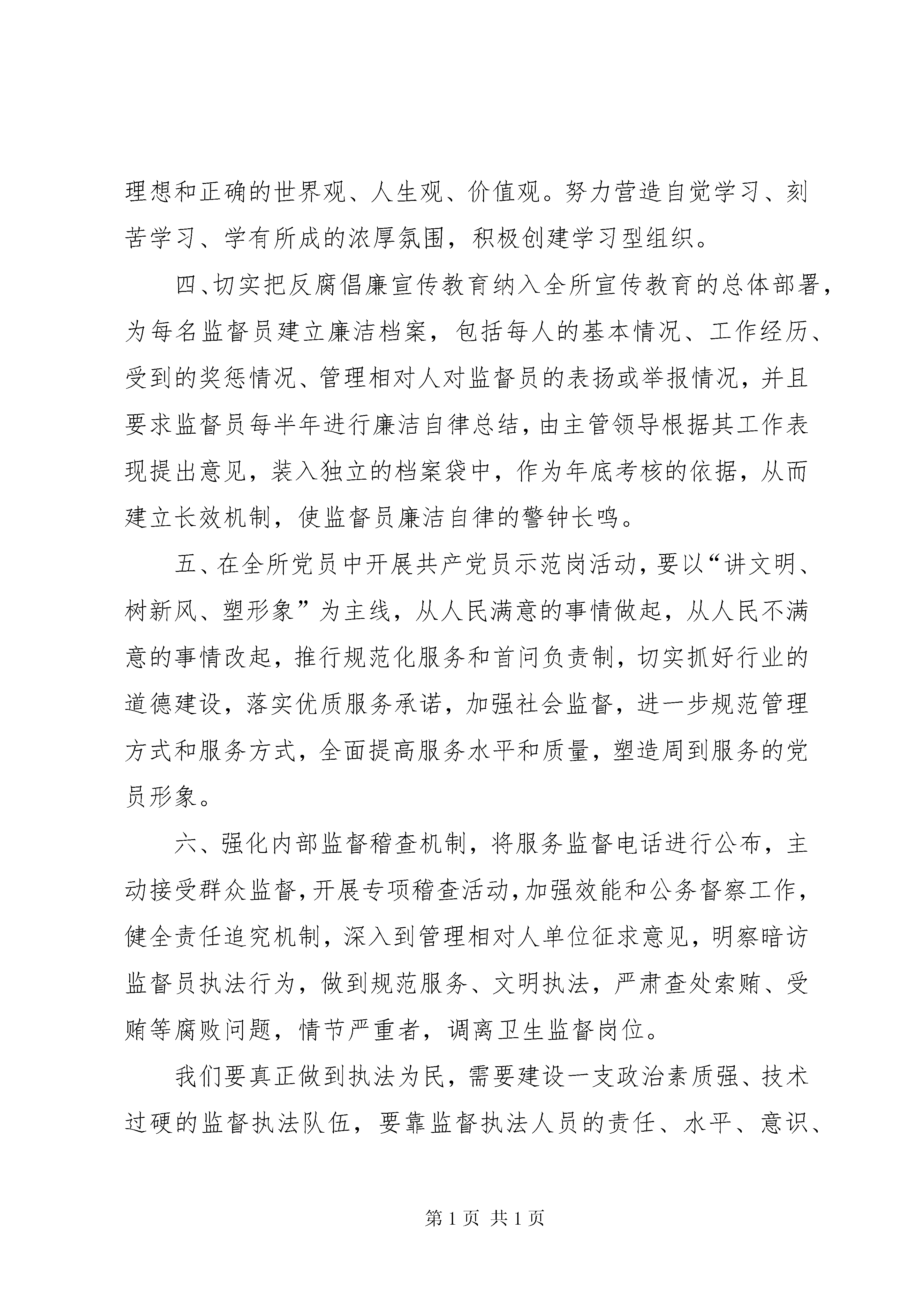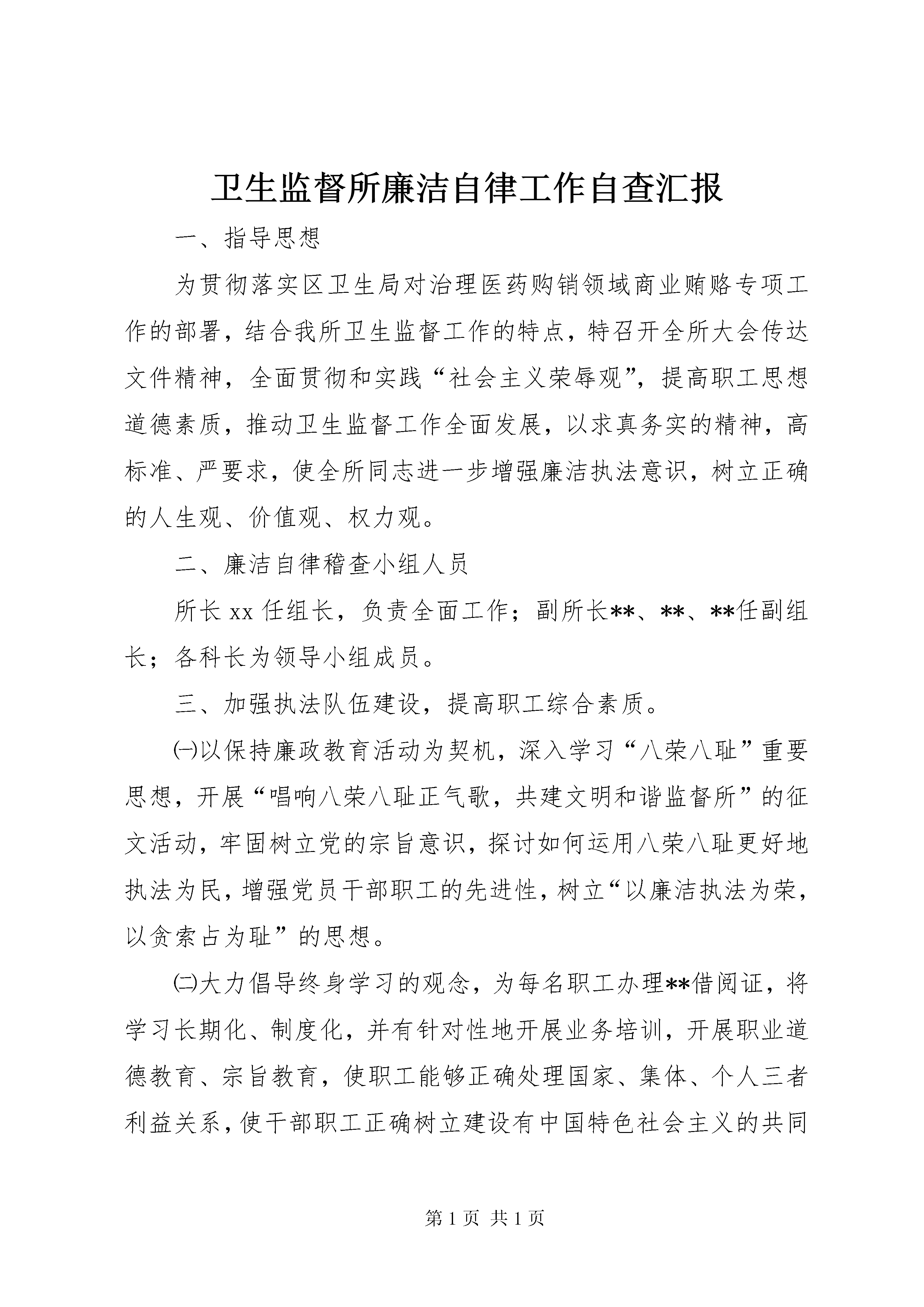 卫生监督所廉洁自律工作自查汇报一、指导思想为贯彻落实区卫生局对治理医药购销领域商业贿赂专项工作的部署,结合我所卫生监督工作的特点,特召开全所大会传达文件精神,全面贯彻和实践“社会主义荣辱观”,提高职工思想道德素质,推动卫生监督工作全面发展,以求真务实的精神,高标准、严要求,使全所同志进一步增强廉洁执法意识,树立正确的人生观、价值观、权力观。二、廉洁自律稽查小组人员所长xx任组长,负责全面工作;副所长**、**、**任副组长;各科长为领导小组成员。三、加强执法队伍建设,提高职工综合素质。㈠以保持廉政教育活动为契机,深入学习“八荣八耻”重要思想,开展“唱响八荣八耻正气歌,共建文明和谐监督所”的征文活动,牢固树立党的宗旨意识,探讨如何运用八荣八耻更好地执法为民,增强党员干部职工的先进性,树立“以廉洁执法为荣,以贪索占为耻”的思想。㈡大力倡导终身学习的观念,为每名职工办理**借阅证,将学习长期化、制度化,并有针对性地开展业务培训,开展职业道德教育、宗旨教育,使职工能够正确处理国家、集体、个人三者利益关系,使干部职工正确树立建设有中国特色社会主义的共同理想和正确的世界观、人生观、价值观。努力营造自觉学习、刻苦学习、学有所成的浓厚氛围,积极创建学习型组织。四、切实把反腐倡廉宣传教育纳入全所宣传教育的总体部署,为每名监督员建立廉洁档案,包括每人的基本情况、工作经历、受到的奖惩情况、管理相对人对监督员的表扬或举报情况,并且要求监督员每半年进行廉洁自律总结,由主管领导根据其工作表现提出意见,装入独立的档案袋中,作为年底考核的依据,从而建立长效机制,使监督员廉洁自律的警钟长鸣。五、在全所党员中开展共产党员示范岗活动,要以“讲文明、树新风、塑形象”为主线,从人民满意的事情做起,从人民不满意的事情改起,推行规范化服务和首问负责制,切实抓好行业的道德建设,落实优质服务承诺,加强社会监督,进一步规范管理方式和服务方式,全面提高服务水平和质量,塑造周到服务的党员形象。六、强化内部监督稽查机制,将服务监督电话进行公布,主动接受群众监督,开展专项稽查活动,加强效能和公务督察工作,健全责任追究机制,深入到管理相对人单位征求意见,明察暗访监督员执法行为,做到规范服务、文明执法,严肃查处索贿、受贿等腐败问题,情节严重者,调离卫生监督岗位。我们要真正做到执法为民,需要建设一支政治素质强、技术过硬的监督执法队伍,要靠监督执法人员的责任、水平、意识、观念。我们要切实履行卫生监督执法职责,保障人民群众健康权益,真正把好事办实、实事办好,自觉接受社会公众监督,以服务社会、造福百姓为己任,高质量高标准完成卫生监督执法工作,保障我区公共卫生、医疗卫生秩序。