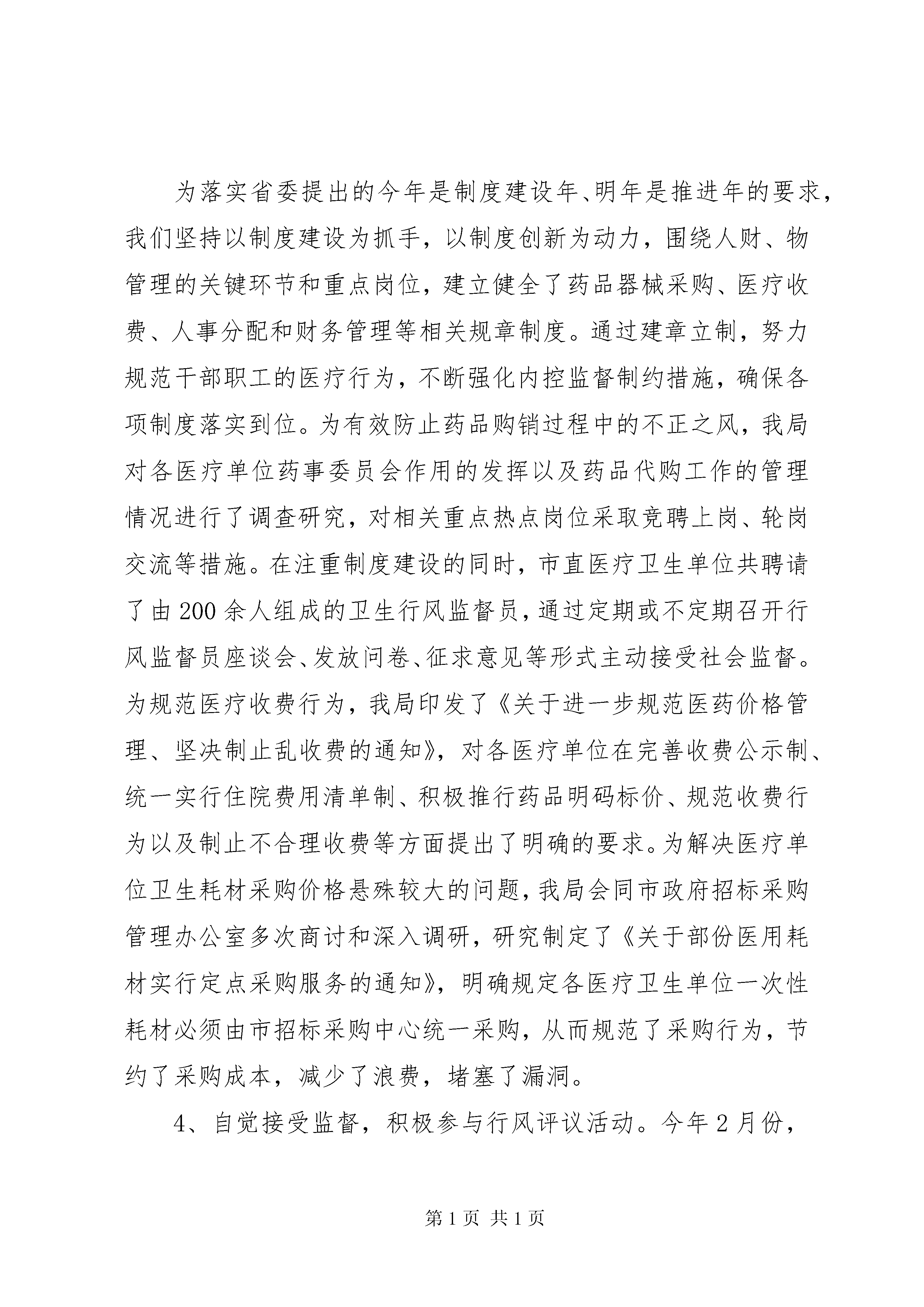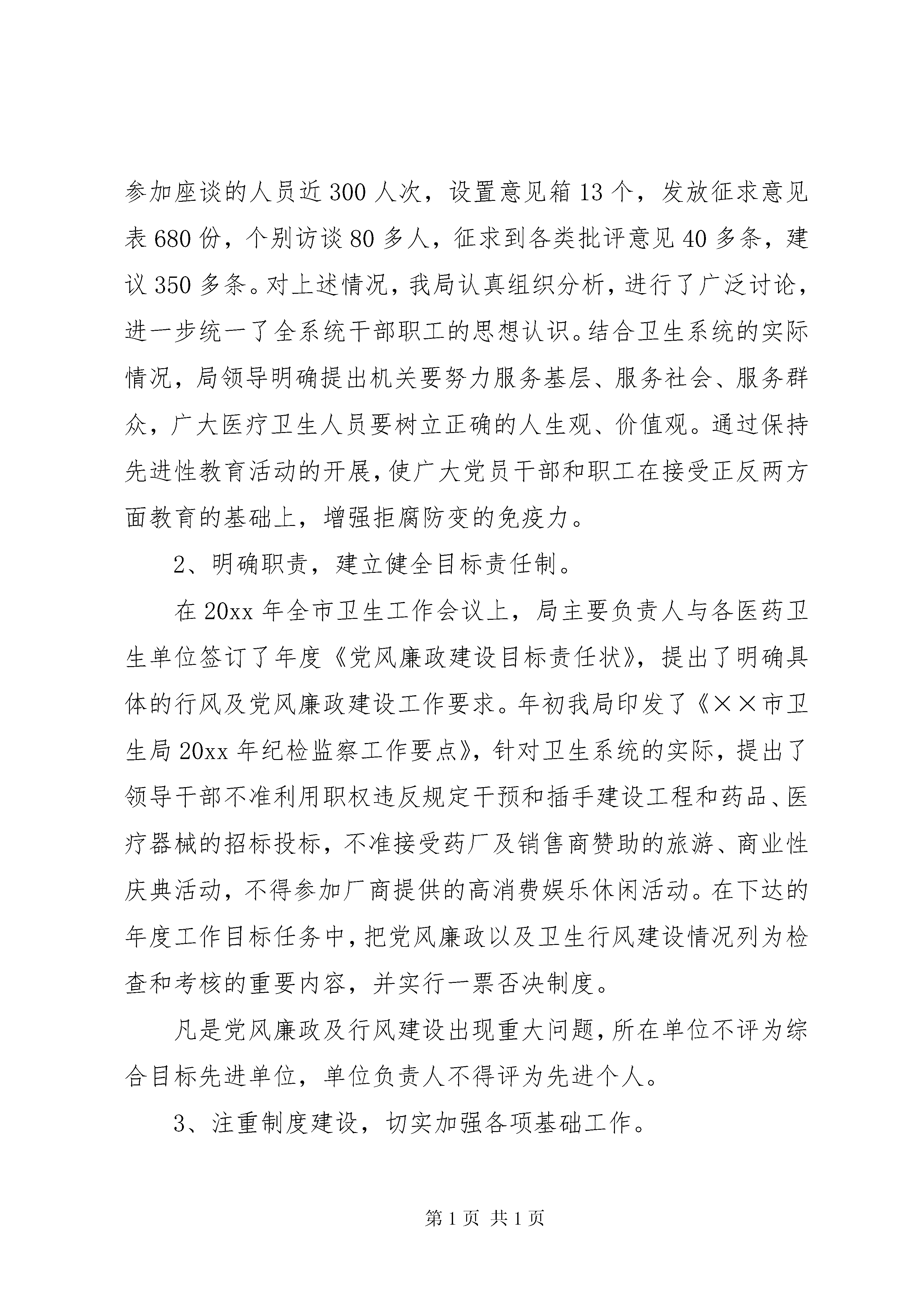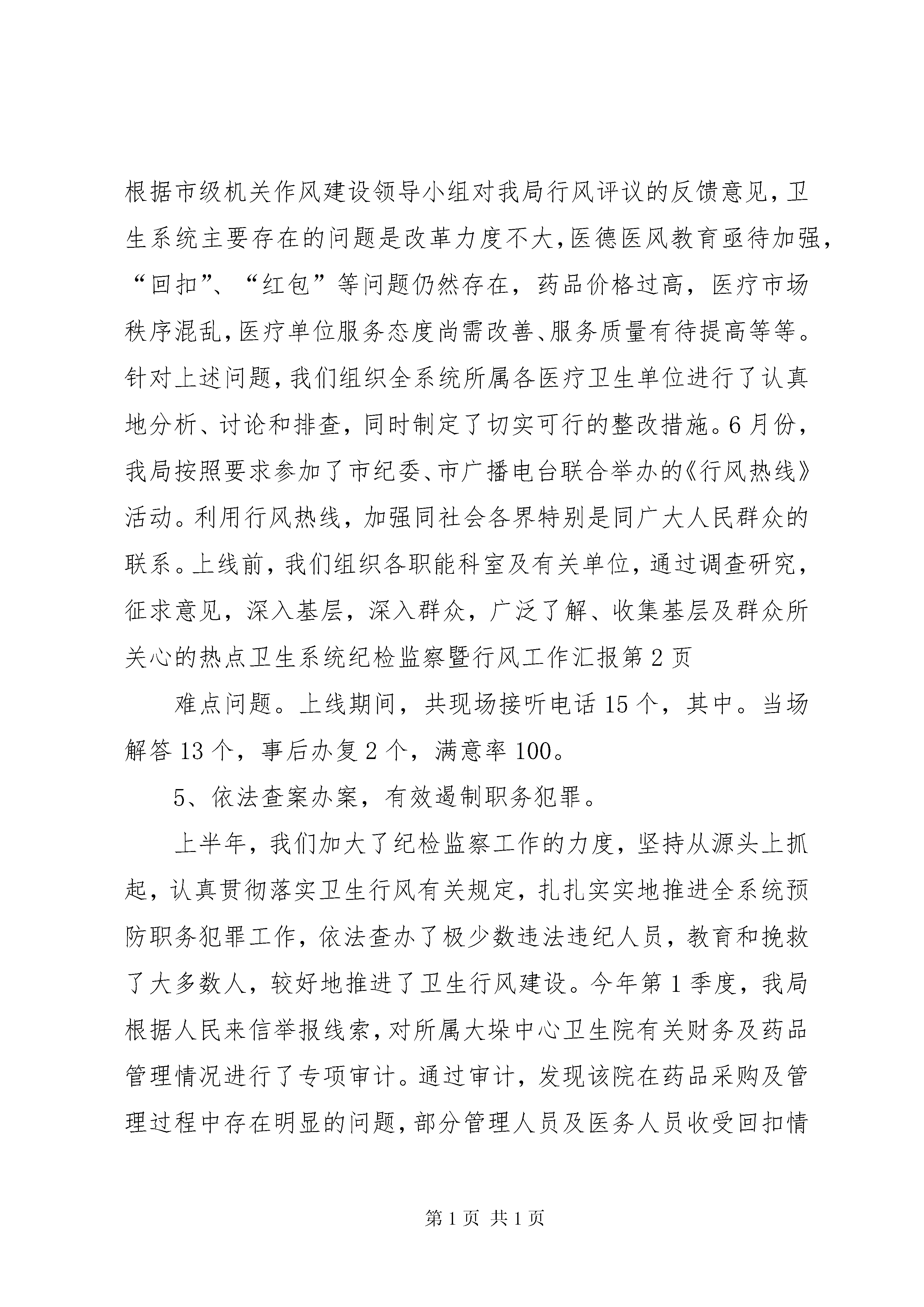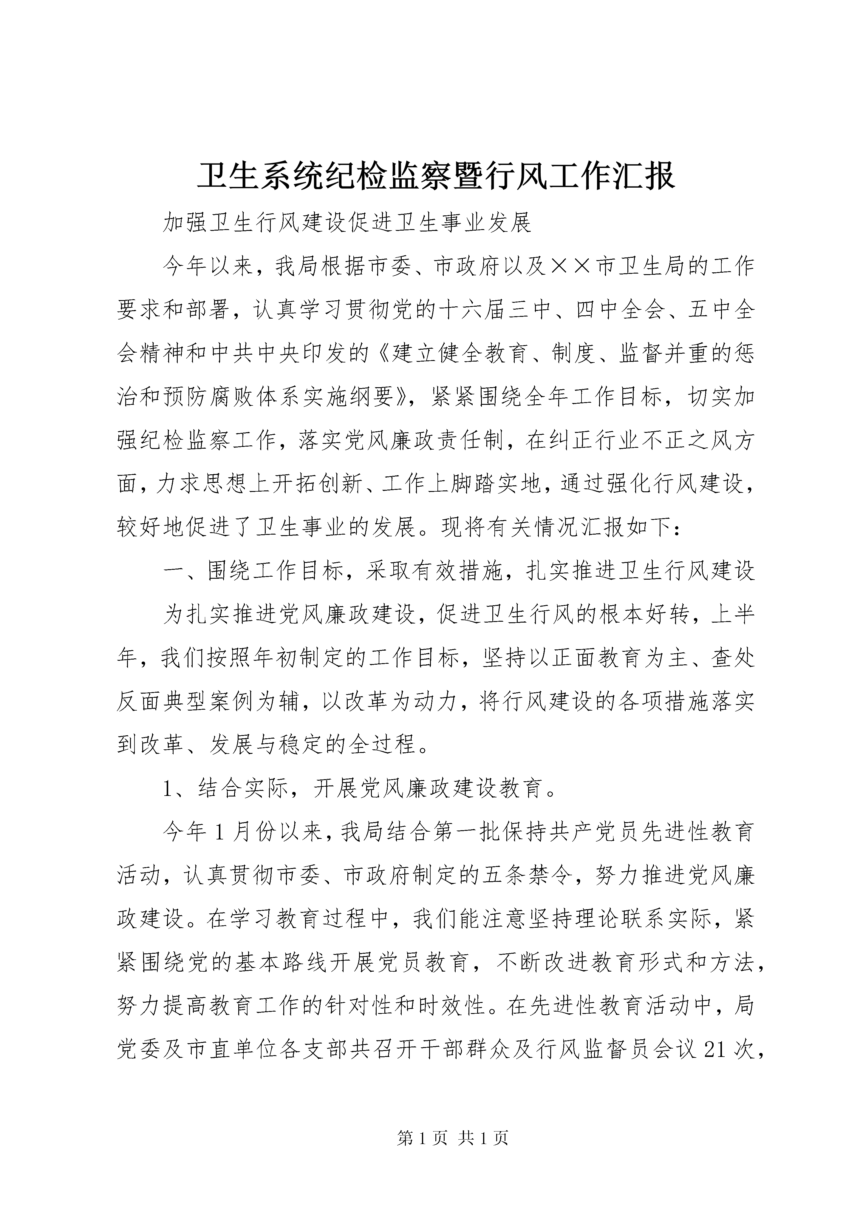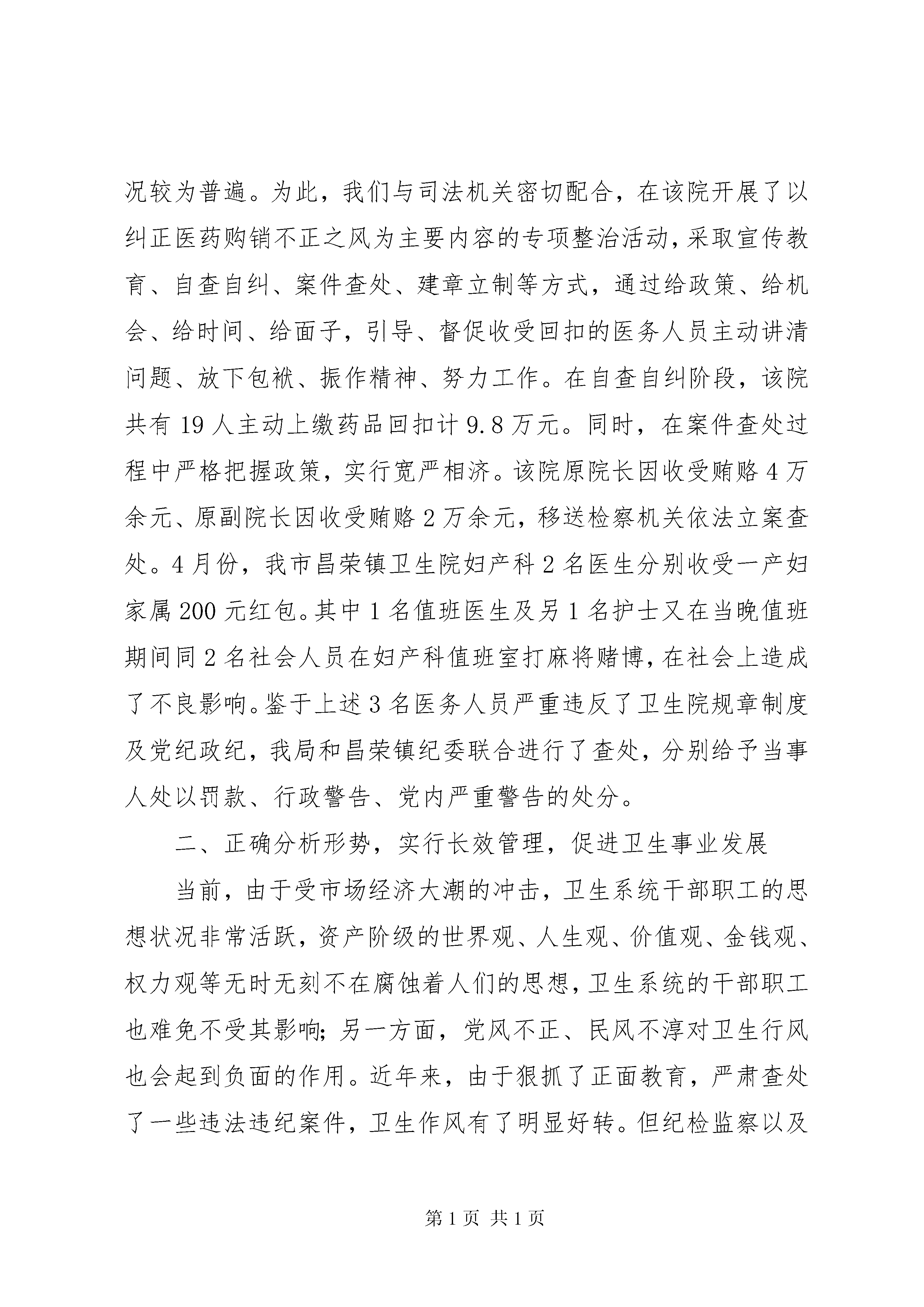 卫生系统纪检监察暨行风工作汇报加强卫生行风建设促进卫生事业发展今年以来,我局根据市委、市政府以及××市卫生局的工作要求和部署,认真学习贯彻党的十六届三中、四中全会、五中全会精神和中共中央印发的《建立健全教育、制度、监督并重的惩治和预防腐败体系实施纲要》,紧紧围绕全年工作目标,切实加强纪检监察工作,落实党风廉政责任制,在纠正行业不正之风方面,力求思想上开拓创新、工作上脚踏实地,通过强化行风建设,较好地促进了卫生事业的发展。现将有关情况汇报如下:一、围绕工作目标,采取有效措施,扎实推进卫生行风建设为扎实推进党风廉政建设,促进卫生行风的根本好转,上半年,我们按照年初制定的工作目标,坚持以正面教育为主、查处反面典型案例为辅,以改革为动力,将行风建设的各项措施落实到改革、发展与稳定的全过程。1、结合实际,开展党风廉政建设教育。今年1月份以来,我局结合第一批保持共产党员先进性教育活动,认真贯彻市委、市政府制定的五条禁令,努力推进党风廉政建设。在学习教育过程中,我们能注意坚持理论联系实际,紧紧围绕党的基本路线开展党员教育,不断改进教育形式和方法,努力提高教育工作的针对性和时效性。在先进性教育活动中,局党委及市直单位各支部共召开干部群众及行风监督员会议21次,参加座谈的人员近300人次,设置意见箱13个,发放征求意见表680份,个别访谈80多人,征求到各类批评意见40多条,建议350多条。对上述情况,我局认真组织分析,进行了广泛讨论,进一步统一了全系统干部职工的思想认识。结合卫生系统的实际情况,局领导明确提出机关要努力服务基层、服务社会、服务群众,广大医疗卫生人员要树立正确的人生观、价值观。通过保持先进性教育活动的开展,使广大党员干部和职工在接受正反两方面教育的基础上,增强拒腐防变的免疫力。2、明确职责,建立健全目标责任制。在20xx年全市卫生工作会议上,局主要负责人与各医药卫生单位签订了年度《党风廉政建设目标责任状》,提出了明确具体的行风及党风廉政建设工作要求。年初我局印发了《××市卫生局20xx年纪检监察工作要点》,针对卫生系统的实际,提出了领导干部不准利用职权违反规定干预和插手建设工程和药品、医疗器械的招标投标,不准接受药厂及销售商赞助的旅游、商业性庆典活动,不得参加厂商提供的高消费娱乐休闲活动。在下达的年度工作目标任务中,把党风廉政以及卫生行风建设情况列为检查和考核的重要内容,并实行一票否决制度。凡是党风廉政及行风建设出现重大问题,所在单位不评为综合目标先进单位,单位负责人不得评为先进个人。3、注重制度建设,切实加强各项基础工作。为落实省委提出的今年是制度建设年、明年是推进年的要求,我们坚持以制度建设为抓手,以制度创新为动力,围绕人财、物管理的关键环节和重点岗位,建立健全了药品器械采购、医疗收费、人事分配和财务管理等相关规章制度。通过建章立制,努力规范干部职工的医疗行为,不断强化内控监督制约措施,确保各项制度落实到位。为有效防止药品购销过程中的不正之风,我局对各医疗单位药事委员会作用的发挥以及药品代购工作的管理情况进行了调查研究,对相关重点热点岗位采取竞聘上岗、轮岗交流等措施。在注重制度建设的同时,市直医疗卫生单位共聘请了由200余人组成的卫生行风监督员,通过定期或不定期召开行风监督员座谈会、发放问卷、征求意见等形式主动接受社会监督。为规范医疗收费行为,我局印发了《关于进一步规范医药价格管理、坚决制止乱收费的通知》,对各医疗单位在完善收费公示制、统一实行住院费用清单制、积极推行药品明码标价、规范收费行为以及制止不合理收费等方面提出了明确的要求。为解决医疗单位卫生耗材采购价格悬殊较大的问题,我局会同市政府招标采购管理办公室多次商讨和深入调研,研究制定了《关于部份医用耗材实行定点采购服务的通知》,明确规定各医疗卫生单位一次性耗材必须由市招标采购中心统一采购,从而规范了采购行为,节约了采购成本,减少了浪费,堵塞了漏洞。4、自觉接受监督,积极参与行风评议活动。今年2月份,根据市级机关作风建设领导小组对我局行风评议的反馈意见,卫生系统主要存在的问题是改革力度不大,医德医风教育亟待加强,“回扣”、“红包”等问题仍然存在,药品价格过高,医疗市场秩序混乱,医疗单位服务态度尚需改善、服务质量有待提高等等。针对上述问题,我们组织全系统所属各医疗卫生单位进行了认真地分析、讨论和排查,同时制定了切实可行的整改措施。6月份,我局按照要求参加了市纪委、市广播电台联合举办的《行风热线》活动。利用行风热线,加强同社会各界特别是同广大人民群众的联系。上线前,我们组织各职能科室及有关单位,通过调查研究,征求意见,深入基层,深入群众,广泛了解、收集基层及群众所关心的热点卫生系统纪检监察暨行风工作汇报难点问题。上线期间,共现场接听电话15个,